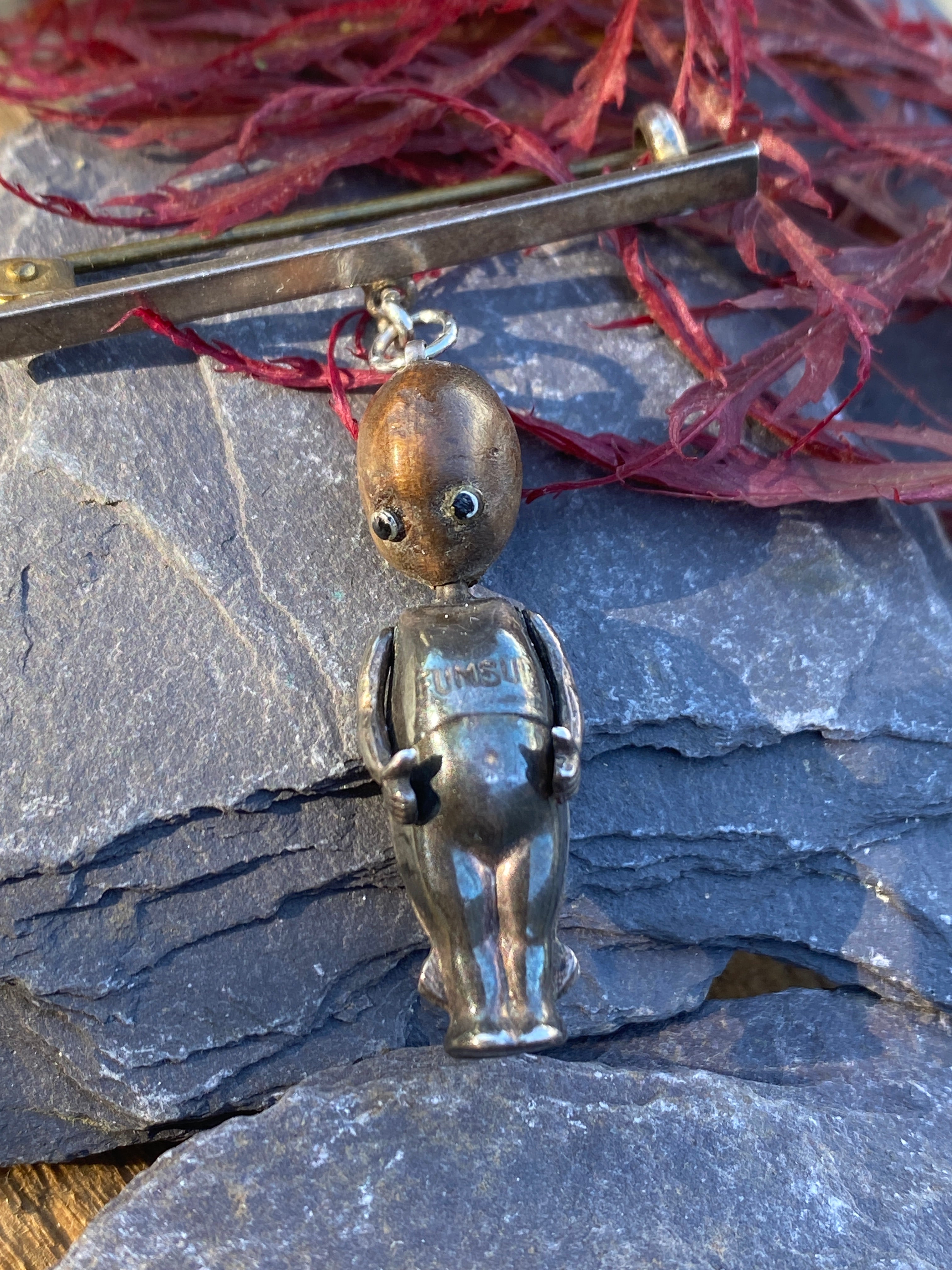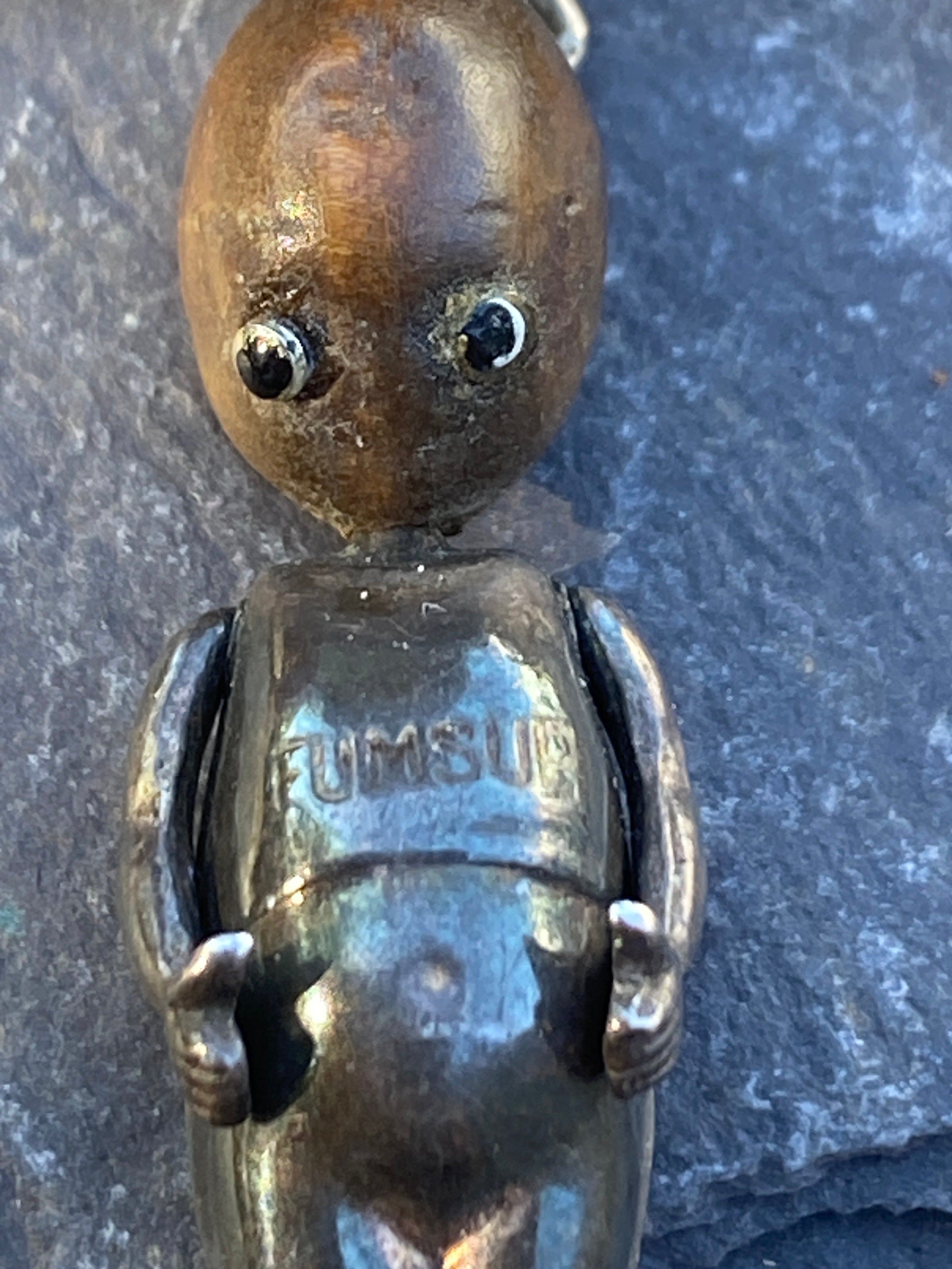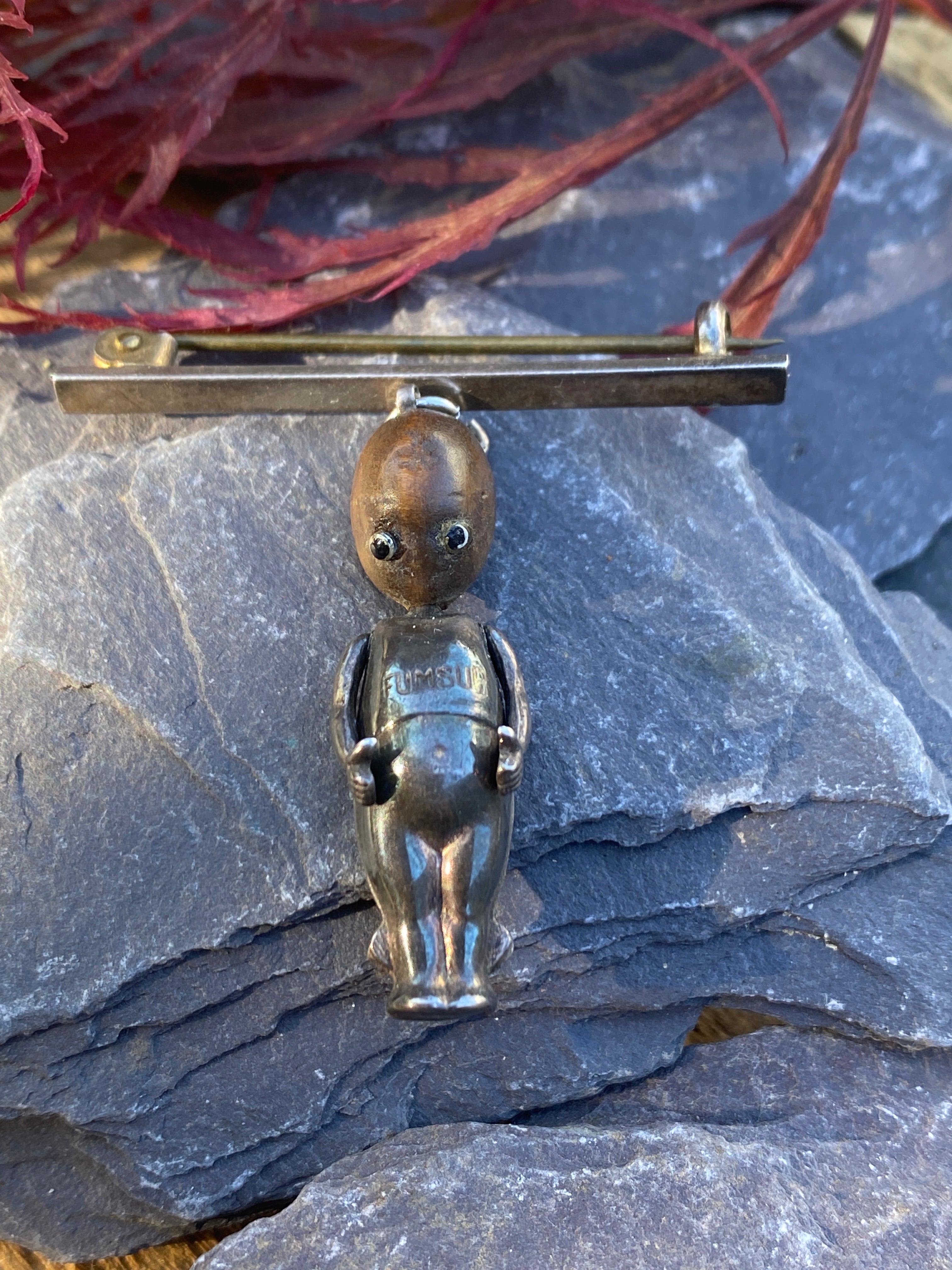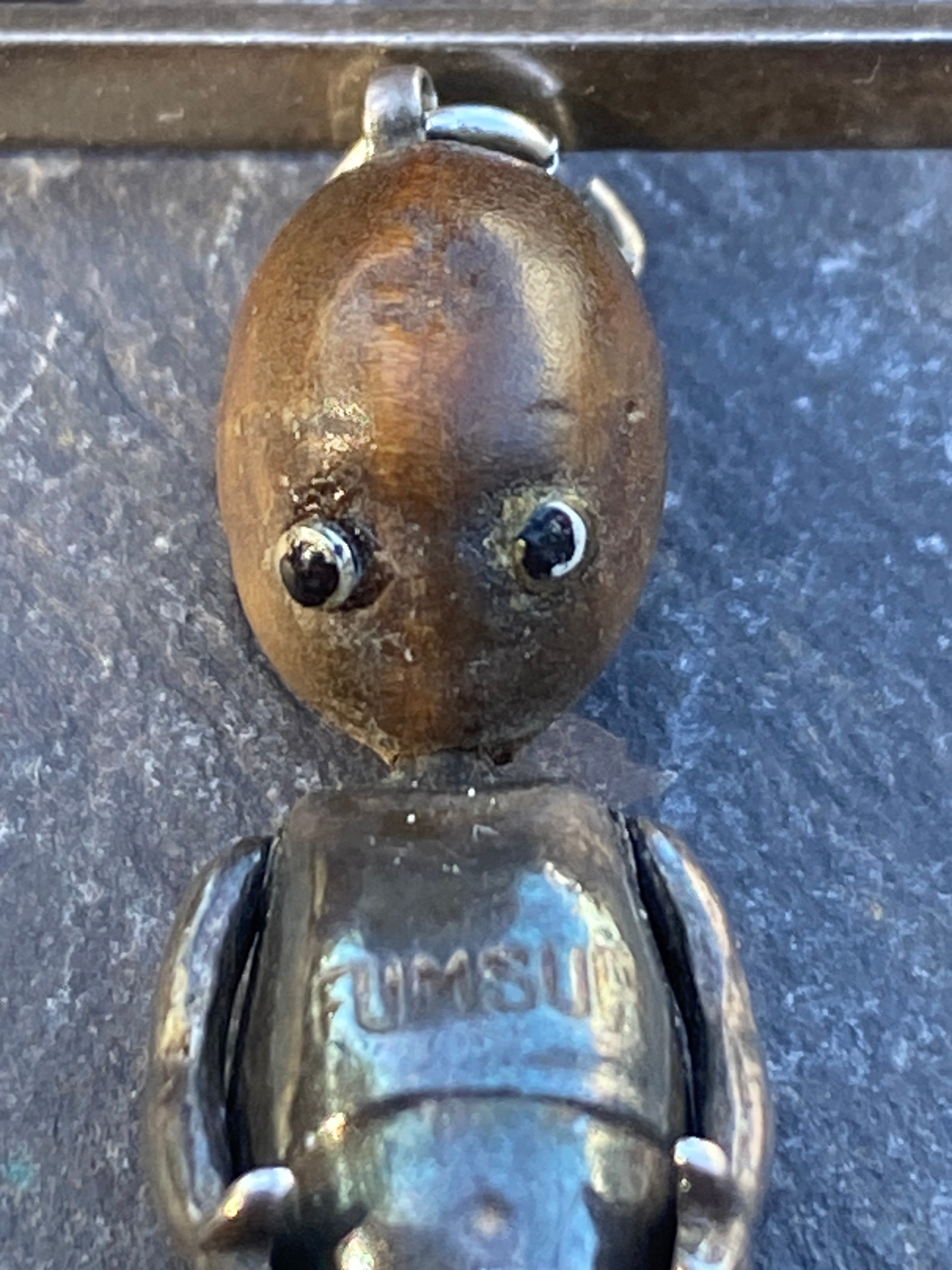 An antique WW1 lucky charm called Fumsup. He gives you the thumbs up but his head is made of wood so he is also touch wood. On his angles are wings which represents 'God speed' to aid your travels.He has his registered patent number down his back and Fumsup written across his chest and is suspended from a sterling silver bar brooch which is stamped sterling silver.