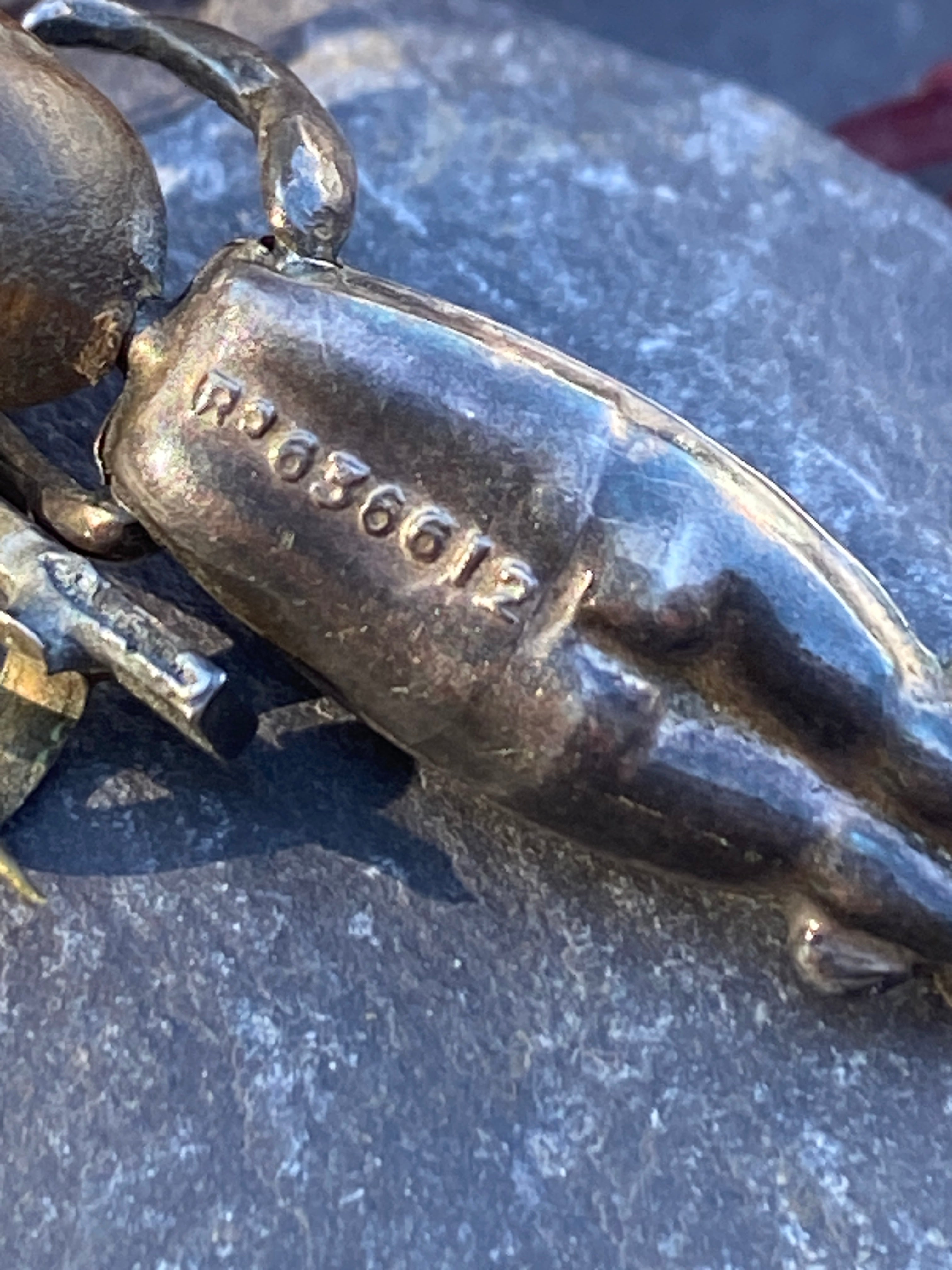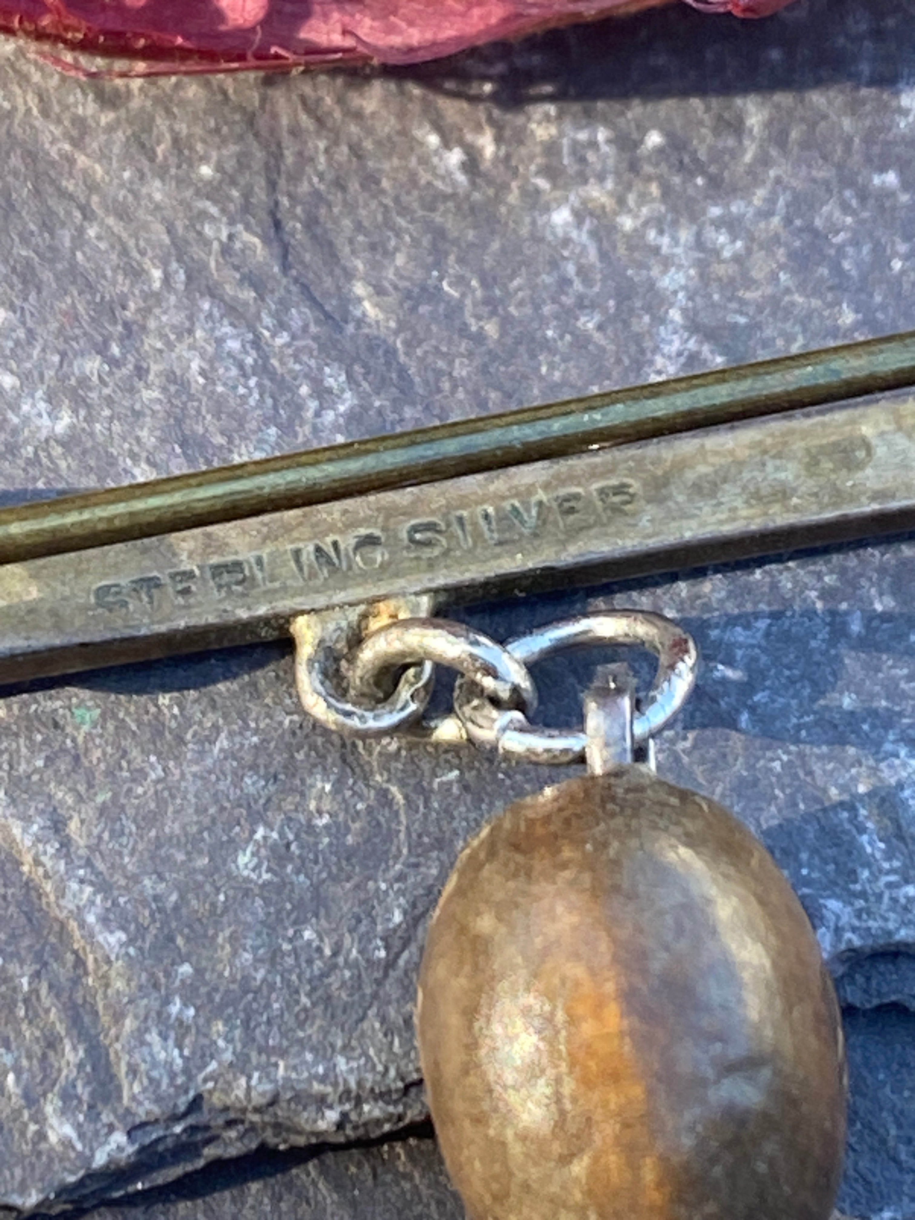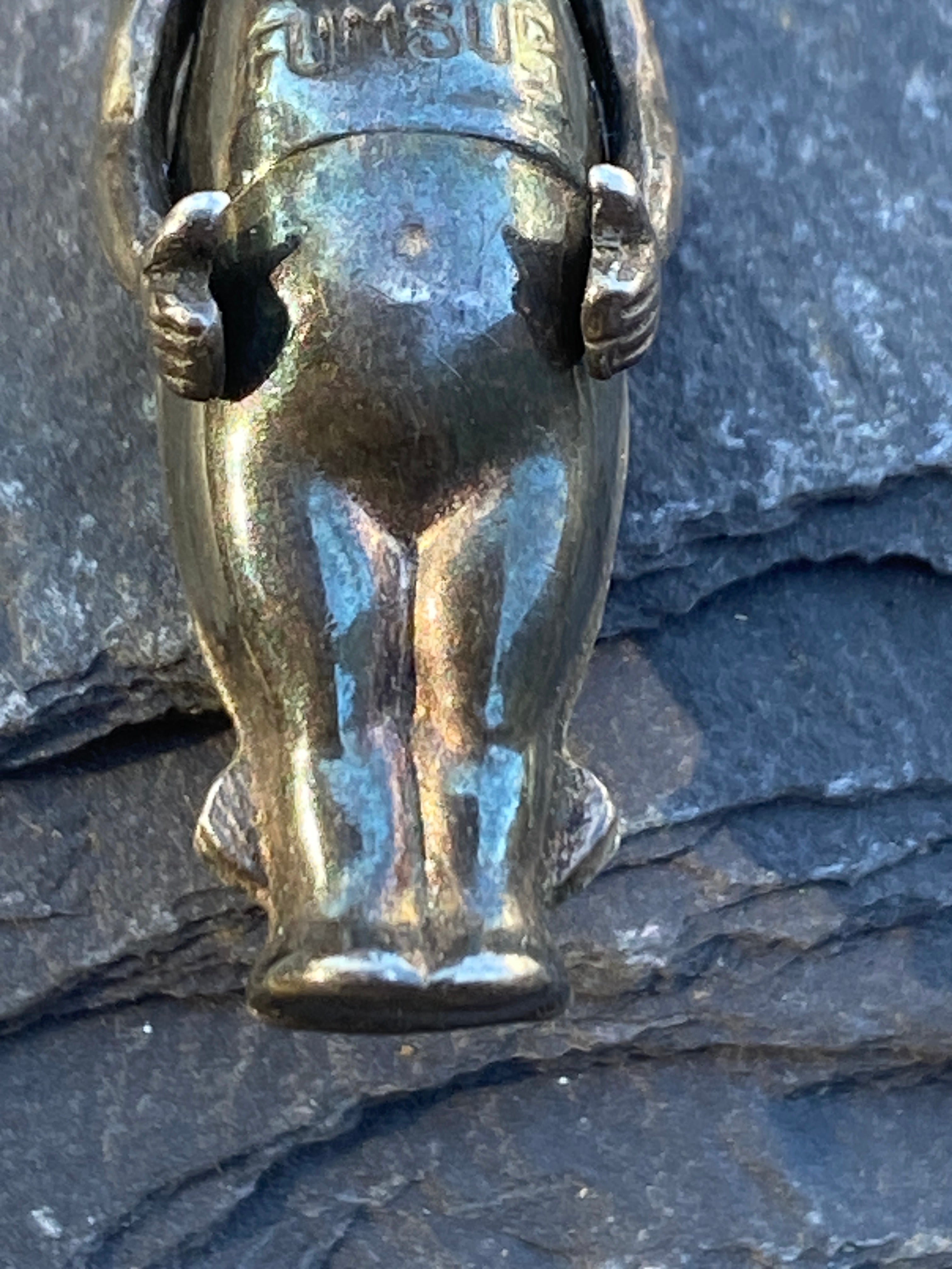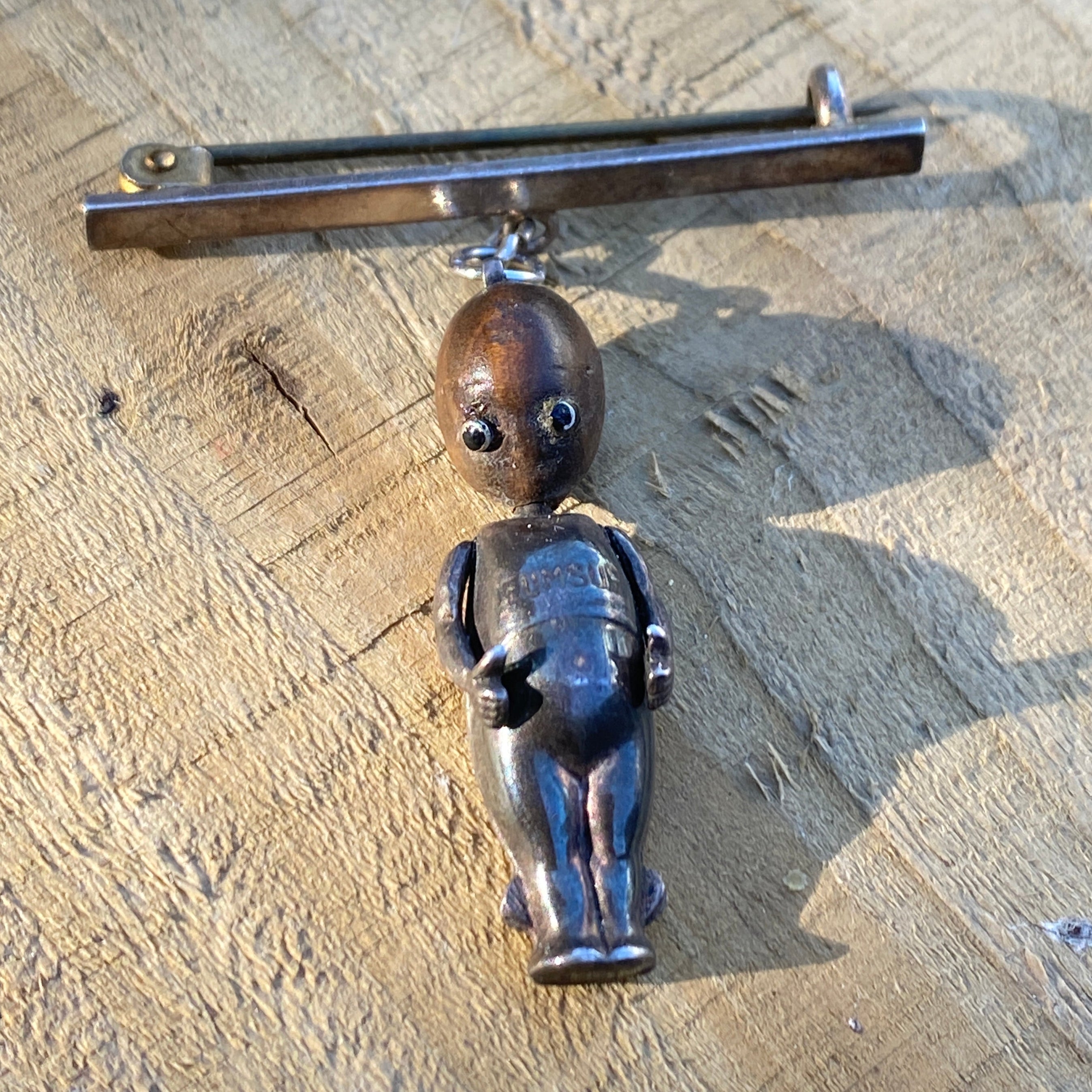 An antique WW1 lucky charm called Fumsup. He gives you the thumbs up but his head is made of wood so he is also touch wood. On his angles are wings which represents 'God speed' to aid your travels.He has his registered patent number down his back and Fumsup written across his chest and is suspended from a sterling silver bar brooch which is stamped sterling silver.