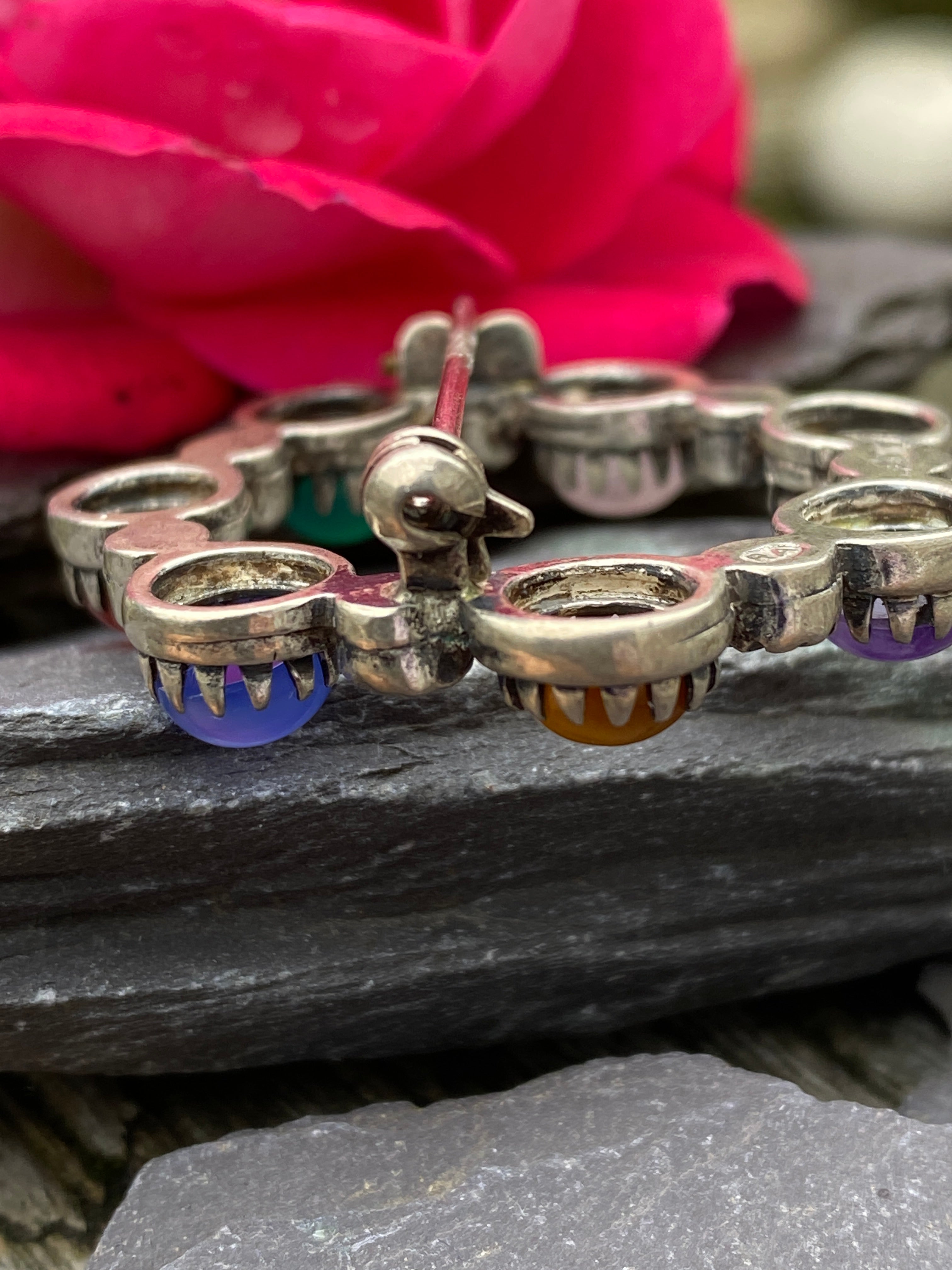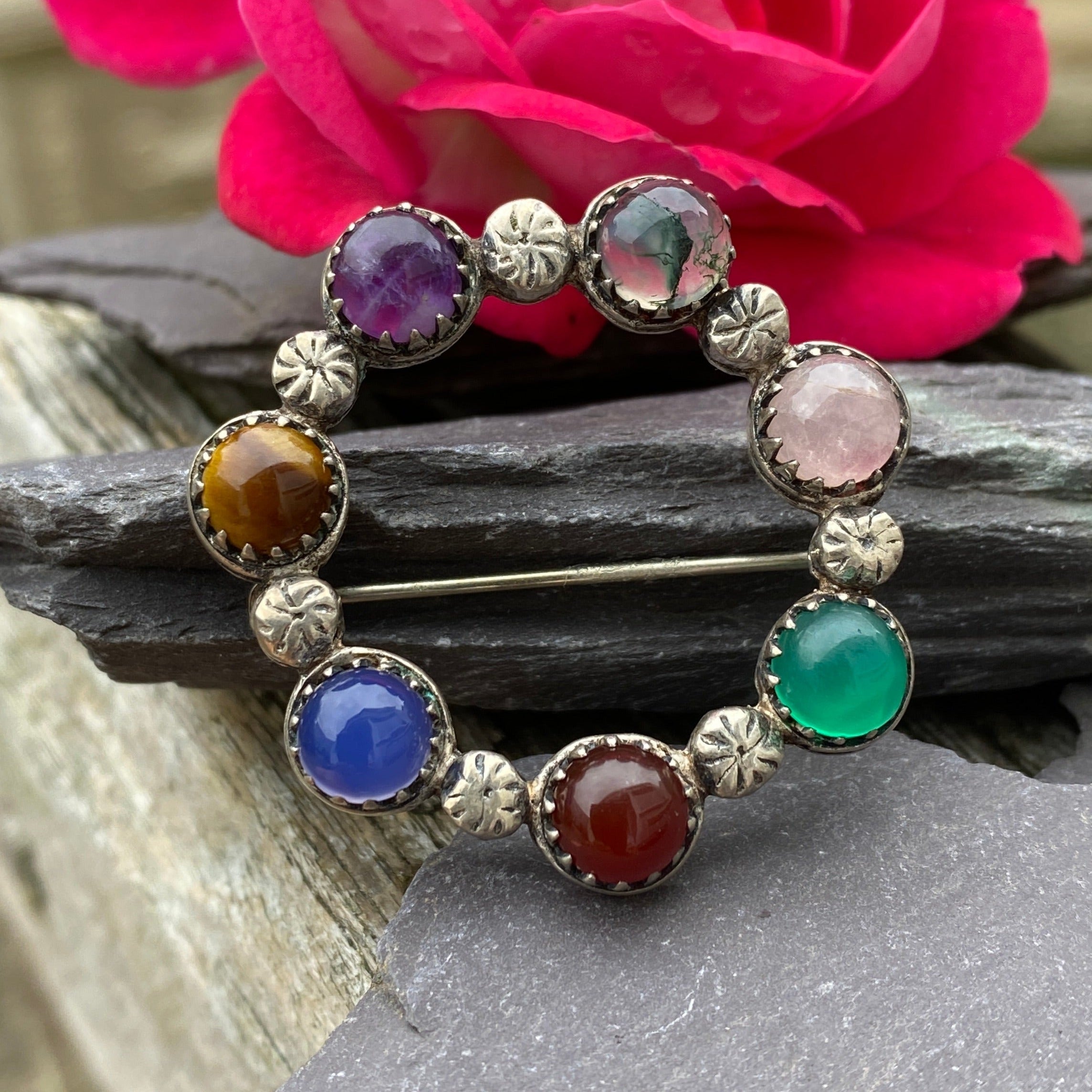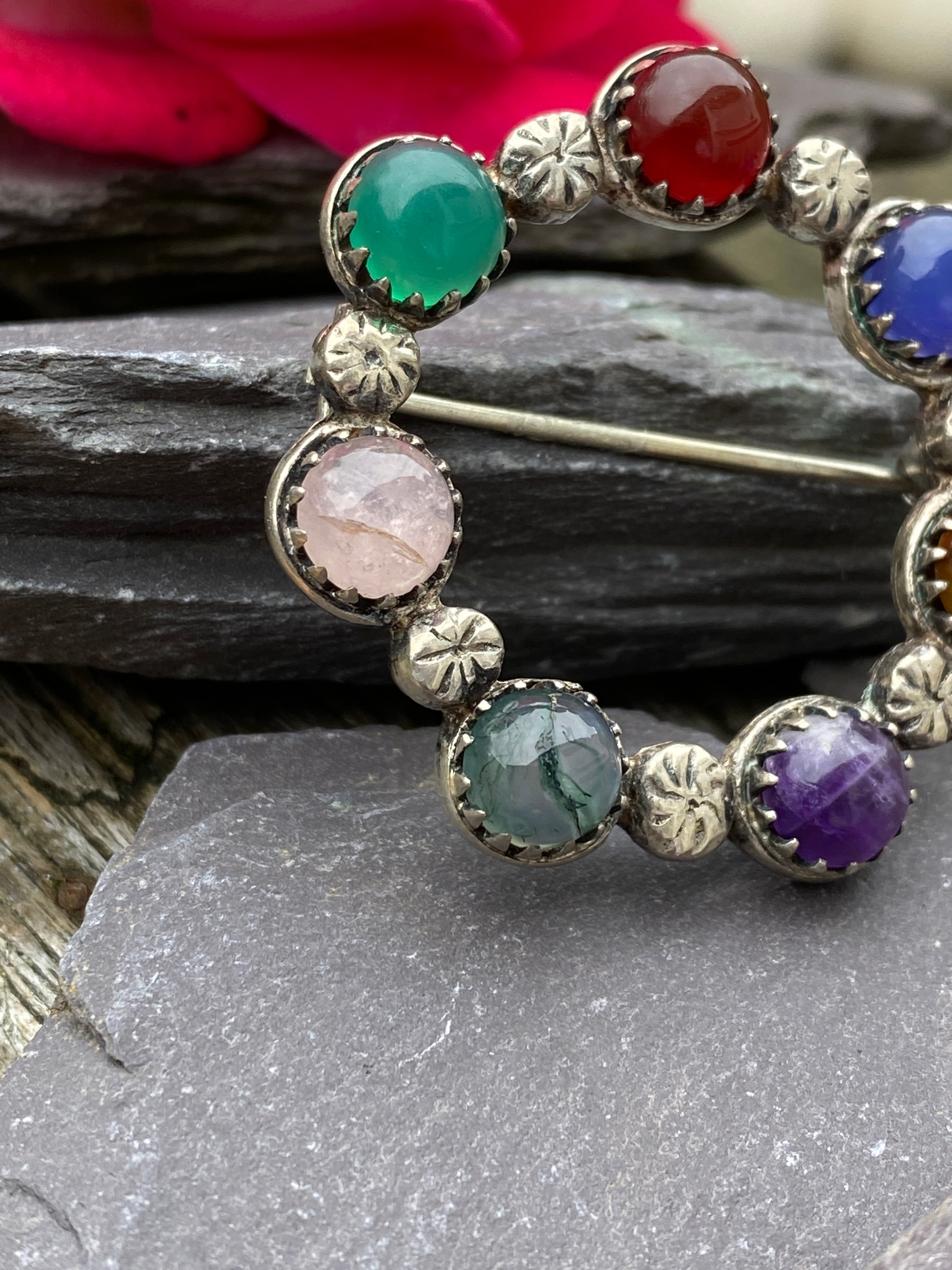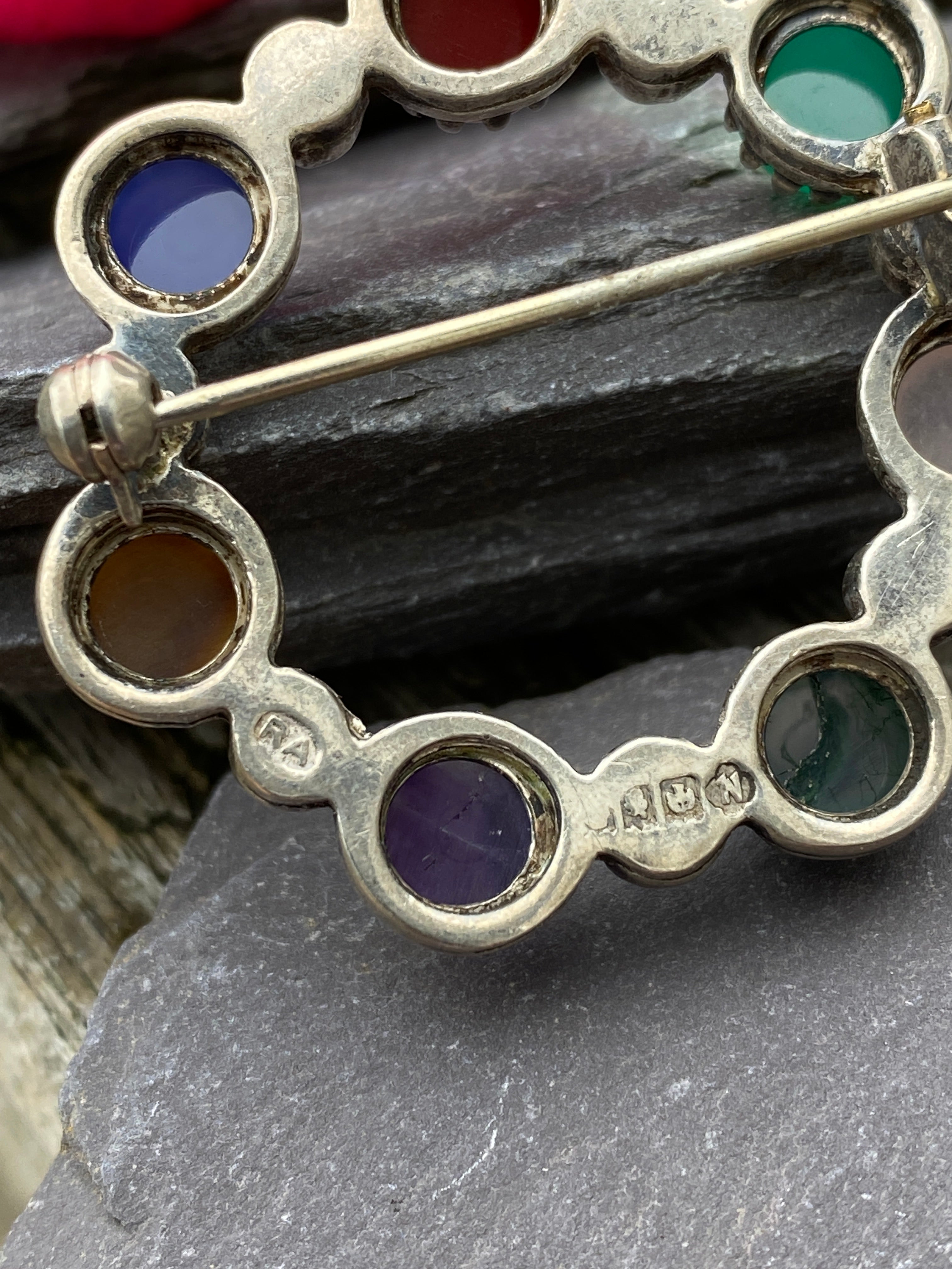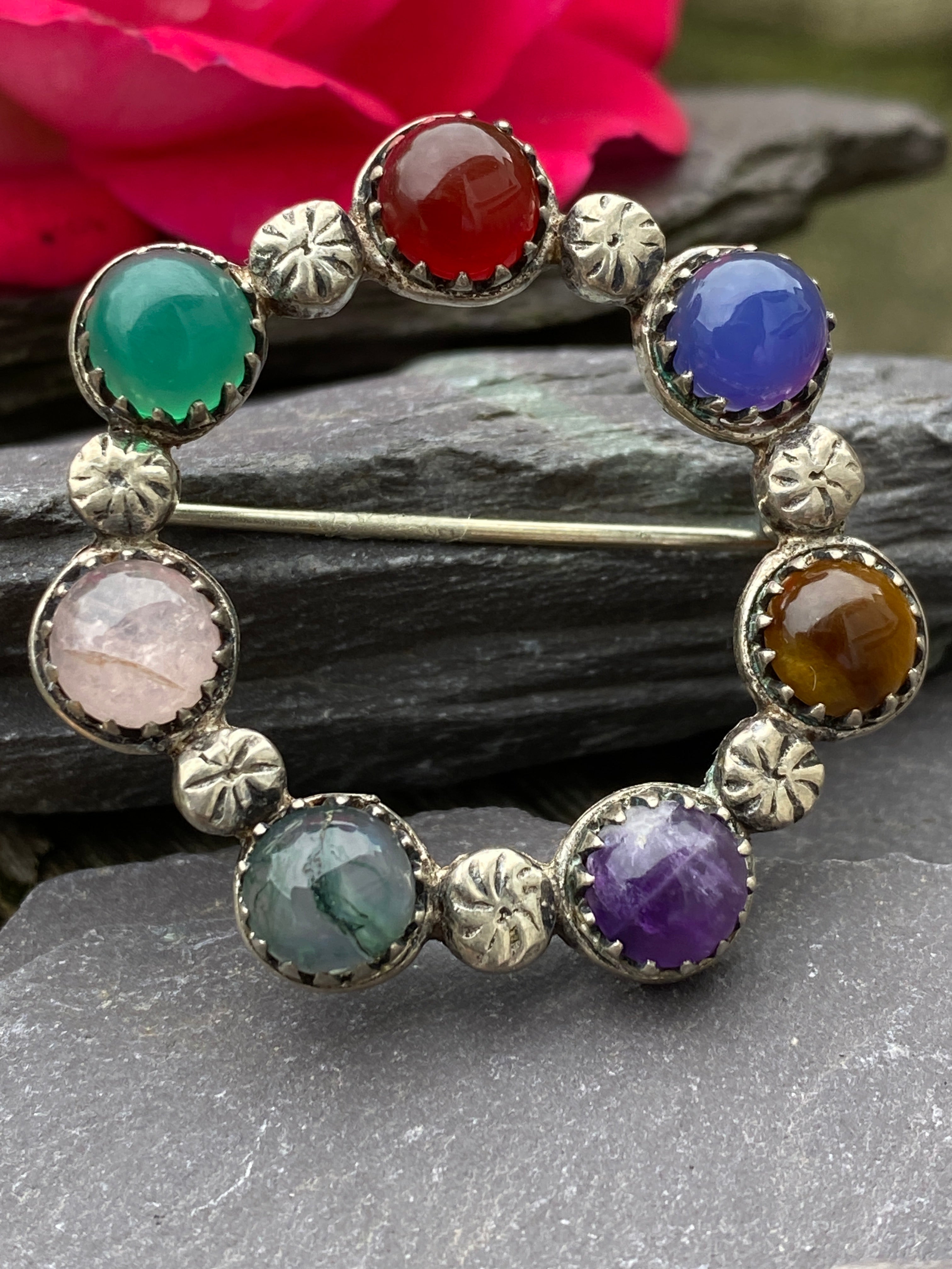 A beautiful Round Celtic Sterling silver brooch set with Moss agate, Rose quartz, Tigers eye, chalcedony, Chrysophrase, Amethyst and Carnelian.