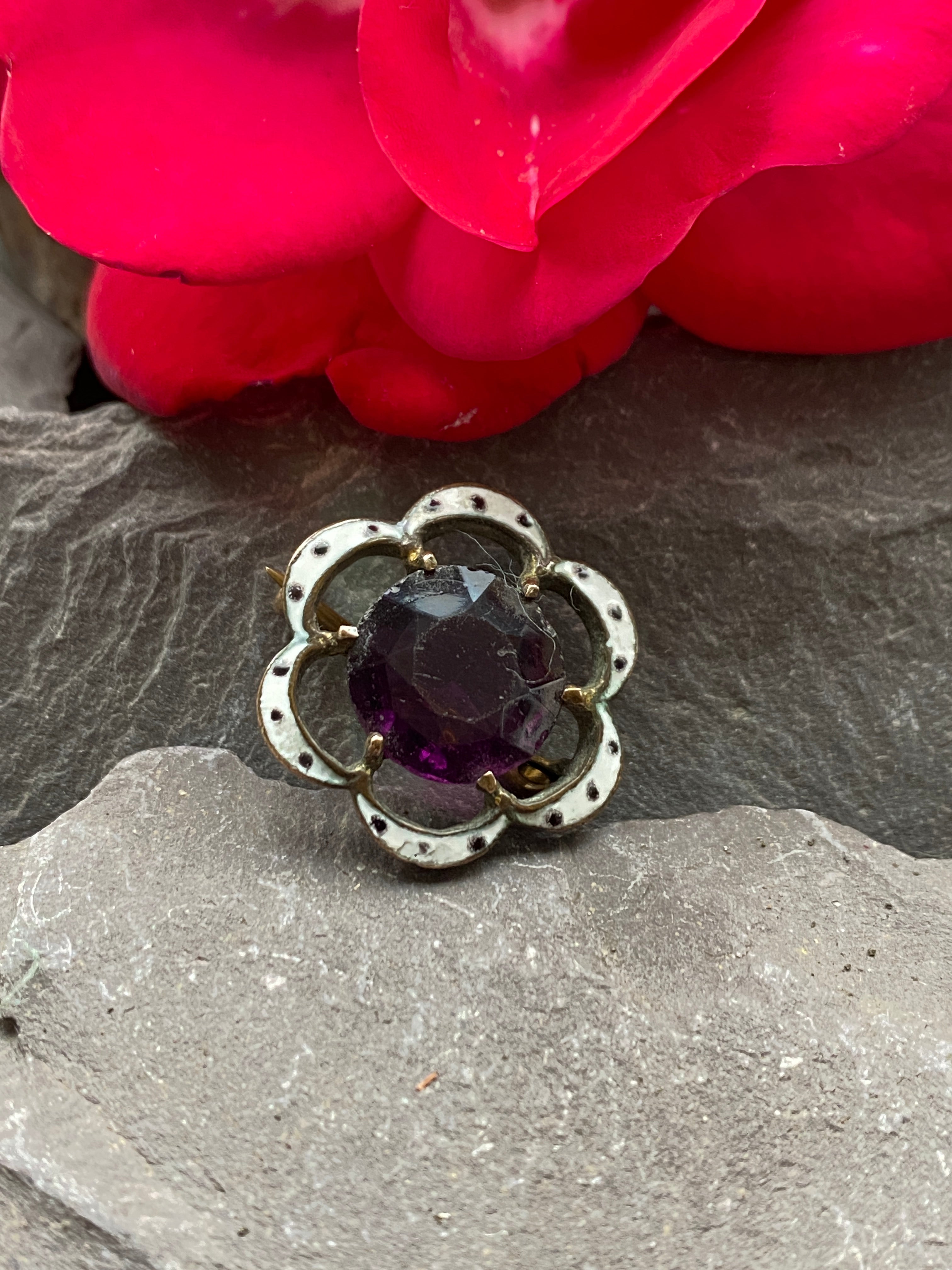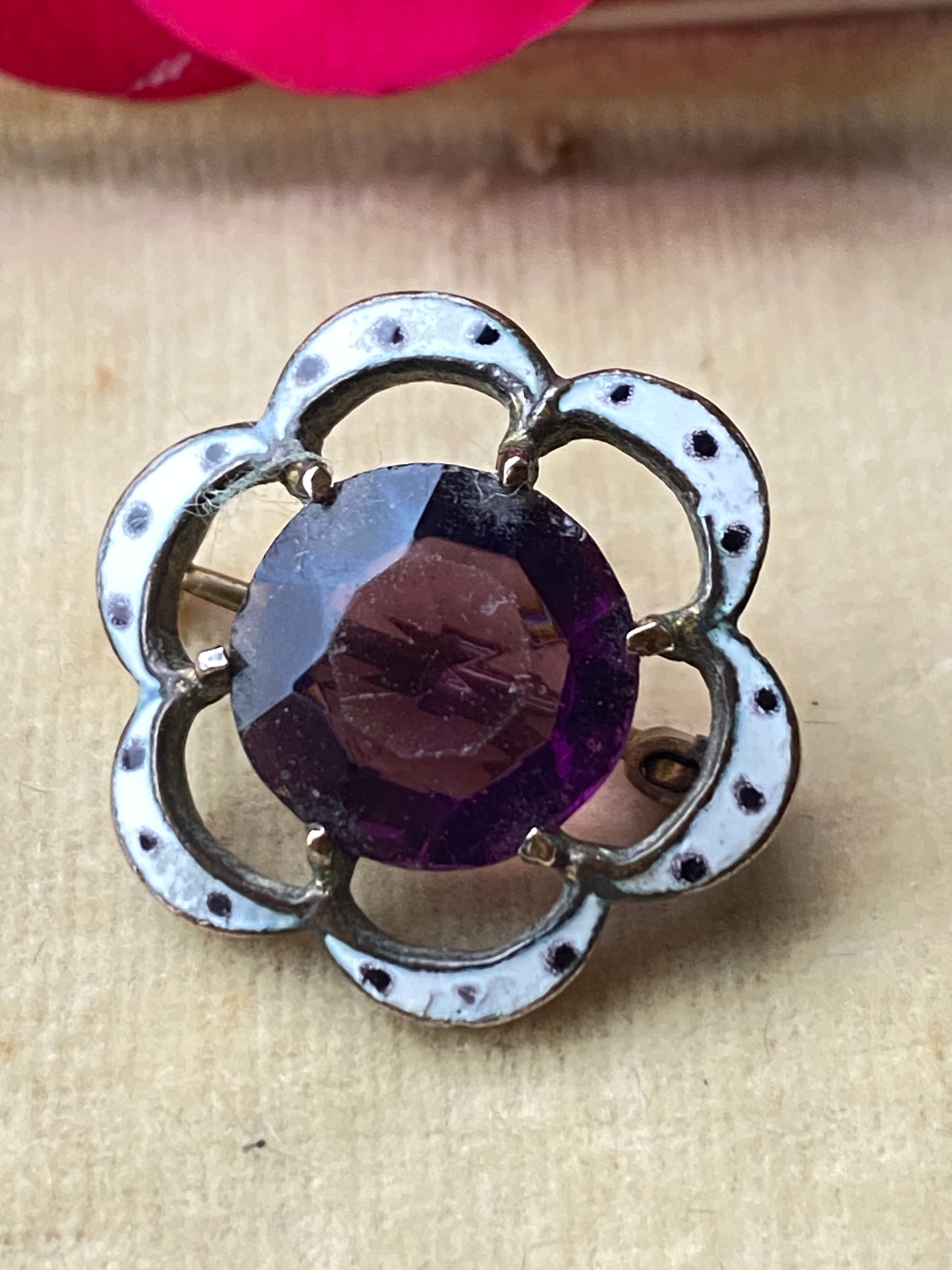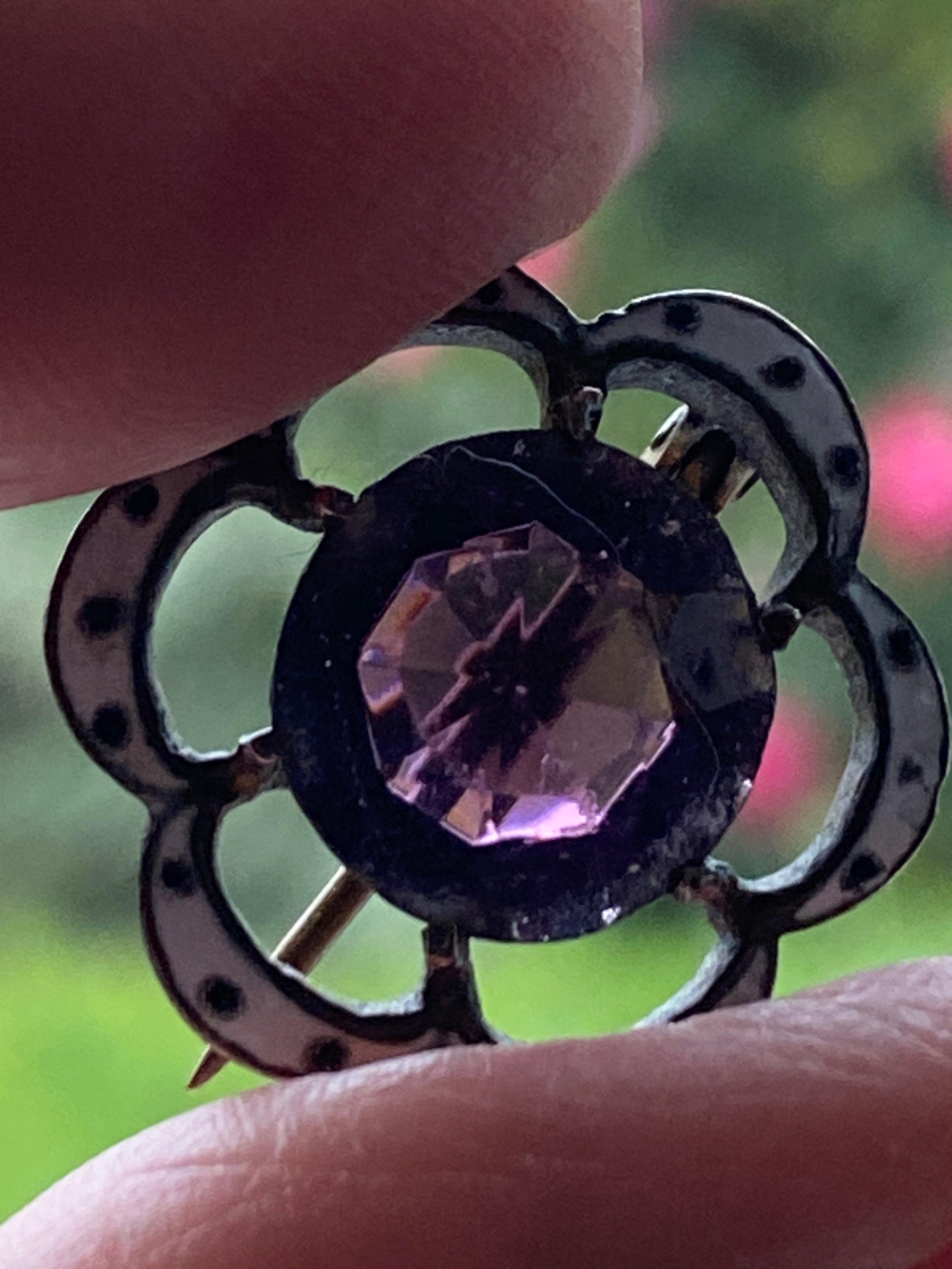 A pretty little Early Victorian brooch in Brass decorated with white and black enamel and set with a purple paste stone
