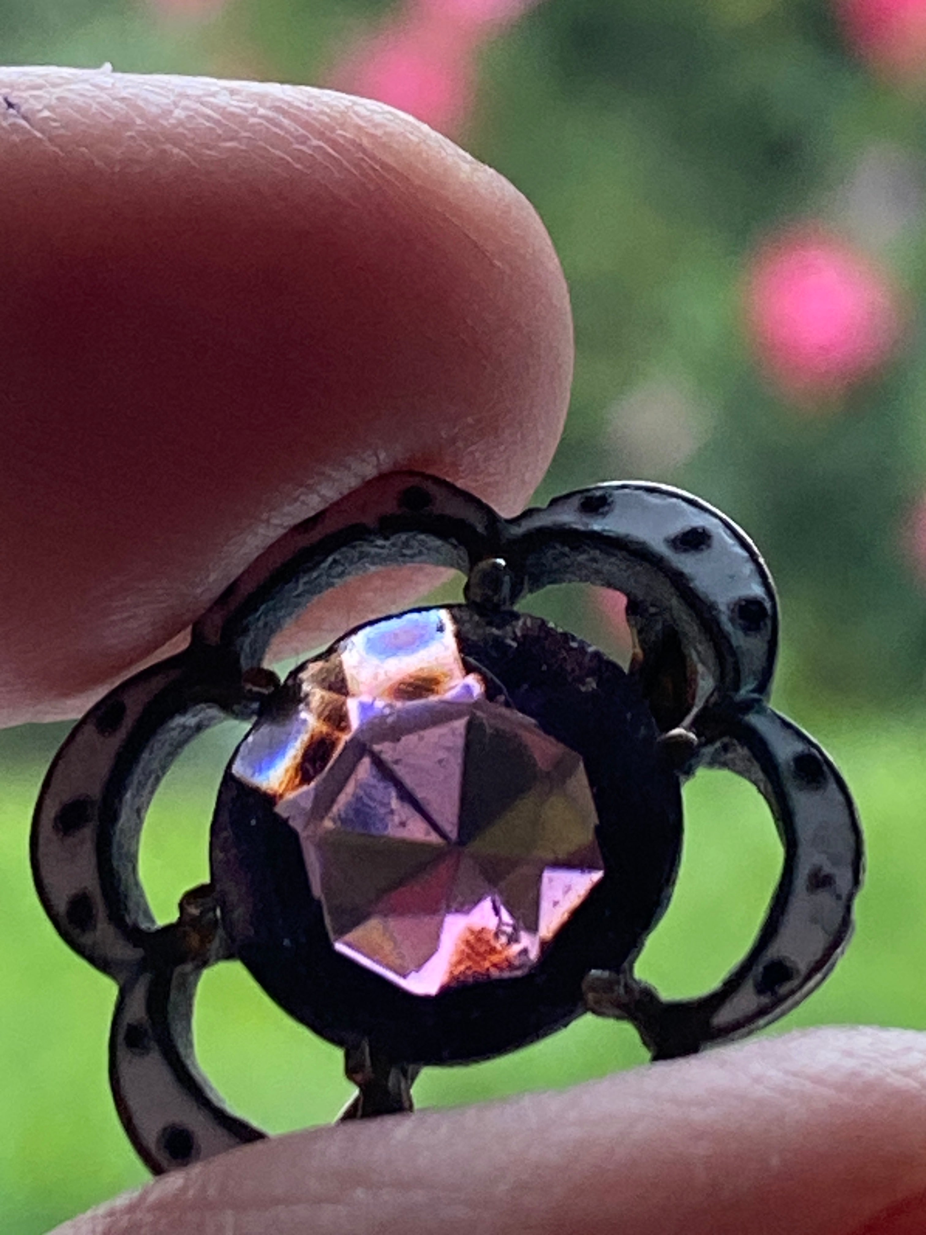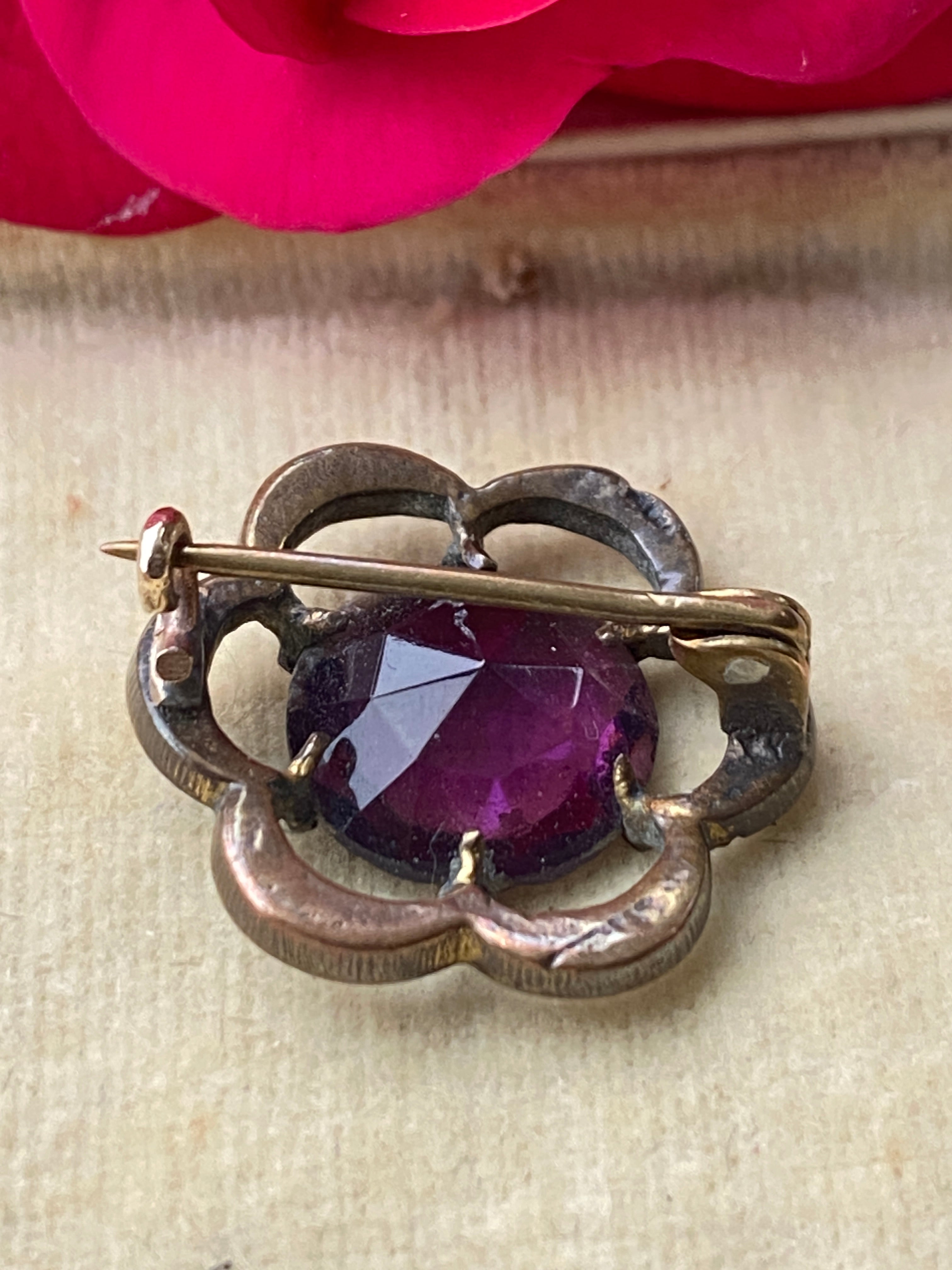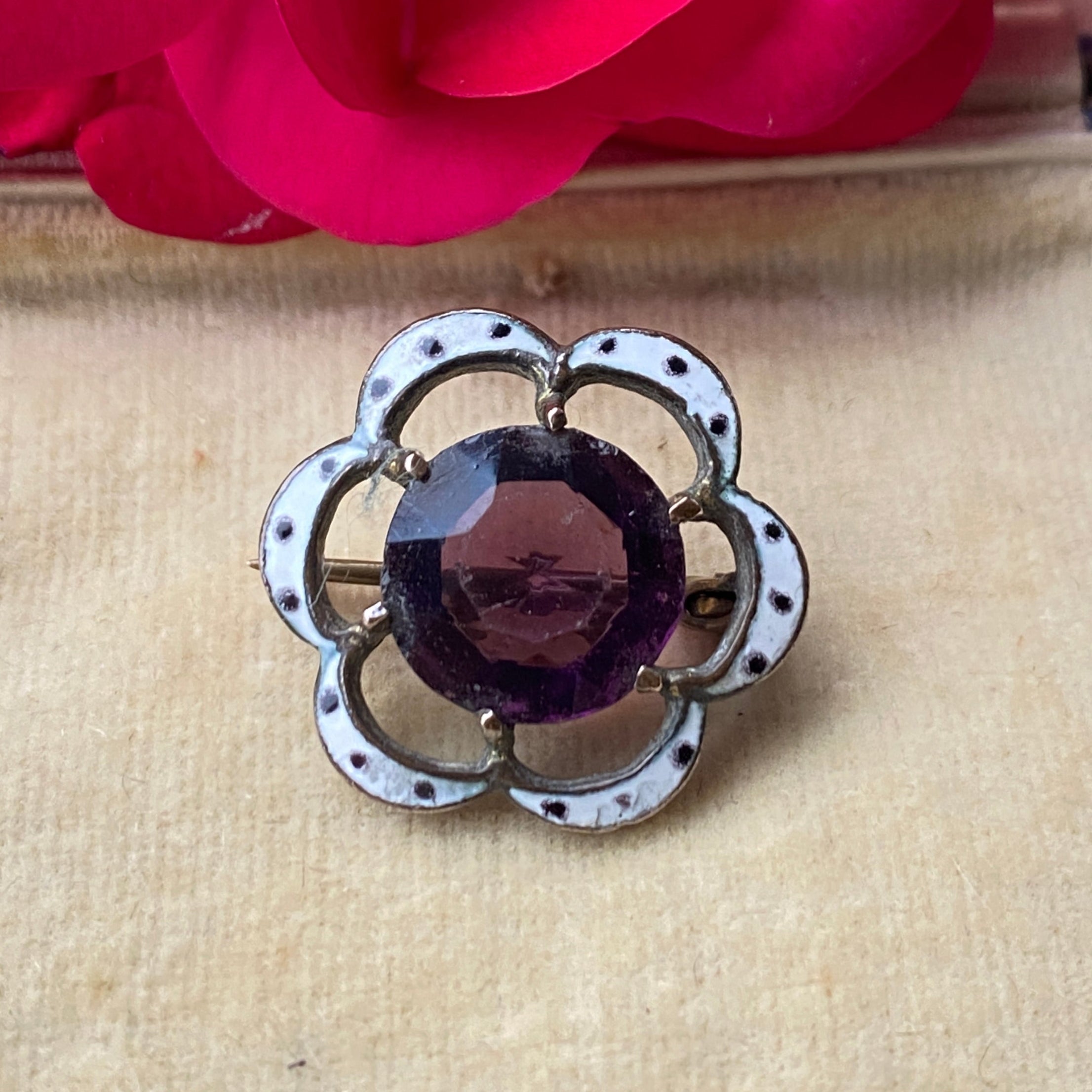 A pretty little Early Victorian brooch in Brass decorated with white and black enamel and set with a purple paste stone