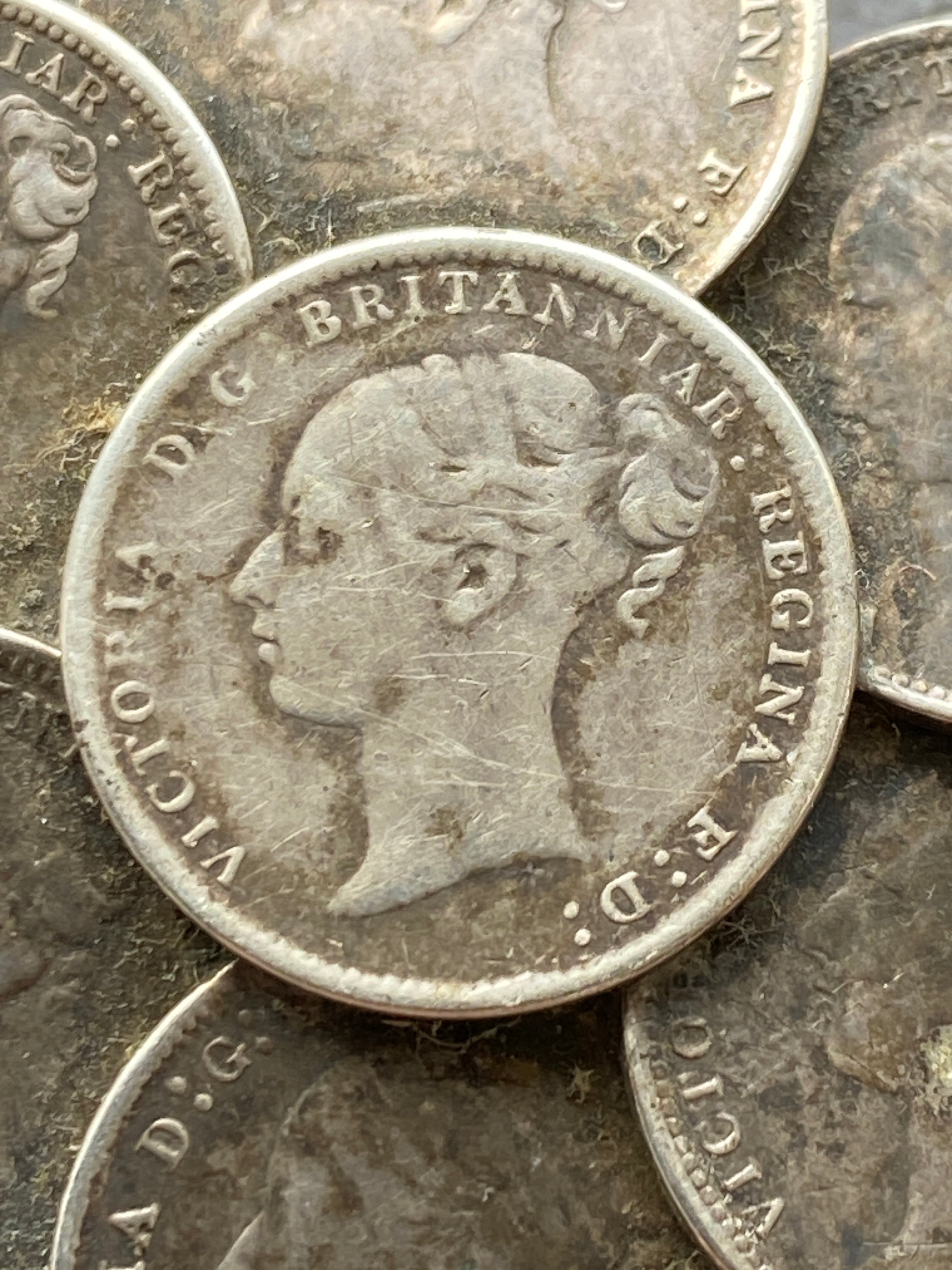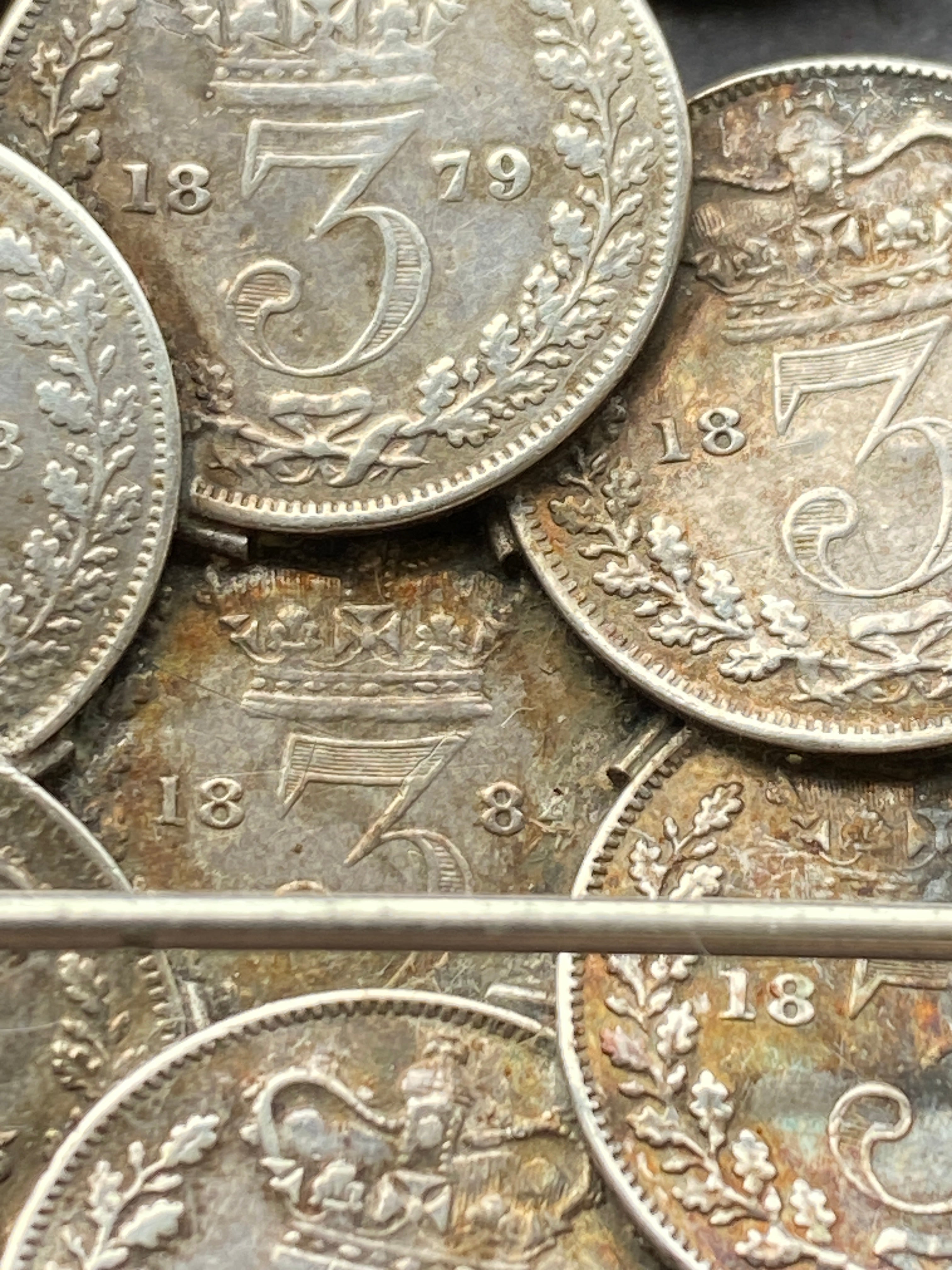A Victorian brooch consisting of genuine three penny coins fused together to make a round broochCoins date from 1874 to 1884Measures 45mm acrossC clasp fasteningIn unclean original condition....