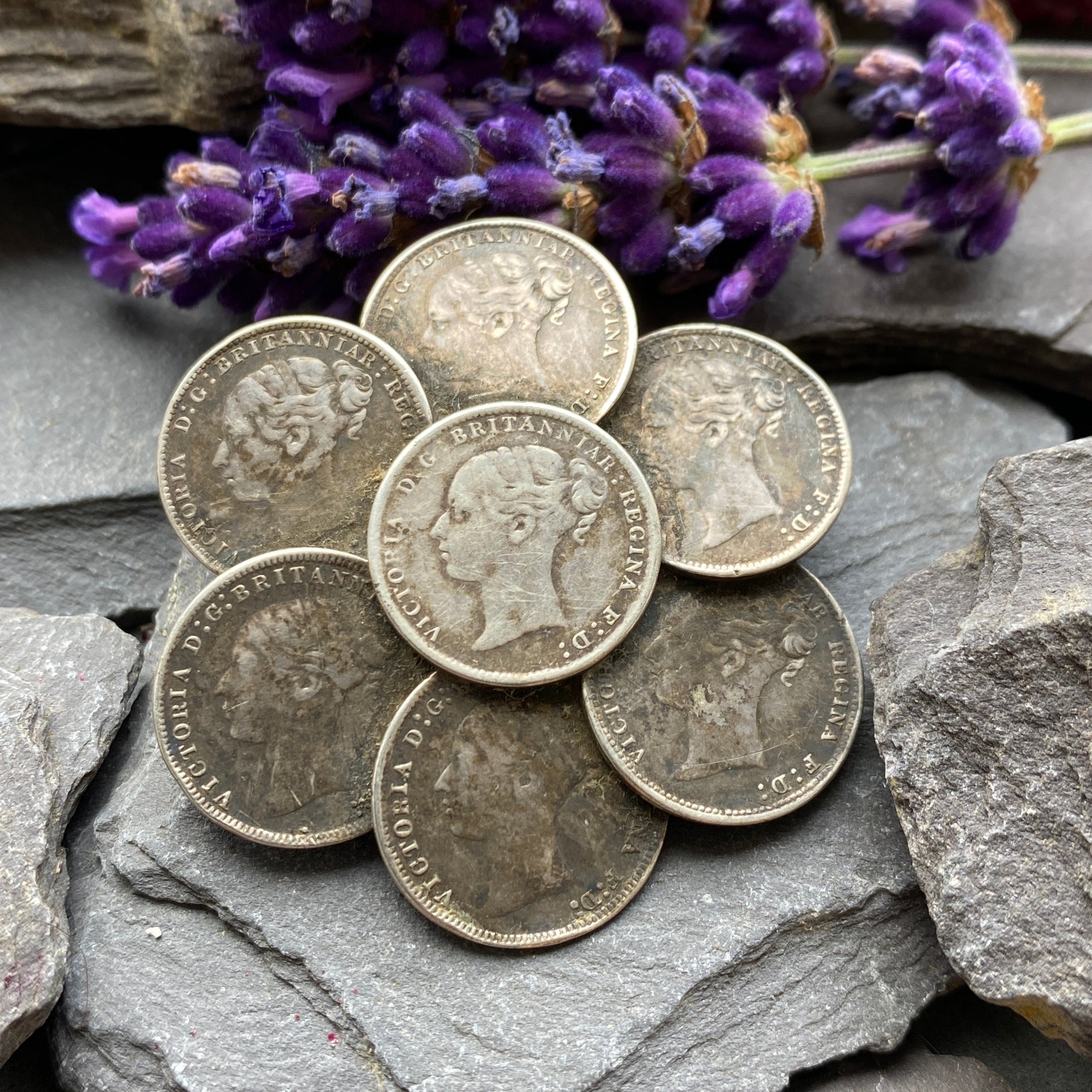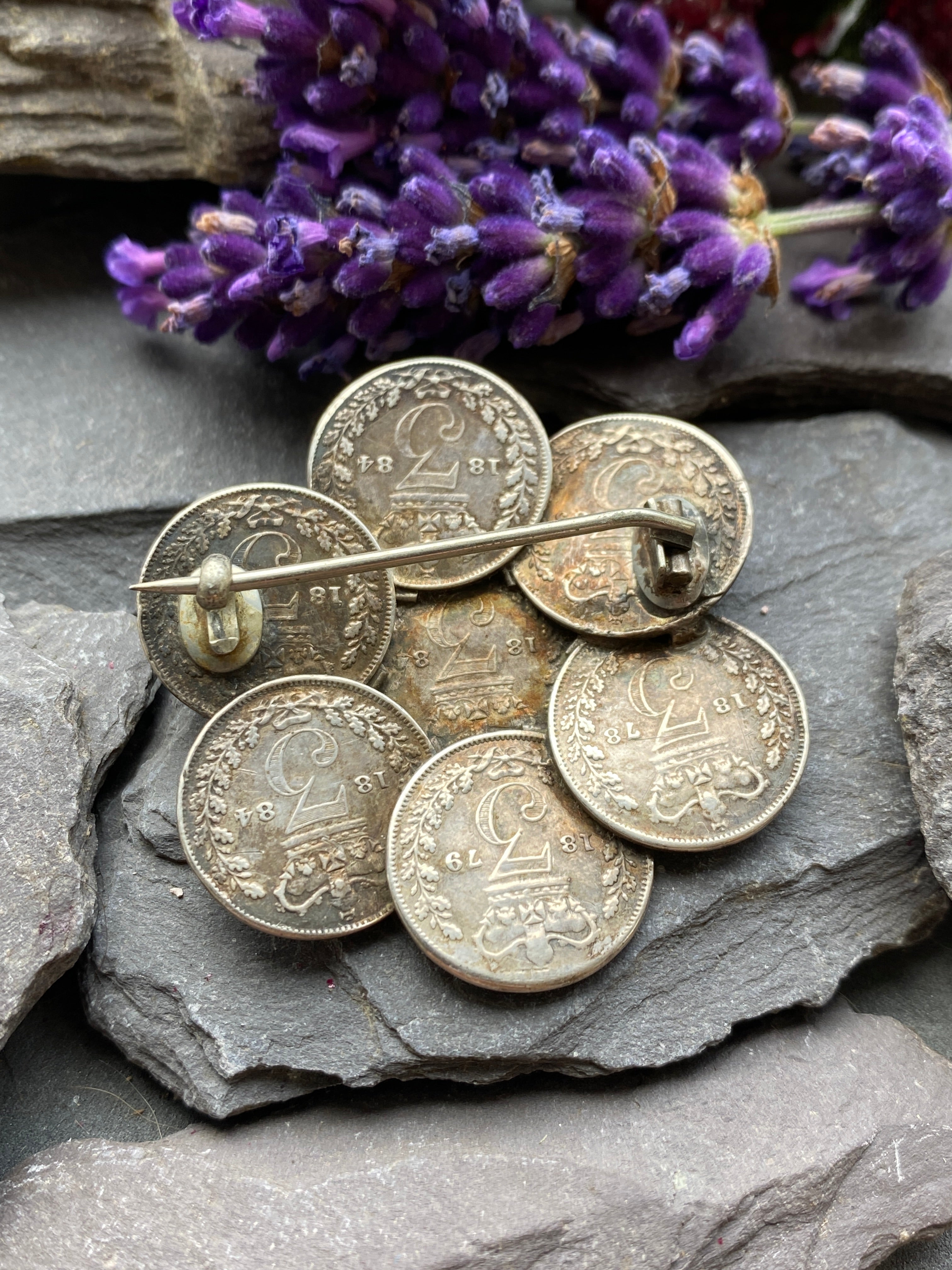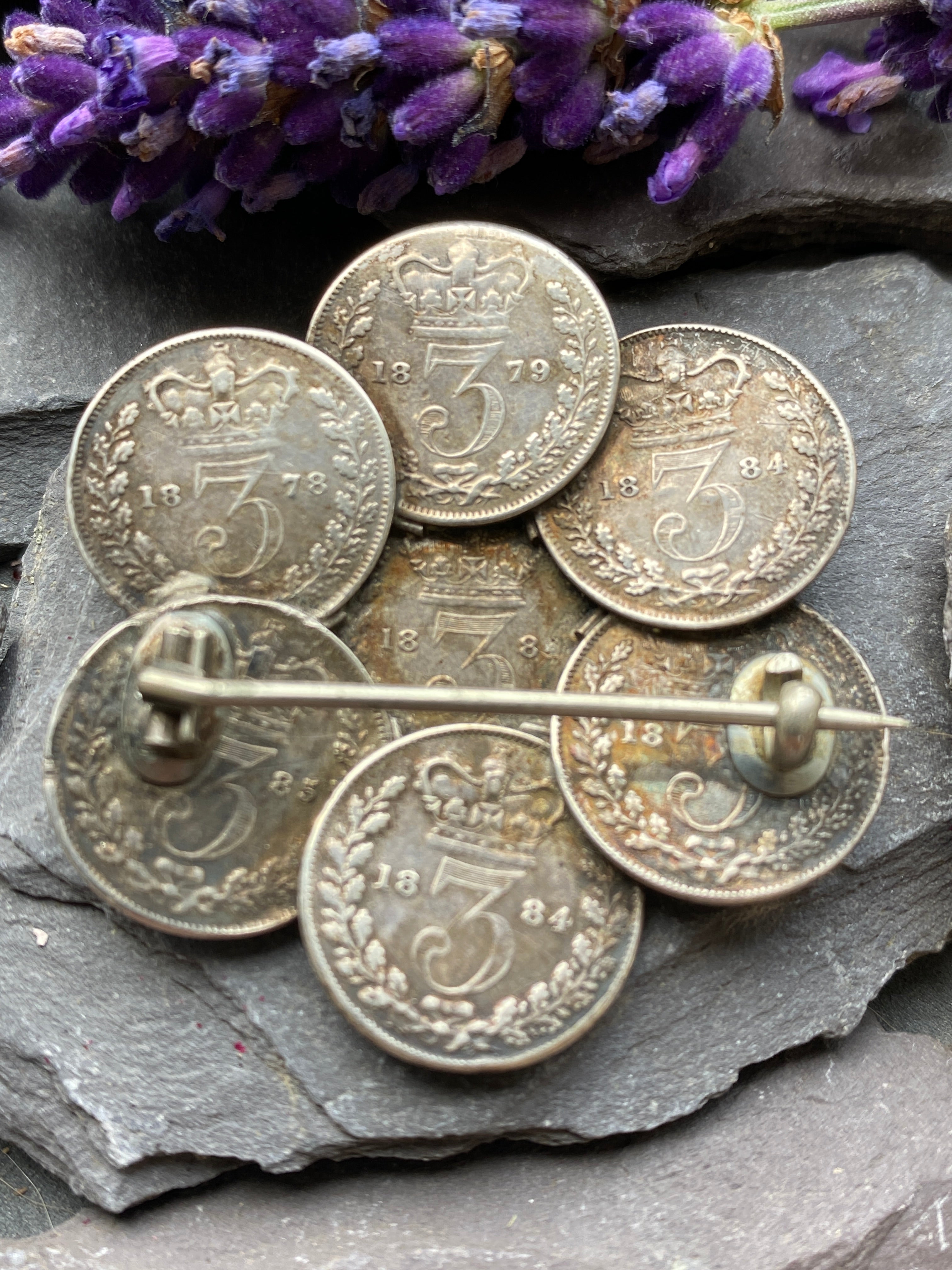A Victorian brooch consisting of genuine three penny coins fused together to make a round brooch