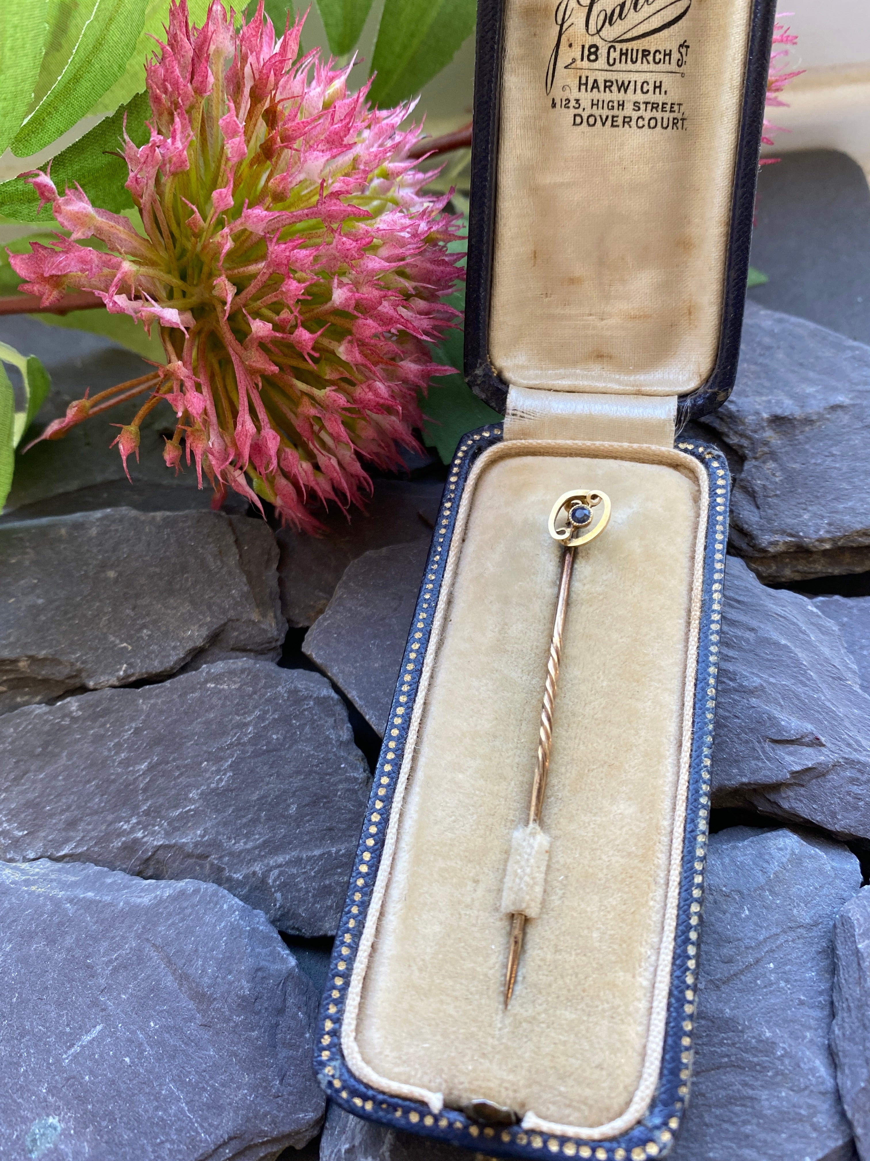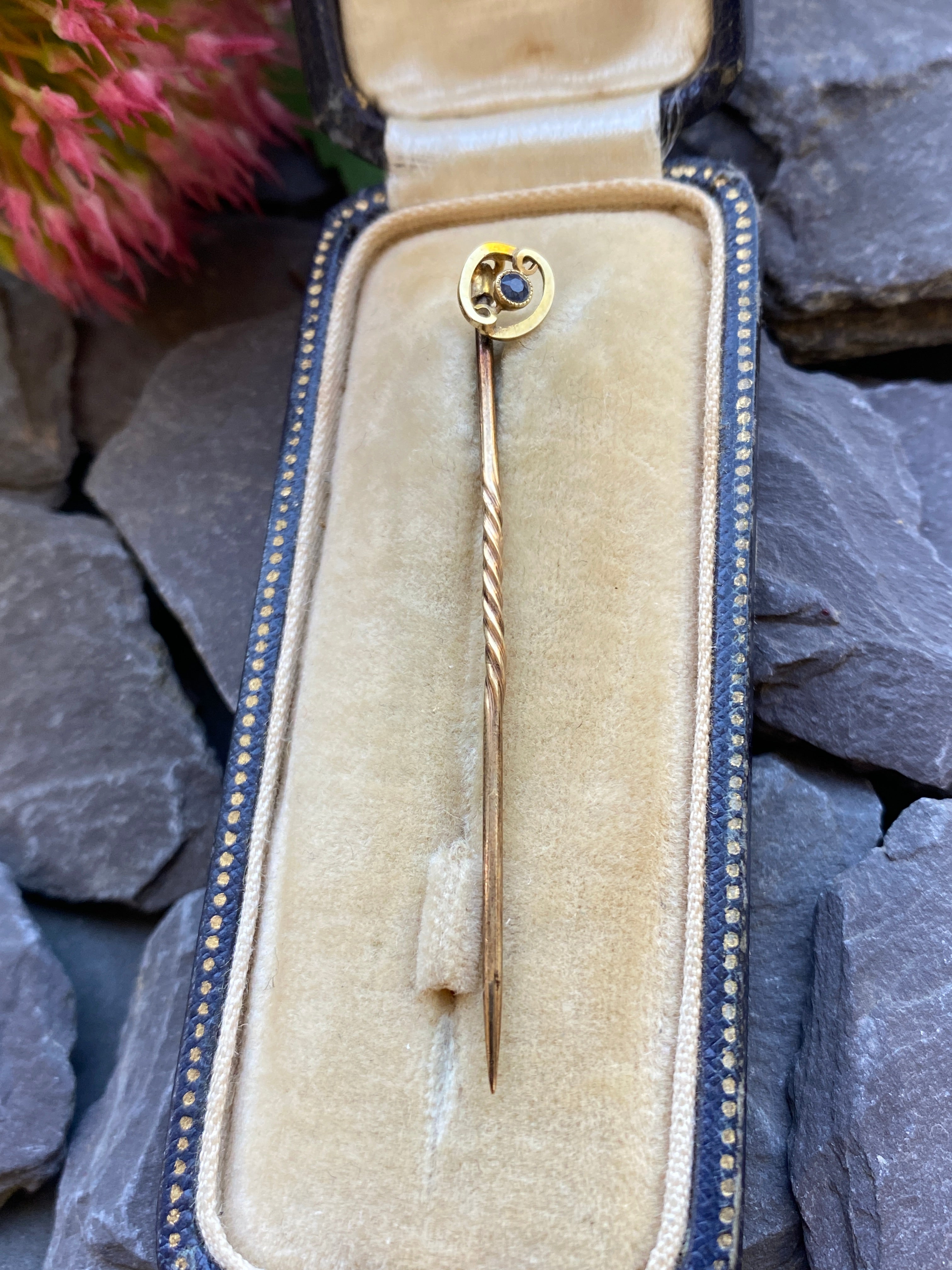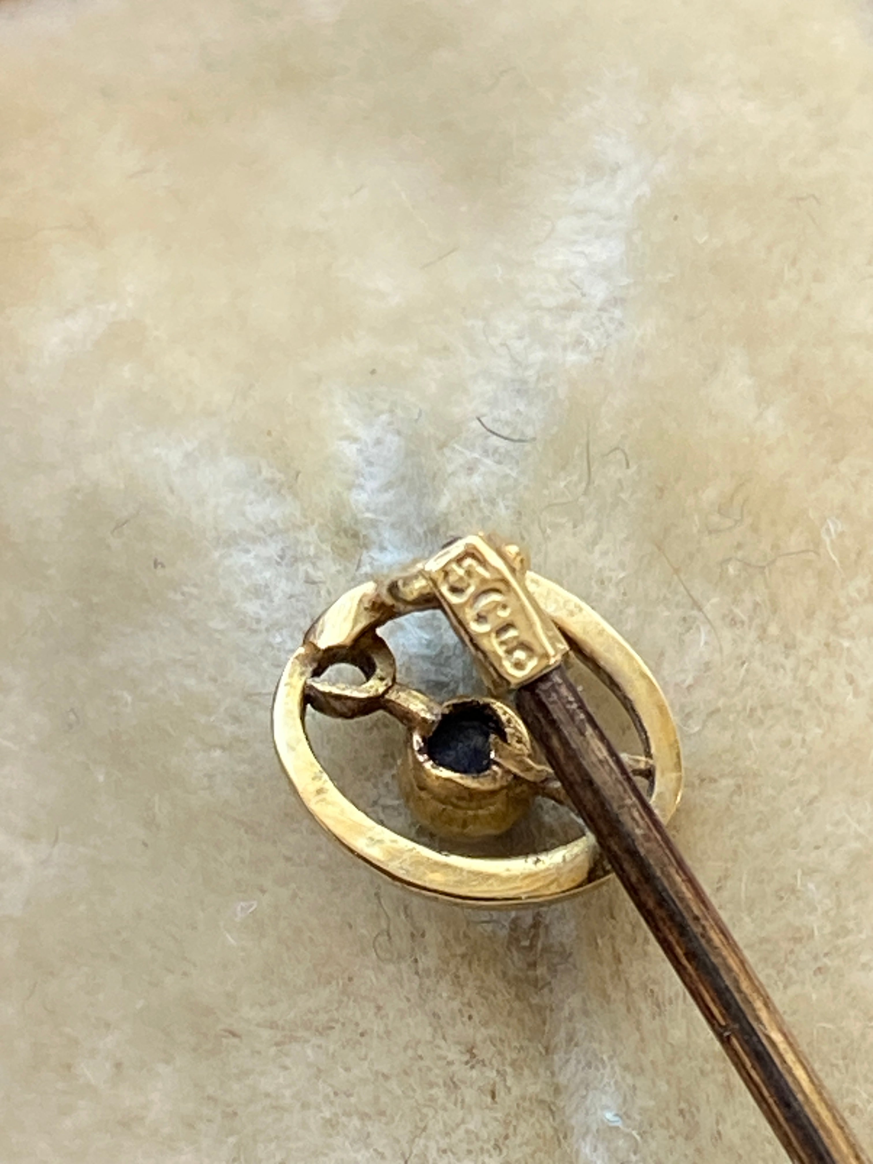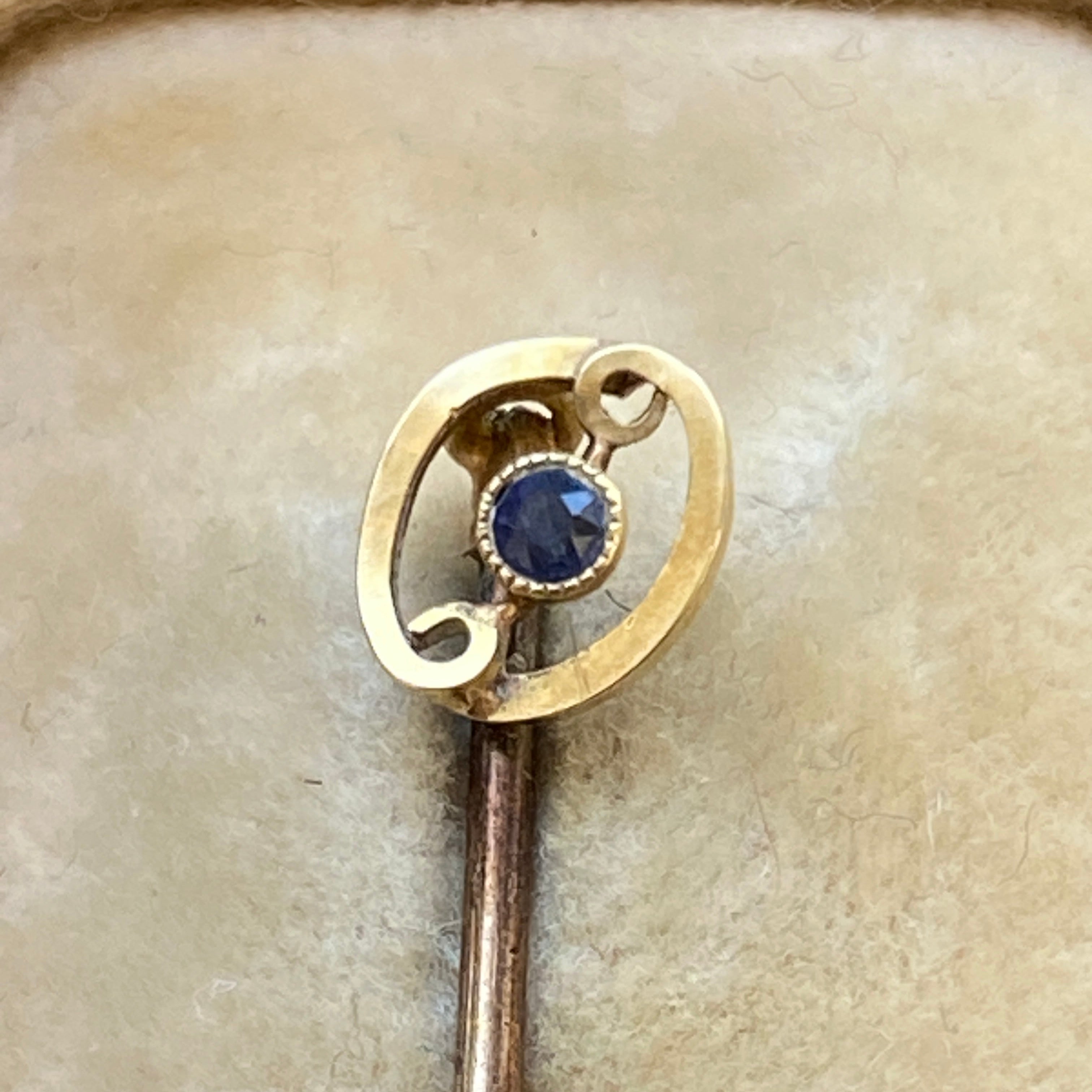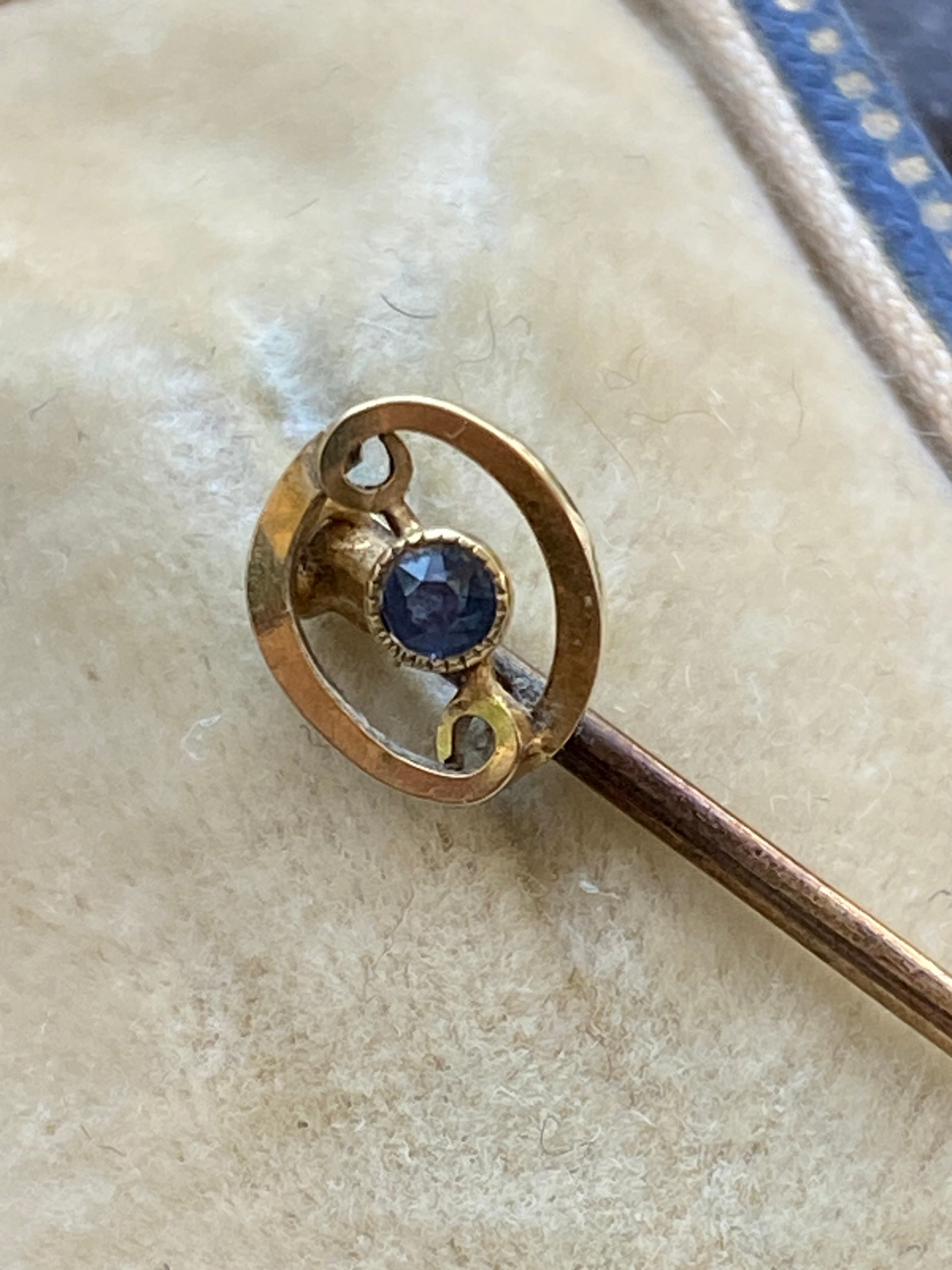 Antique Art Deco 15ct gold stick pin or lapel pin set with a blue sapphire