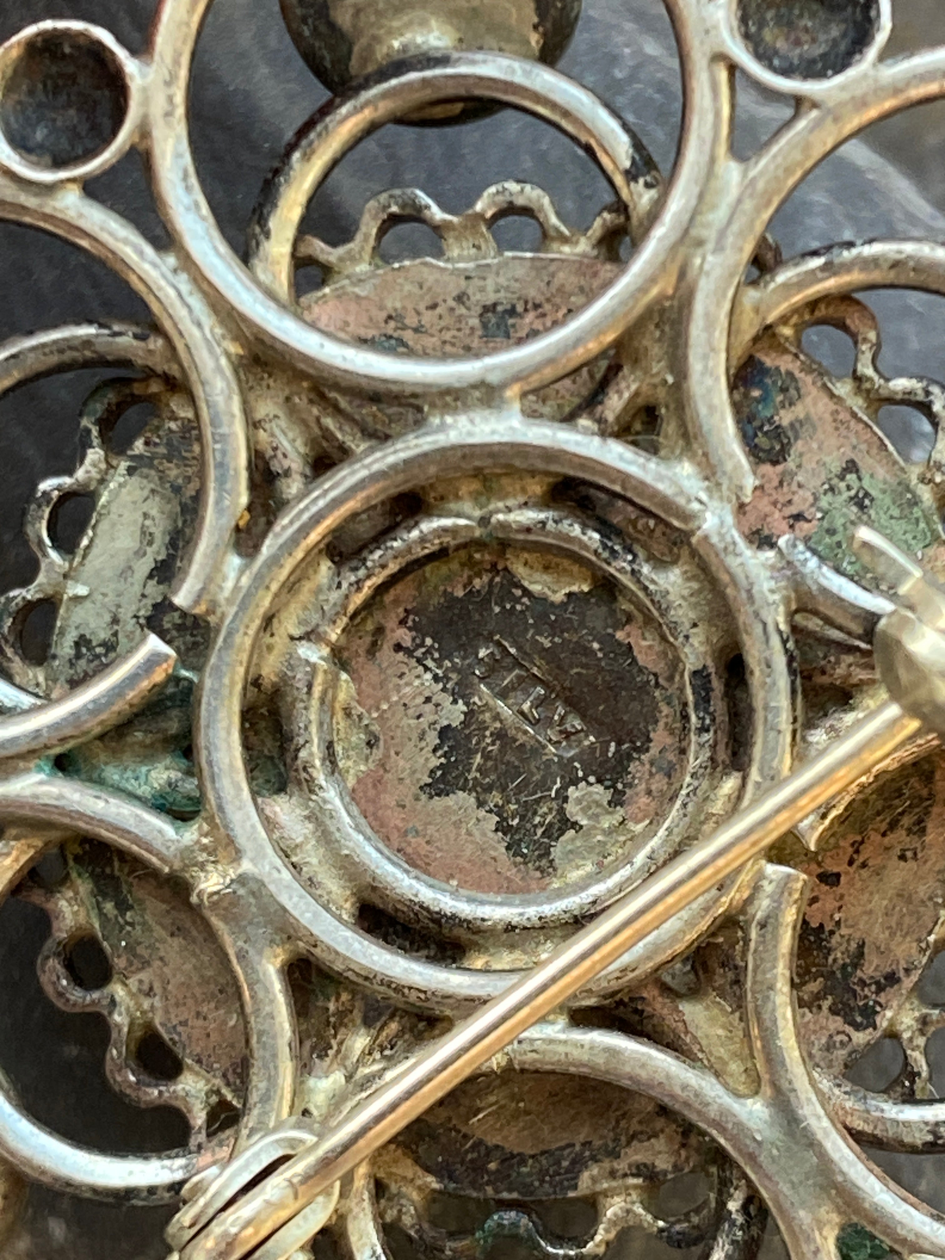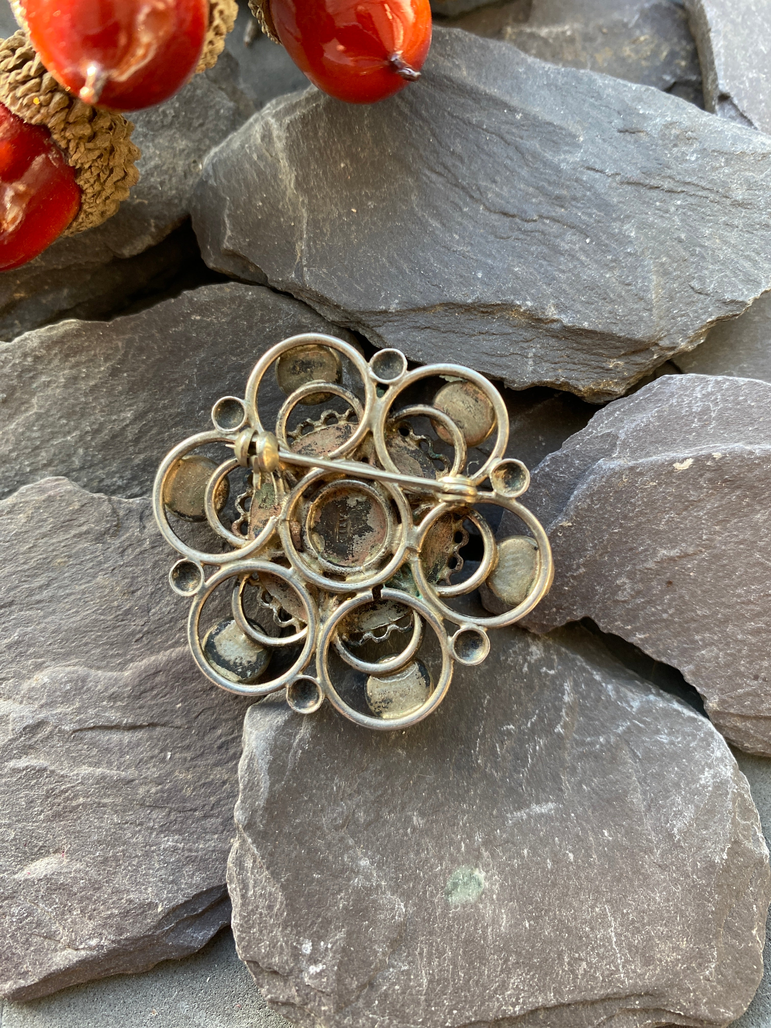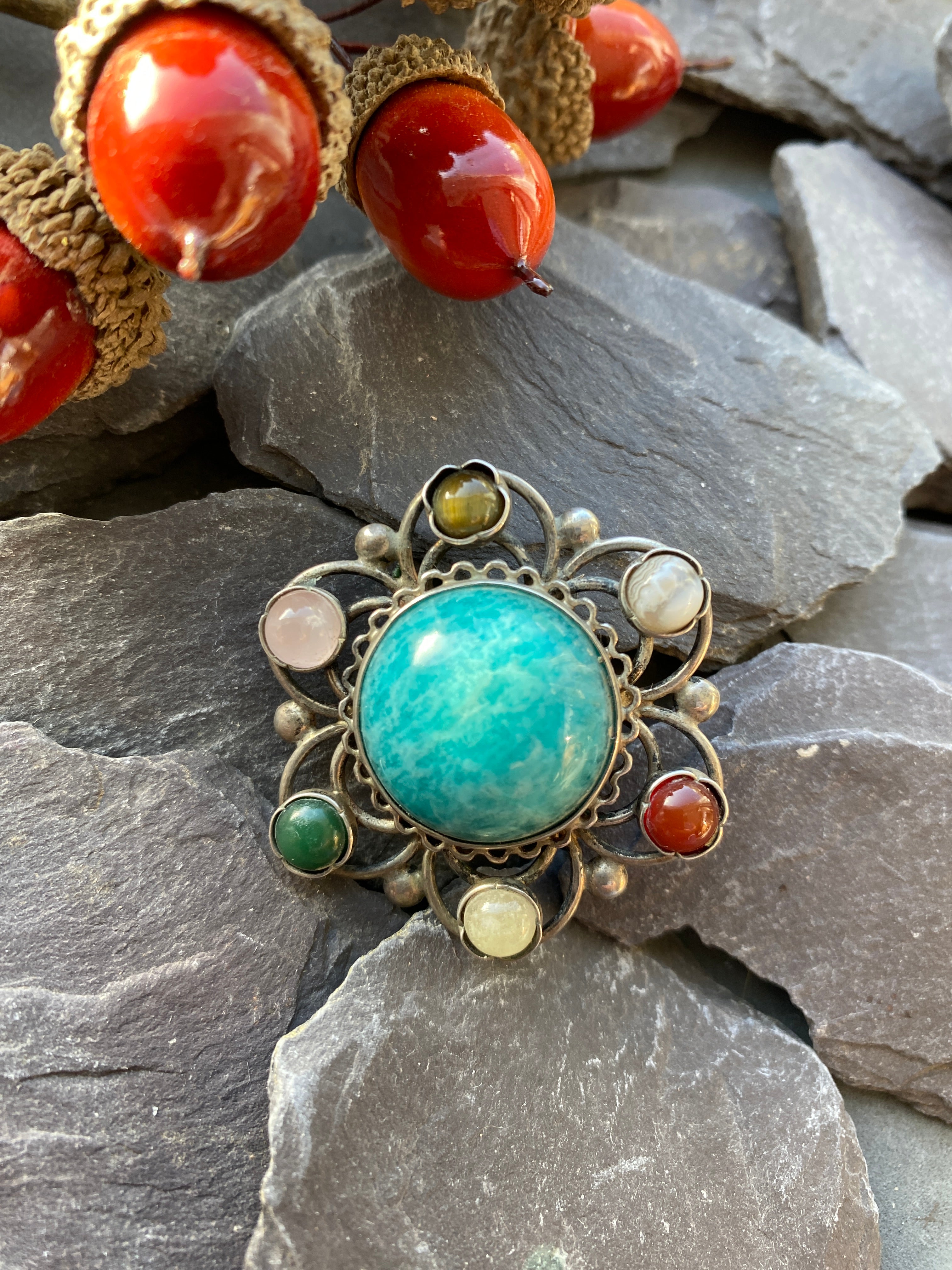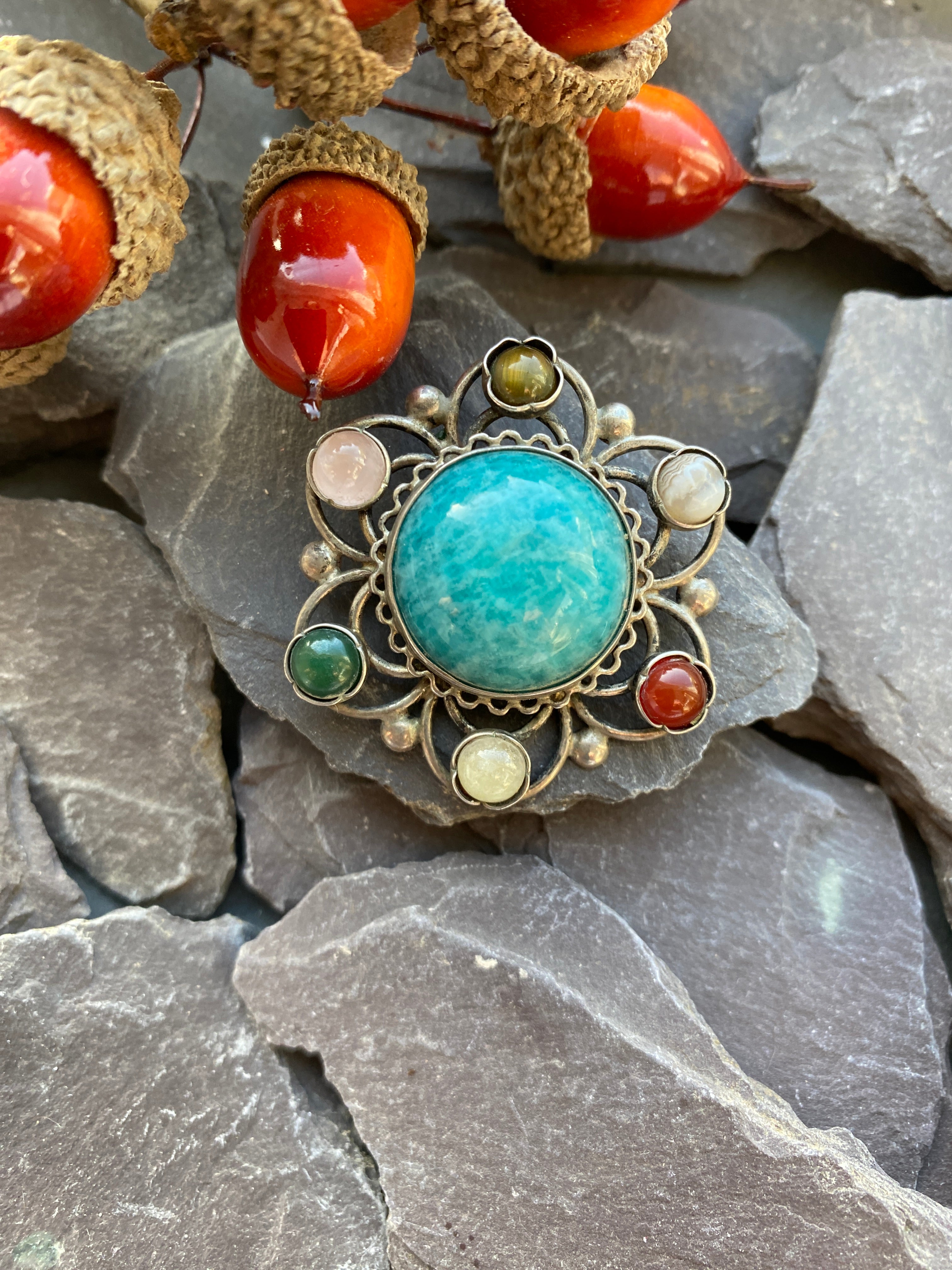 A pretty silver brooch set with an Amazonite central stone surrounded by rose quartz, lace agate, carnelian, Cats eye Chrysoberyl and Turquoise.