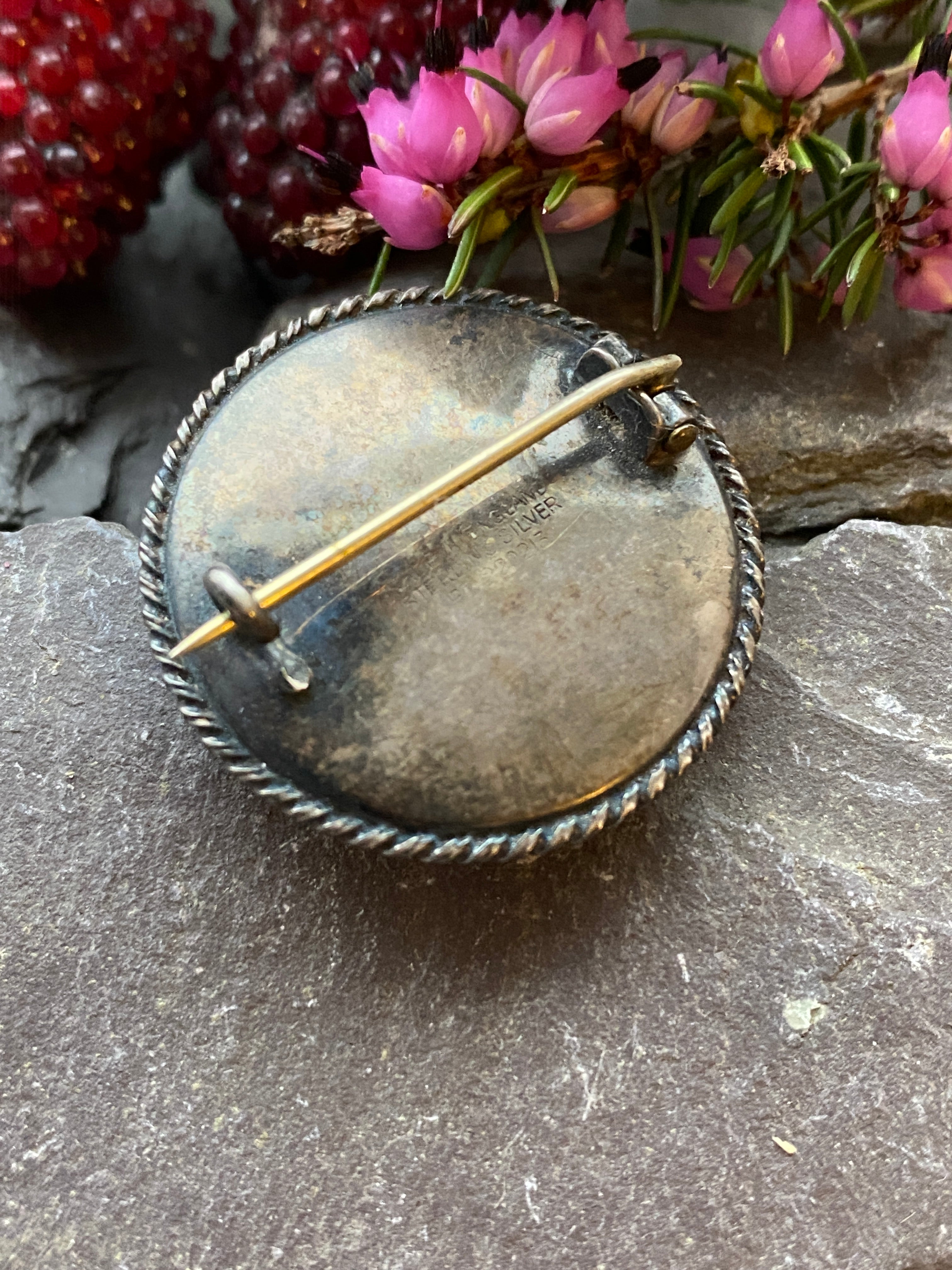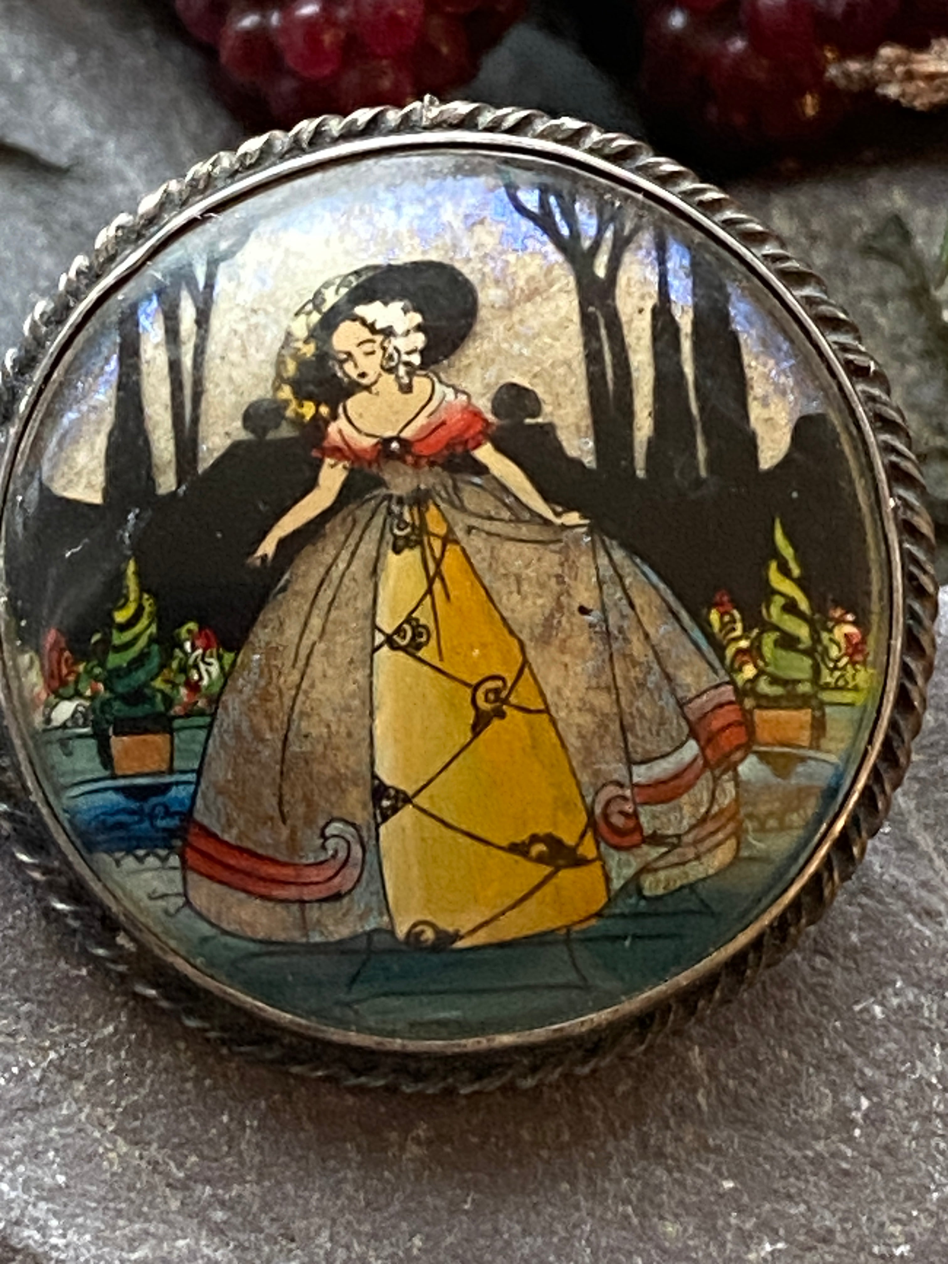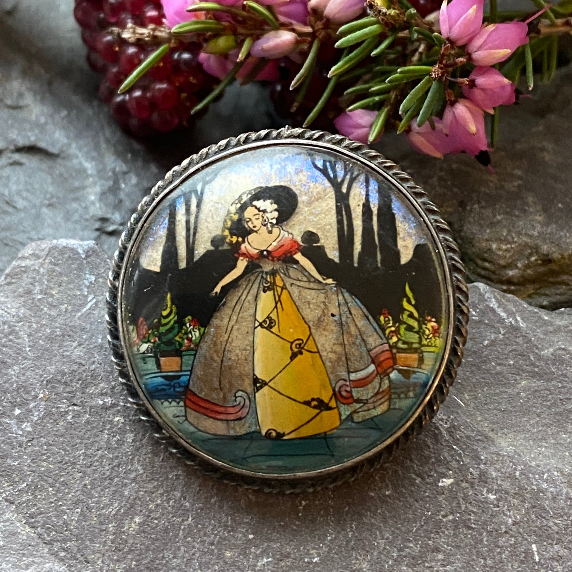 A traditional sterling silver brooch reverse painted with a crinoline lady over a natural butterfly wing