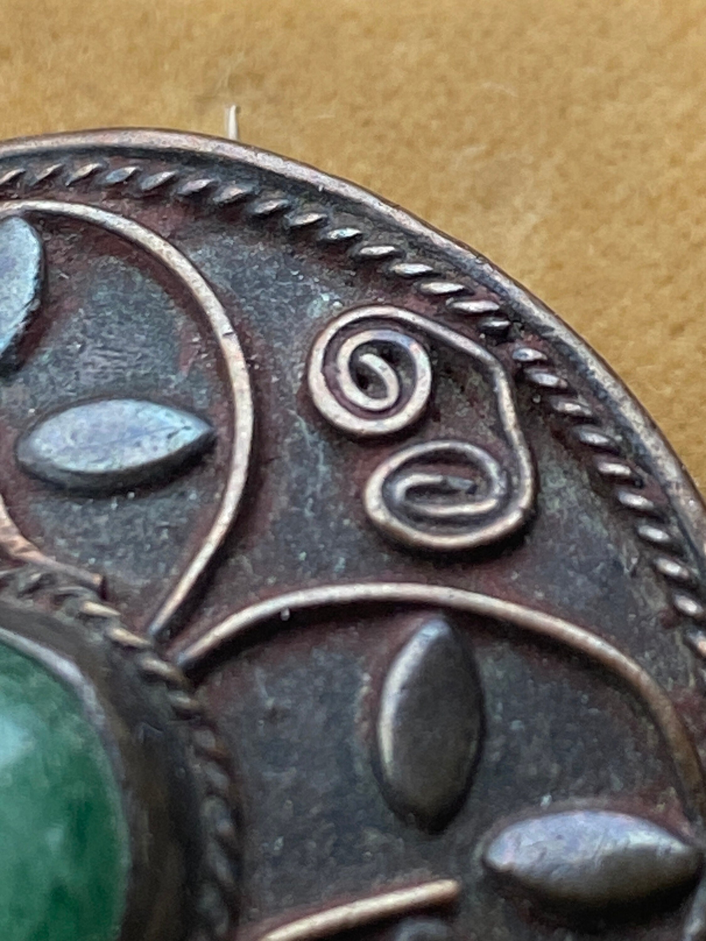 An arts and crafts period bronze brooch with Celtic influence set with Aventurine quartz