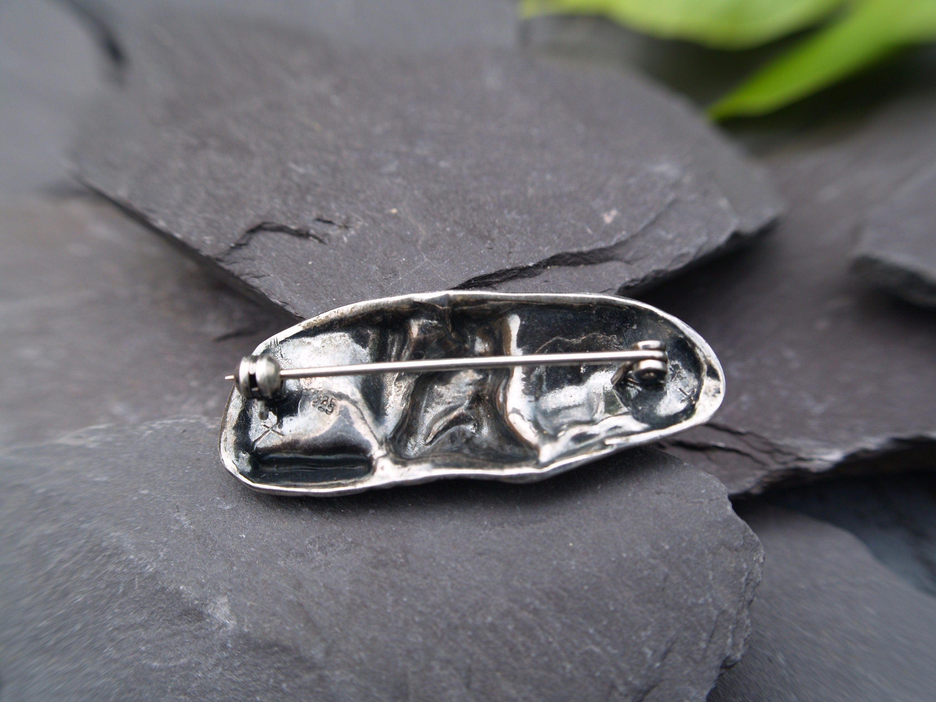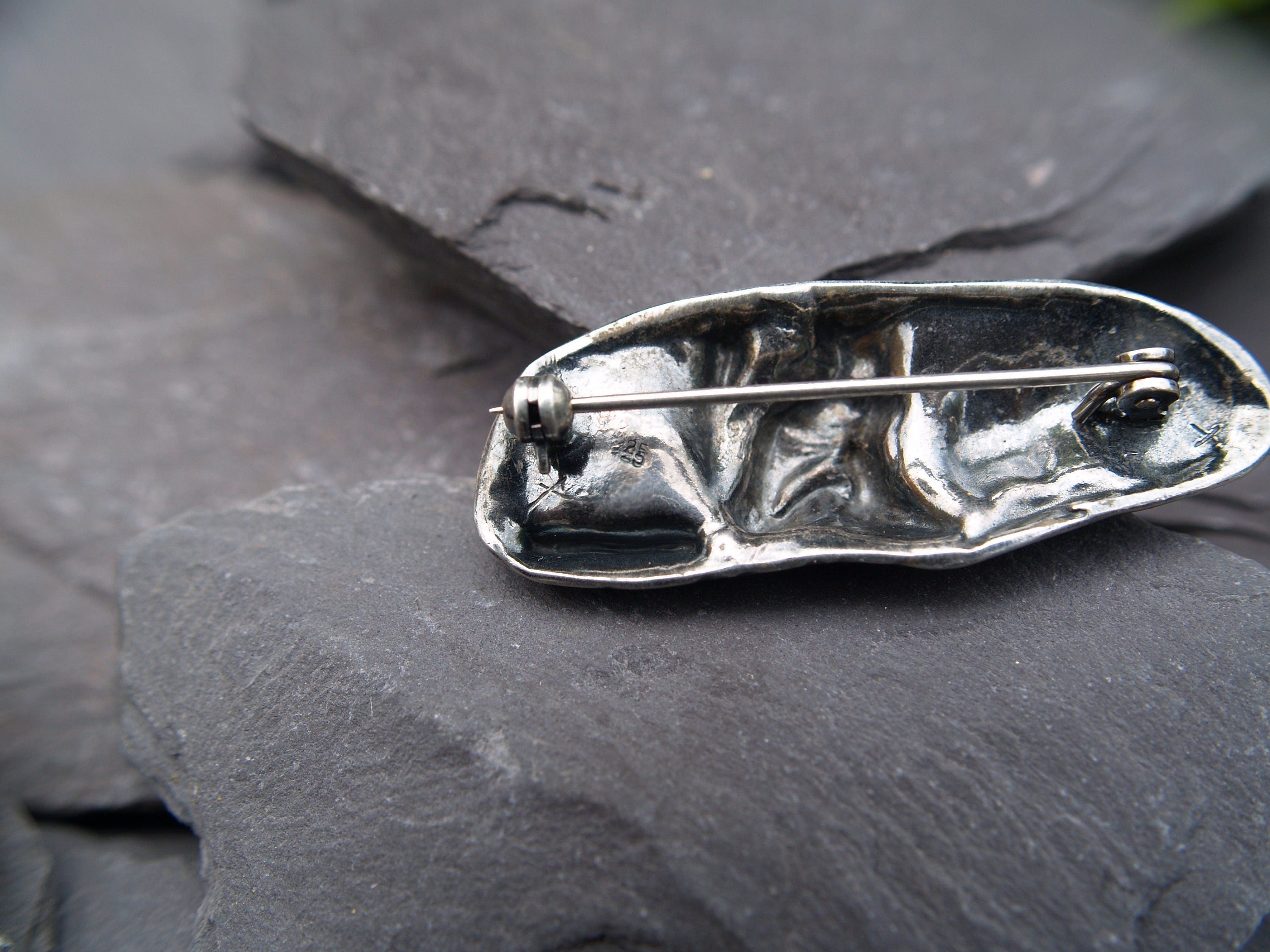 Brooch stamped 925 to the back signifying sterling silver. There is also a cross stamped which may be the designers mark?.