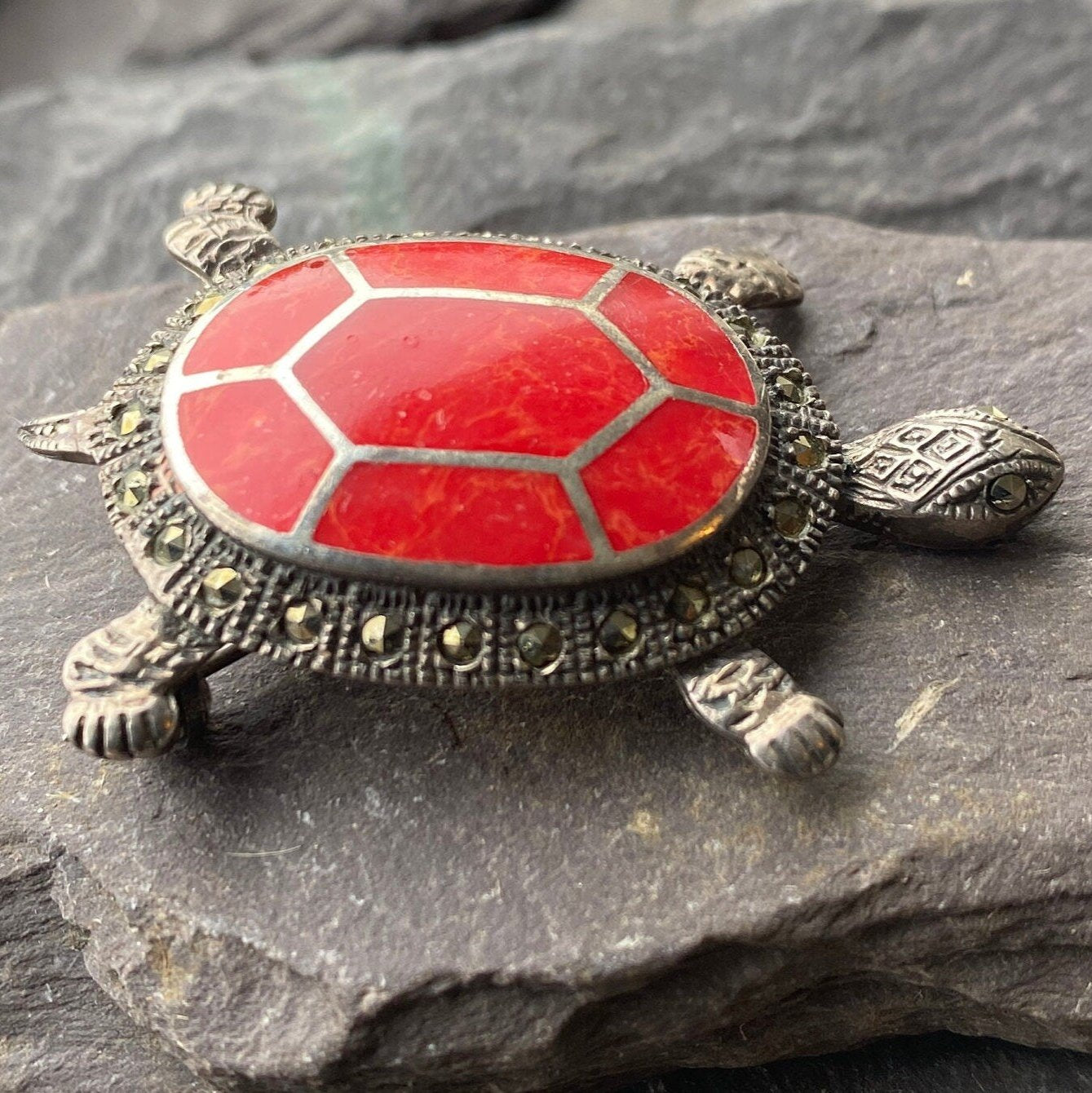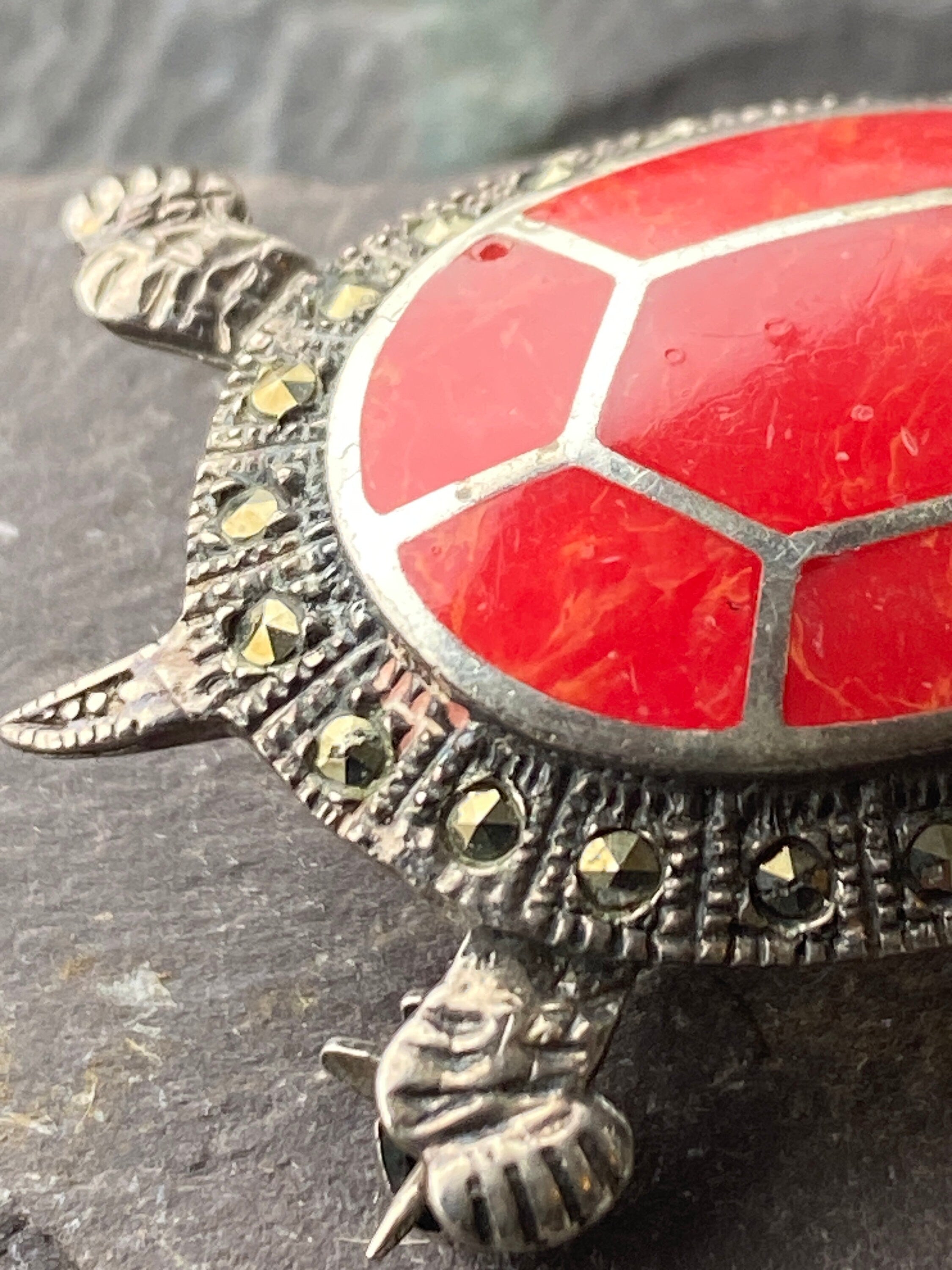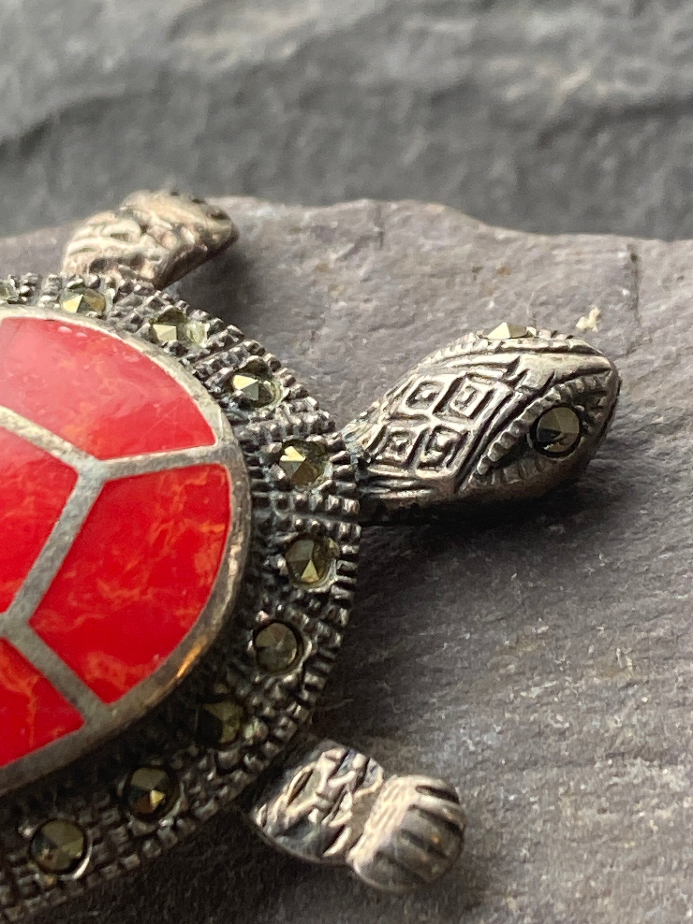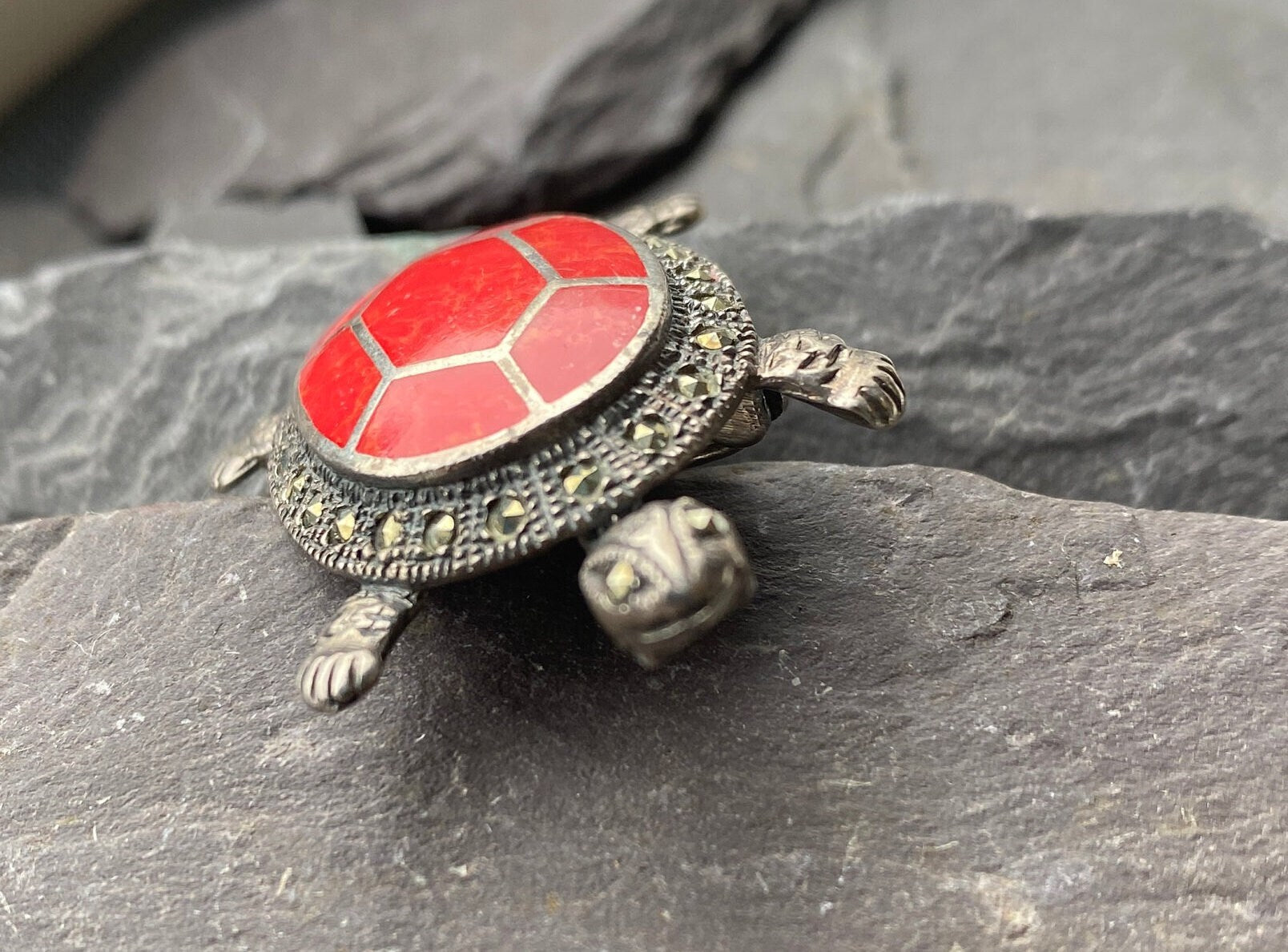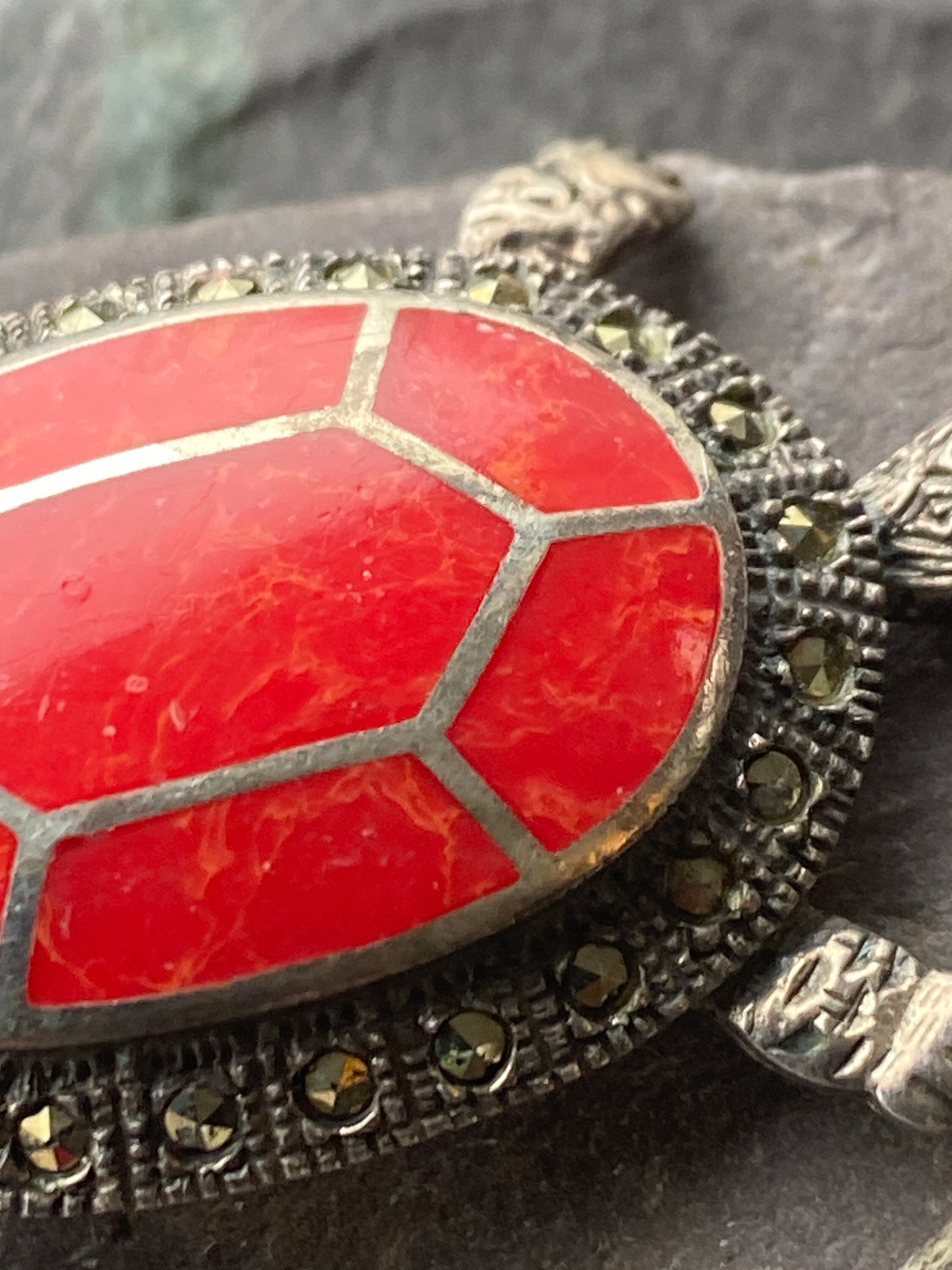 A cute sterling silver Turtle filled with red polymer to imitate coral