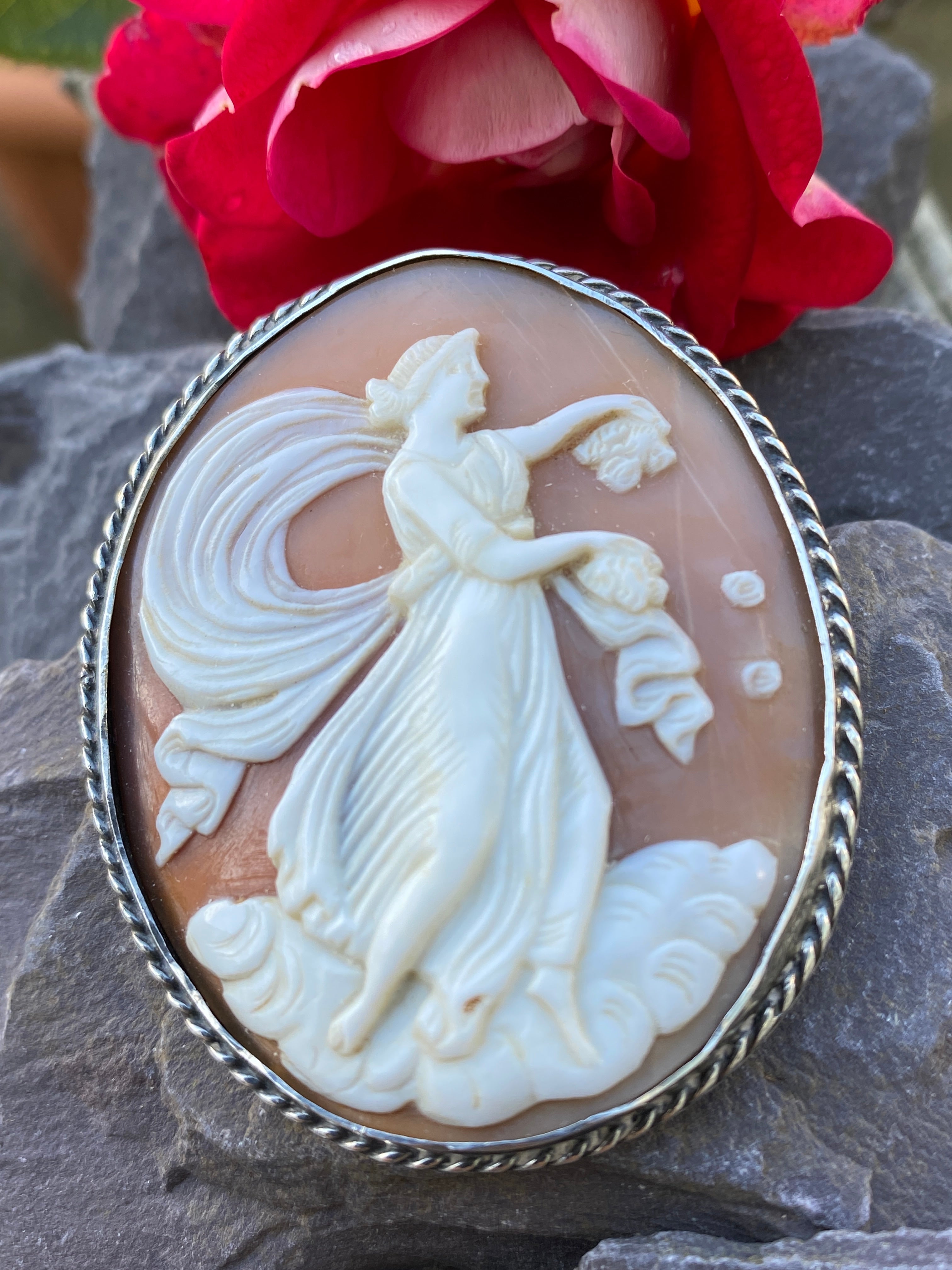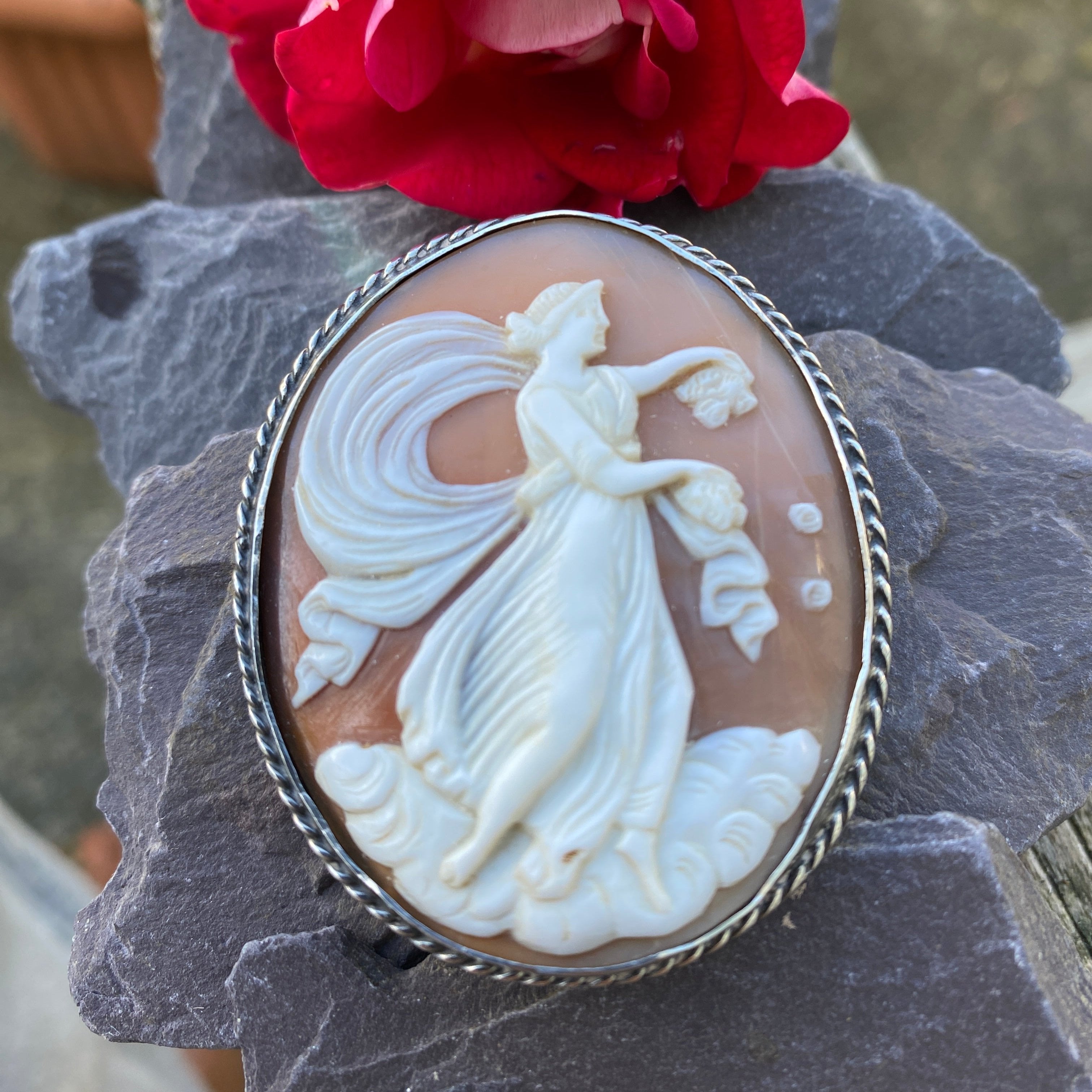 A beautiful sterling silver set Conch shell cameo brooch signed B.I. for Bernard Instone