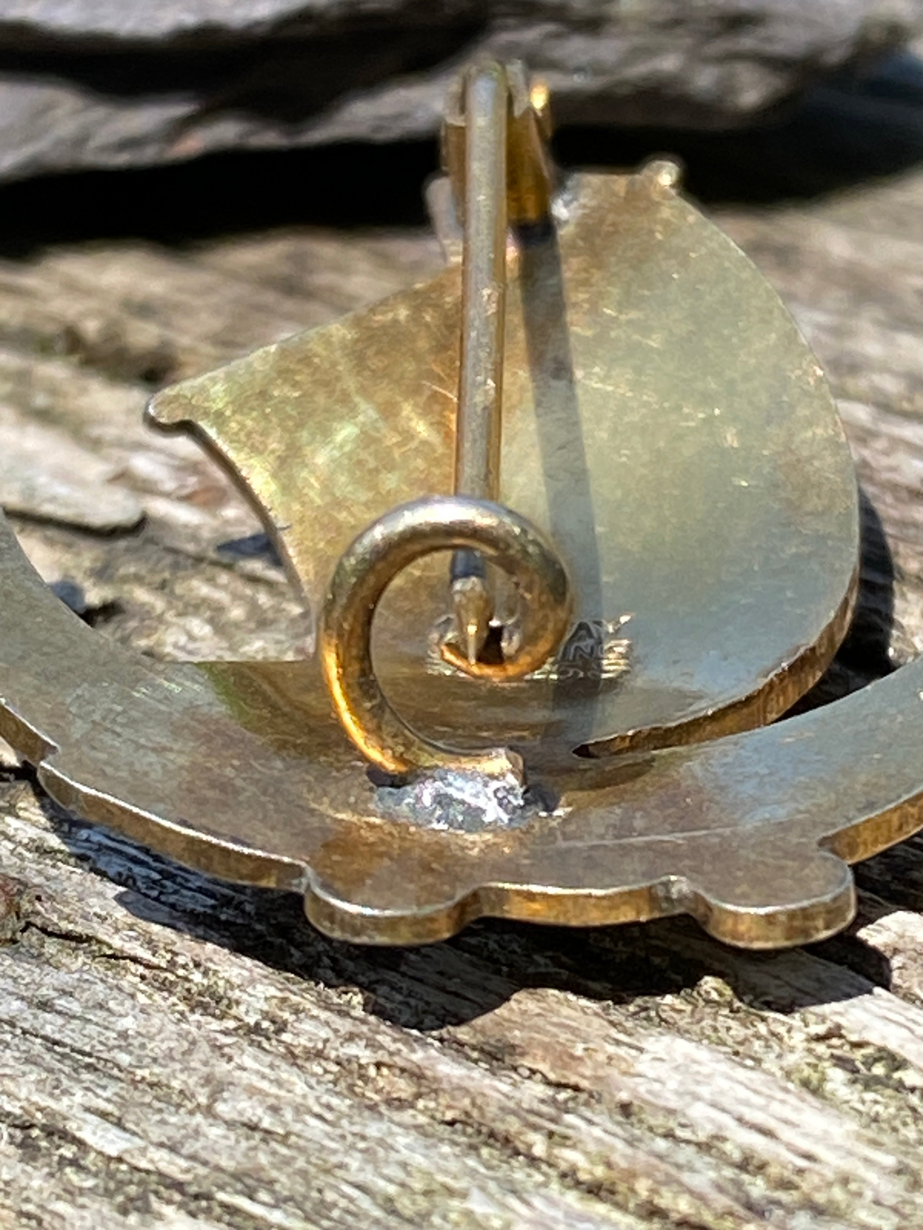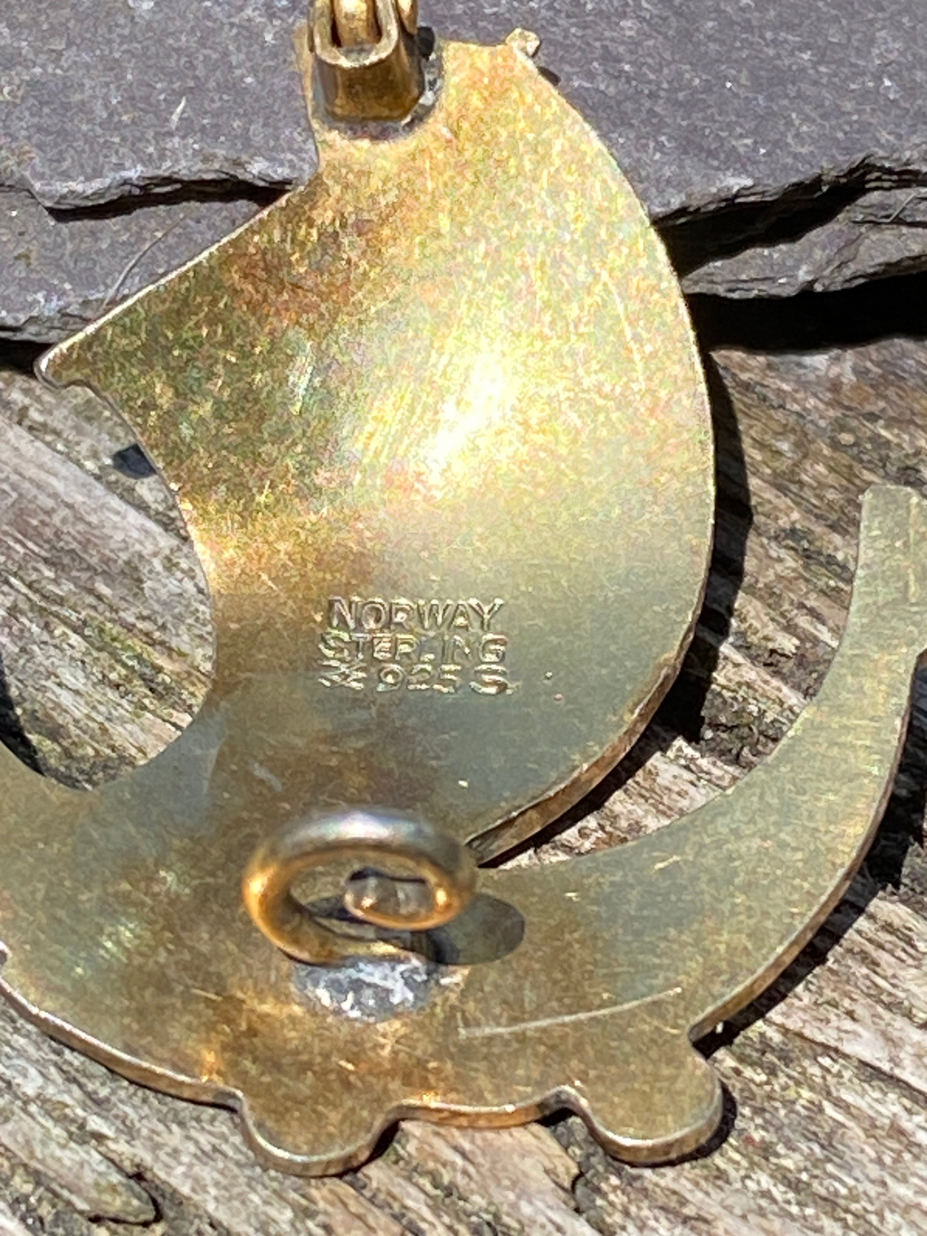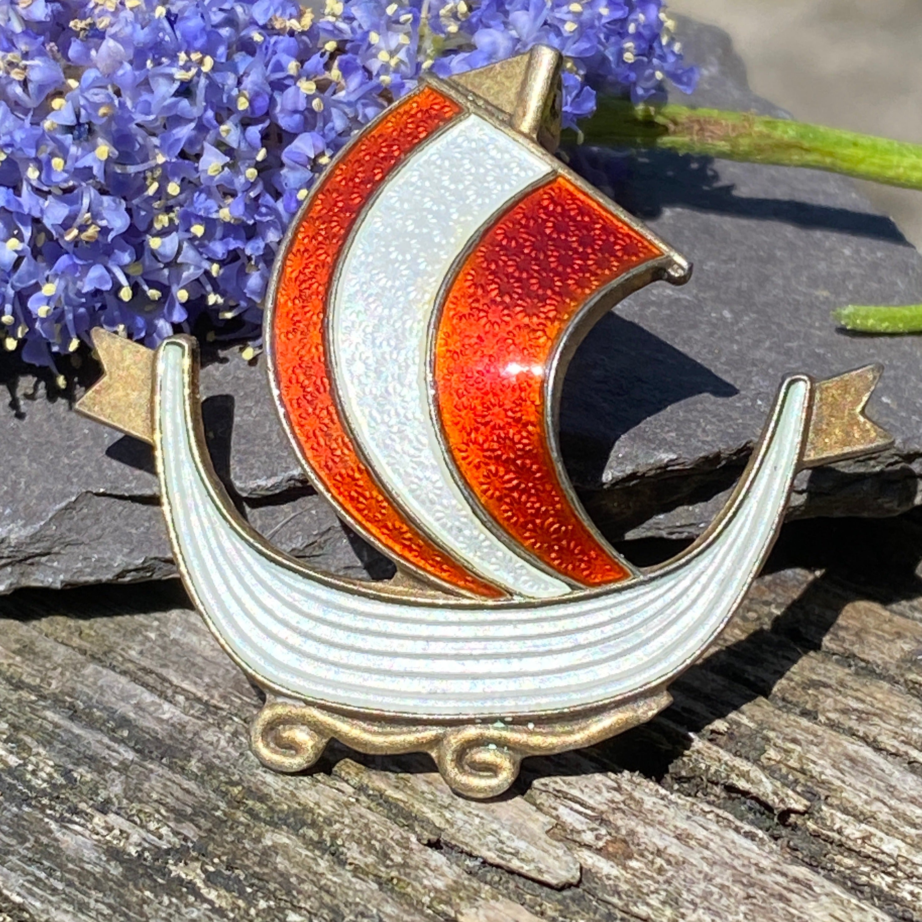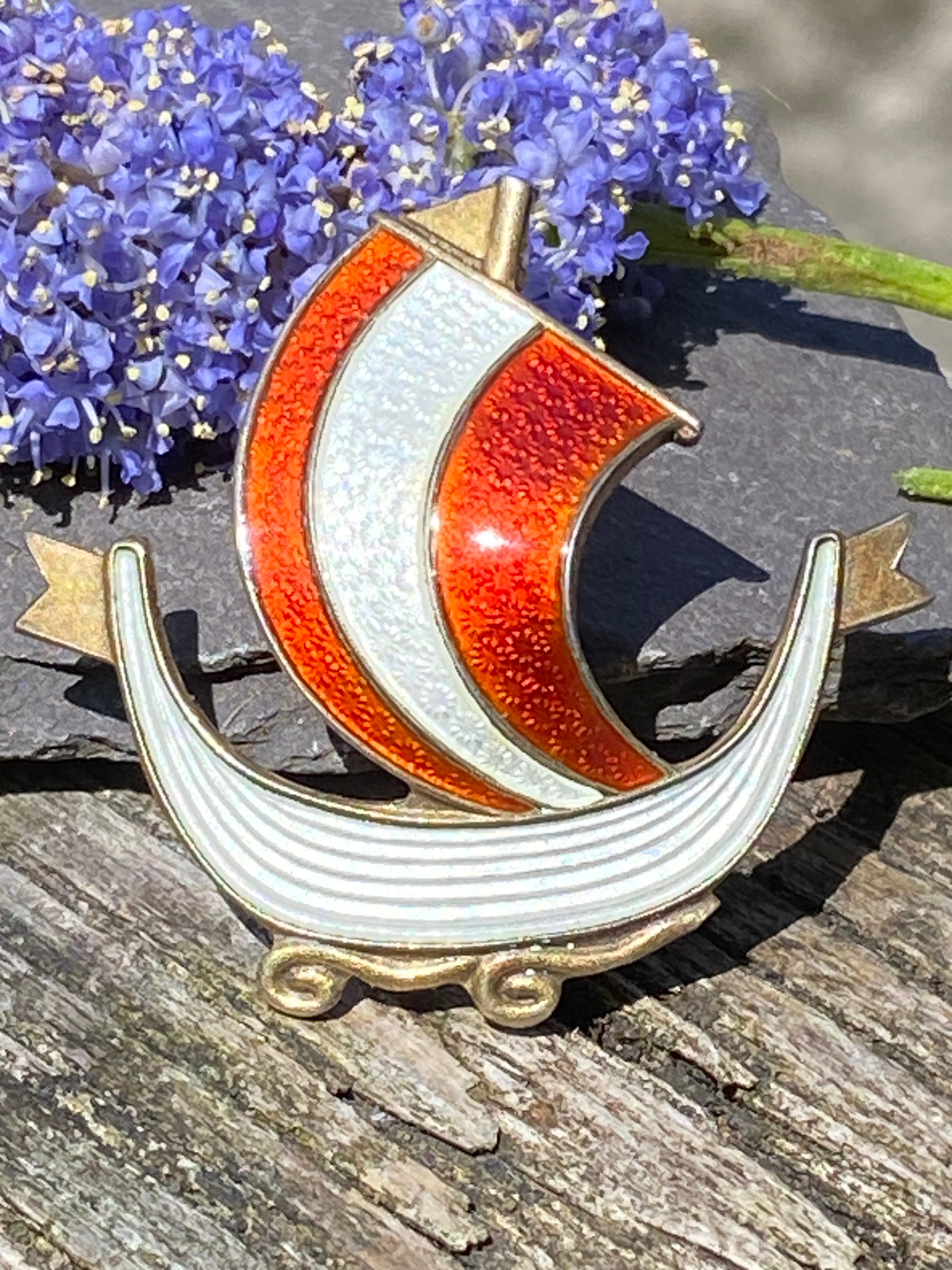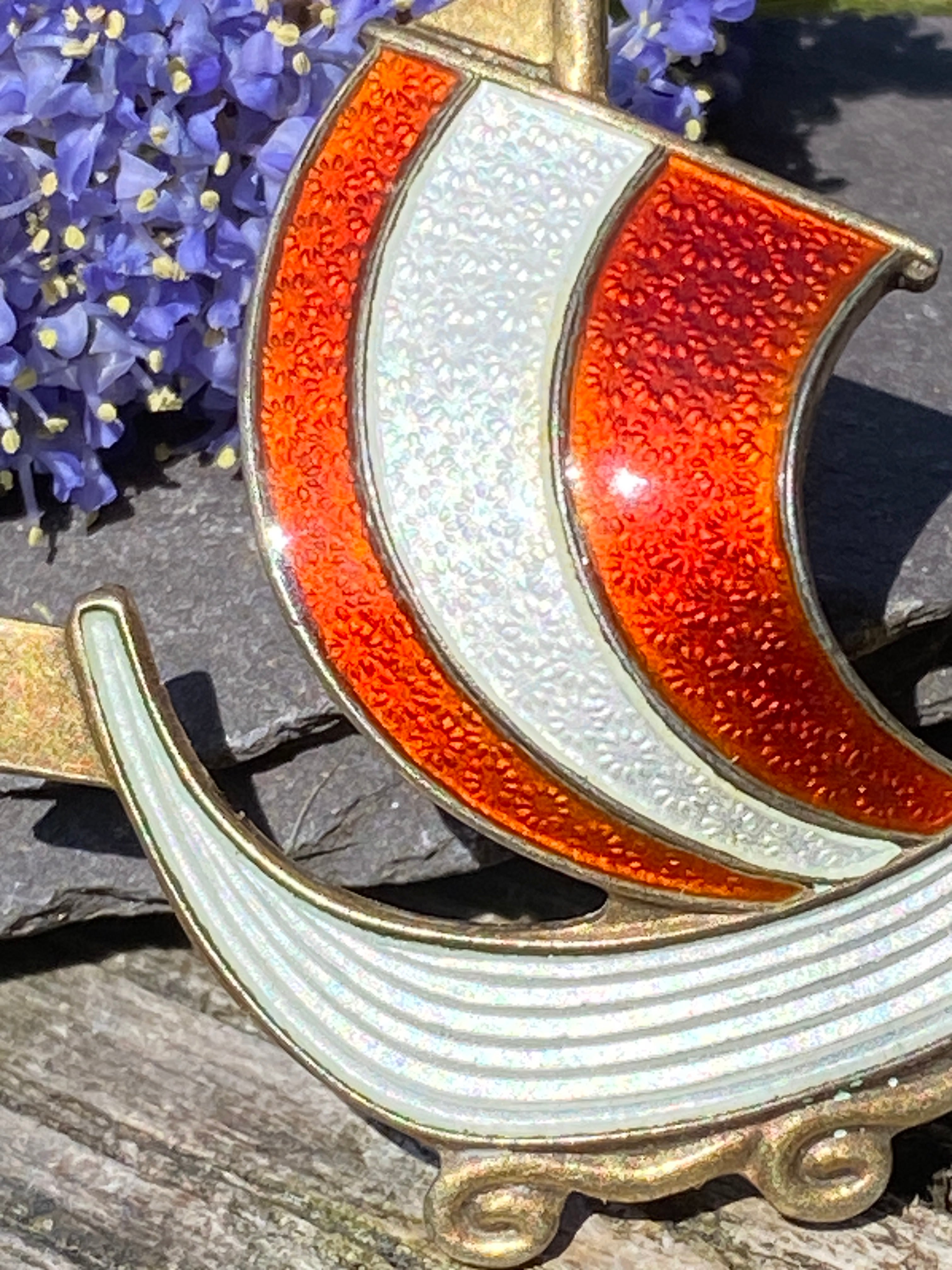 A cheery little brooch by the famous silversmith Aksel Holmsen of Norway. In Gilded sterling silver with red and white guilloche enamel. In immaculate condition. Stamped Norway Sterling 925 S and the makers mark.