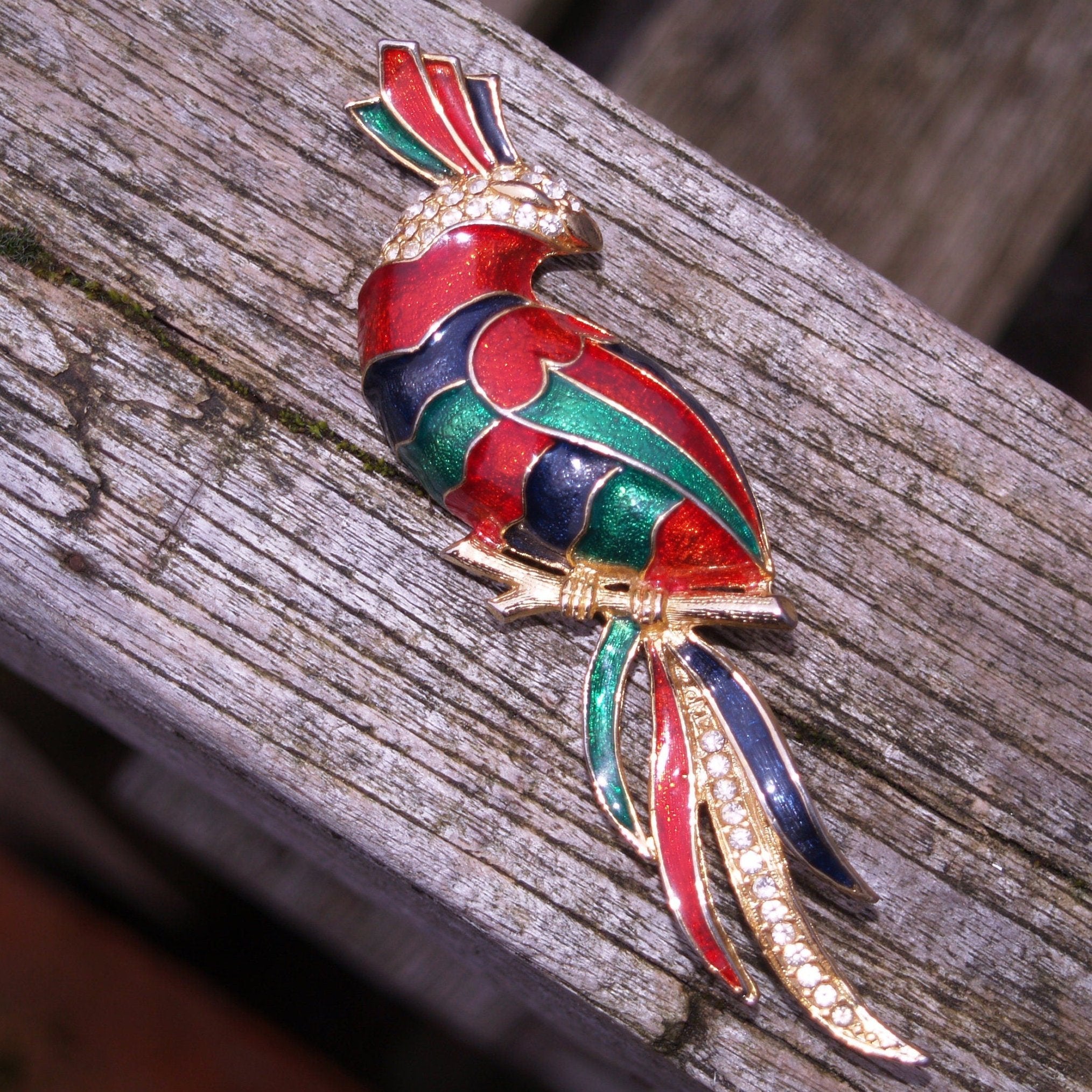 A fabulous Vintage costume brooch of an exotic bird in gold tone and enamel with Rhinestone detail.