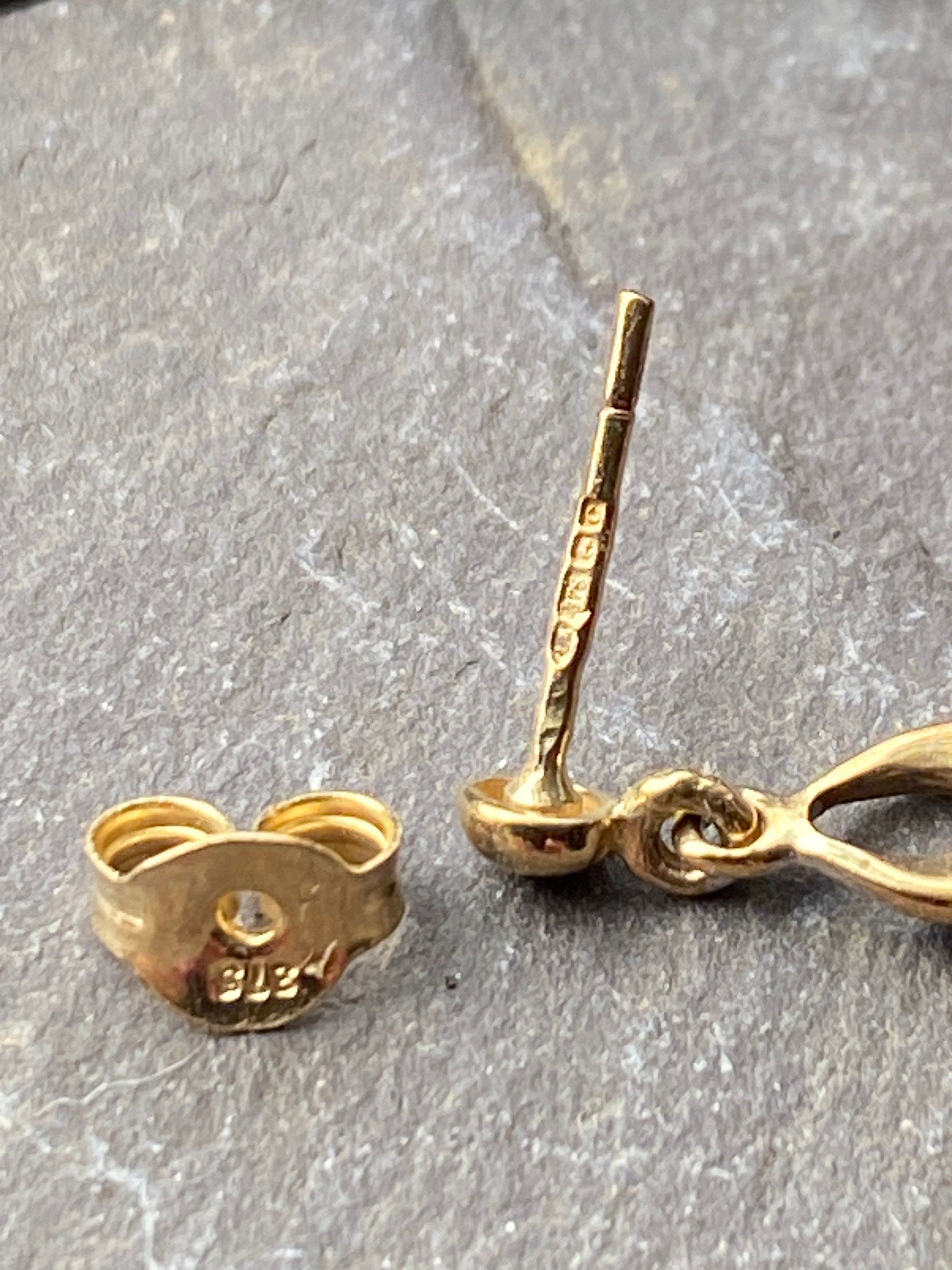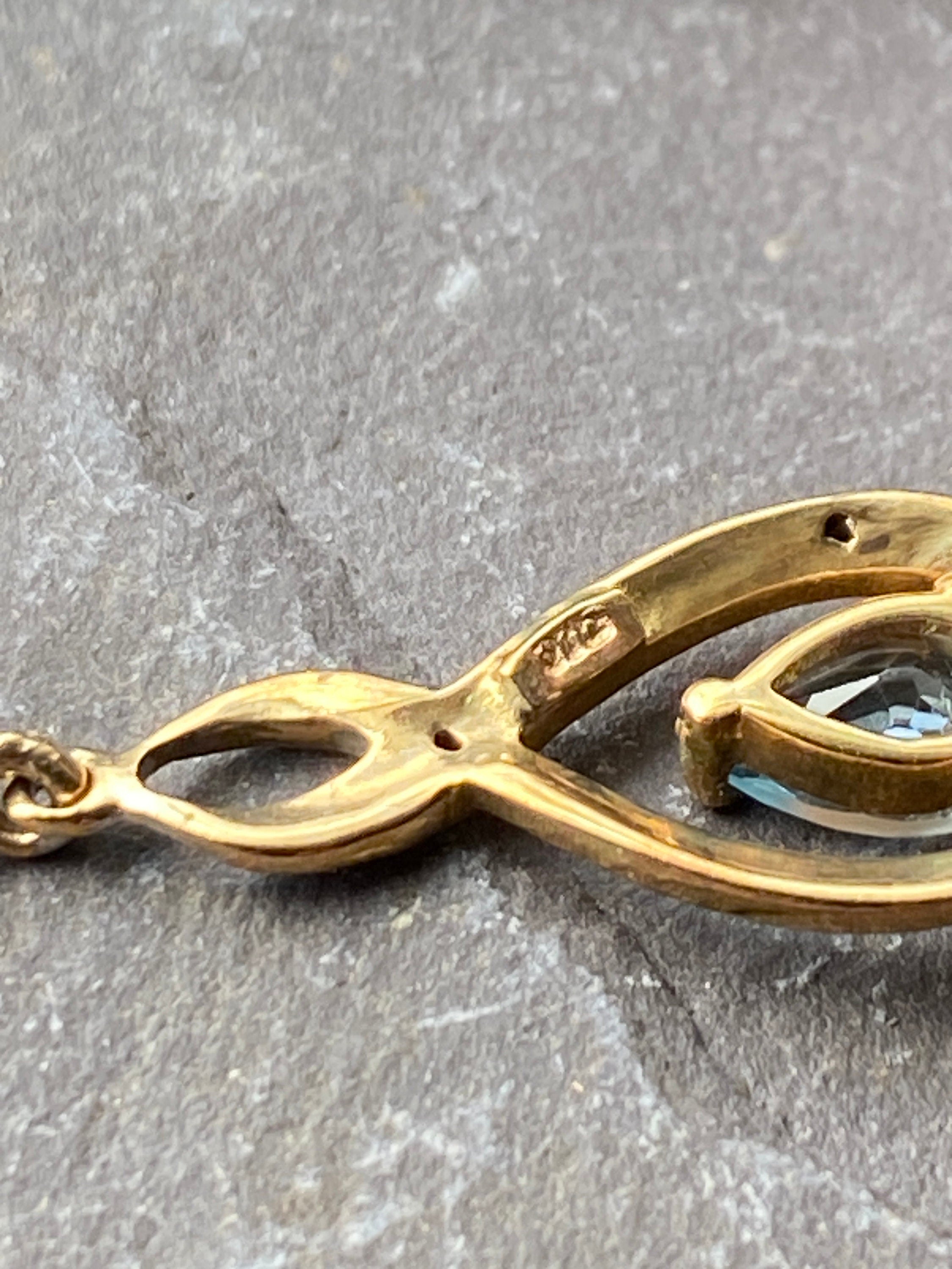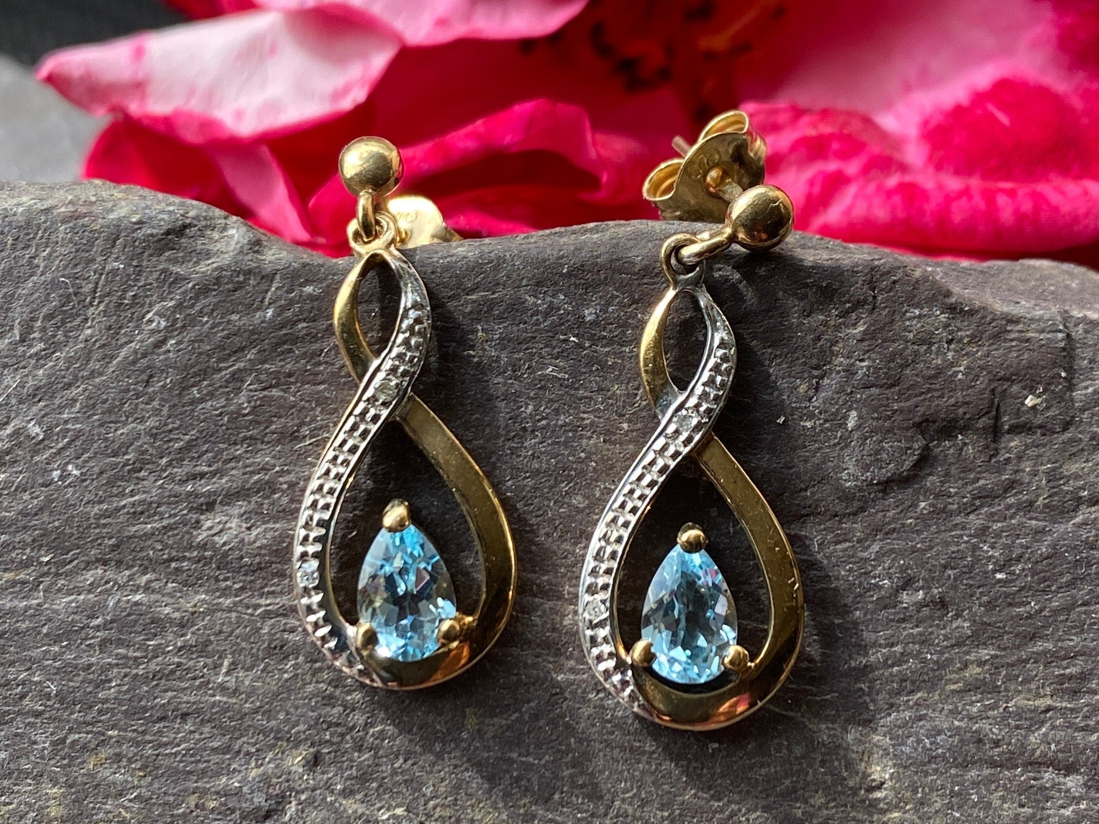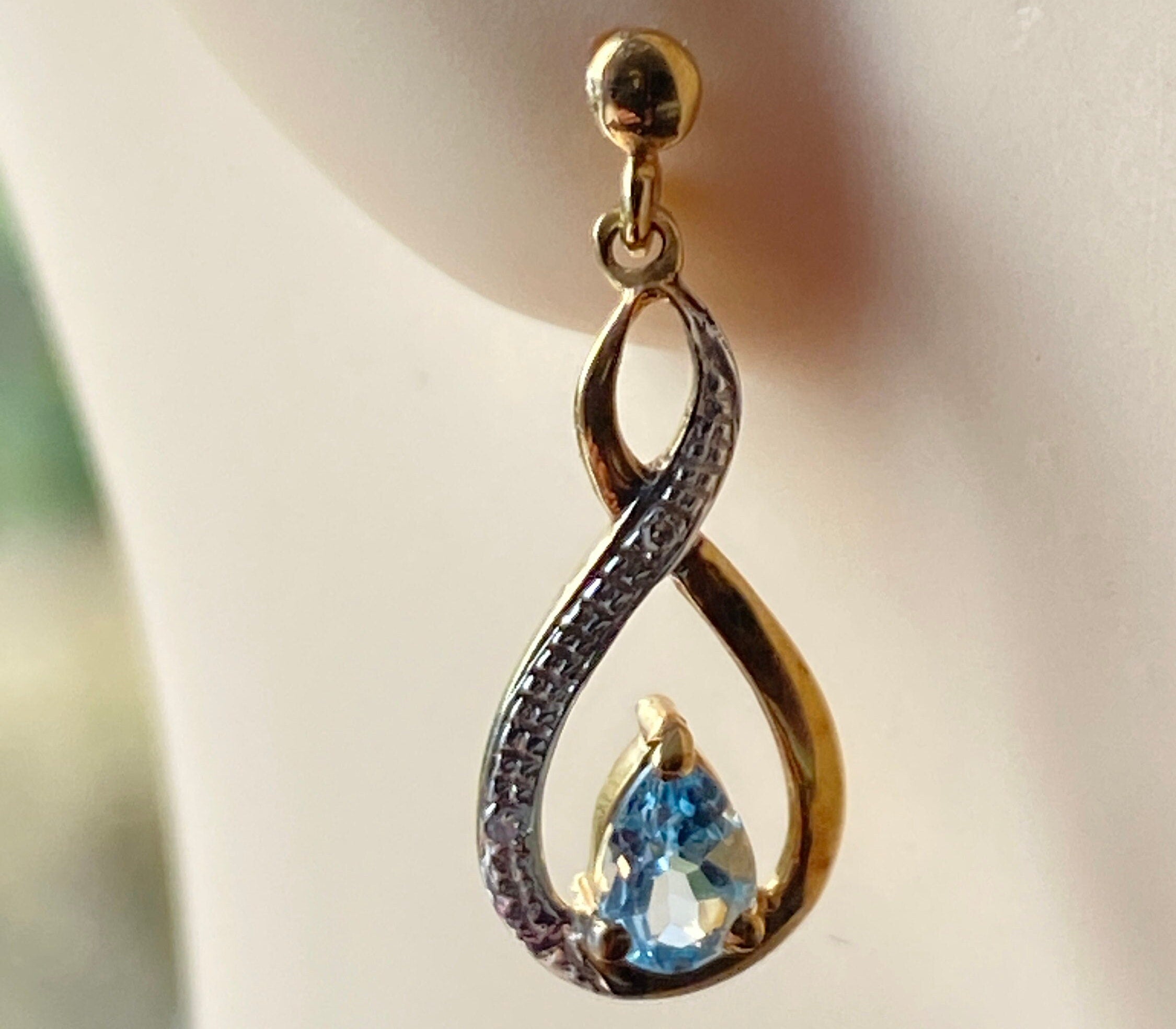 A very pretty pair of 9ct gold dangle drop earrings set with Blue topaz and two Diamond accents to each earring in a figure of eight formation