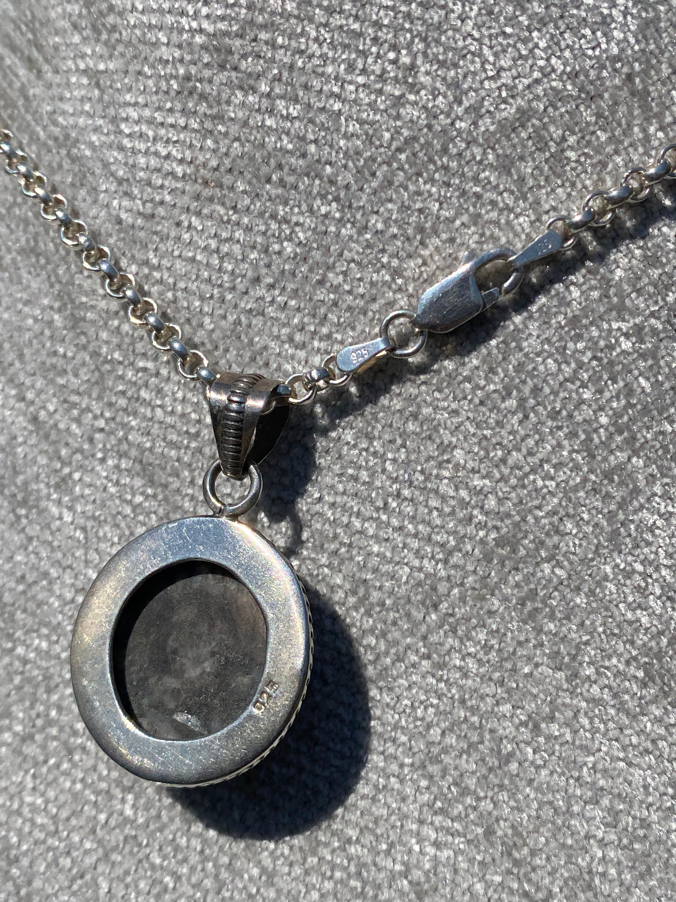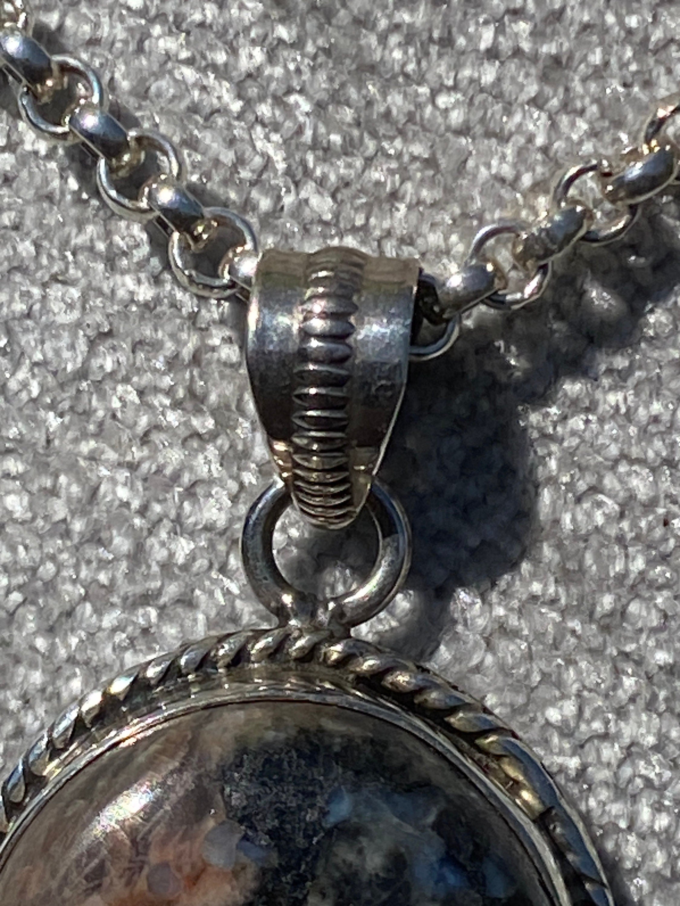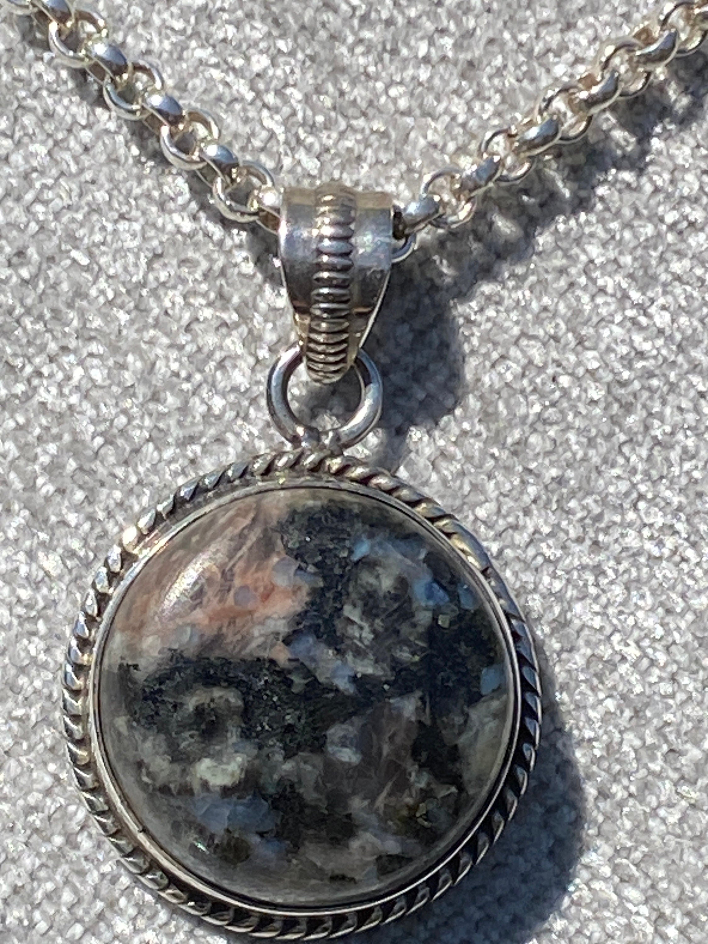 A Heavy pendant and chain set with a polished Granite stone with rope edge detail and fancy bale.