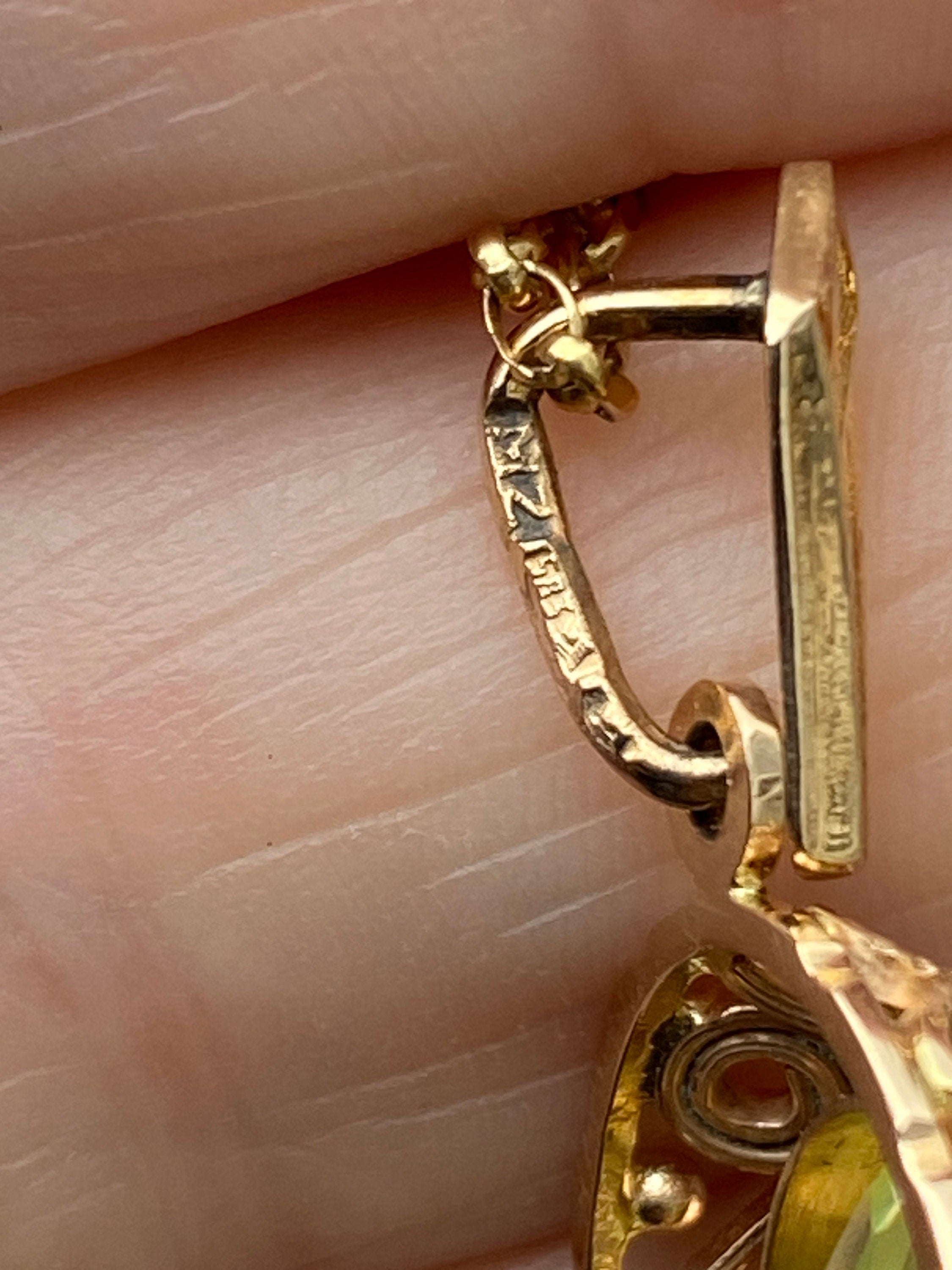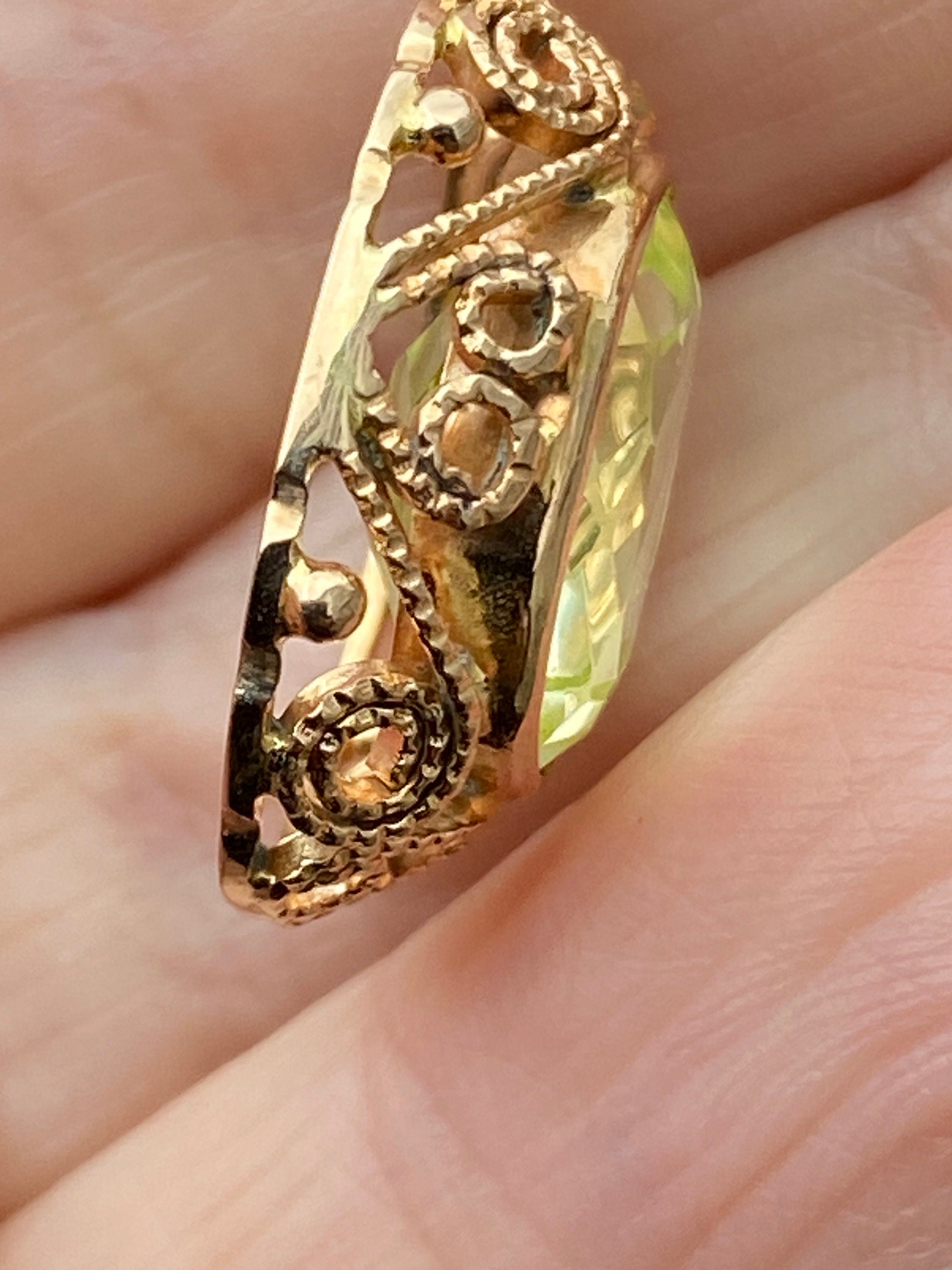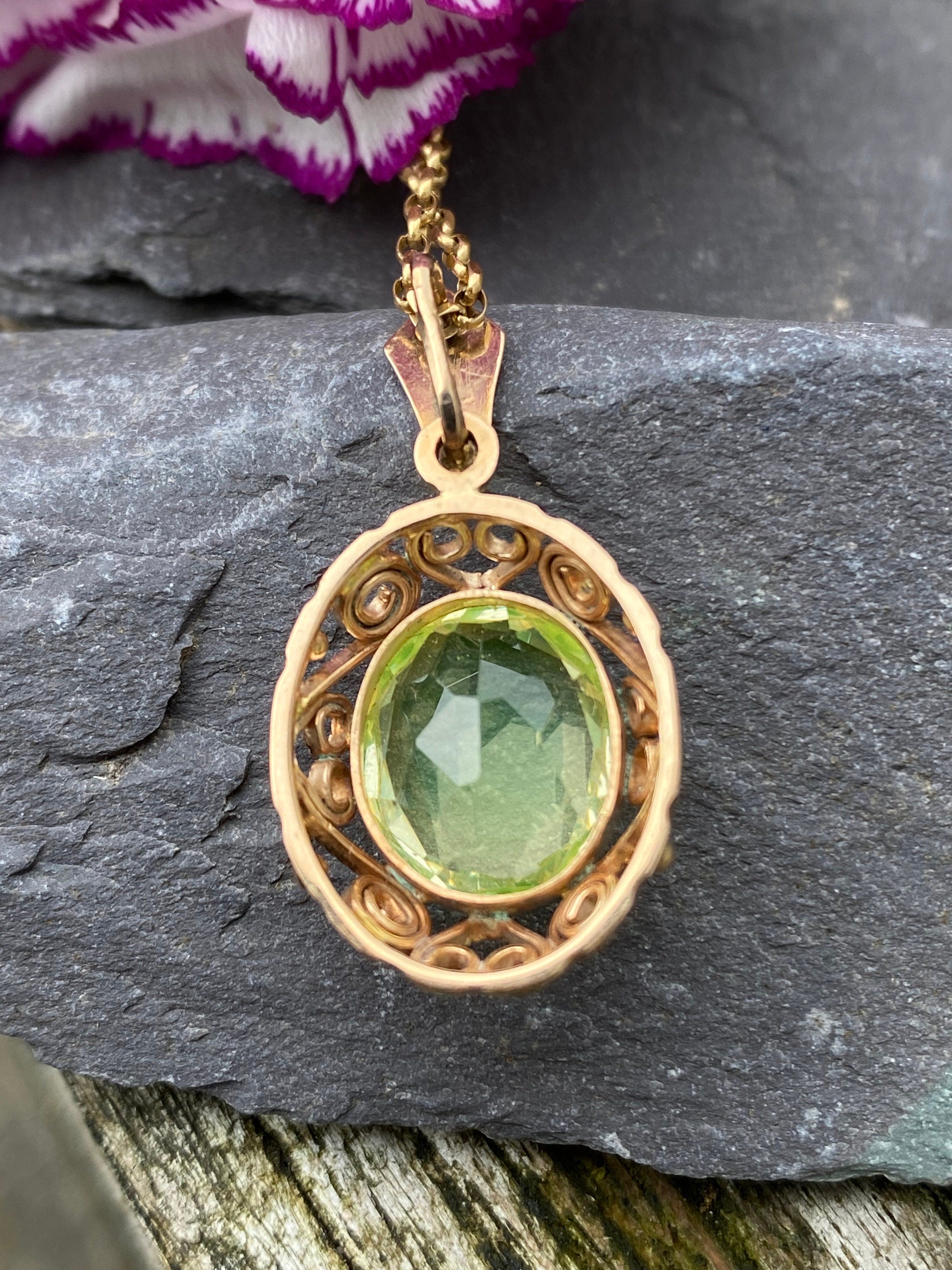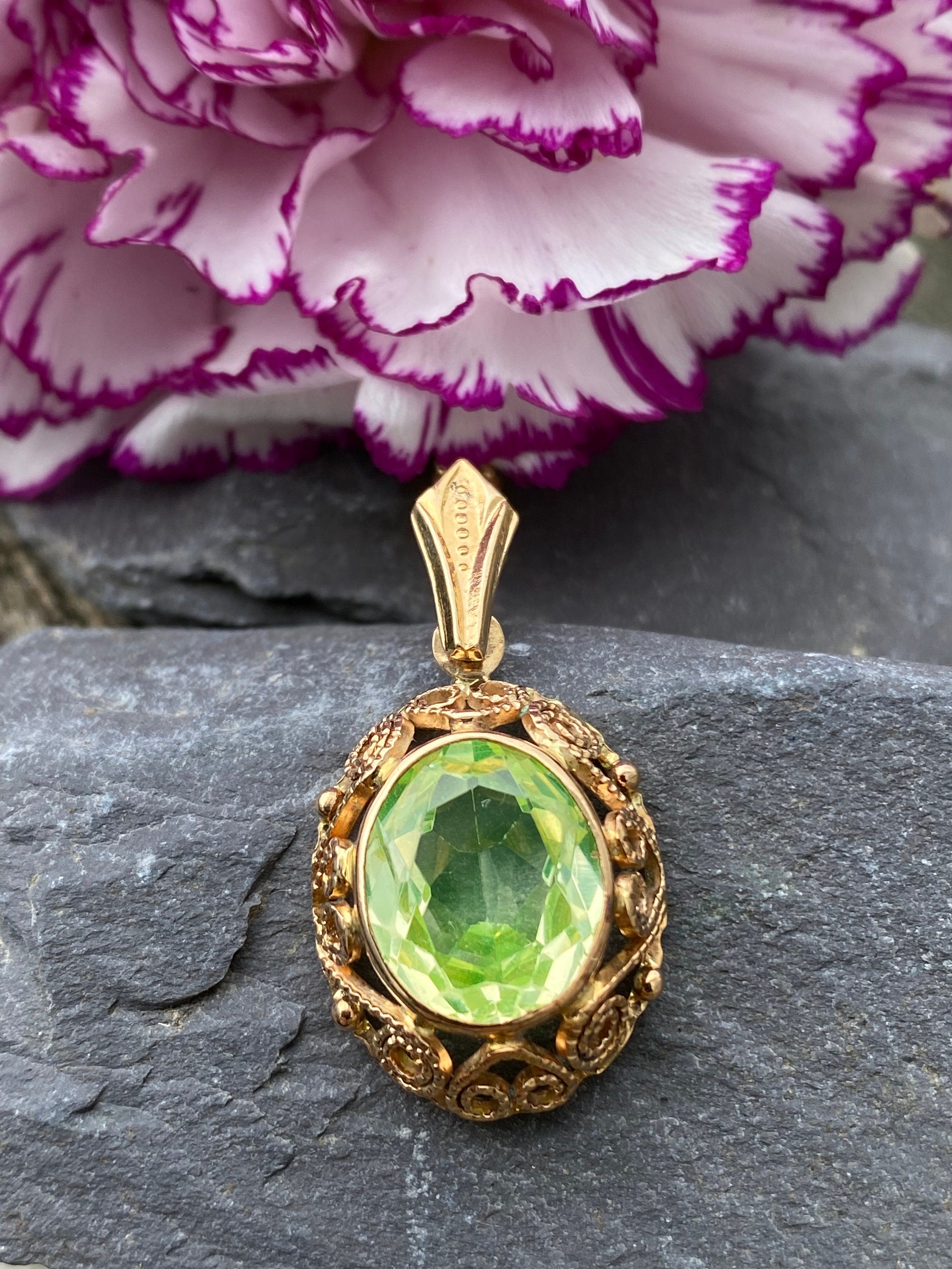 A beautiful lime green synthetic spinel set in an ornate 14ct Mount with generous bale.