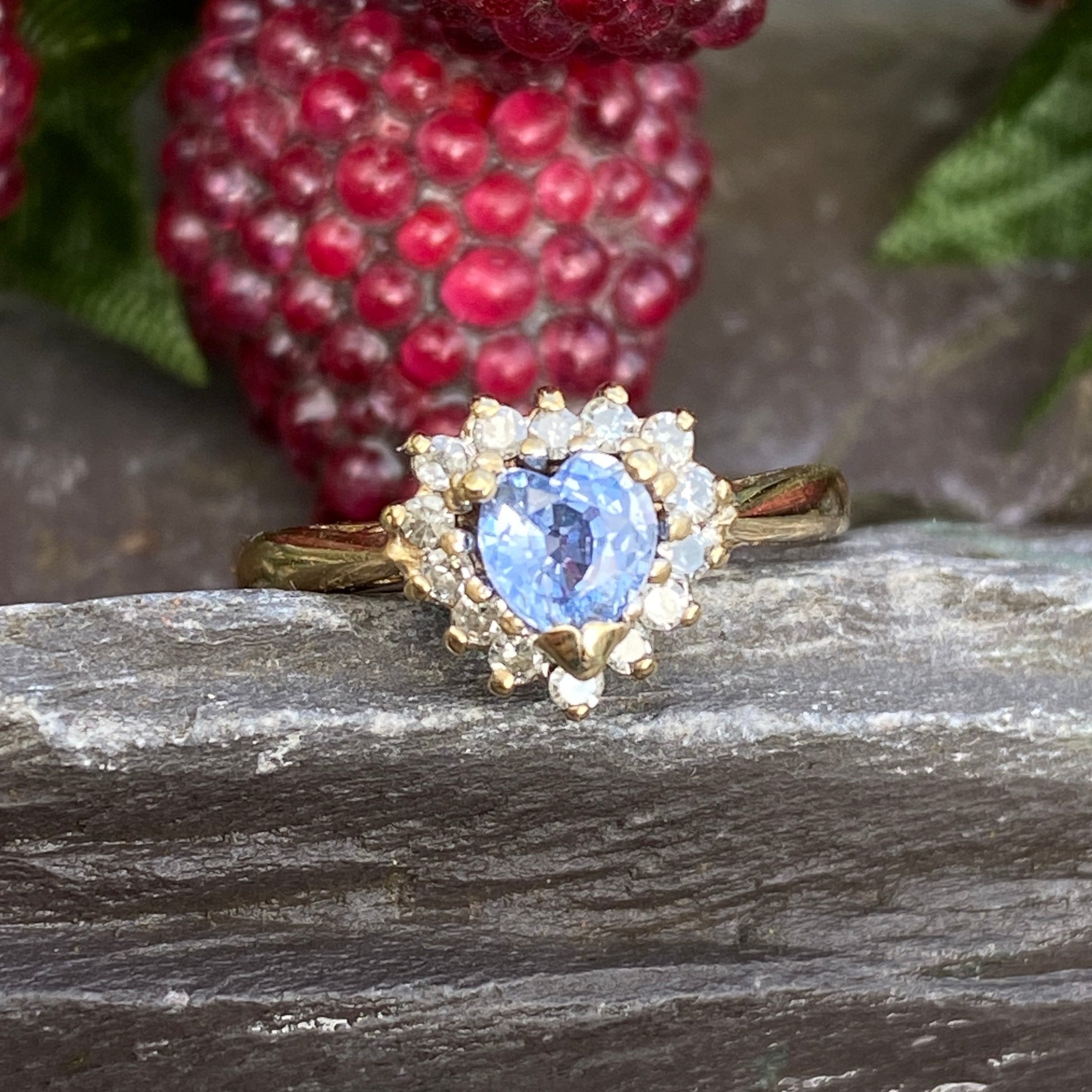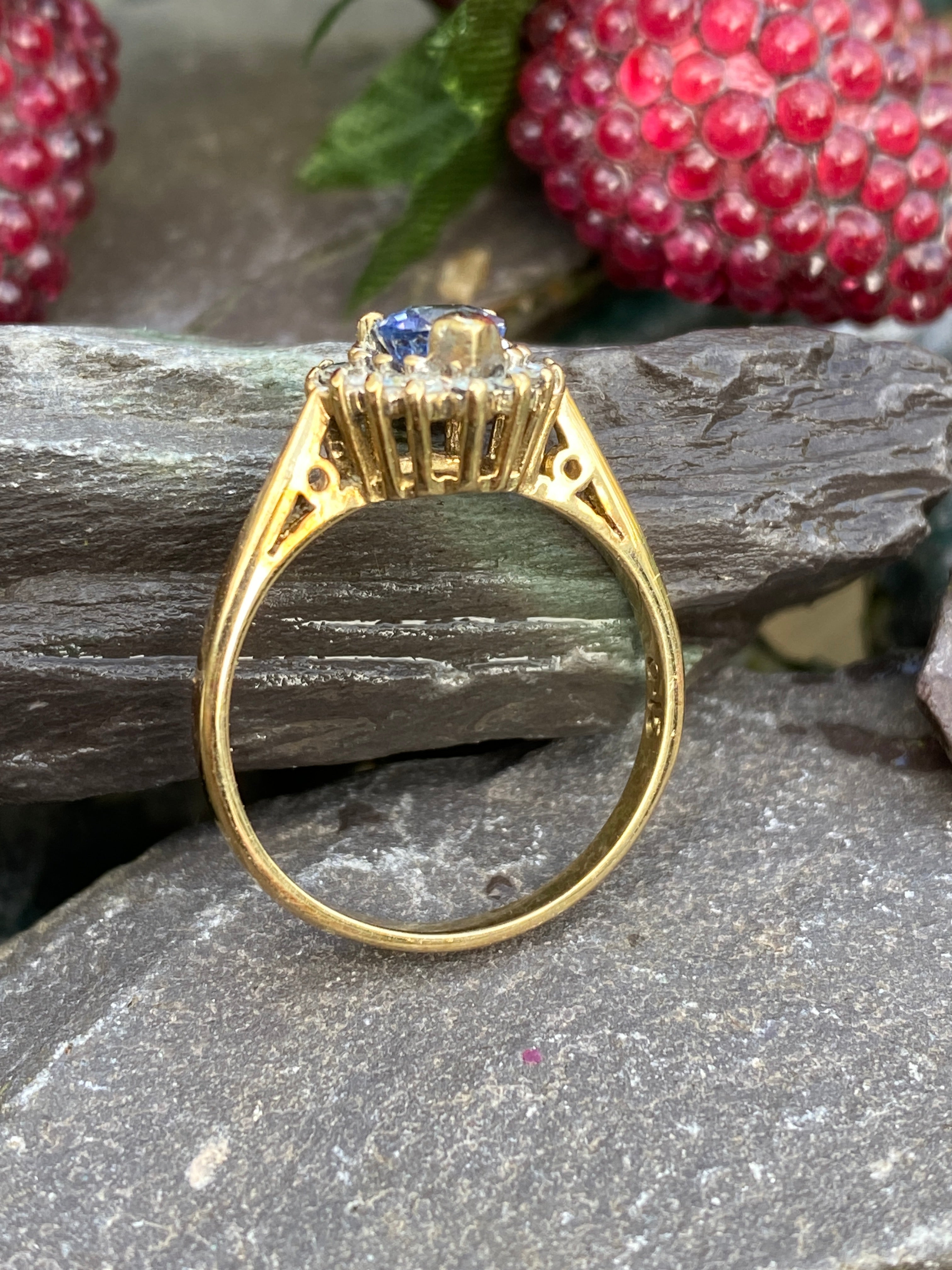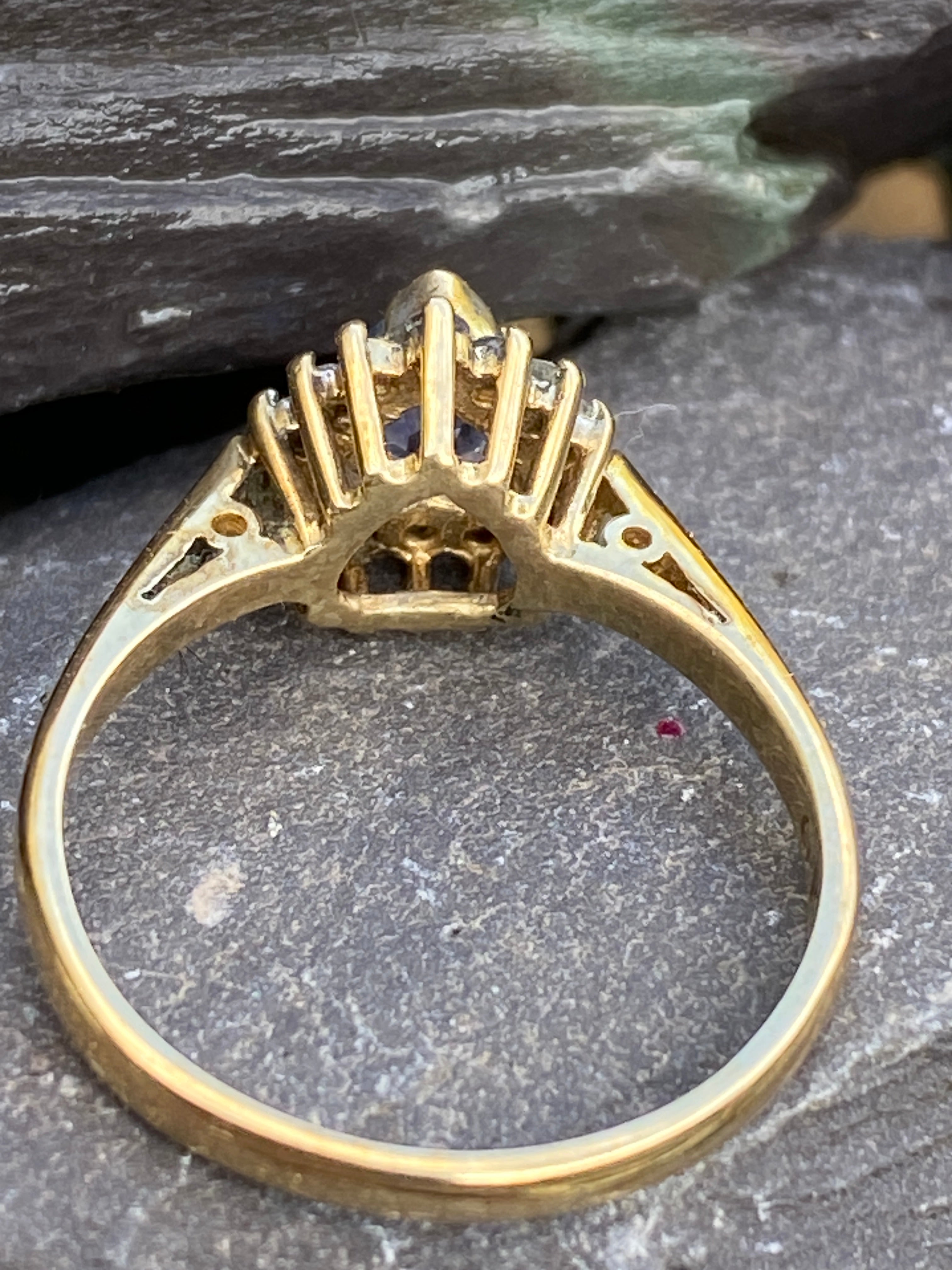 A very pretty 9ct yellow gold ring set with a heart shaped Tanzanite surrounded by Diamonds