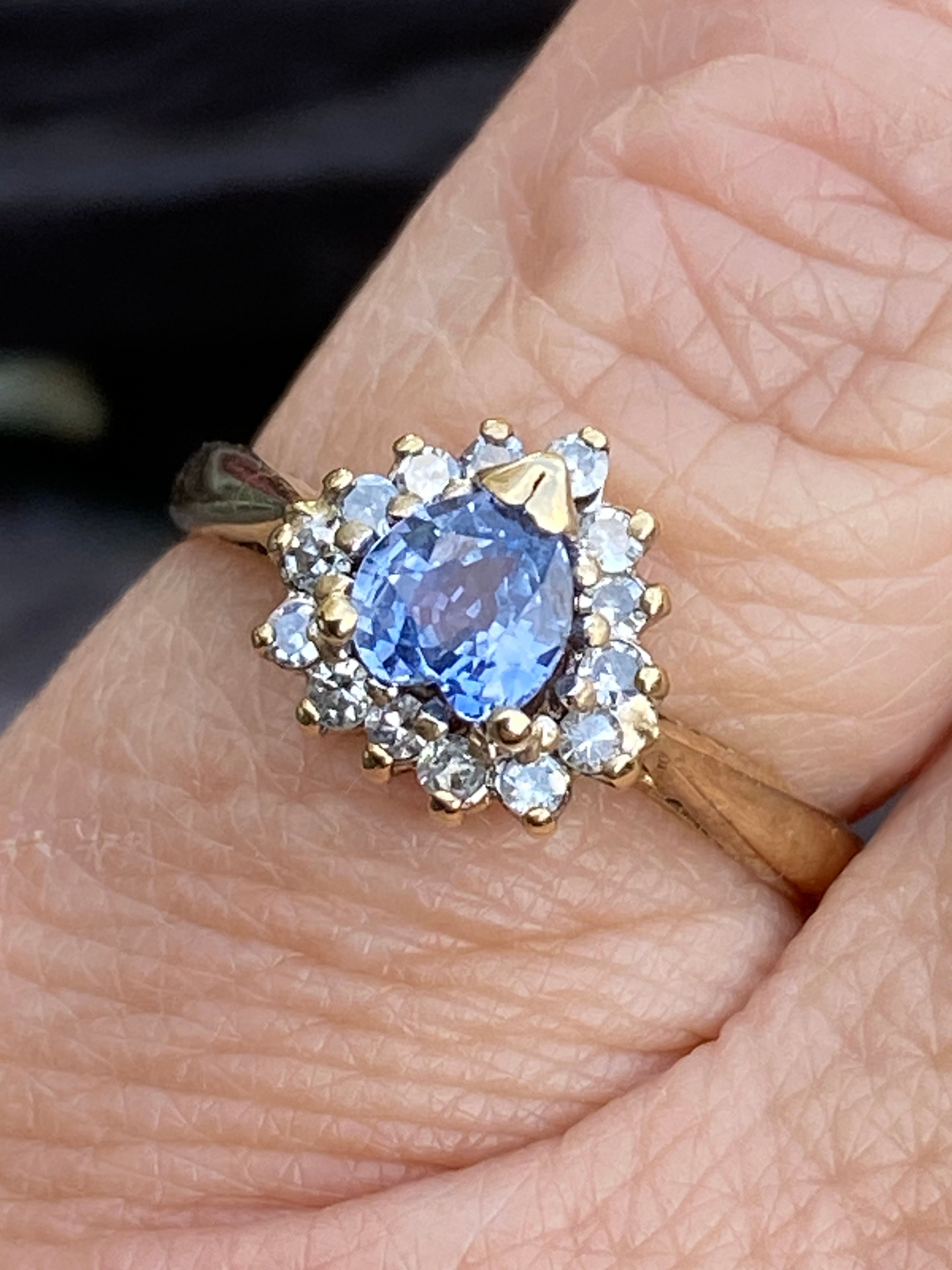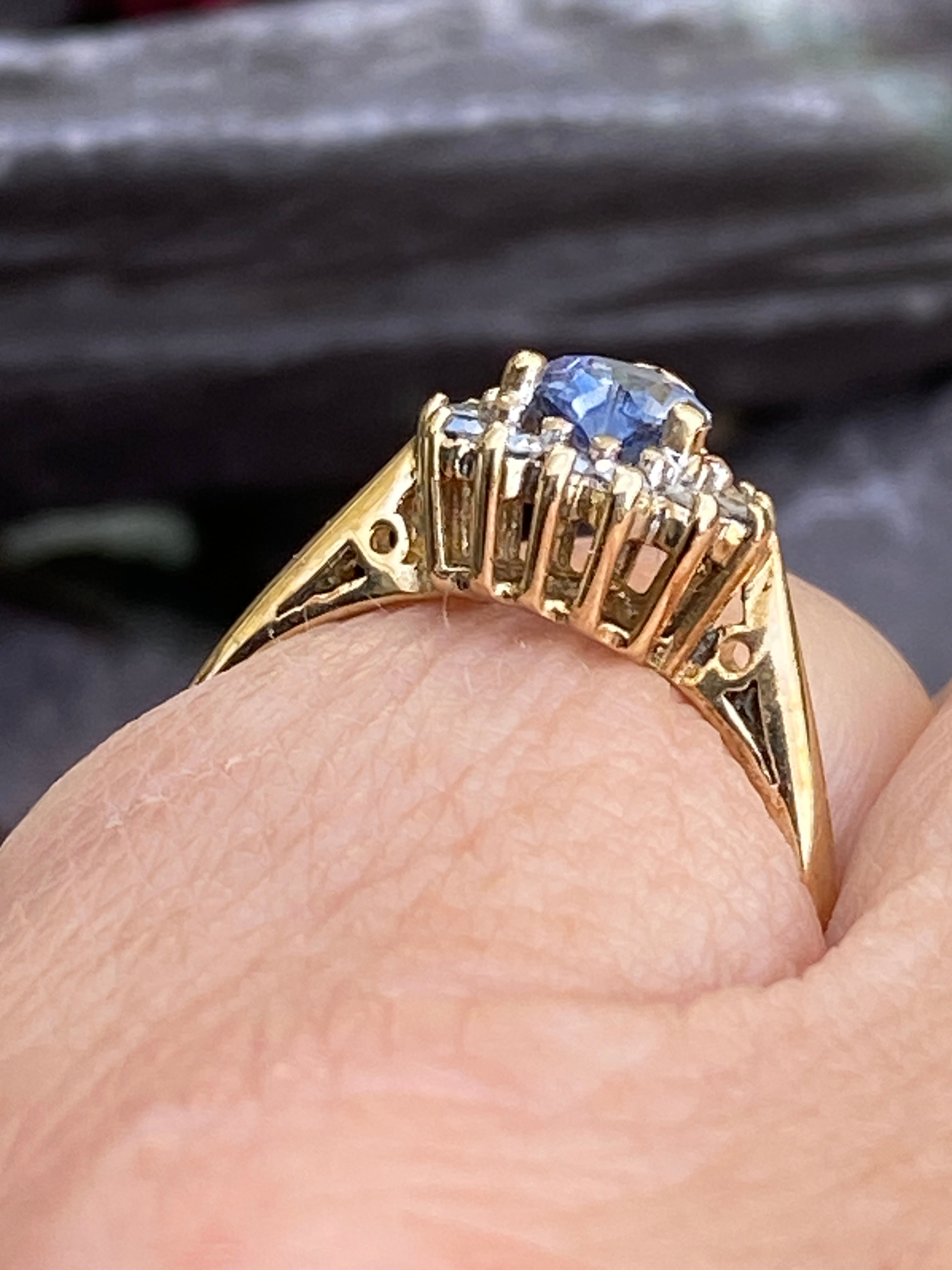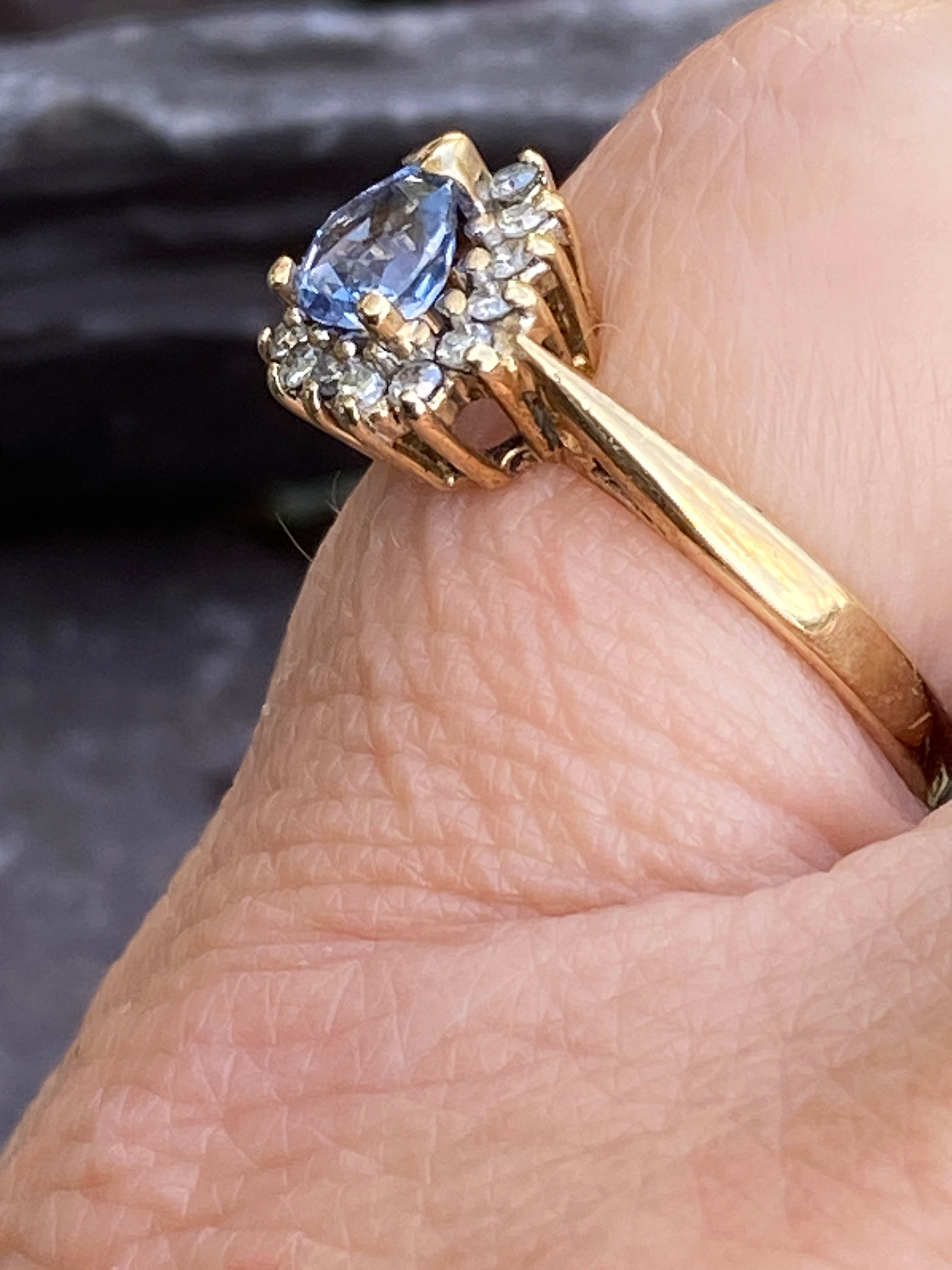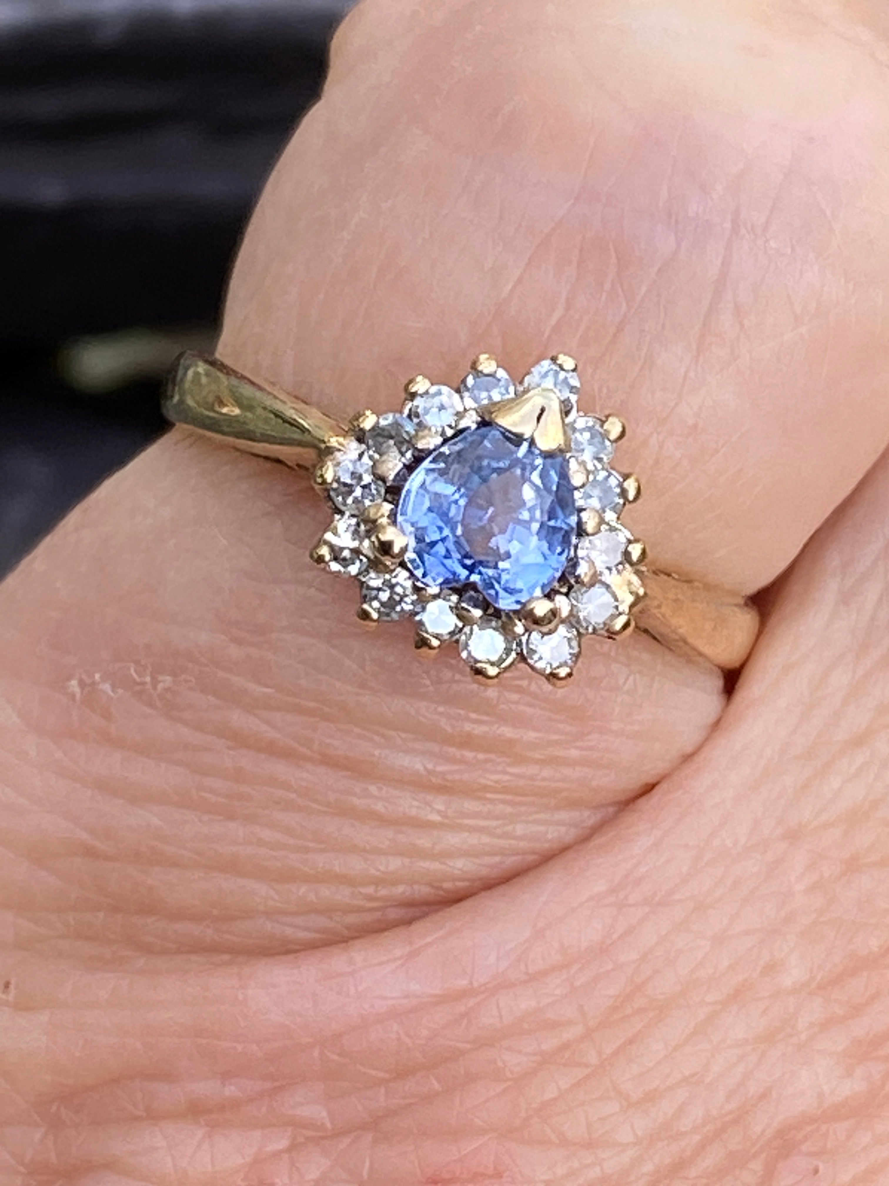 A very pretty 9ct yellow gold ring set with a heart shaped Tanzanite surrounded by Diamonds