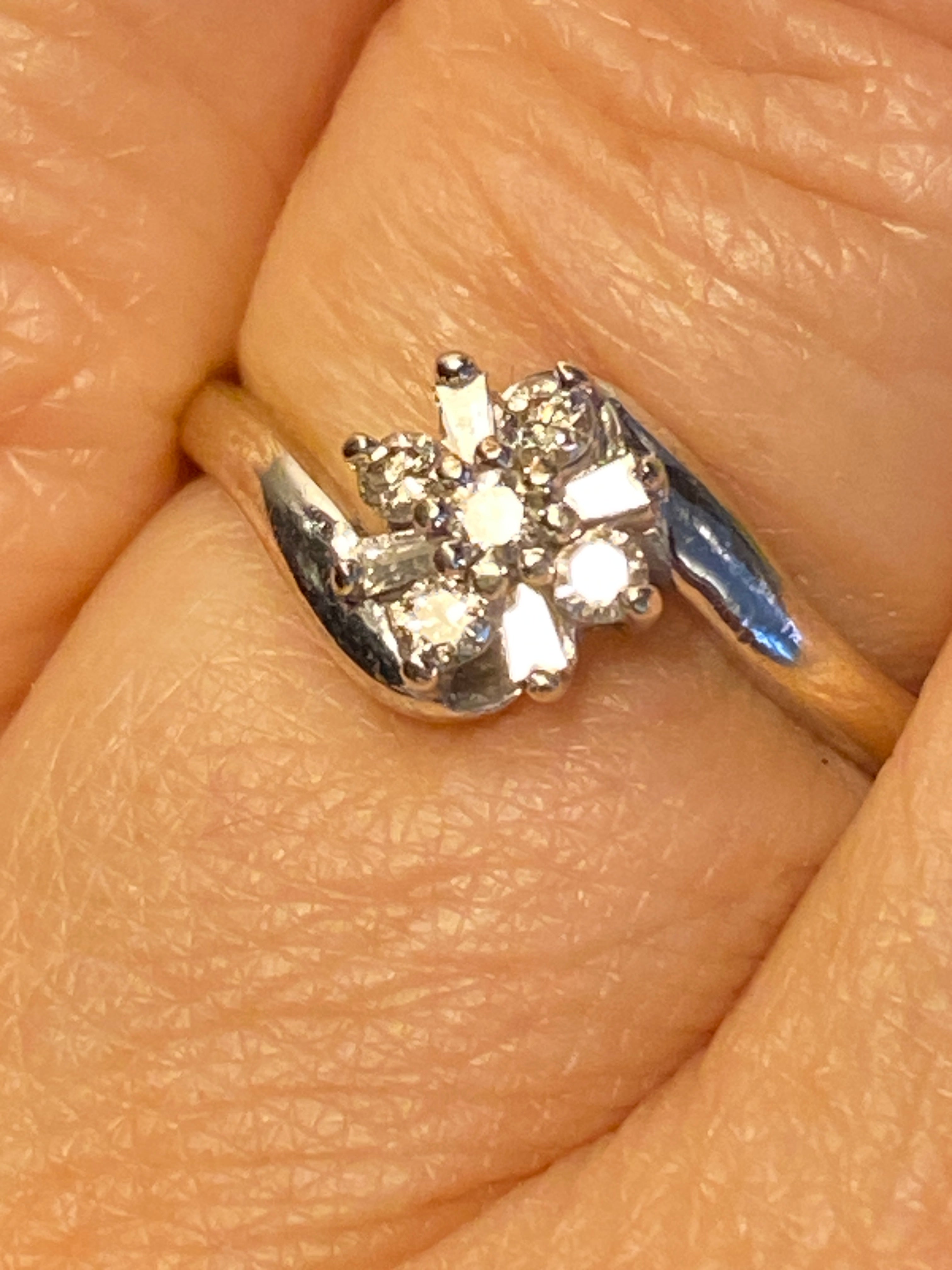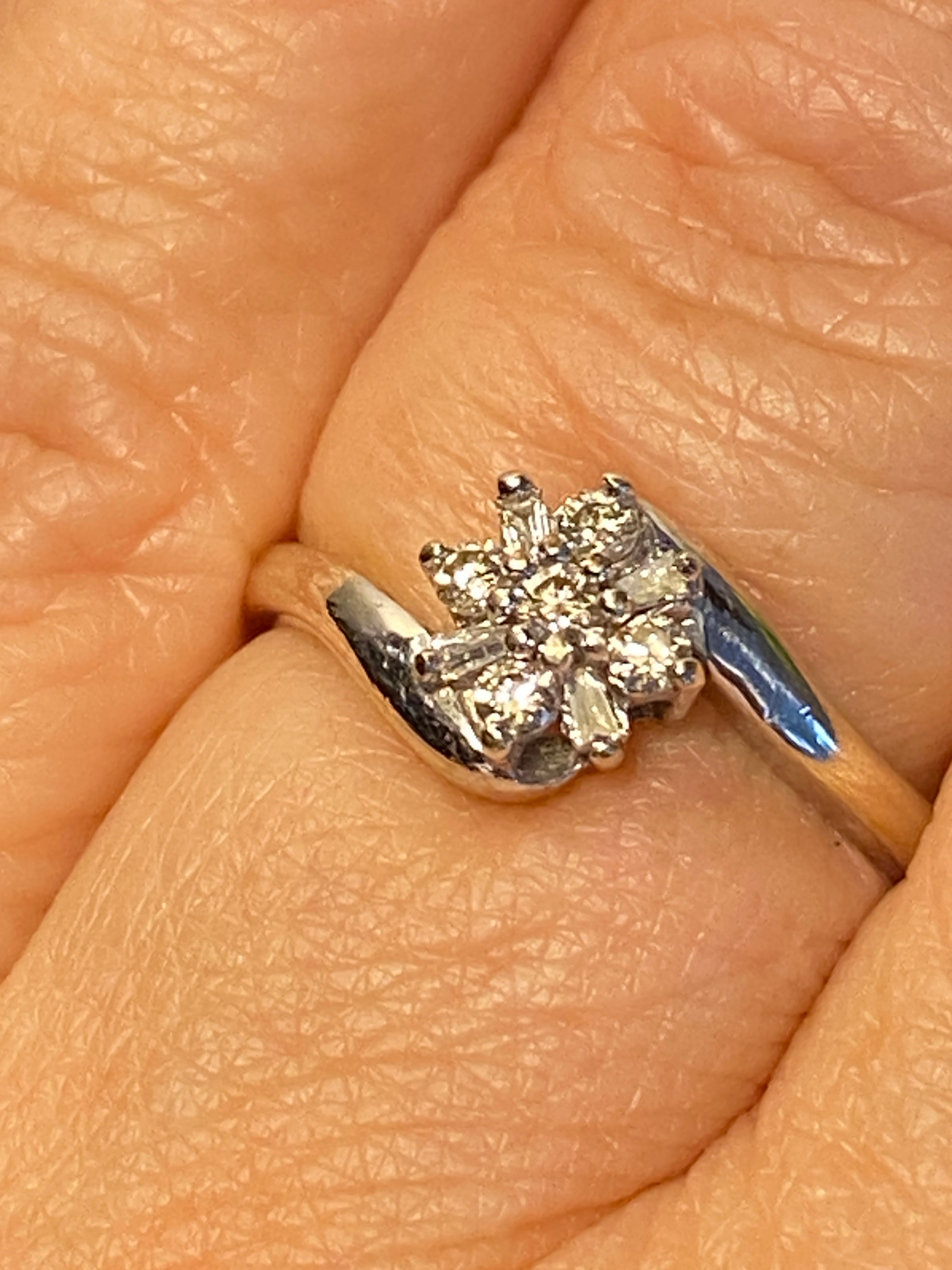 A very pretty 9ct white gold ring set with a star burst of round brilliant and tapered baguette cut Diamonds in a twist setting. Finger size M or...