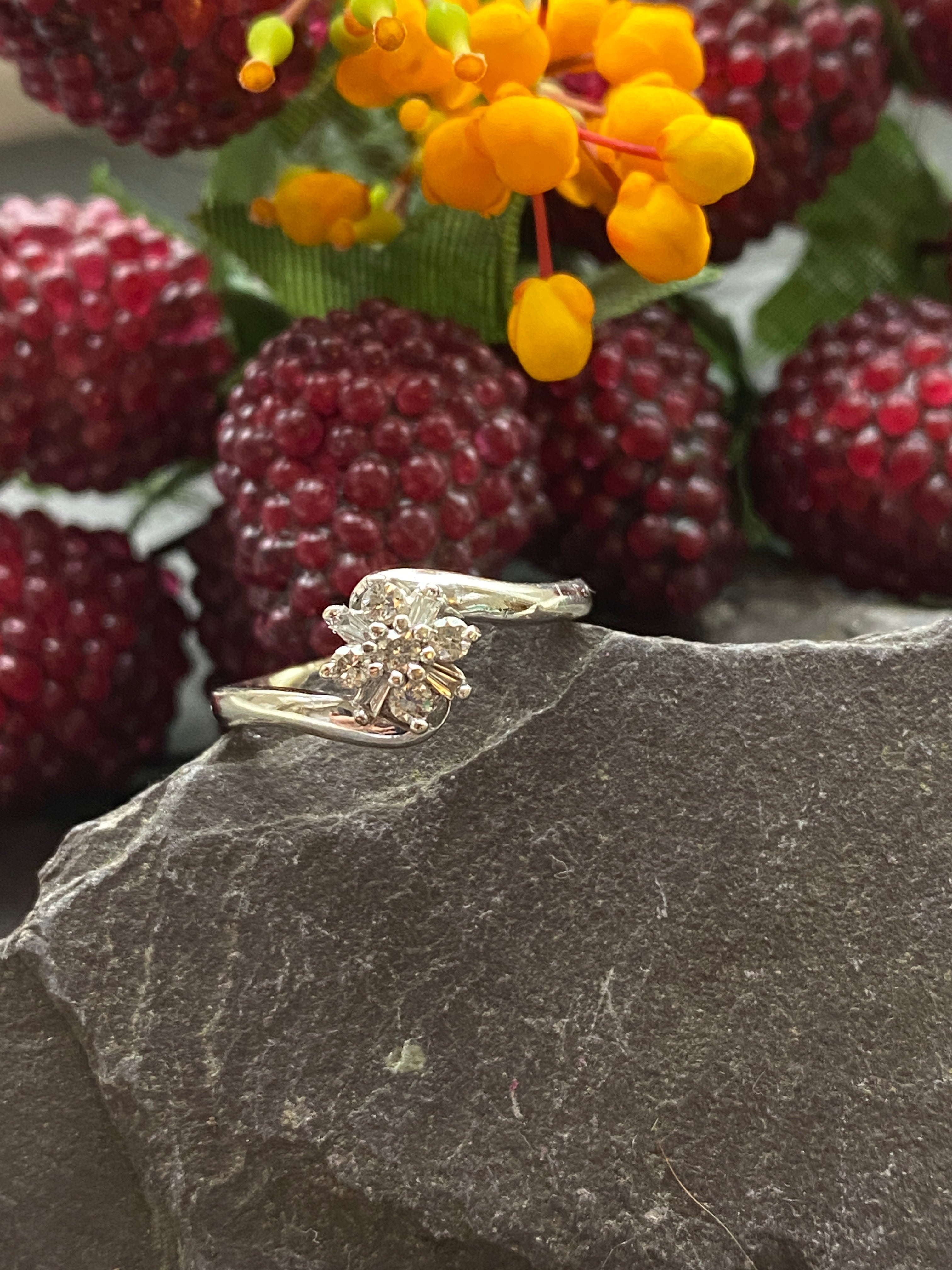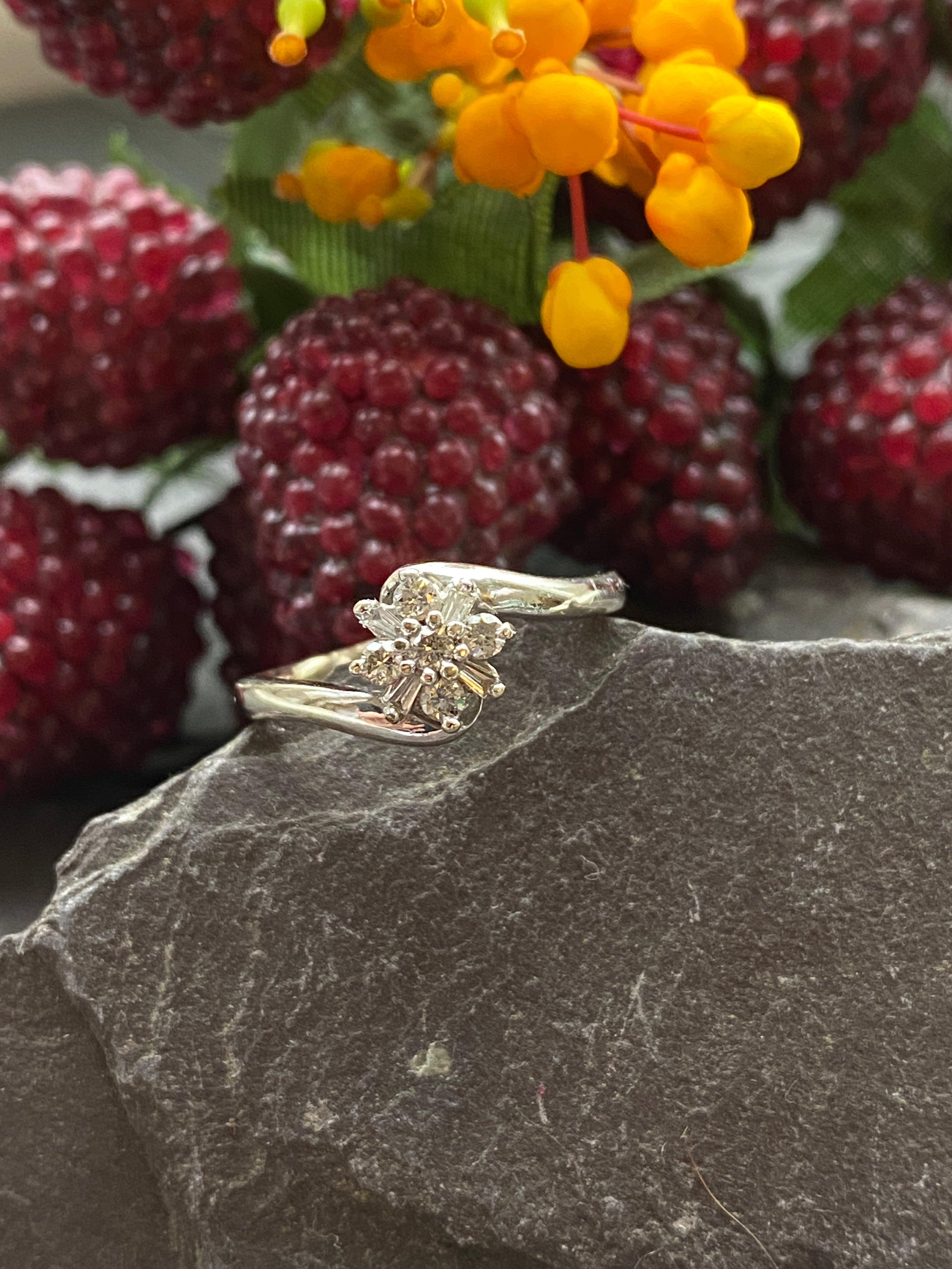 A very pretty 9ct white gold ring set with a star burst of round brilliant and tapered baguette cut Diamonds in a twist setting.