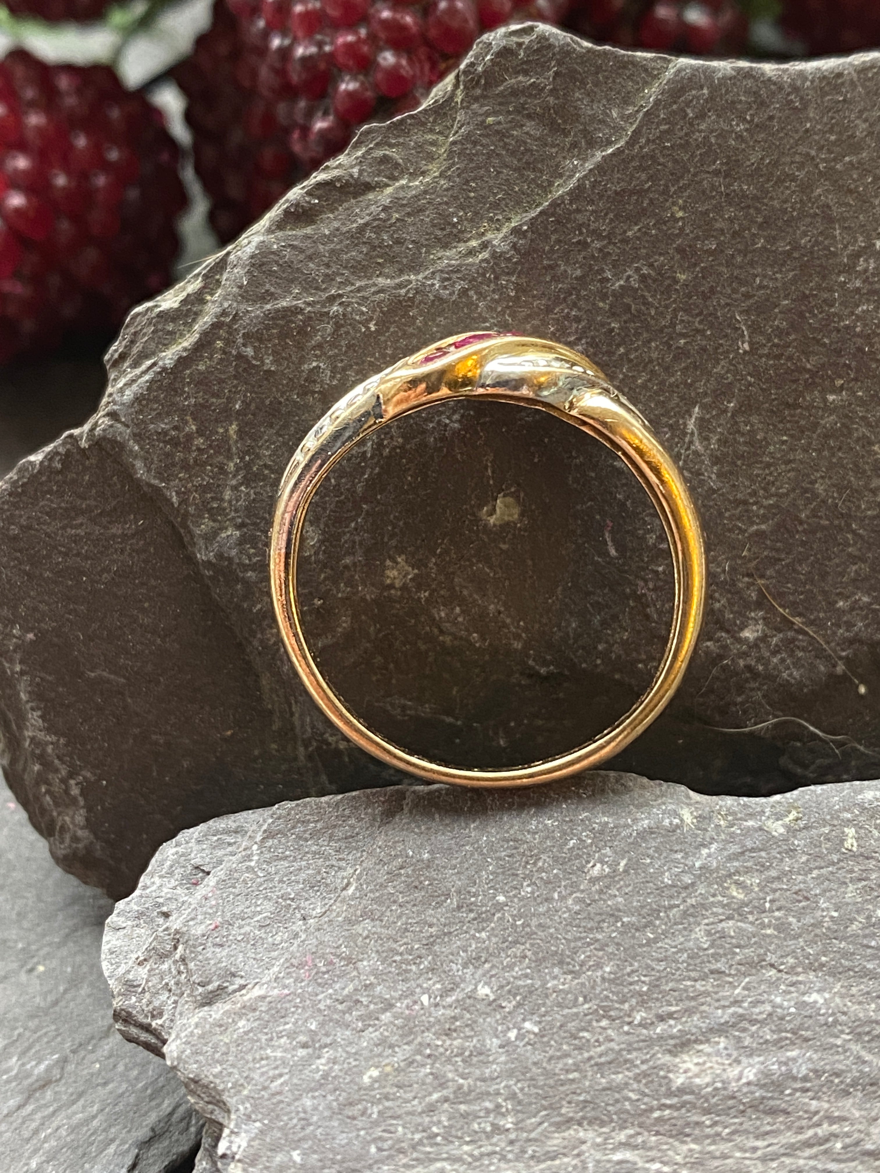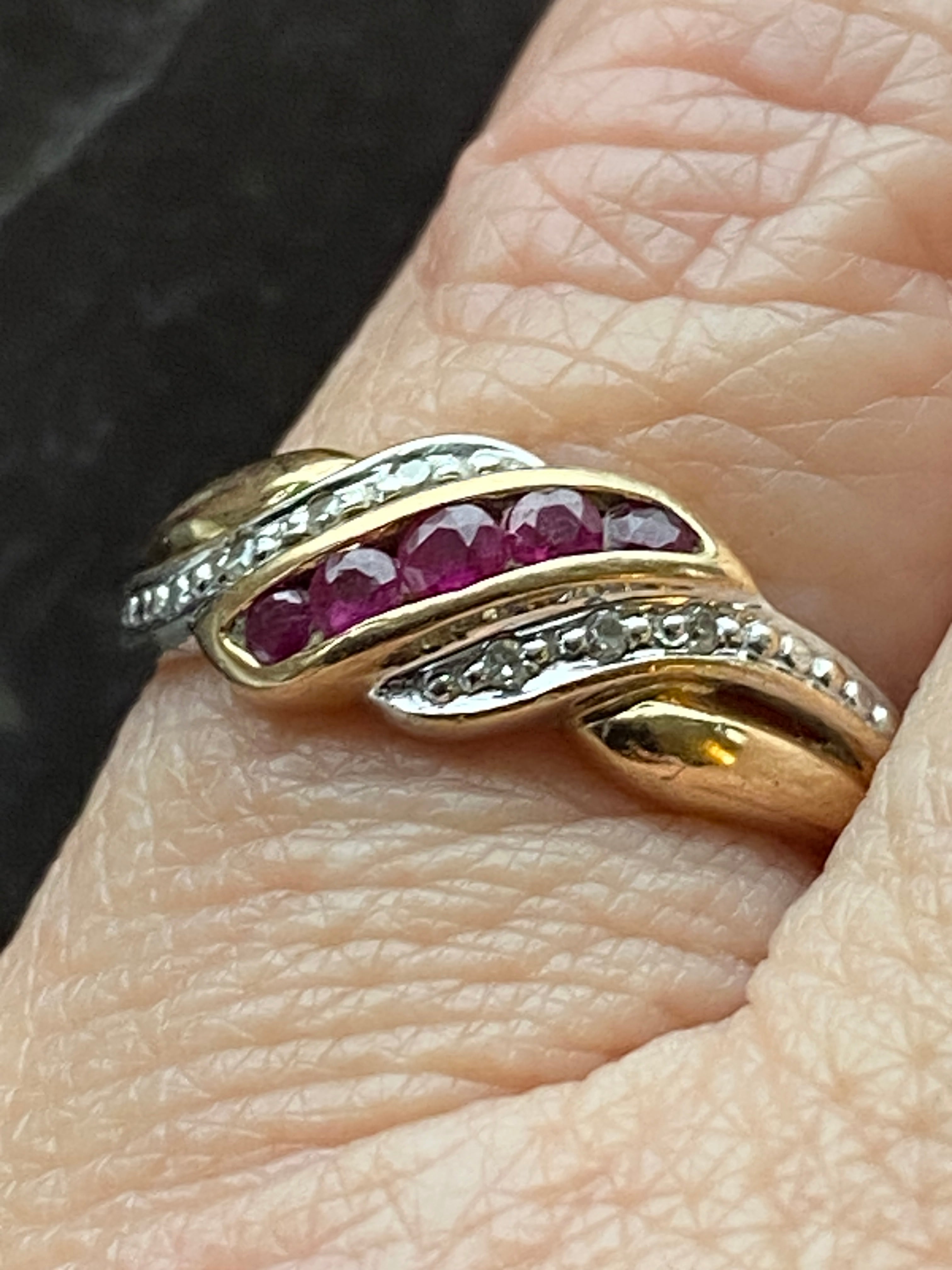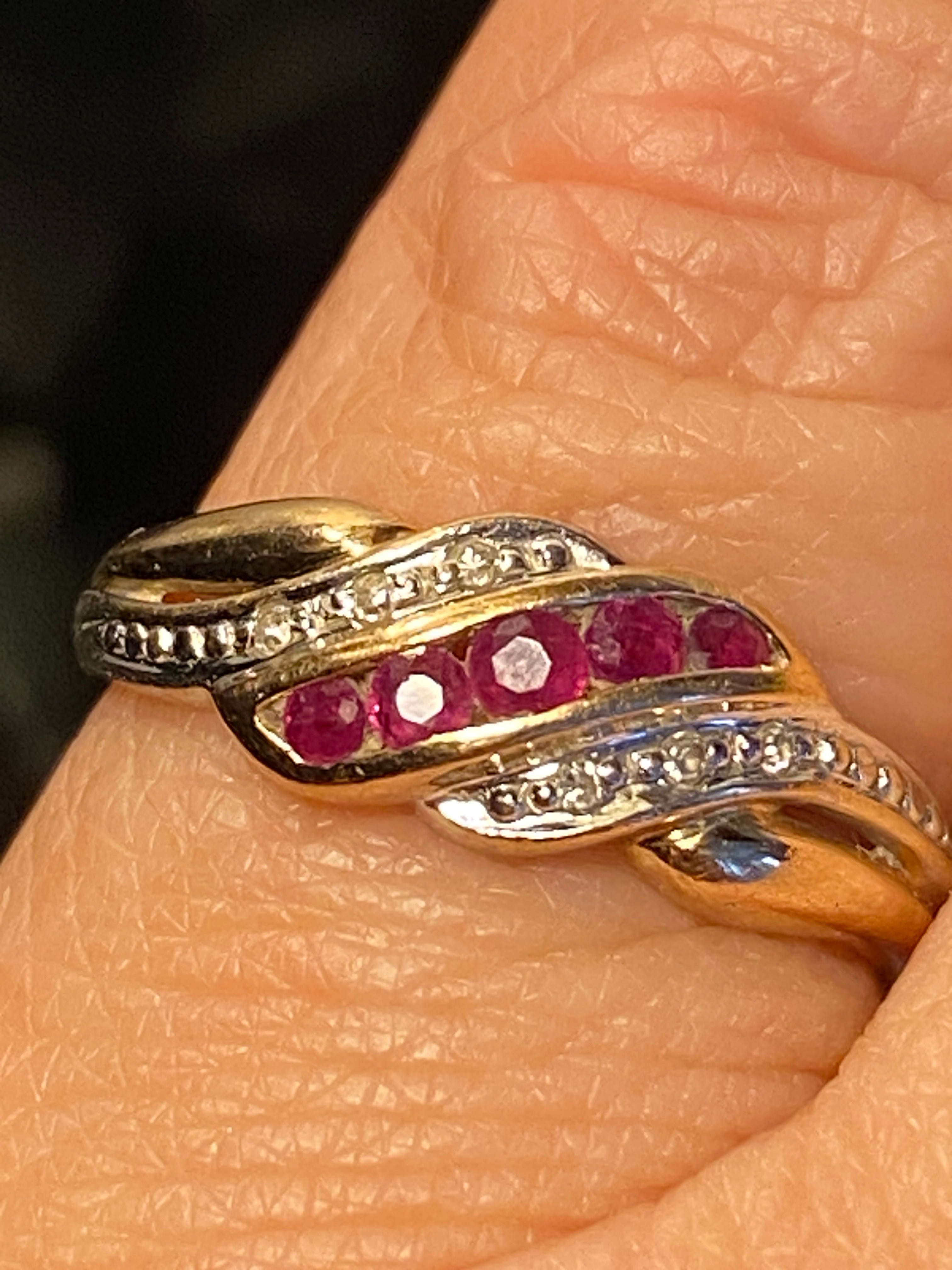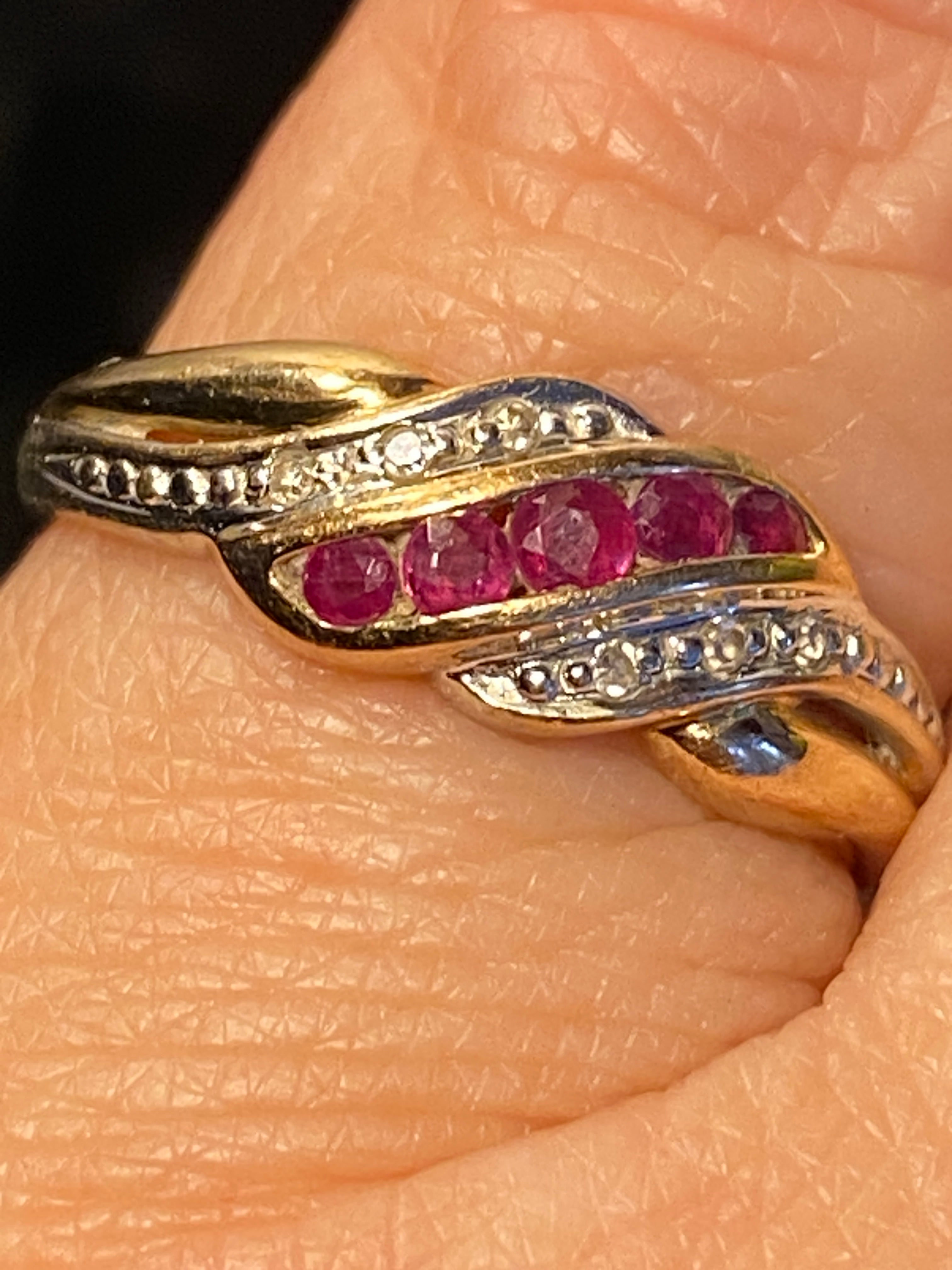A pretty 9ct yellow gold ring set with round brilliant Ruby and Diamond stones.