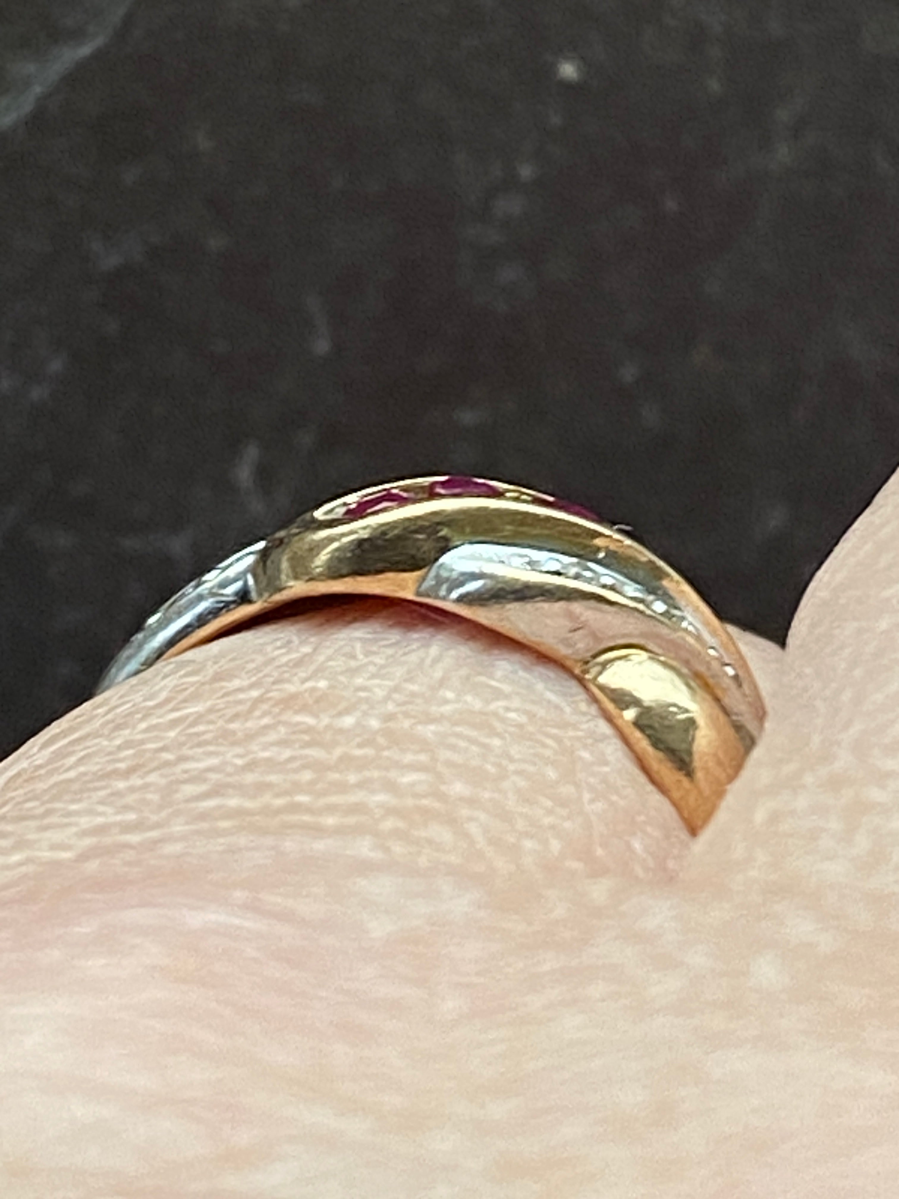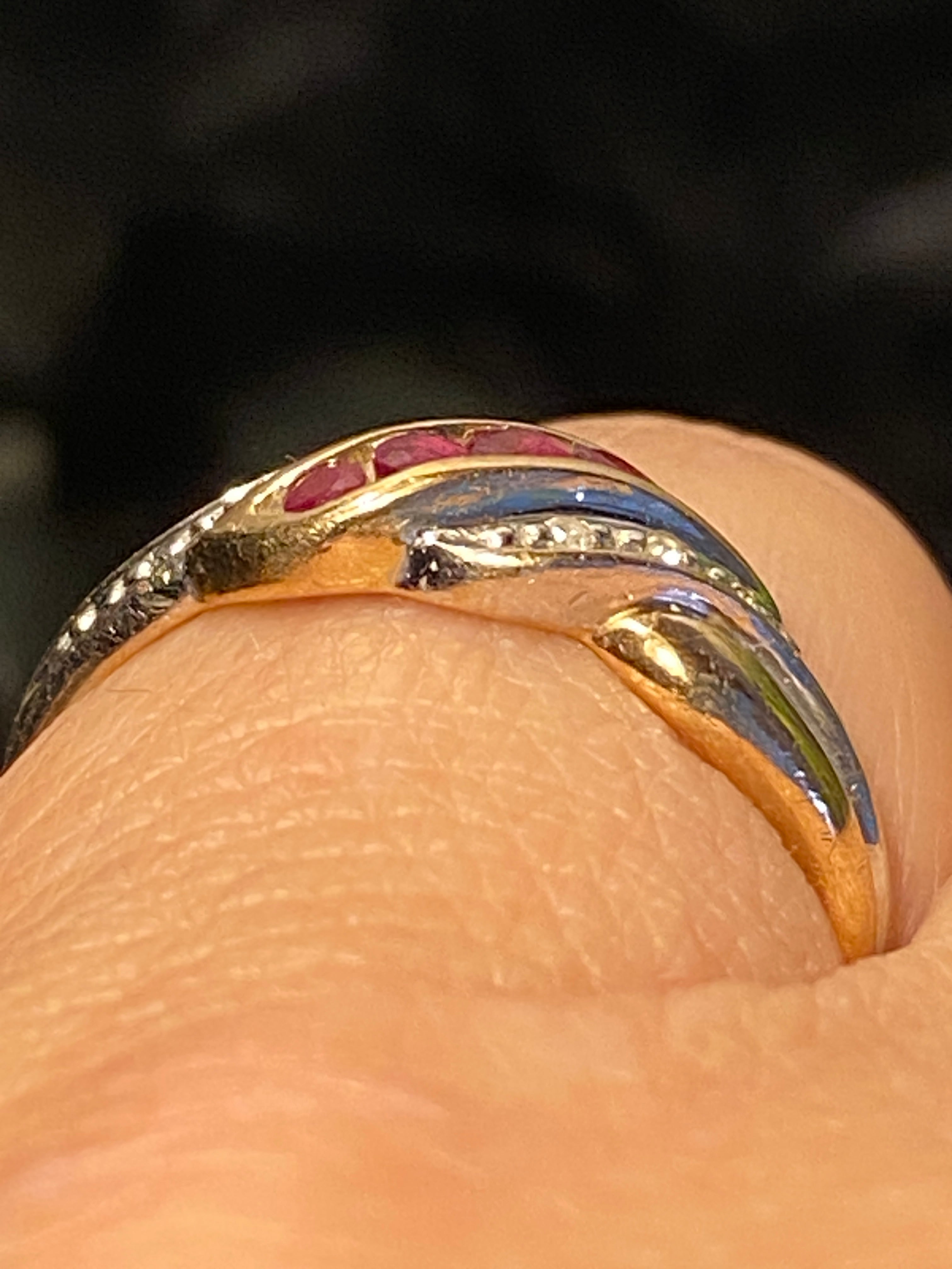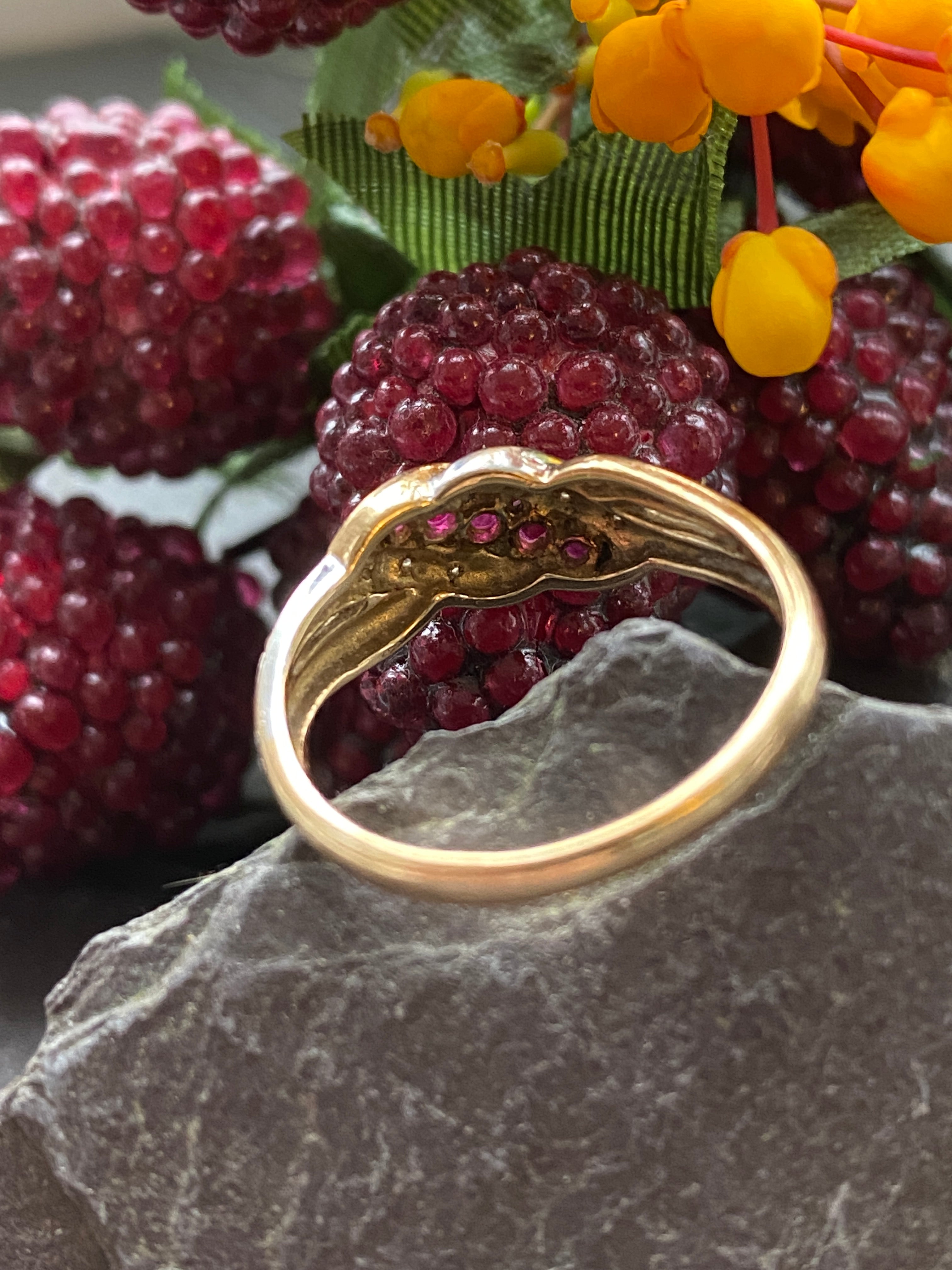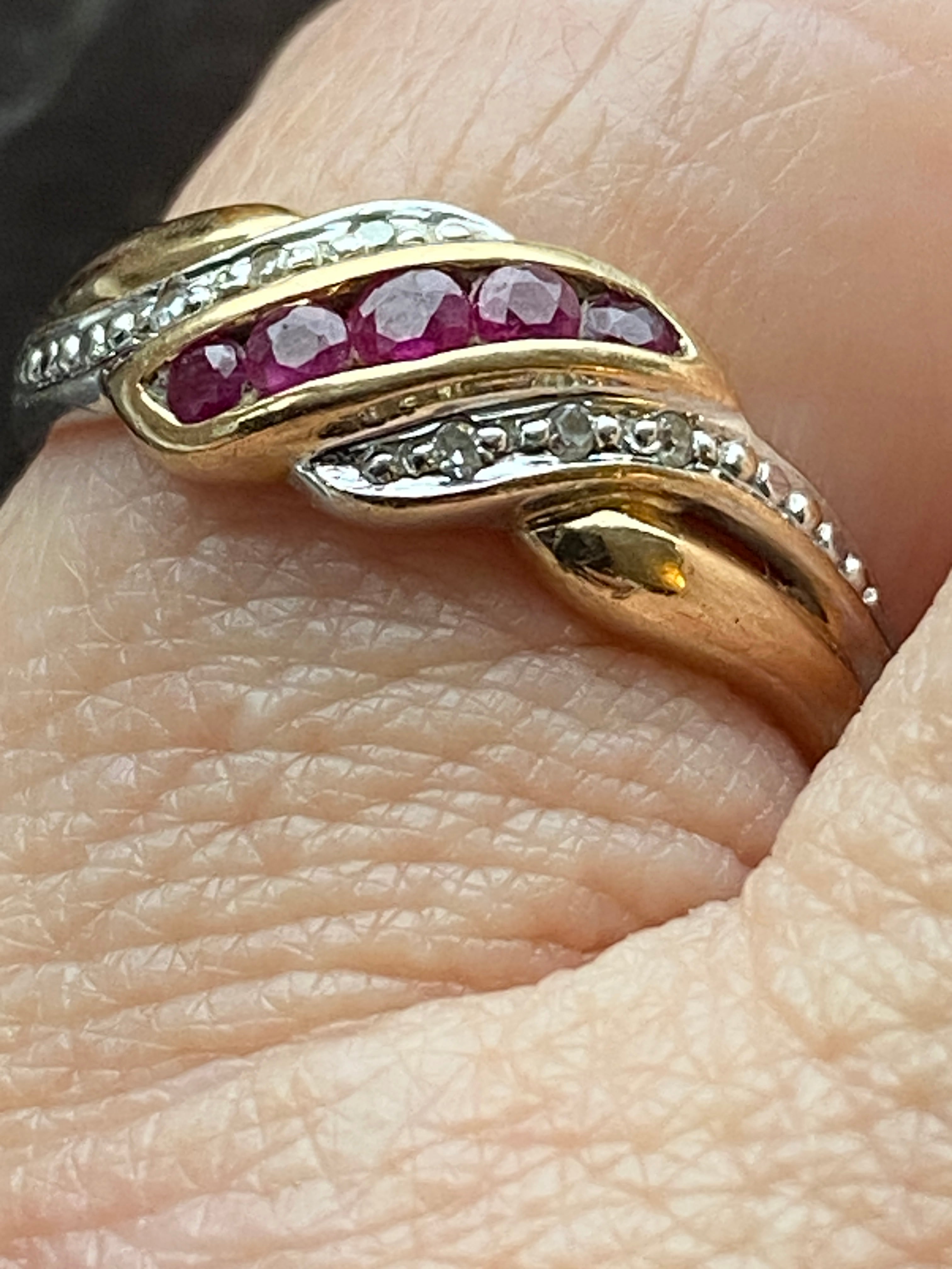 A pretty 9ct yellow gold ring set with round brilliant Ruby and Diamond stones.
