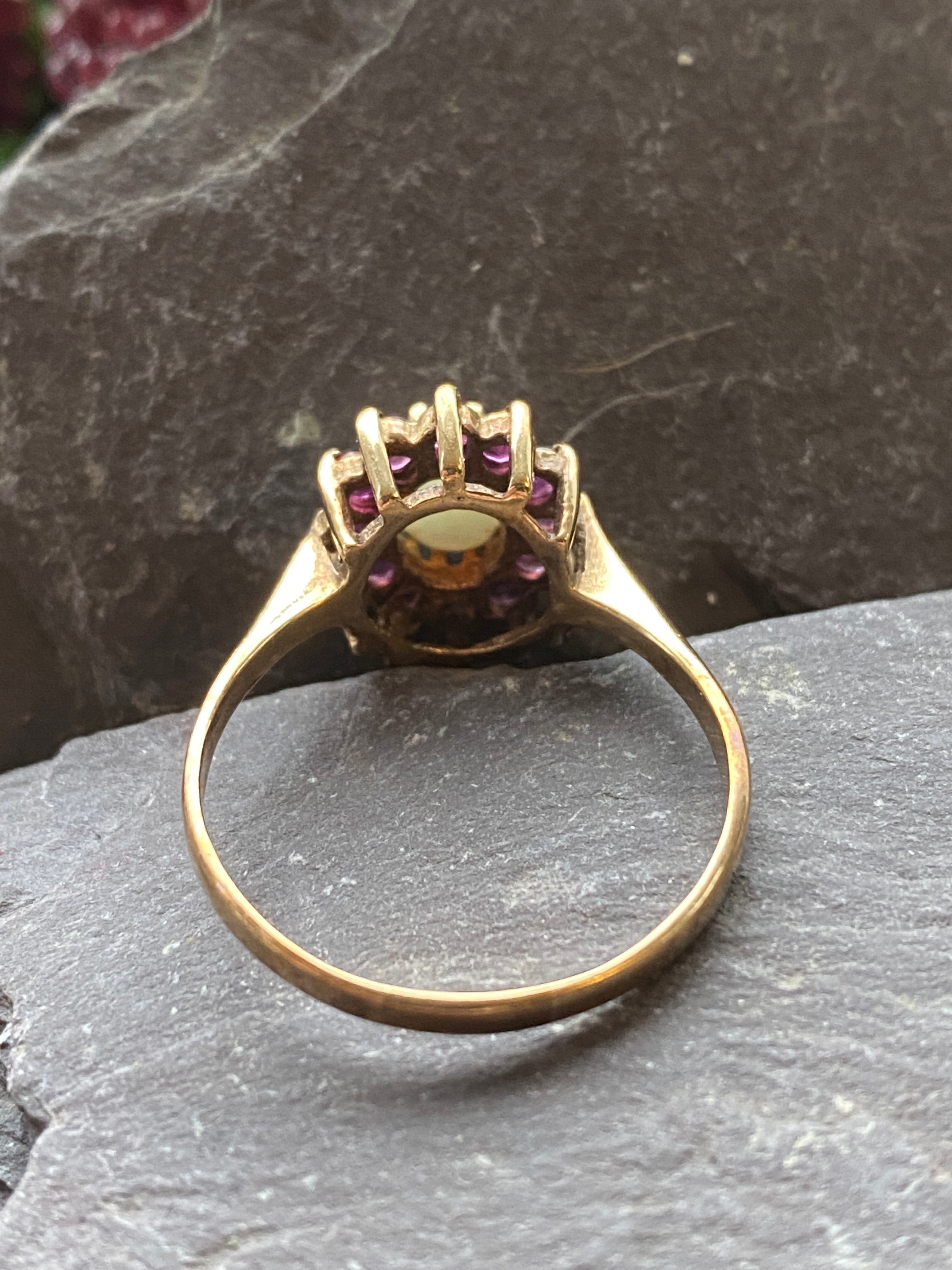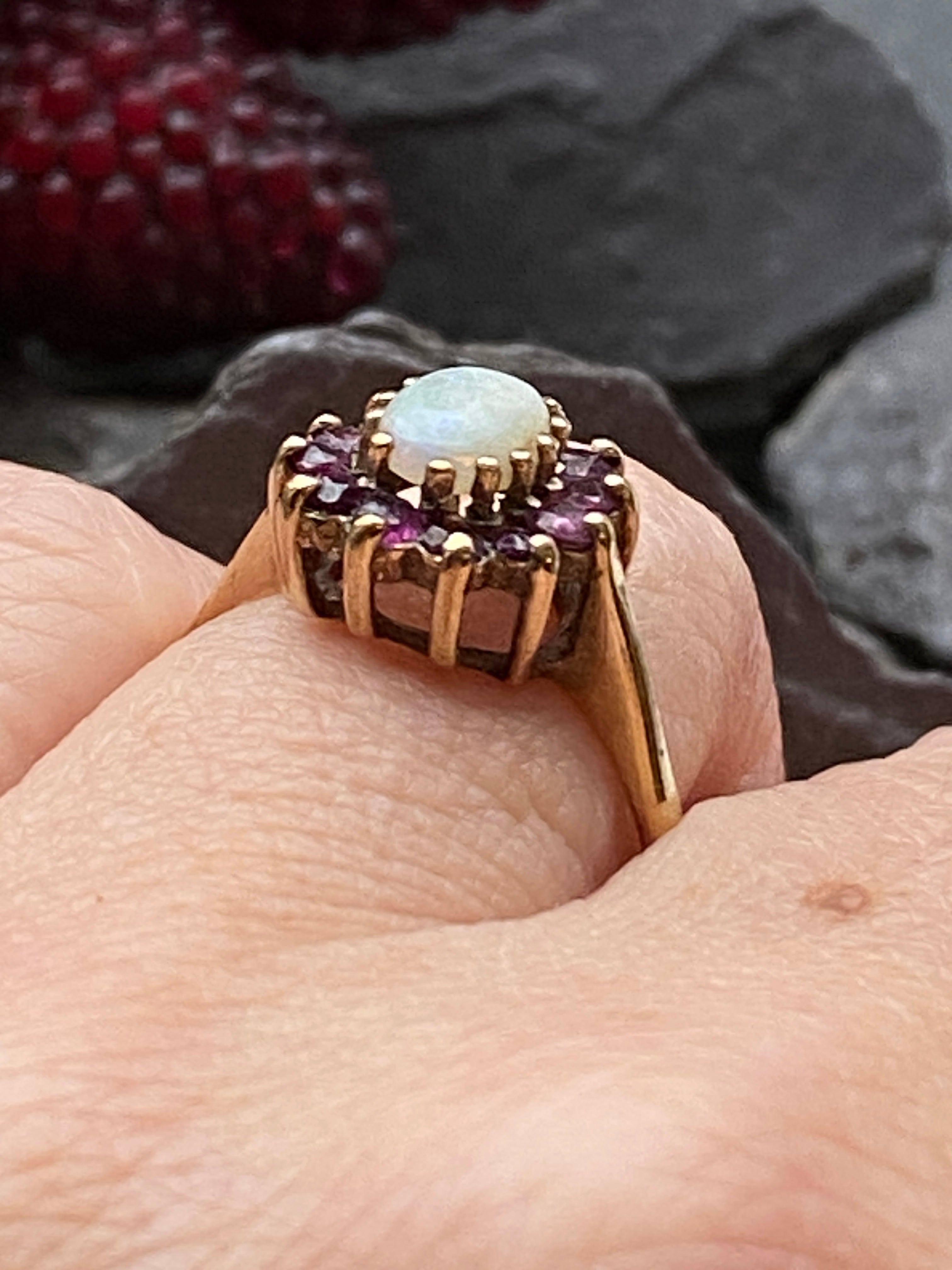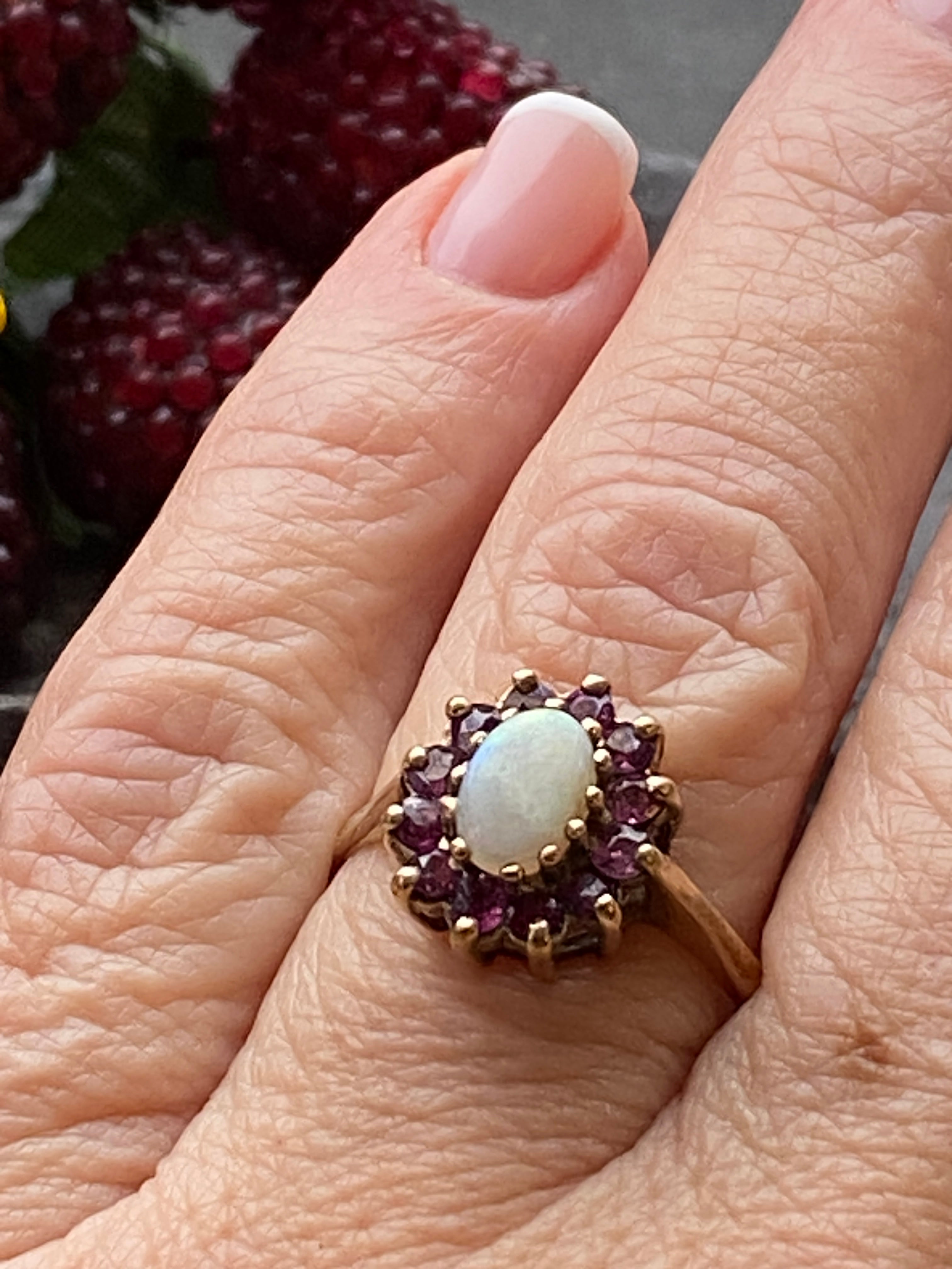 A pretty 9ct yellow gold cluster ring set with a white opal surrounded by garnets.