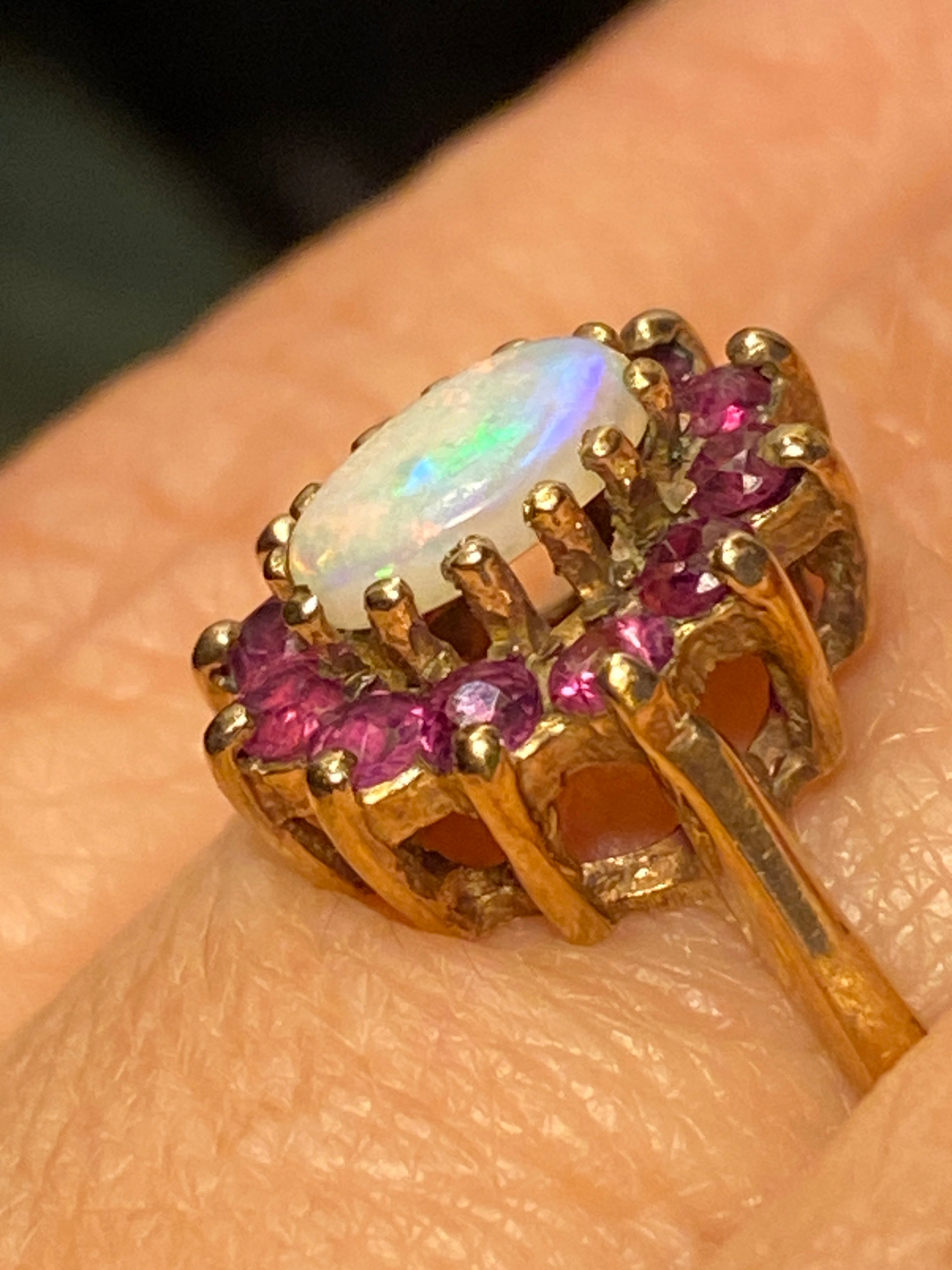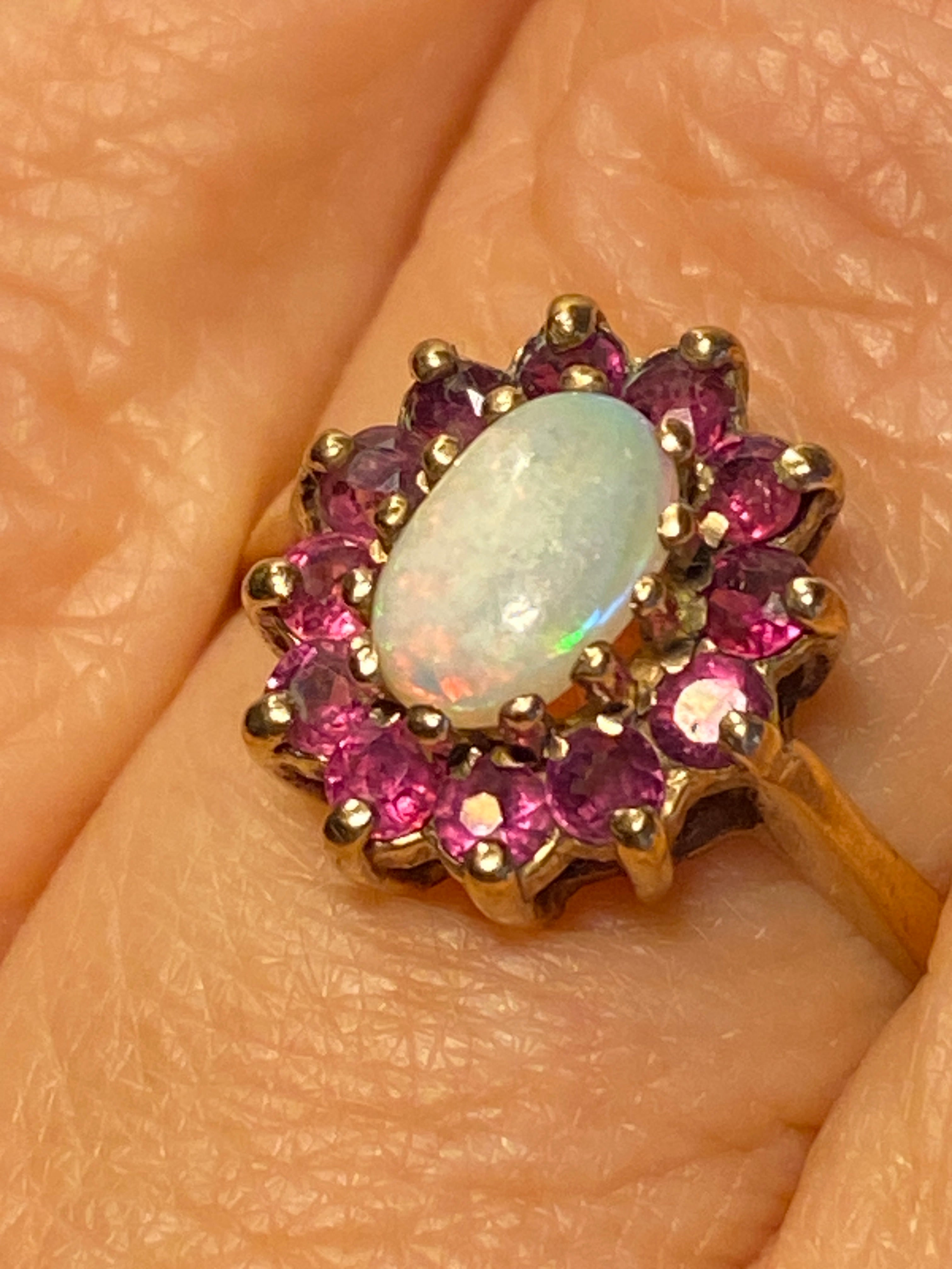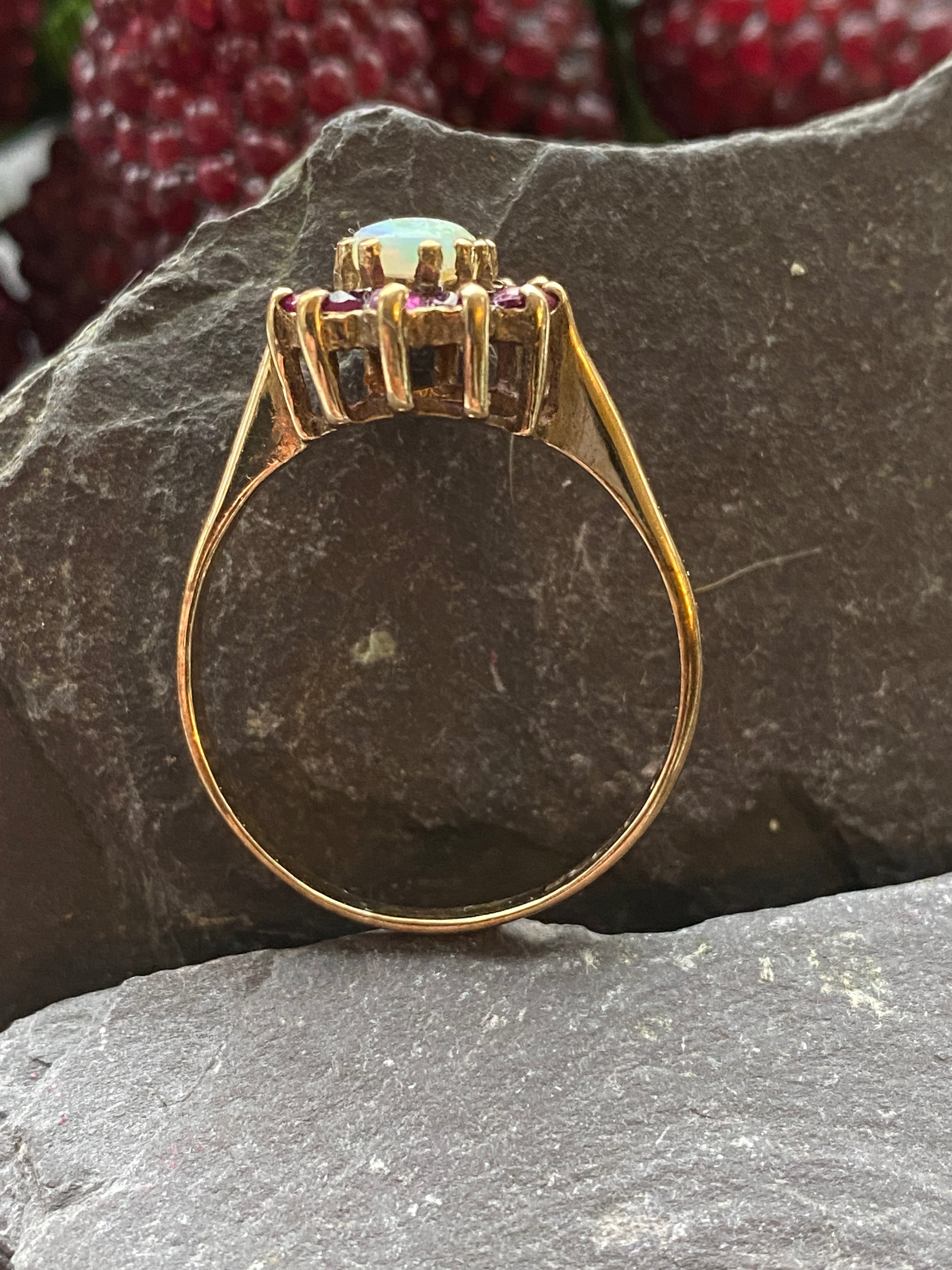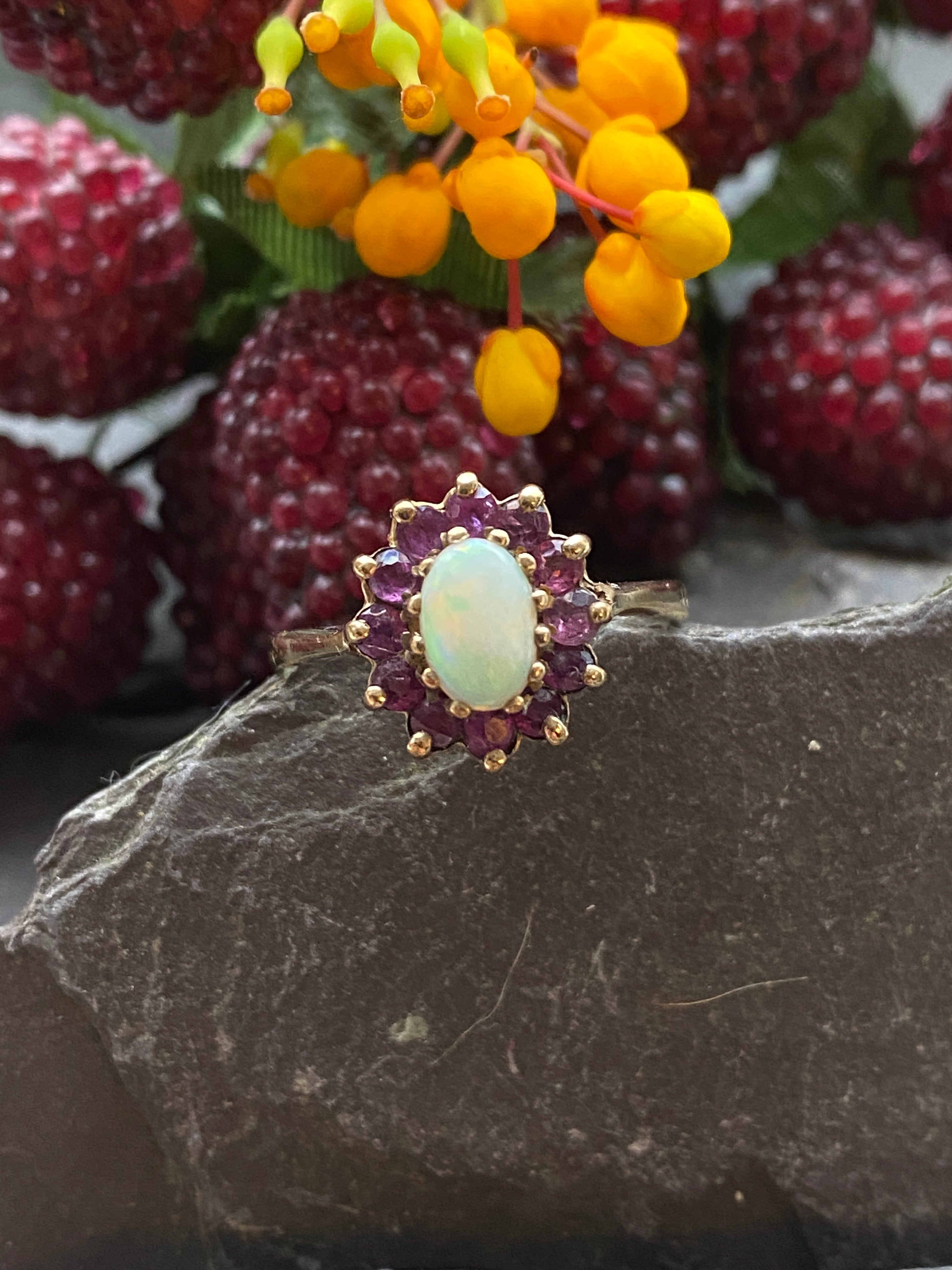 A pretty 9ct yellow gold cluster ring set with a white opal surrounded by garnets.