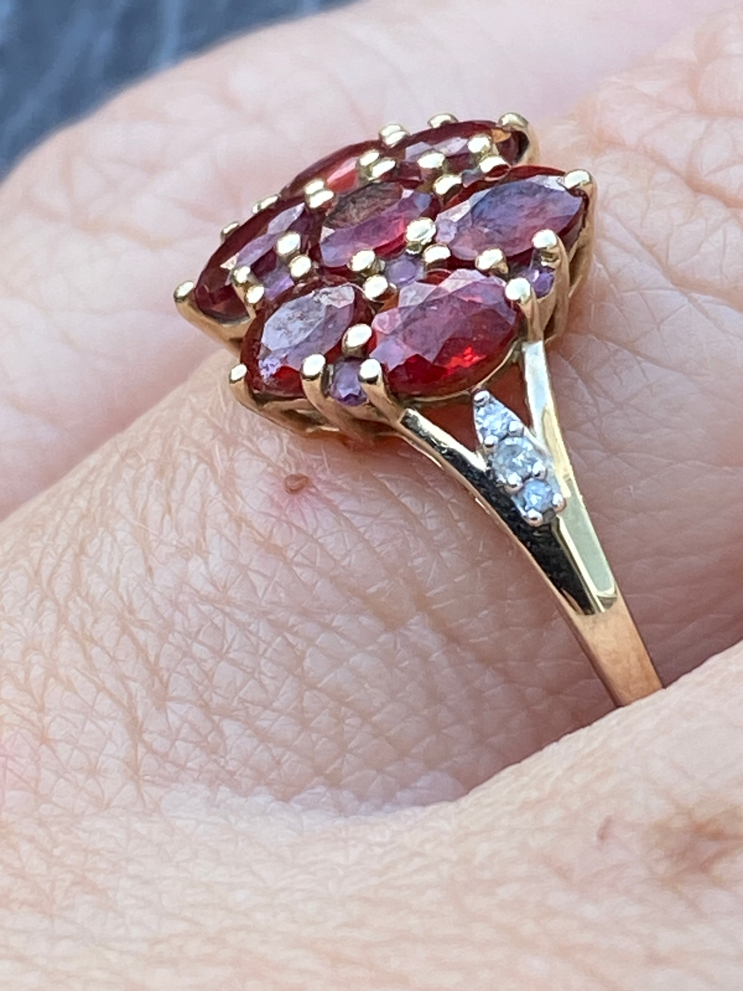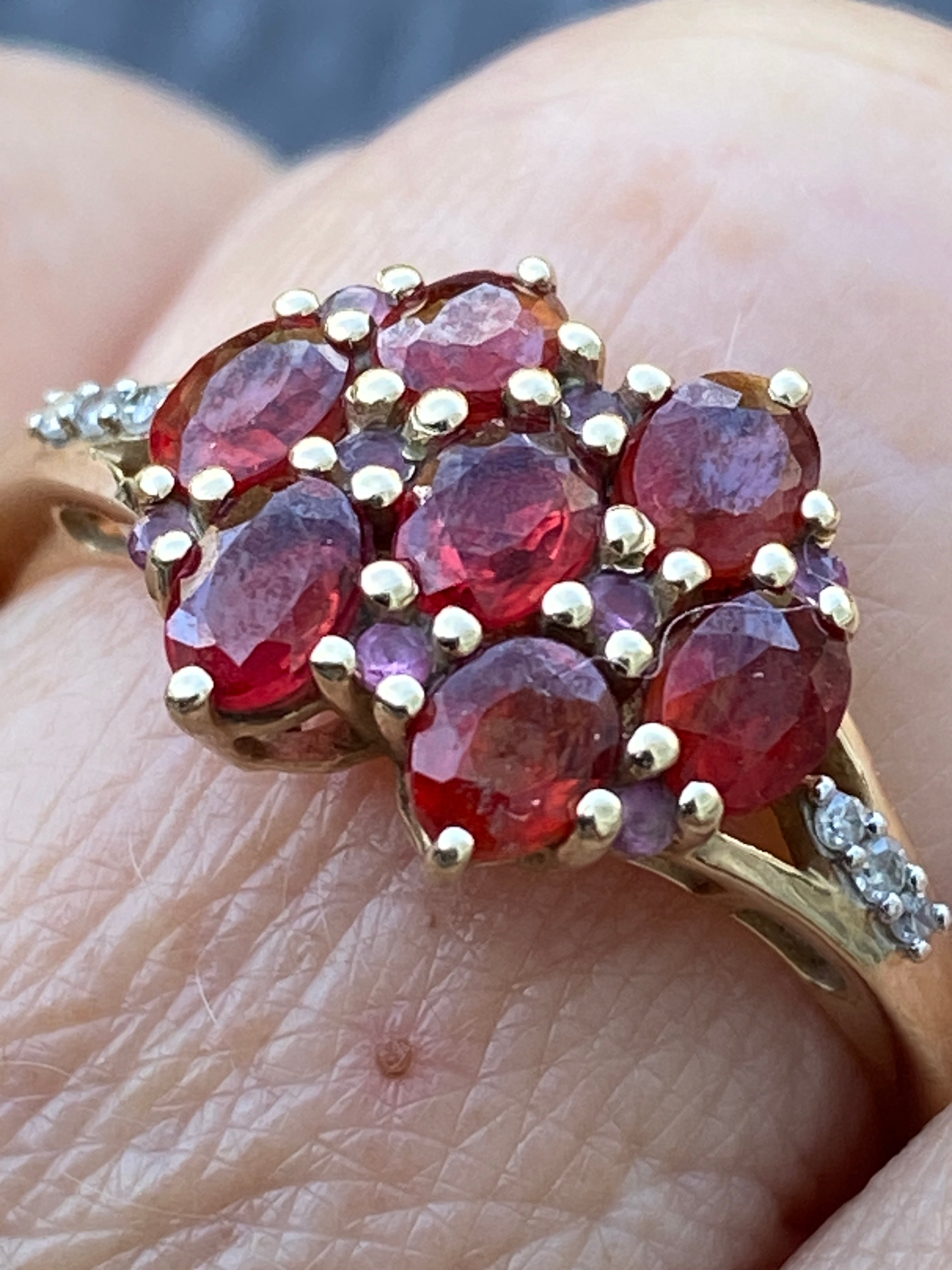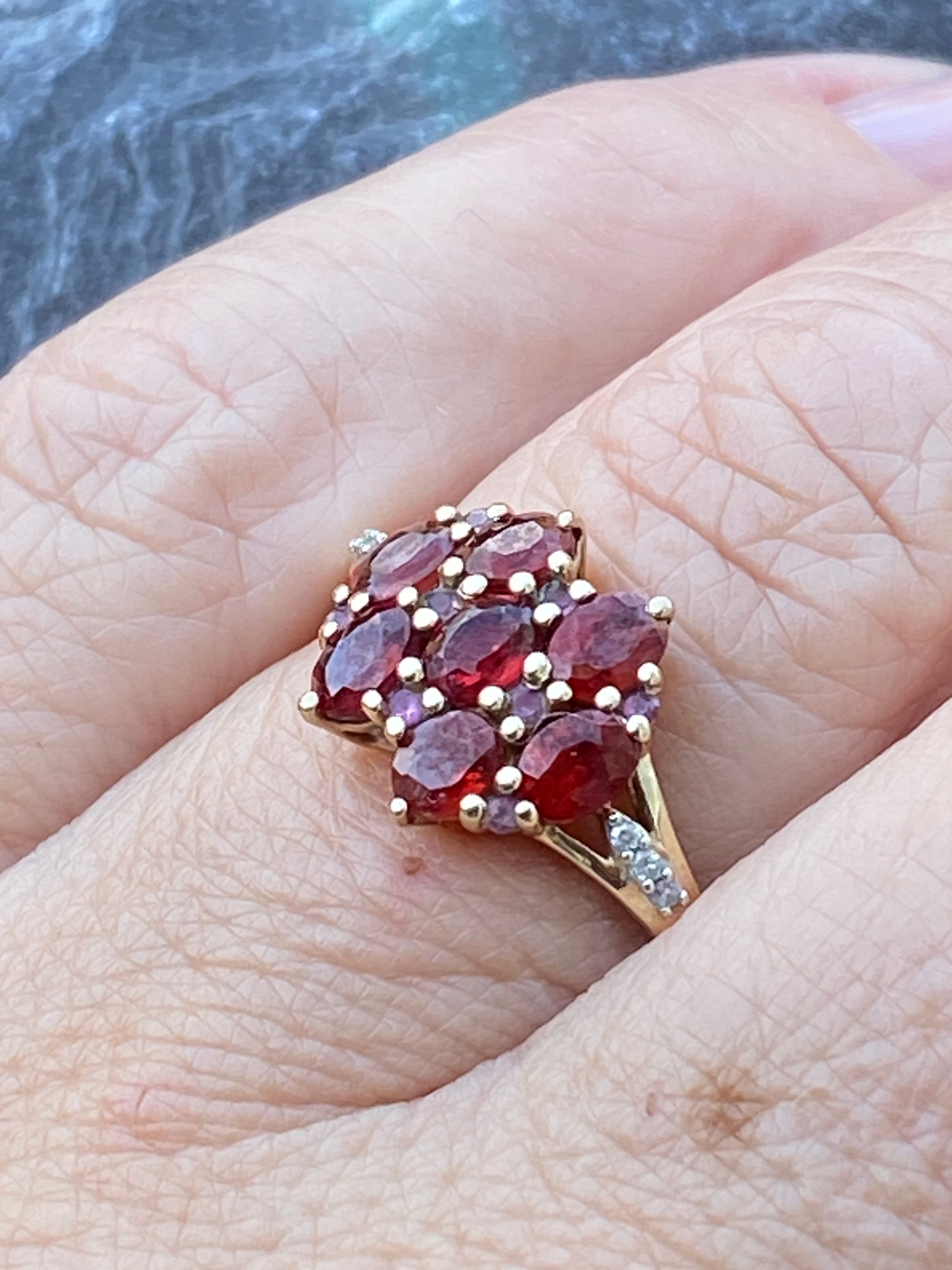 A very pretty ring set with deep red Garnets and four Amethysts  with three Diamonds to each shoulder. Amethysts are easy to miss! Diamonds are very small accents....