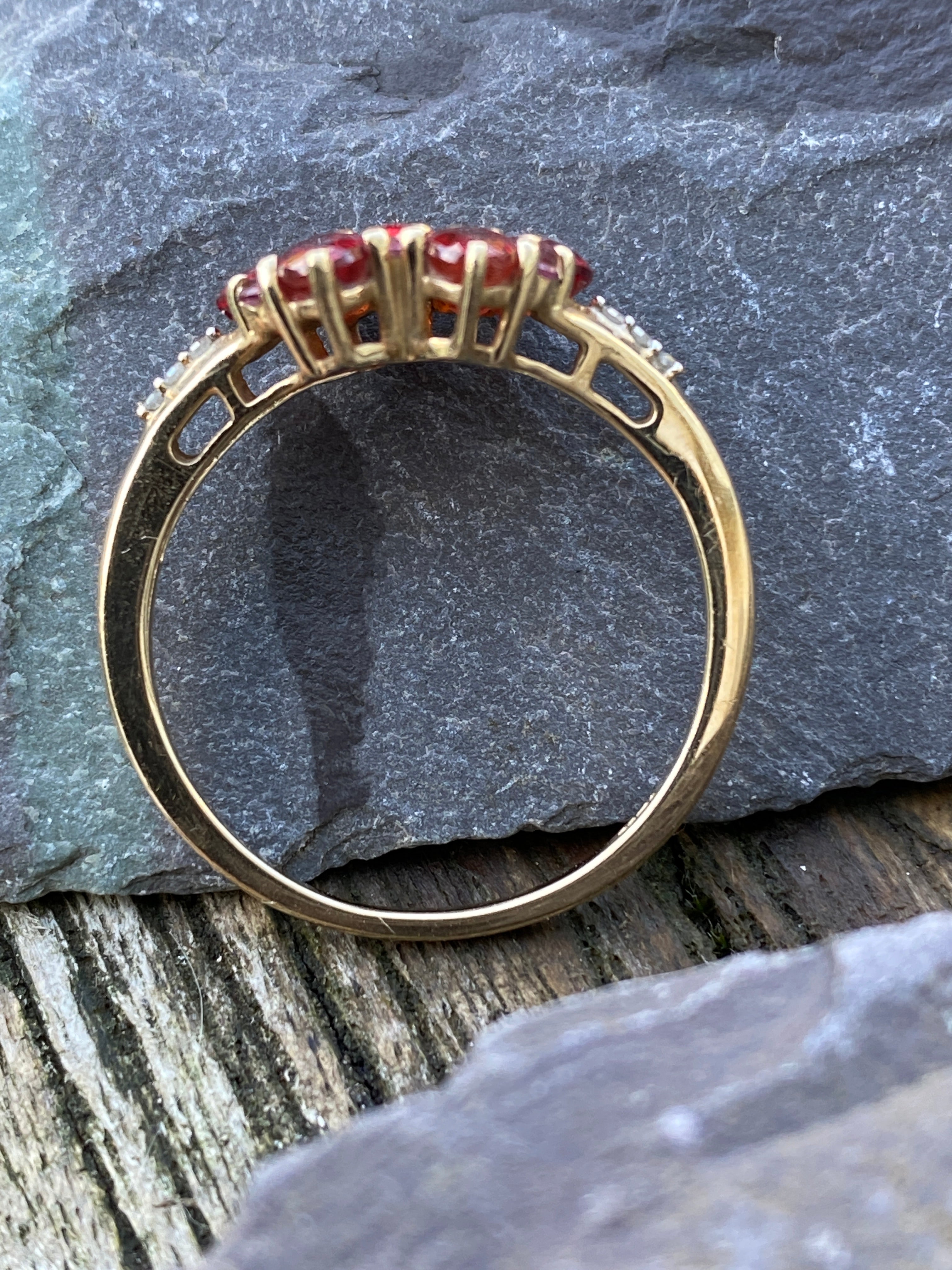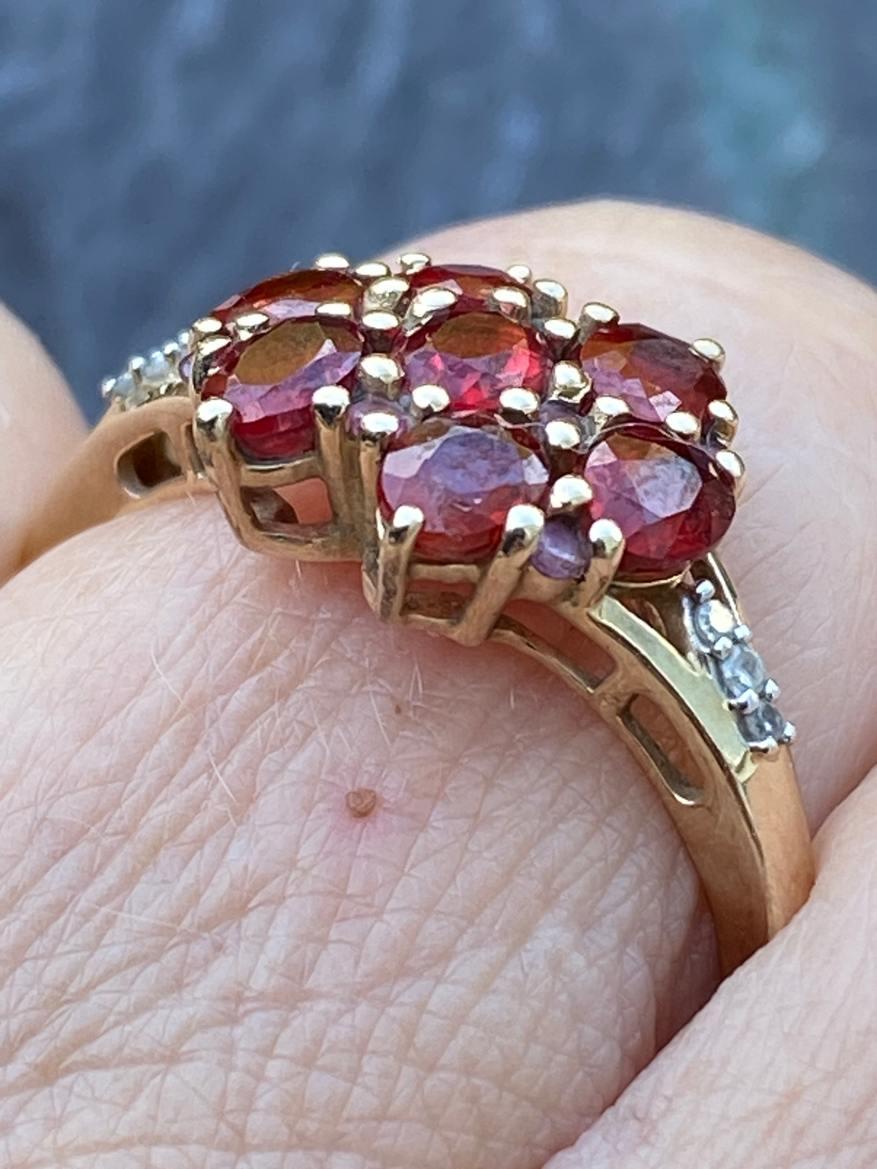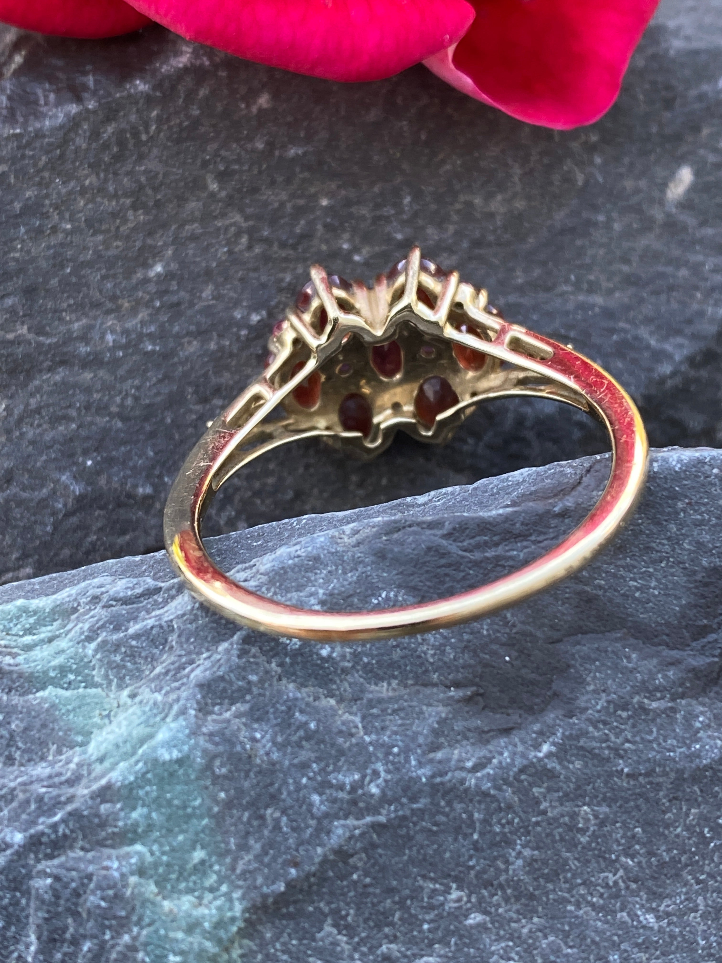 A very pretty ring set with deep red Garnets and four Amethysts  with three Diamonds to each shoulder. Amethysts are easy to miss! Diamonds are very small accents....