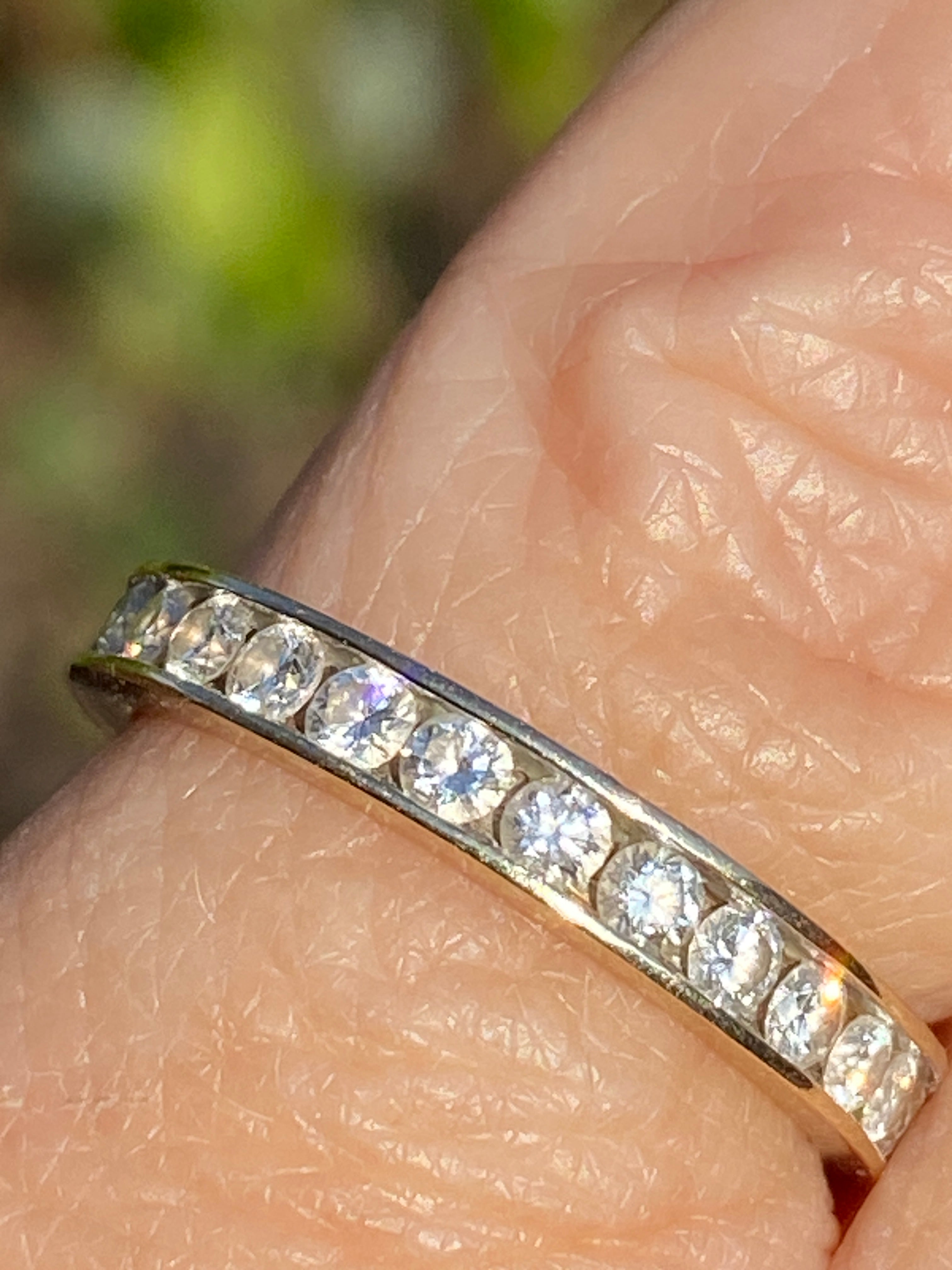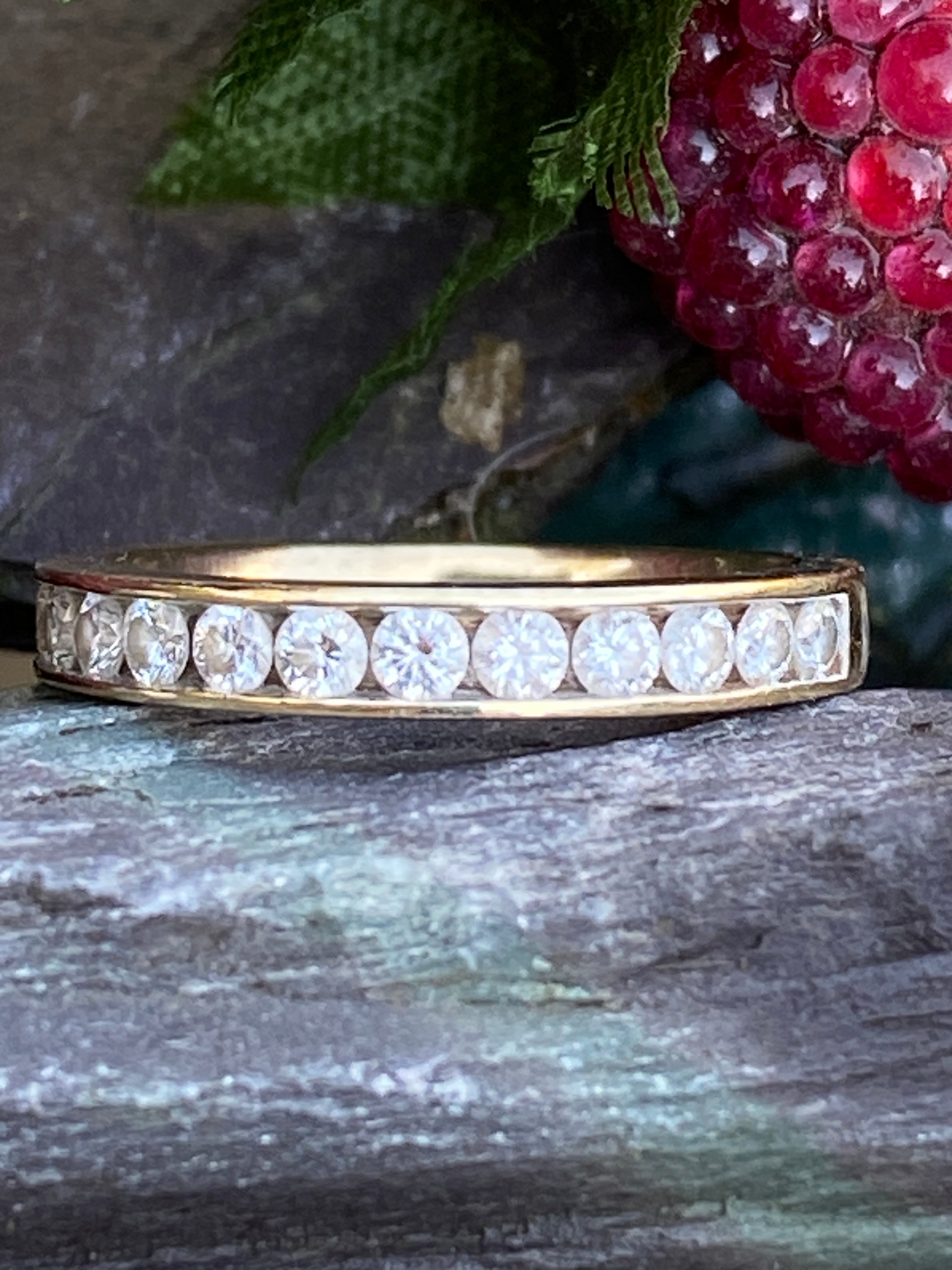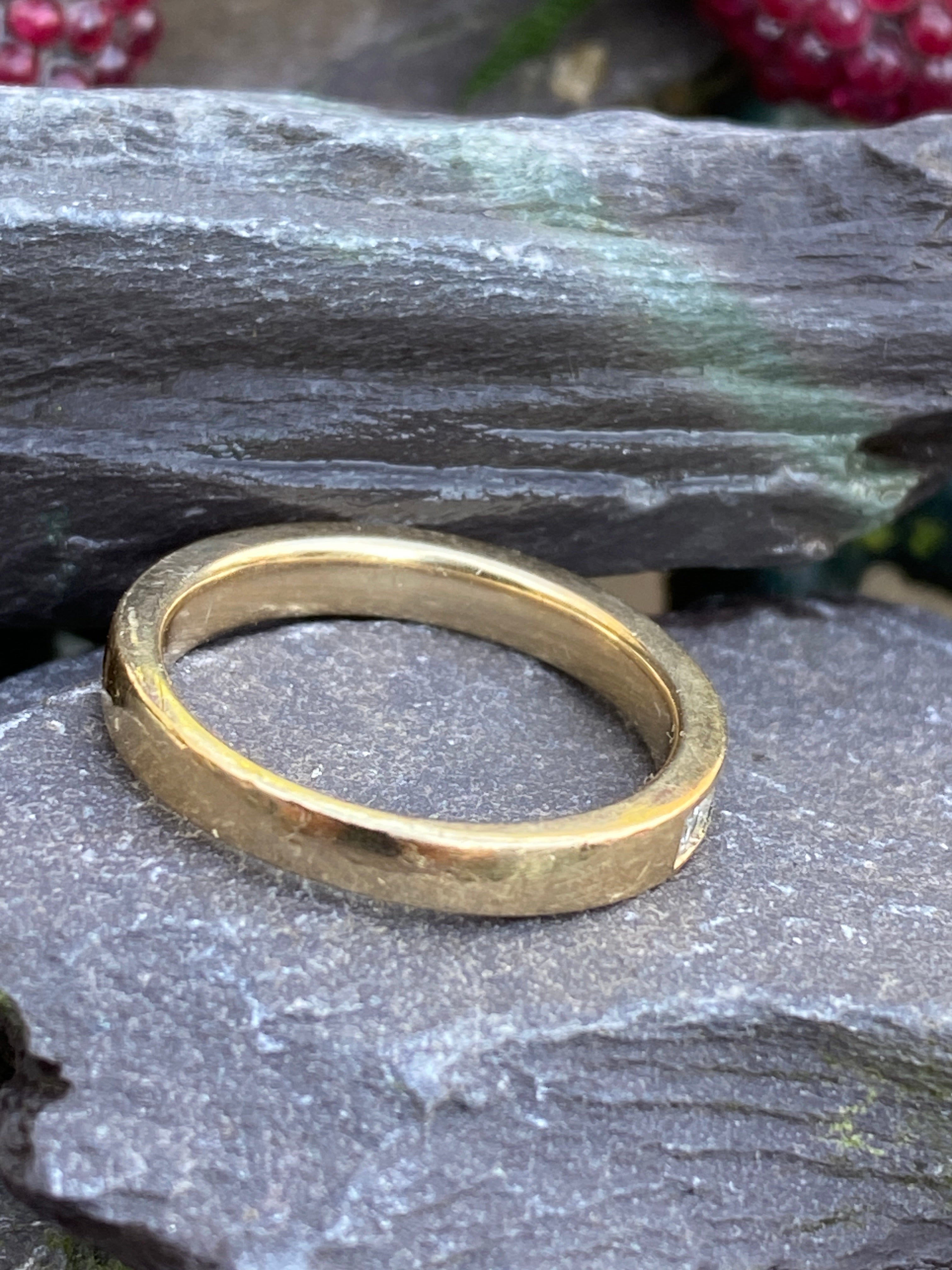 A well made 9ct yellow gold ring set with fifteen round brilliant Diamonds in a channel setting.
