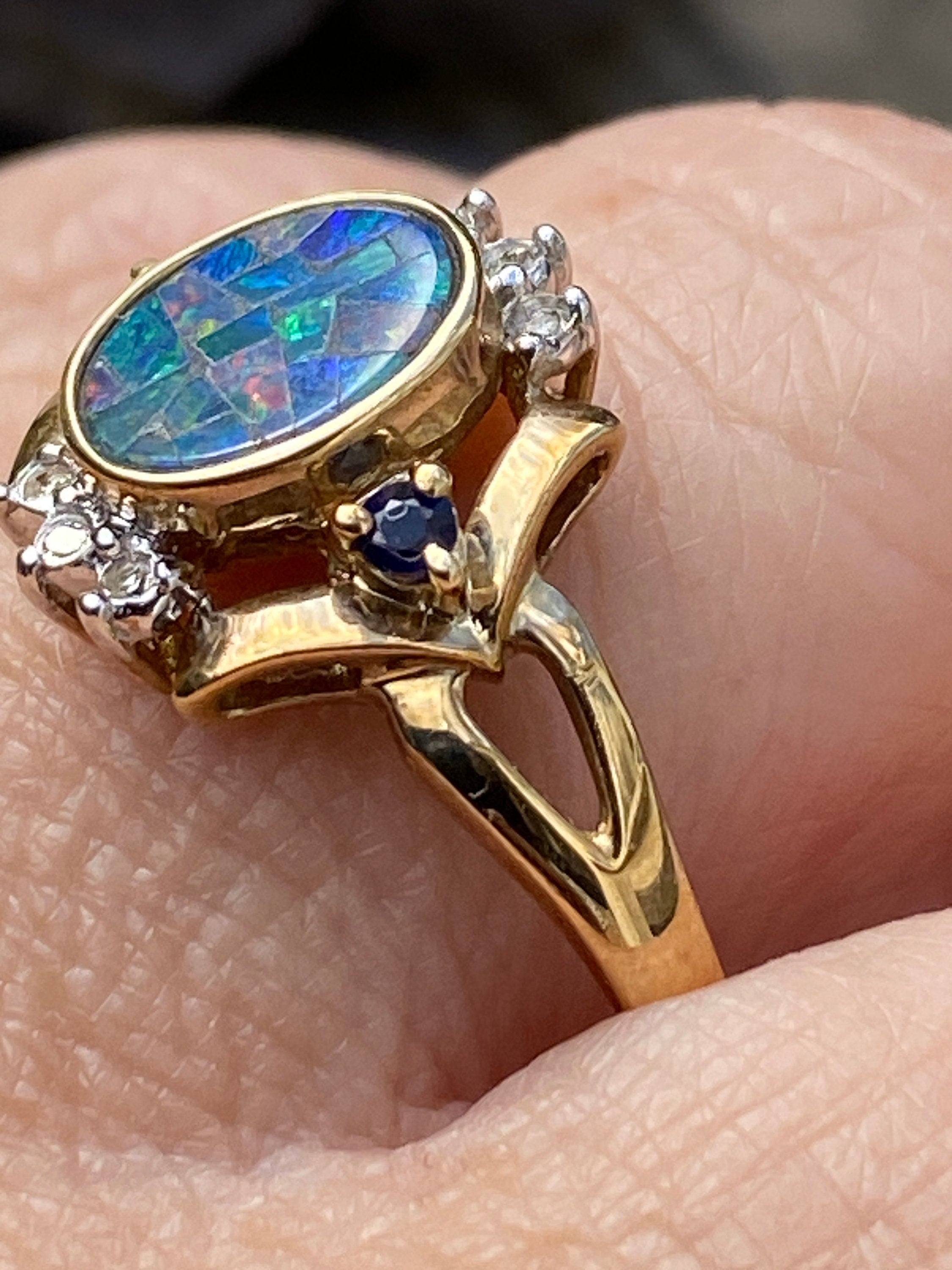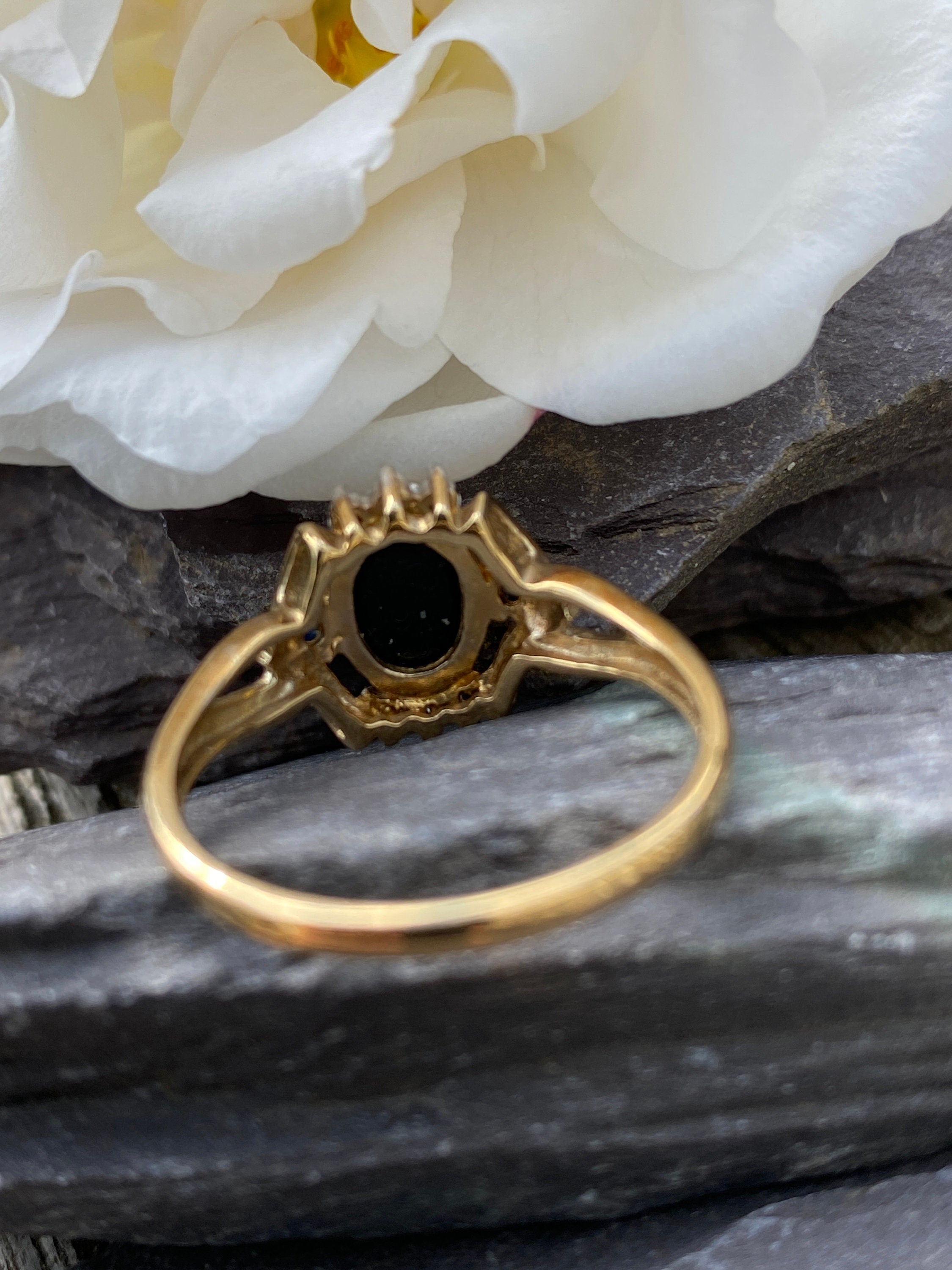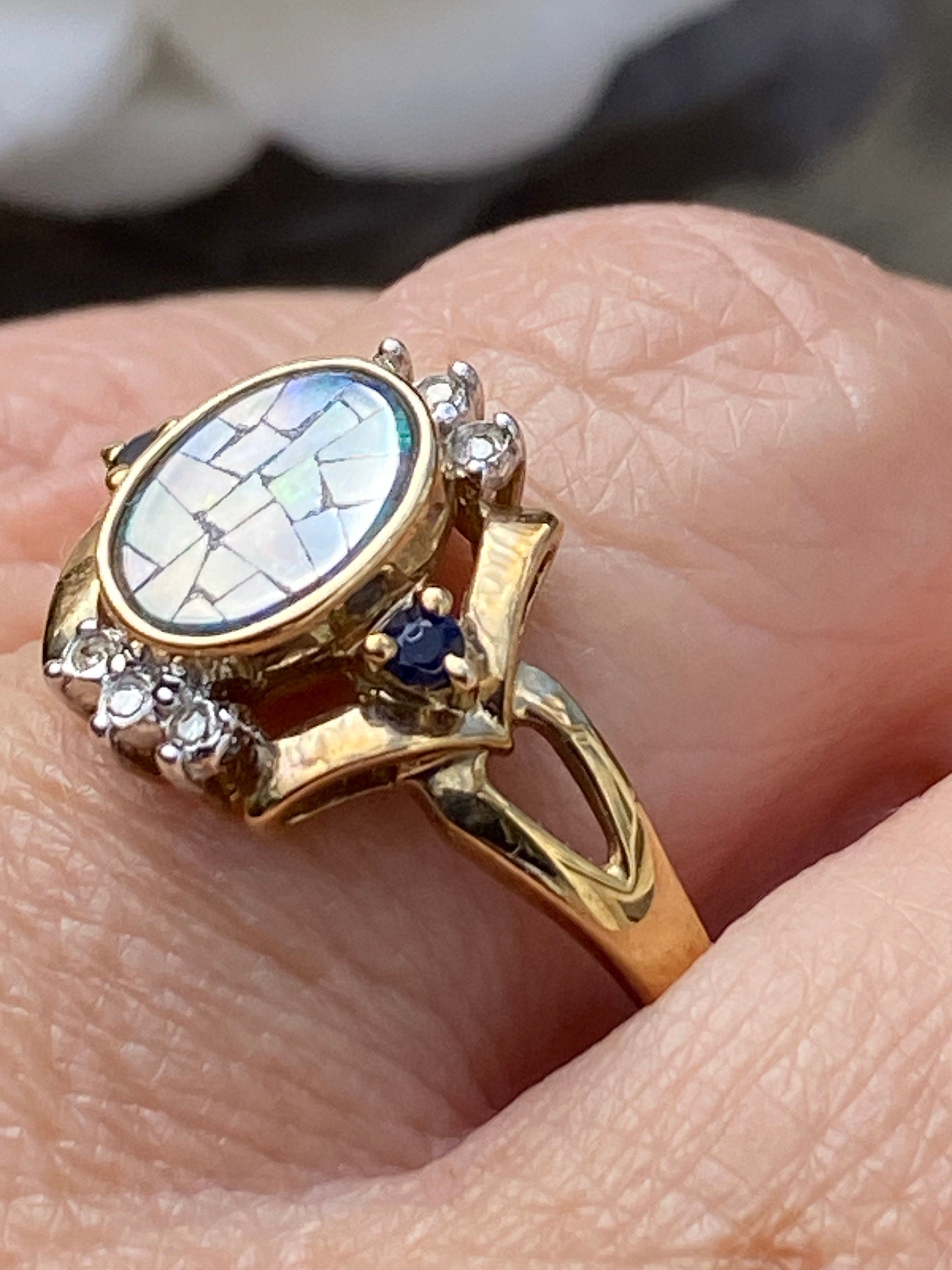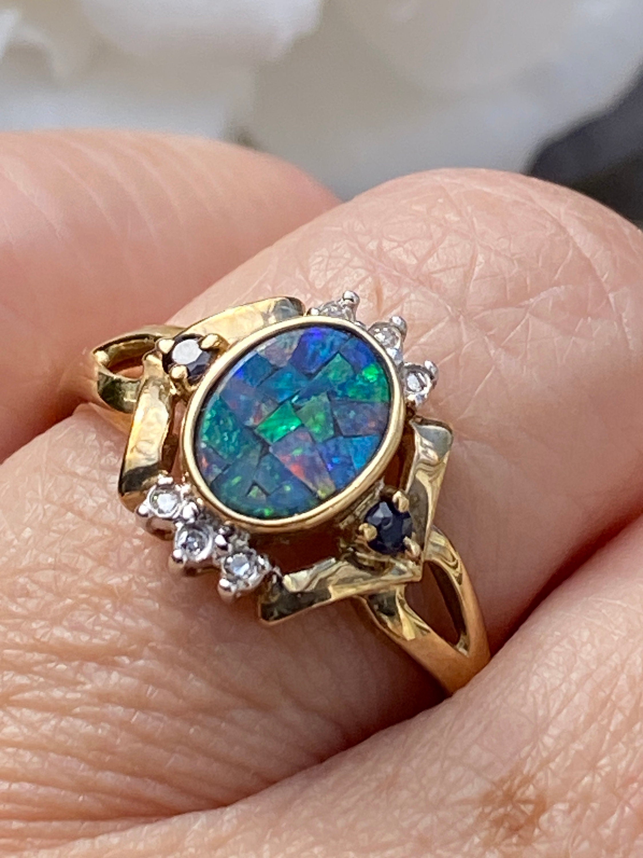 9ct Black Opal Diamond & Sapphire Ring Size R 1/2 or 9 US.