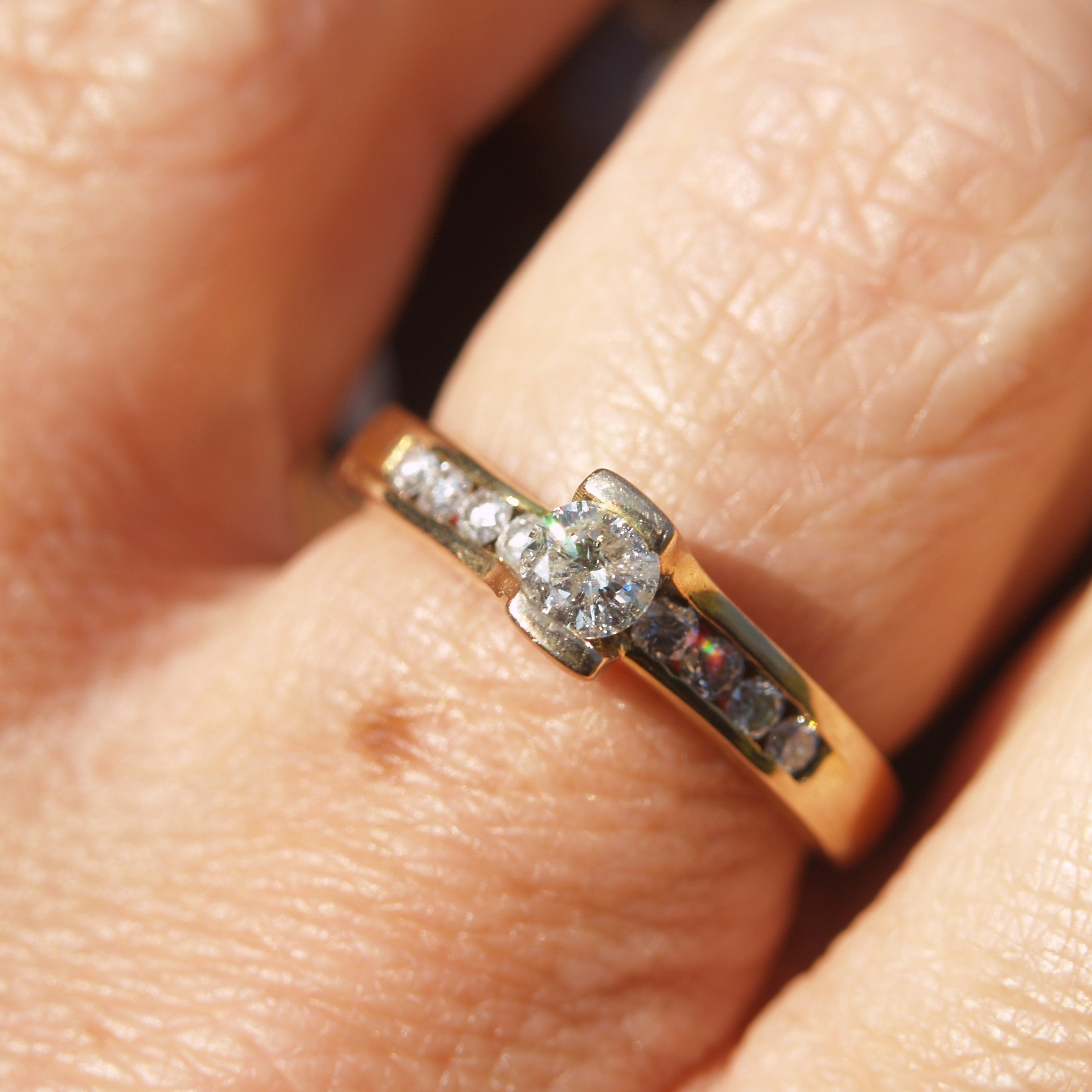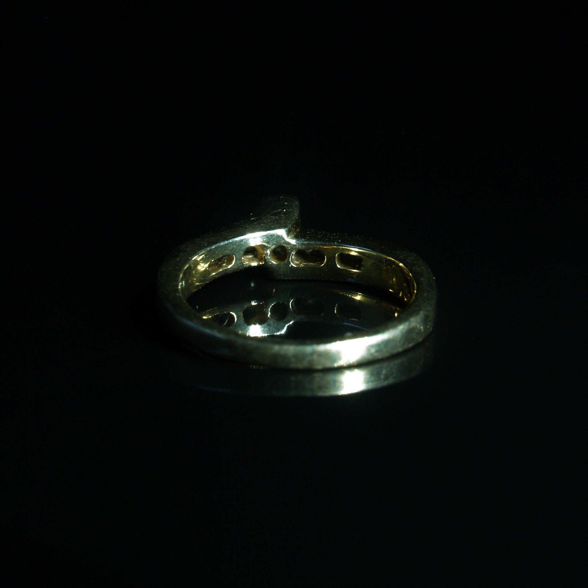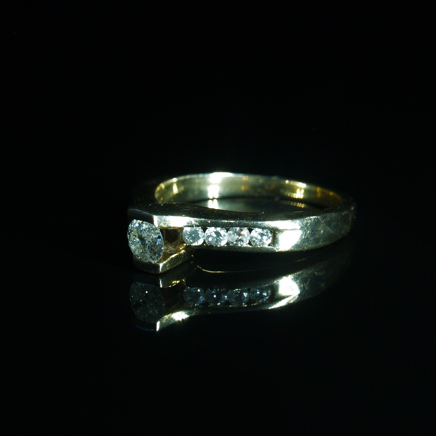 A contemporary twist design to this 9ct yellow gold ring set with a central Diamond of an estimated 0.30cts Flanked by eight diamonds to the shoulders. Weight 4.8tg. Finger size P (uk) or Size 7 1/2 (usa)