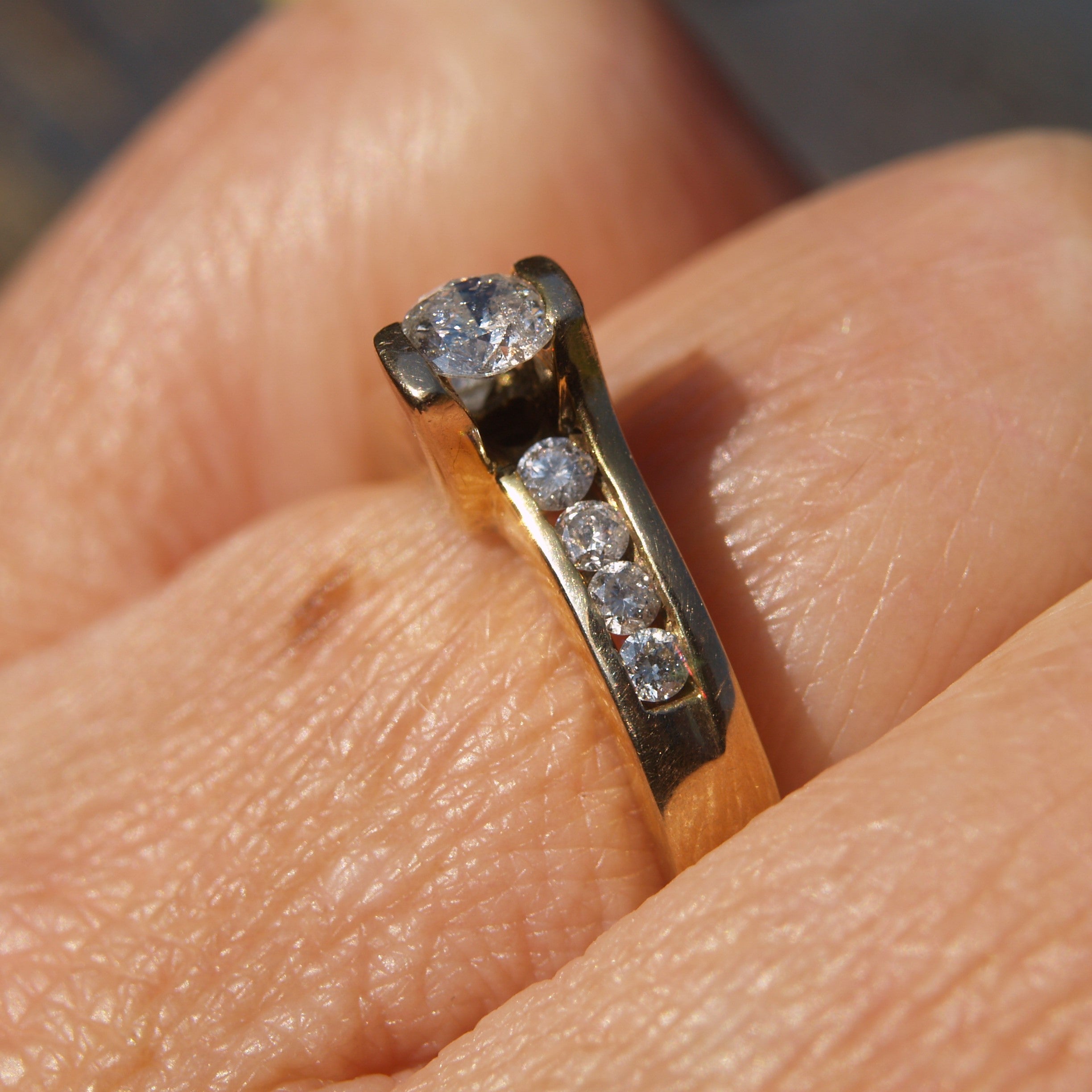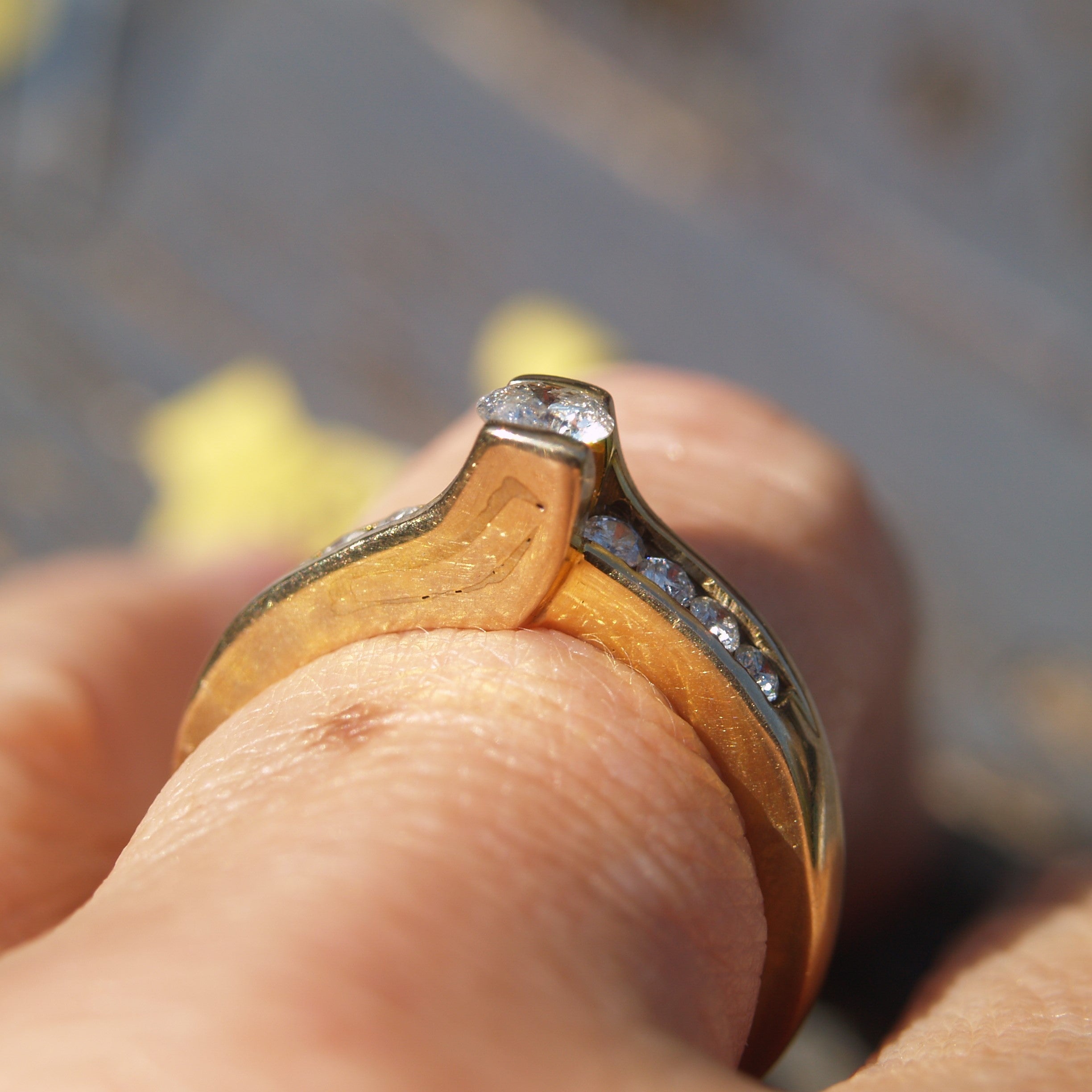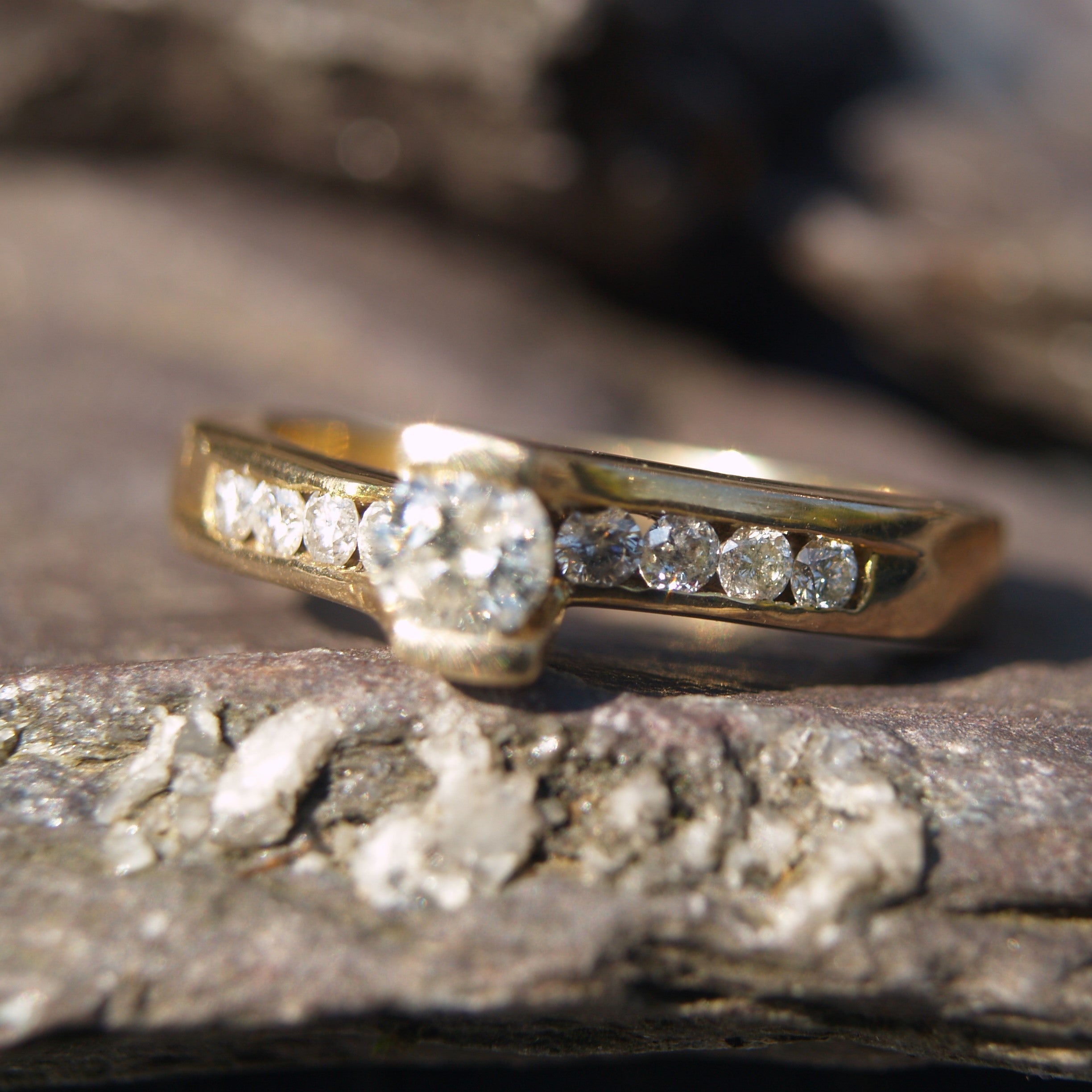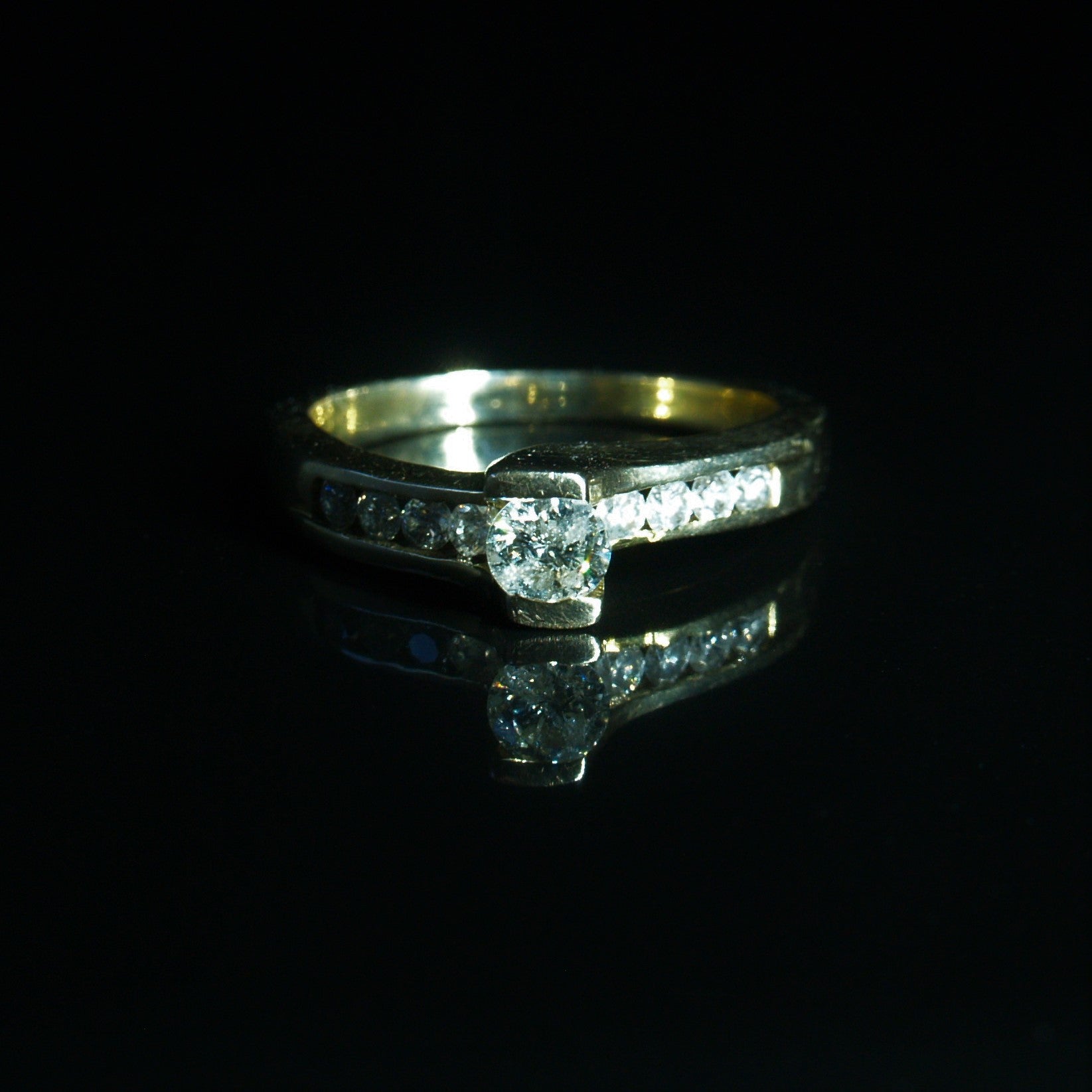 A contemporary twist design to this 9ct yellow gold ring set with a central Diamond of an estimated 0.30cts Flanked by eight diamonds to the shoulders. Weight 4.8tg. Finger size P (uk) or Size 7 1/2 (usa)