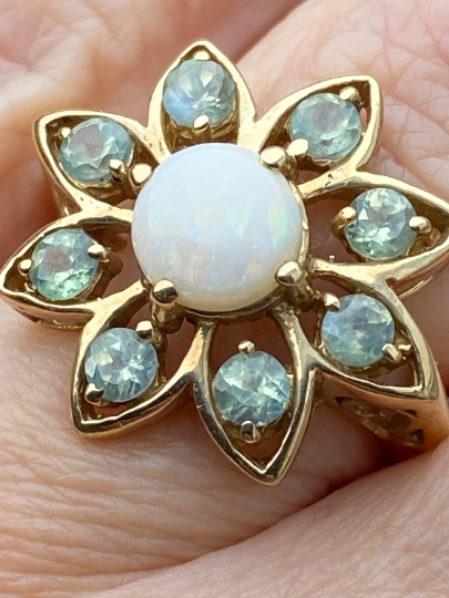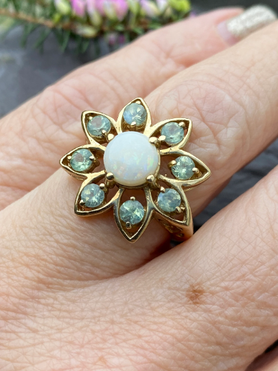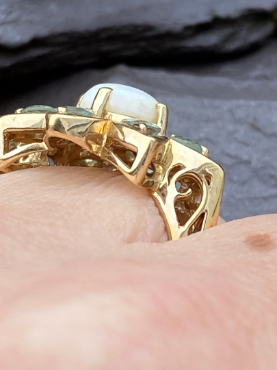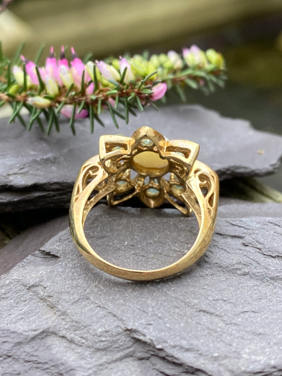 A large statement ring in 9ct yellow gold set with a white Opal surrounded by pale green Prasiolite Quartz.