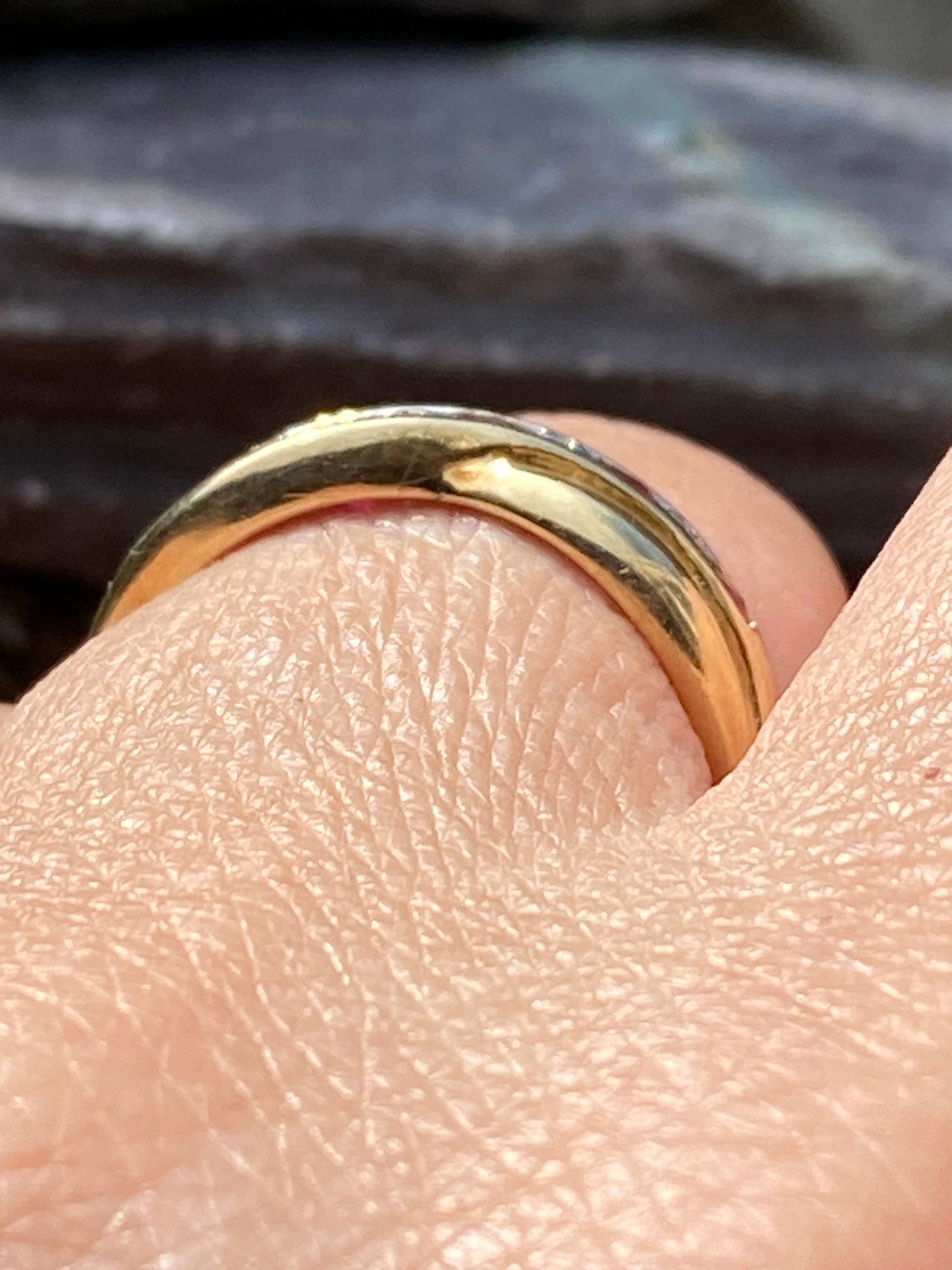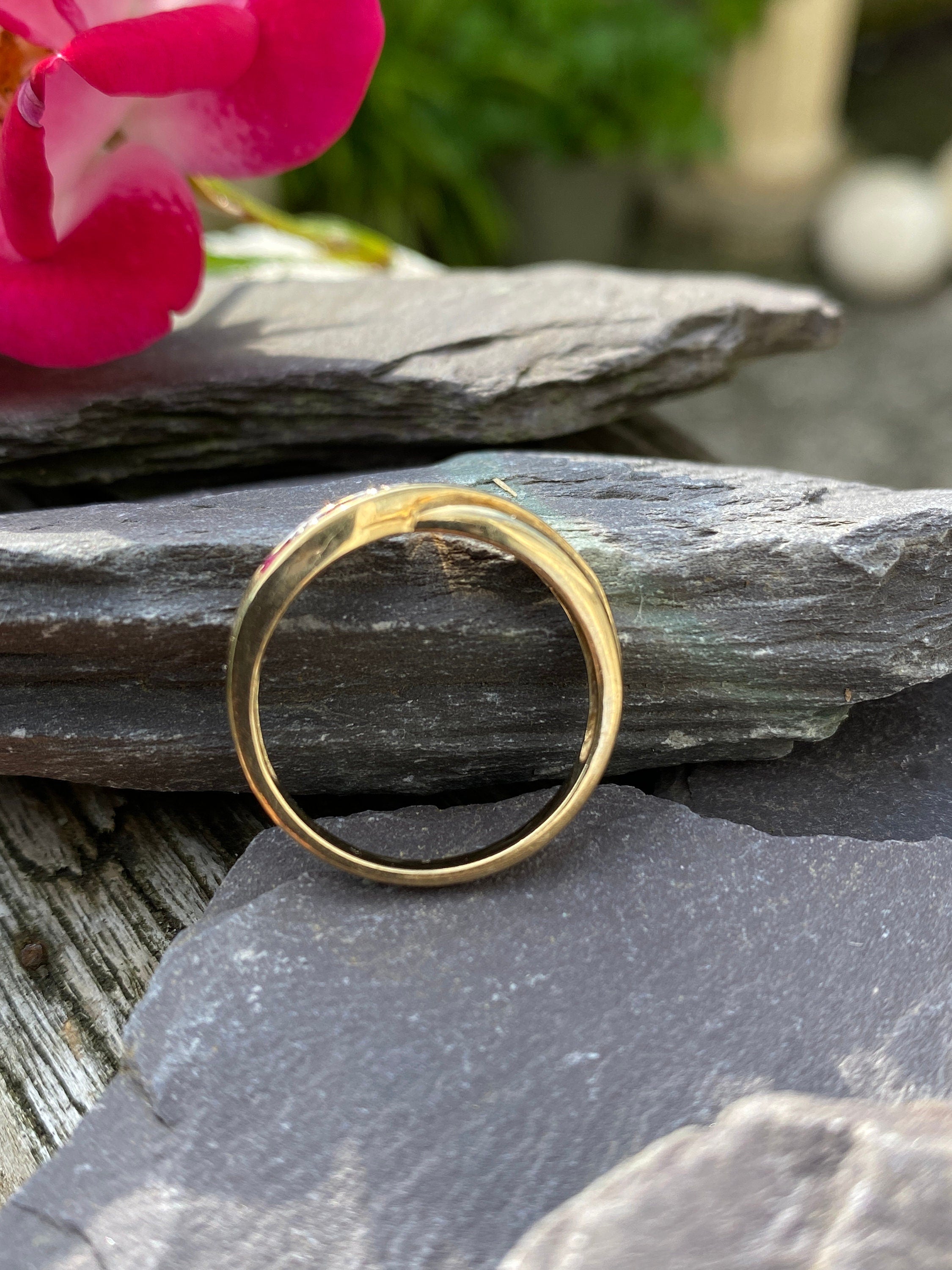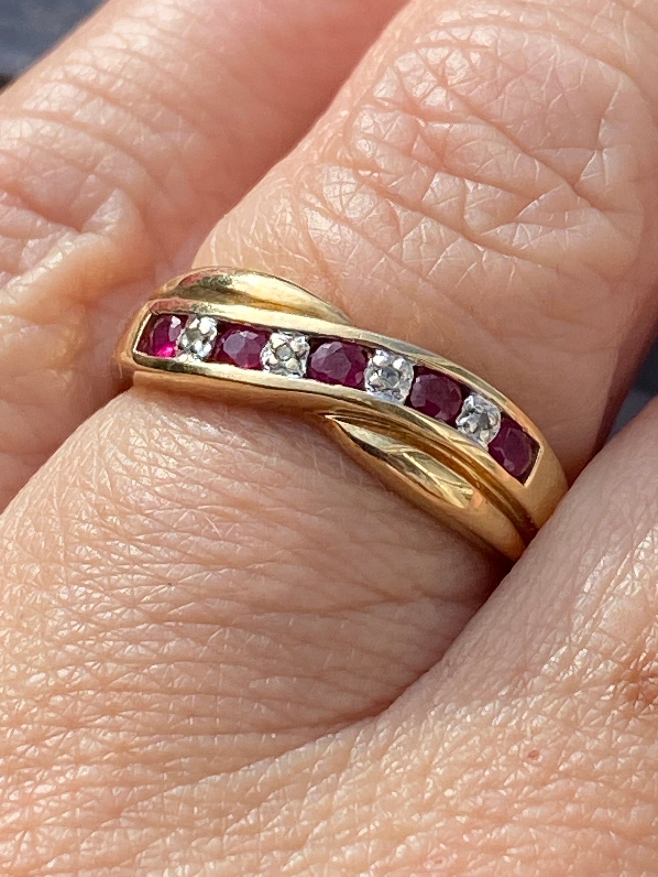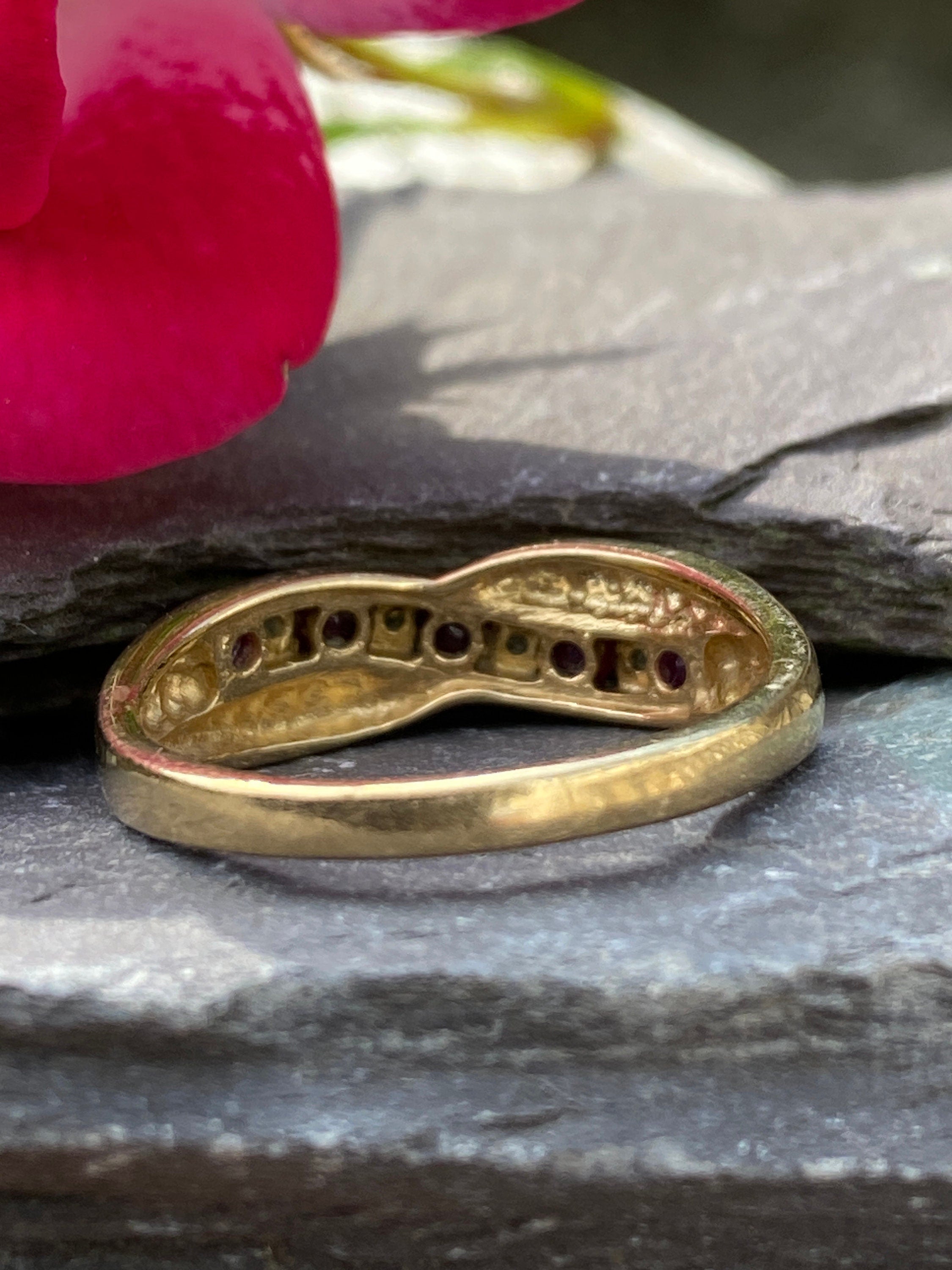 A very smart 9ct yellow gold half hoop eternity ring set with round brilliant Ruby and Diamonds.