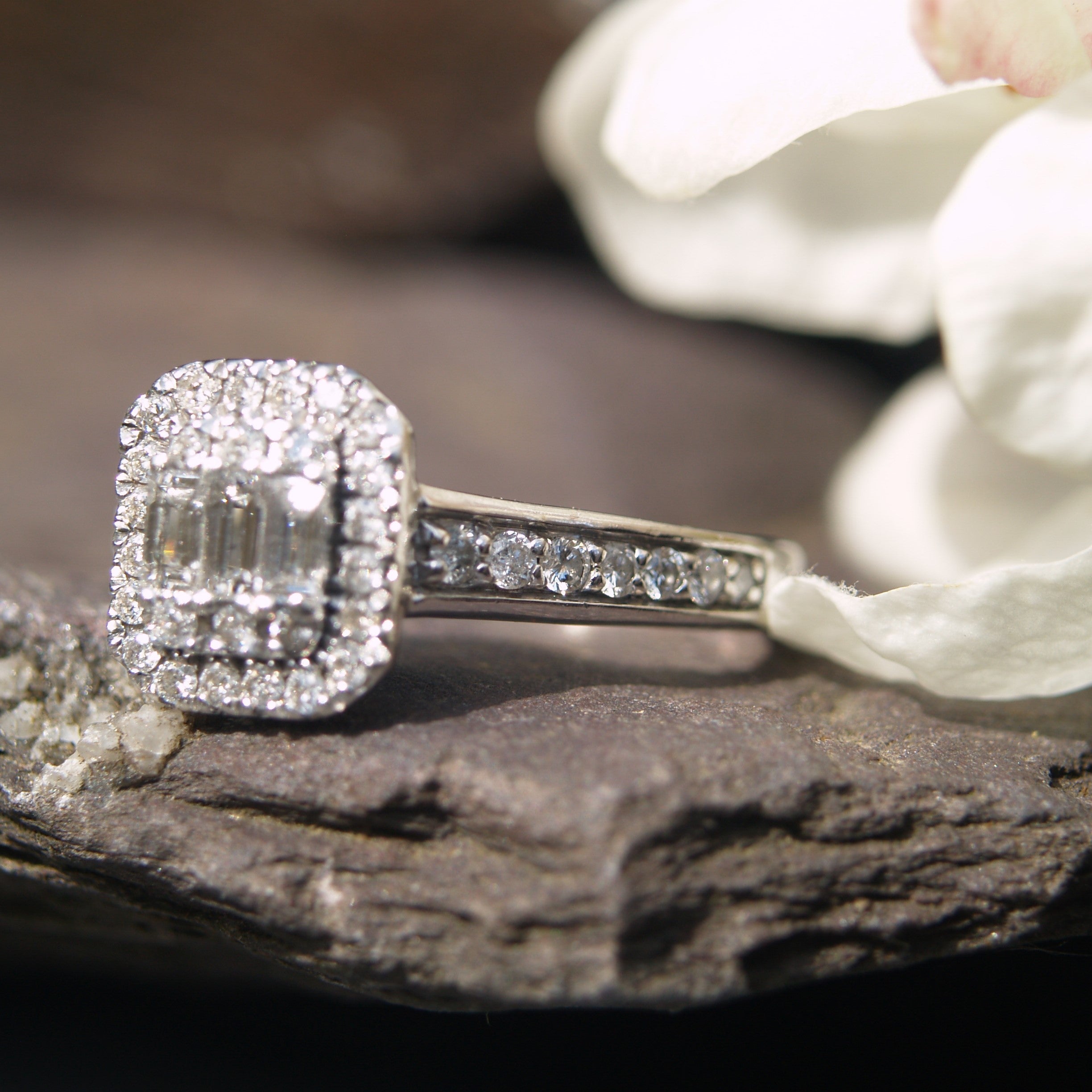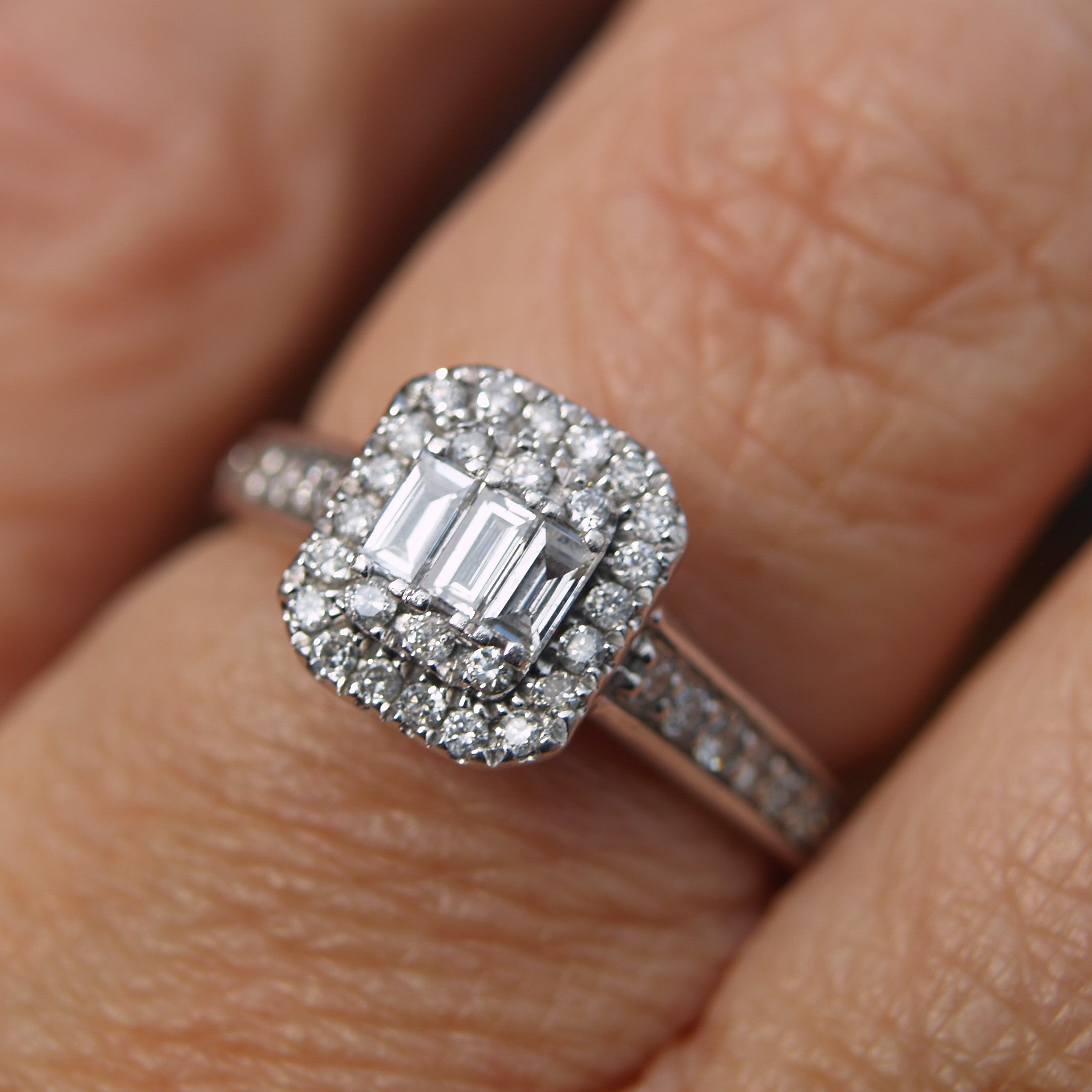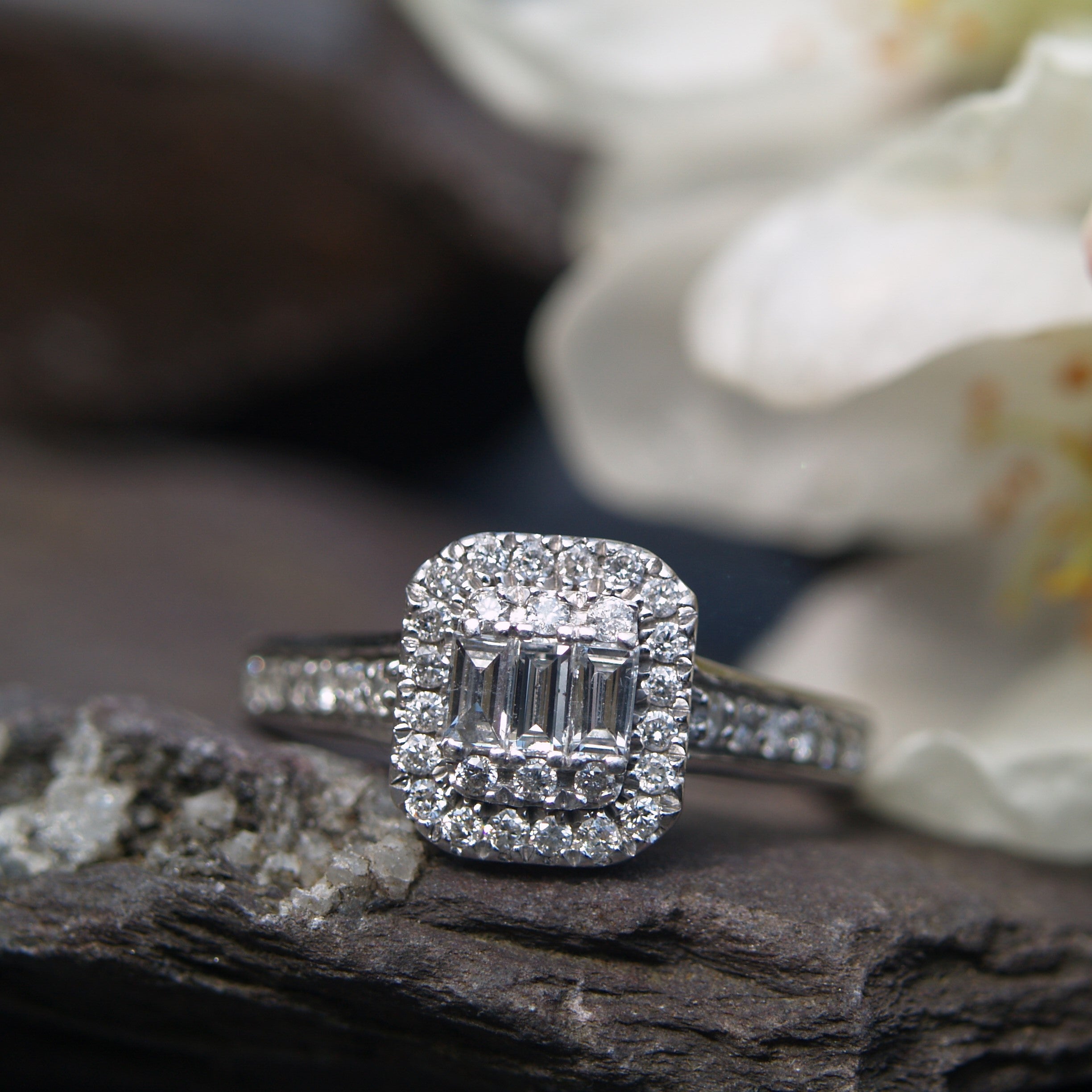 A 9ct white gold diamond ring designed to sit over a wedding band. Three baguette diamonds surrounded by a halo of round brilliant diamonds with diamond set shoulders to finish off the look.