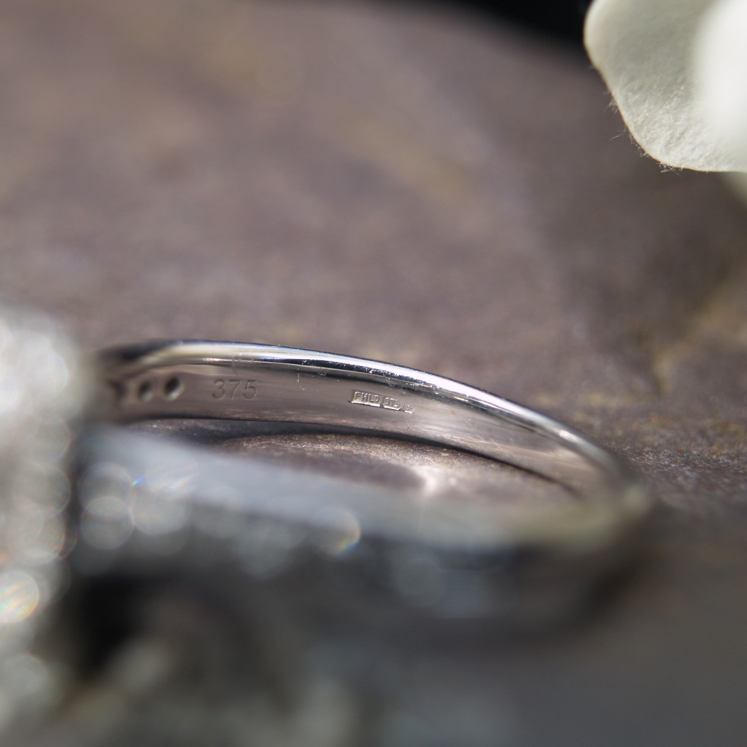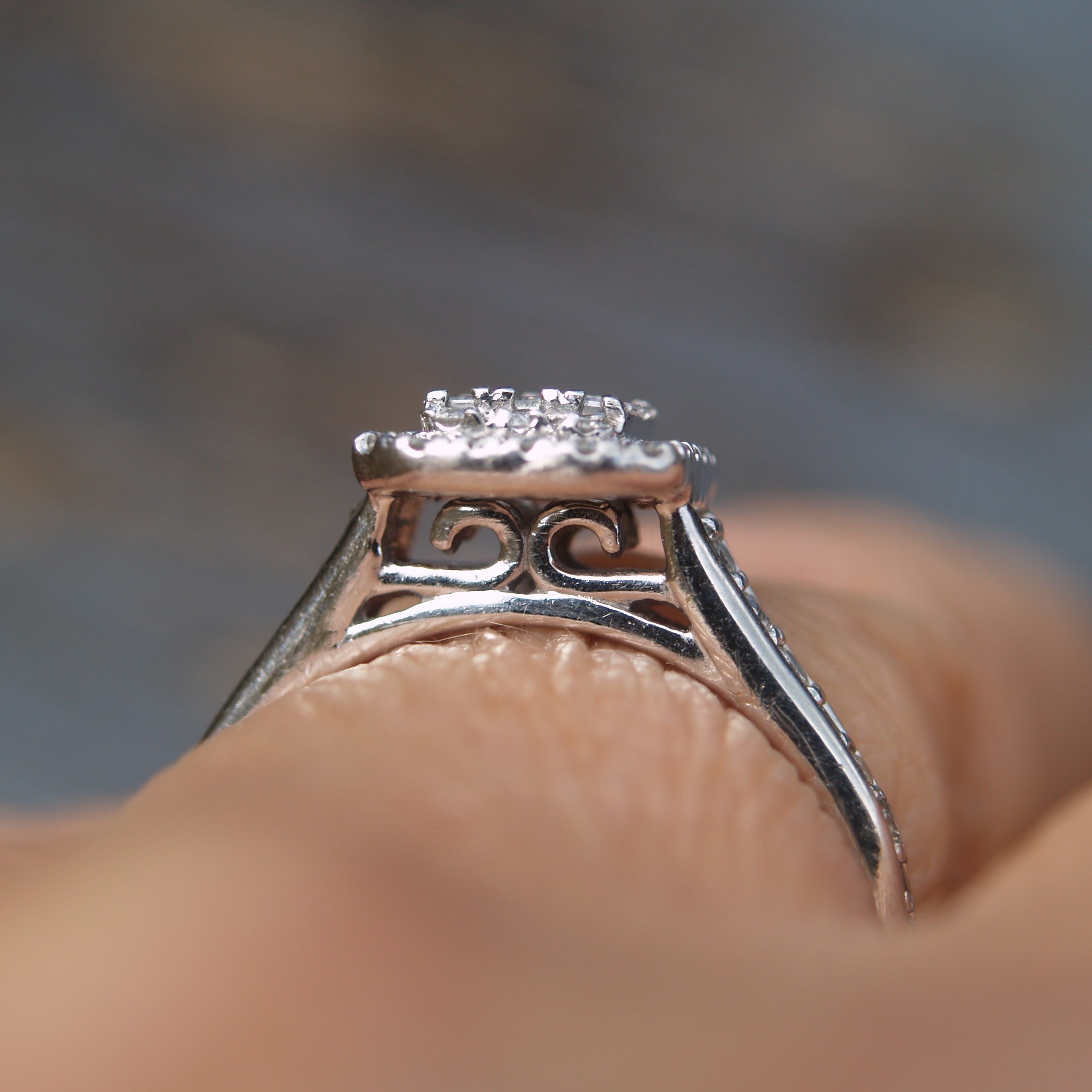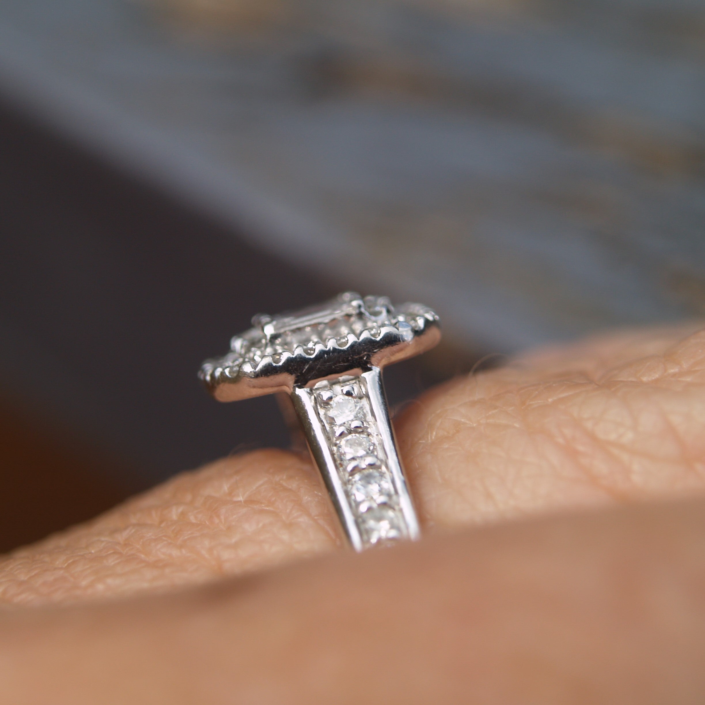 A 9ct white gold diamond ring designed to sit over a wedding band. Three baguette diamonds surrounded by a halo of round brilliant diamonds with diamond set shoulders to finish off the look.