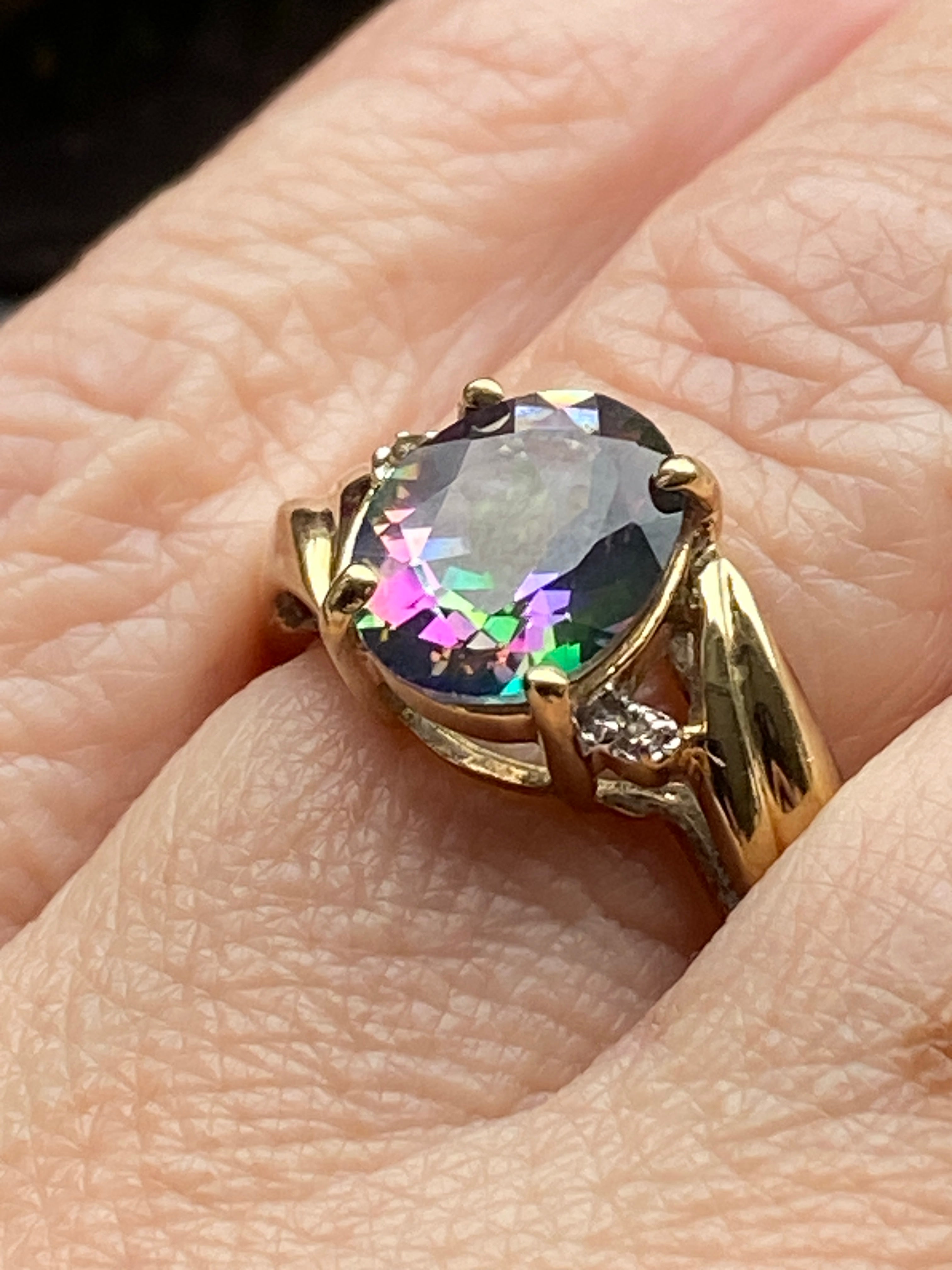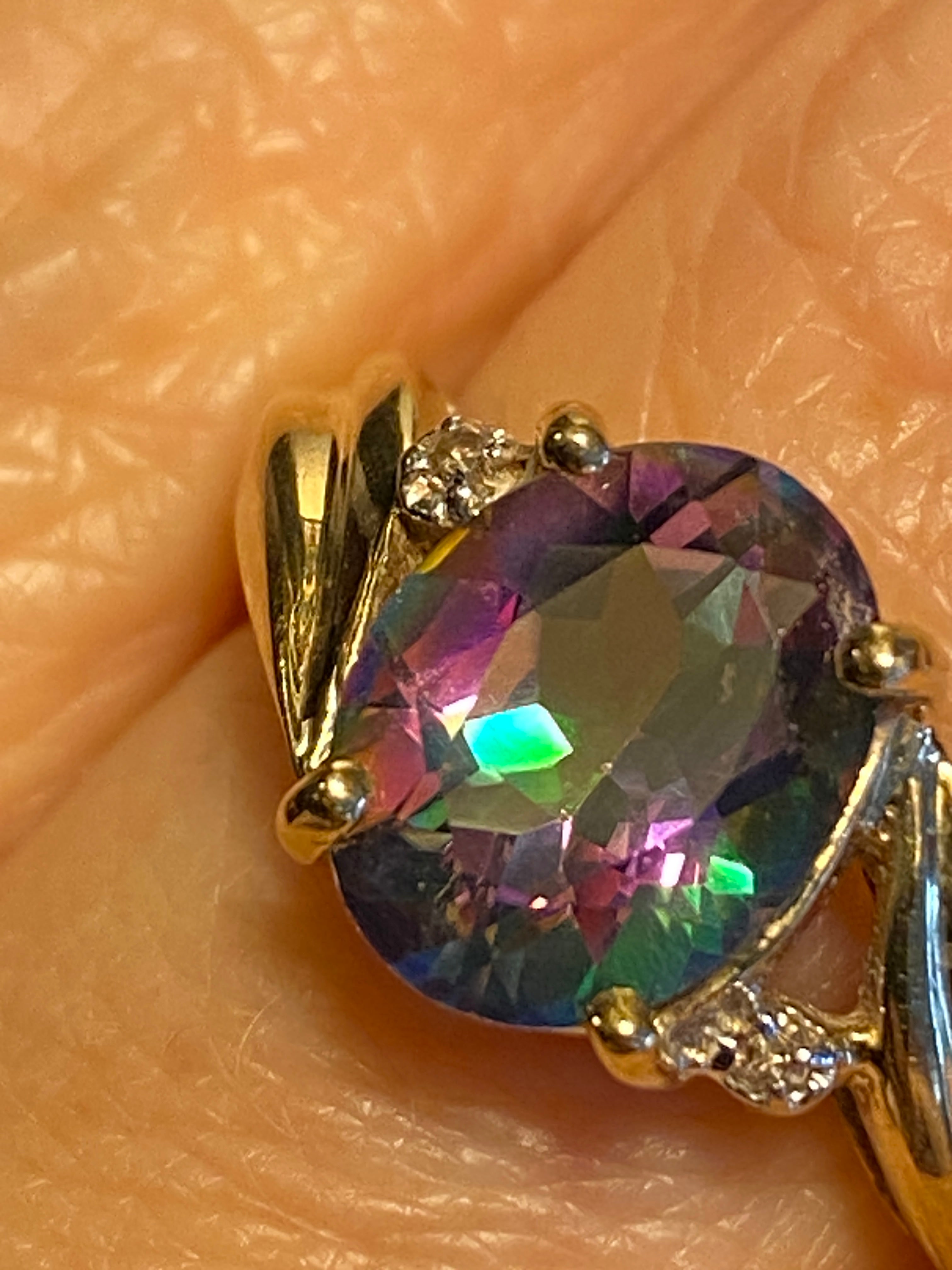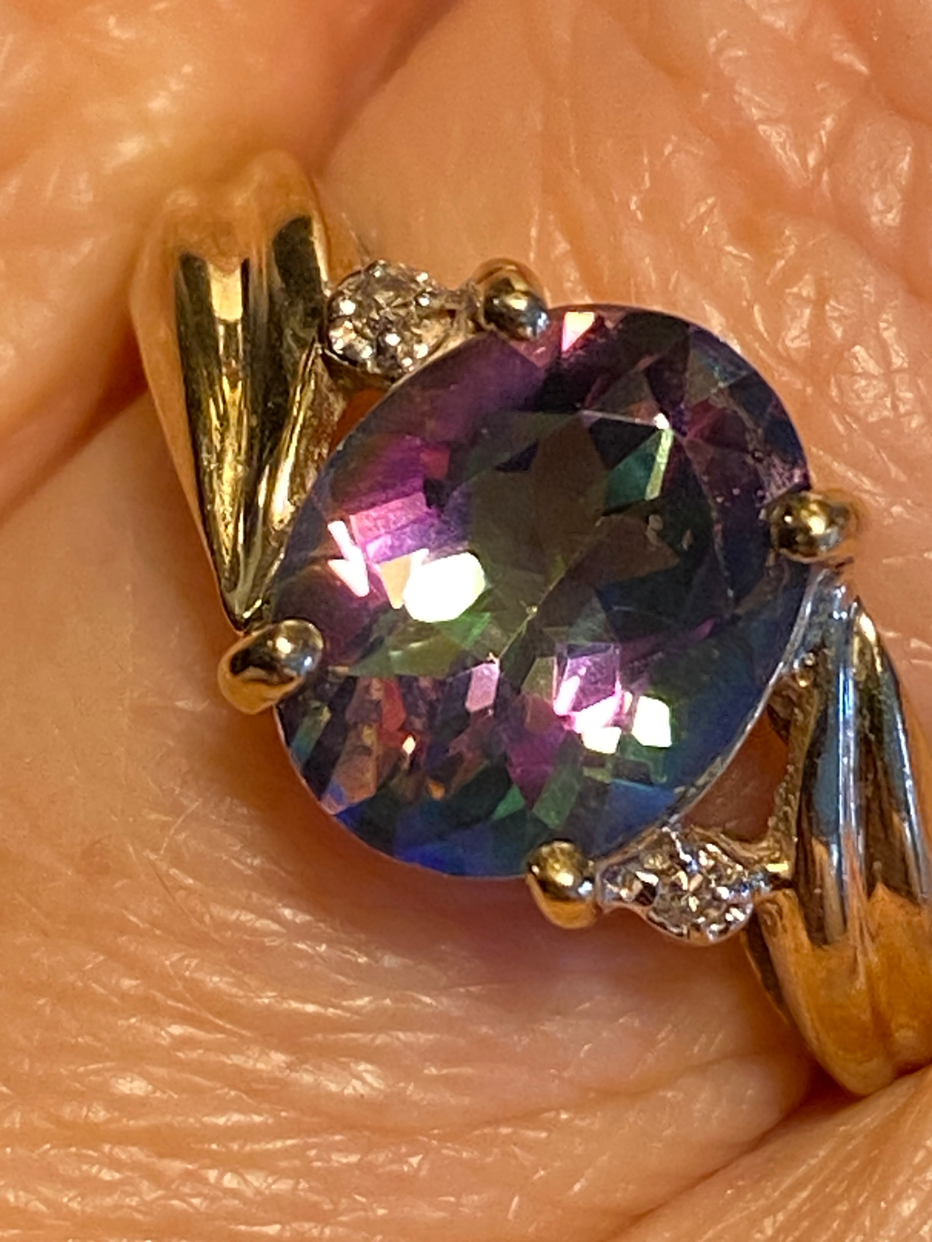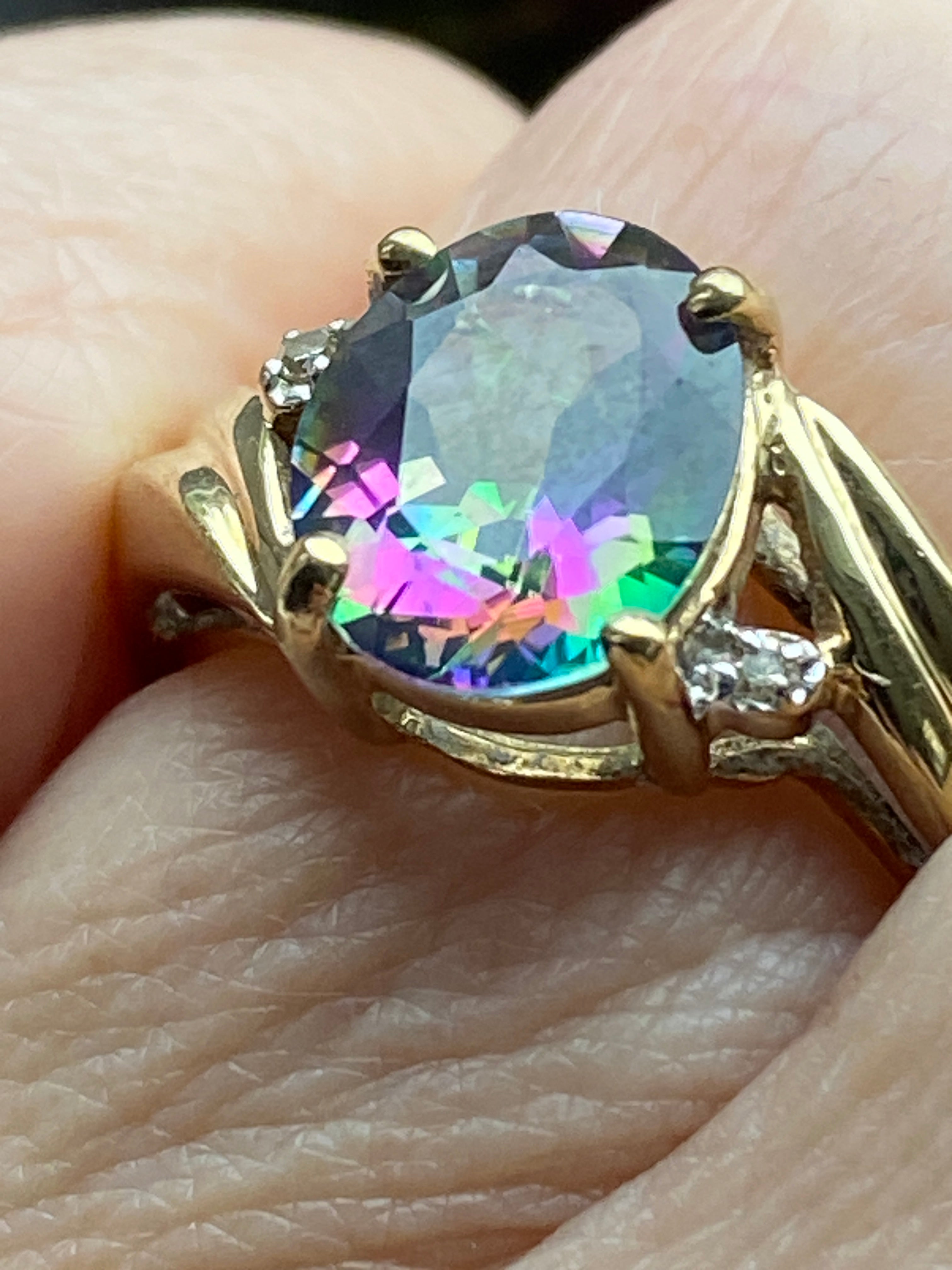 A multi coloured Mystic Topaz set in 9ct yellow gold with two small Diamond accentsFull hallmarks for 9ct gold. BirminghamFinger size N 1/2 or 7 USIn excellent conditionWill...