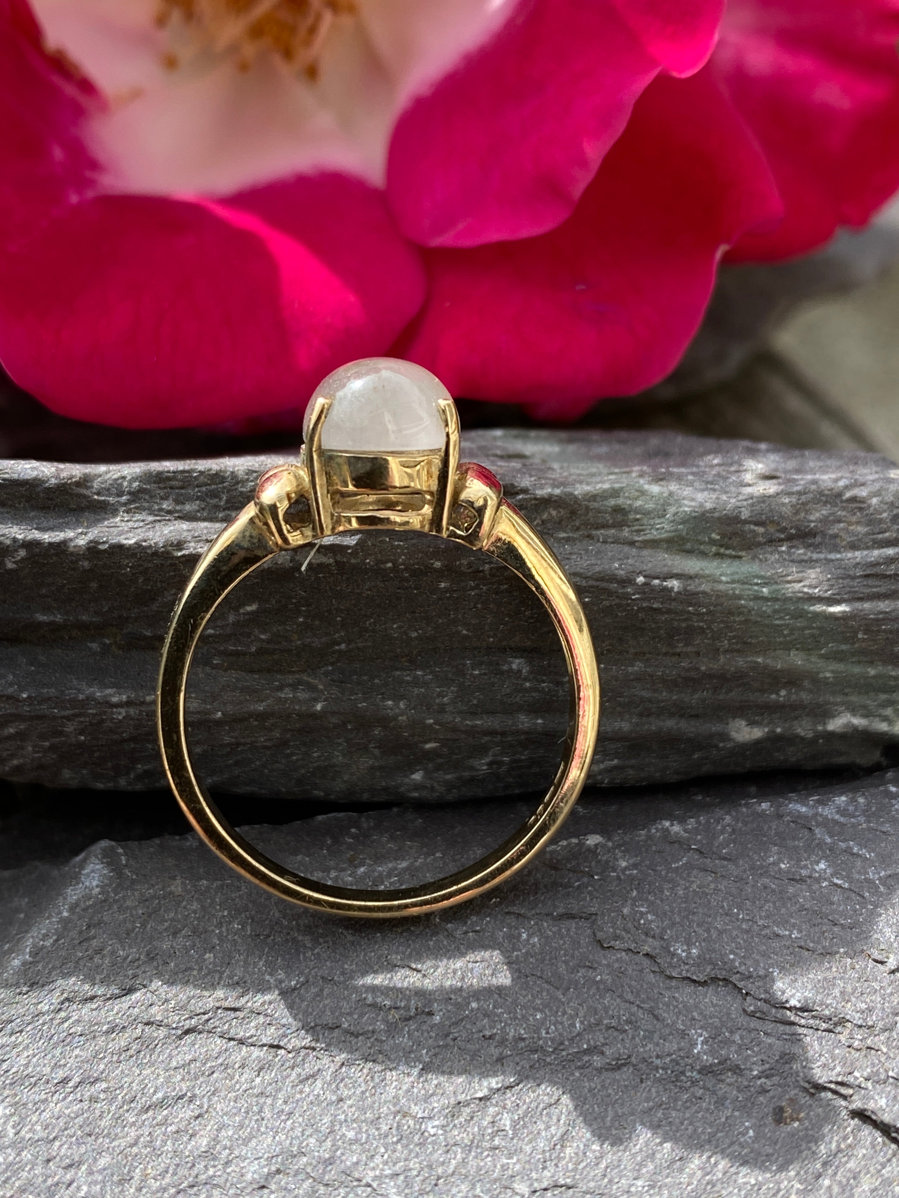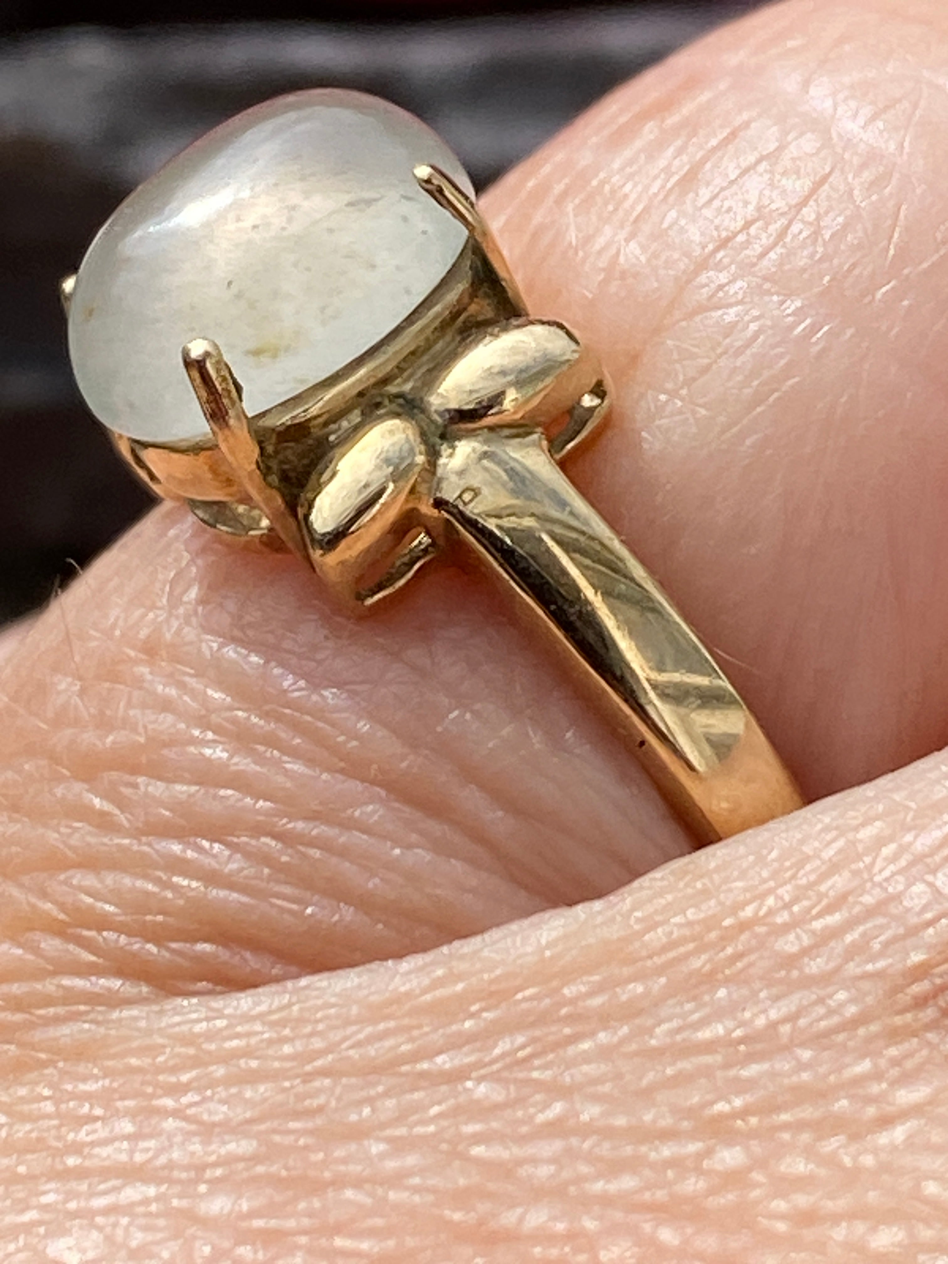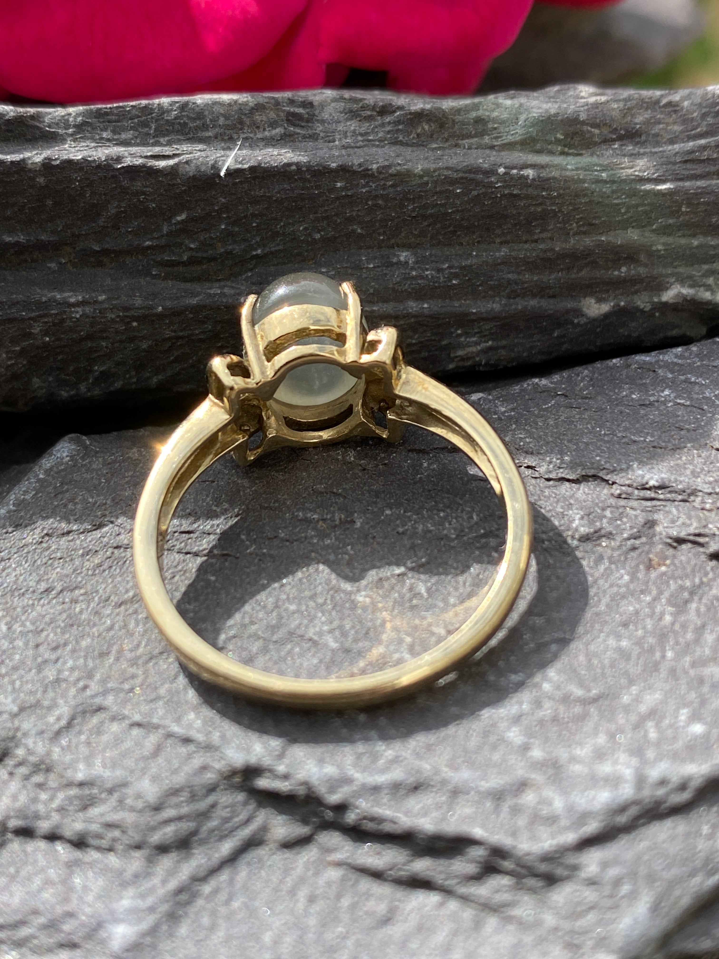 A well made 9ct yellow gold ring set with a cabochon cut polished Moonstone