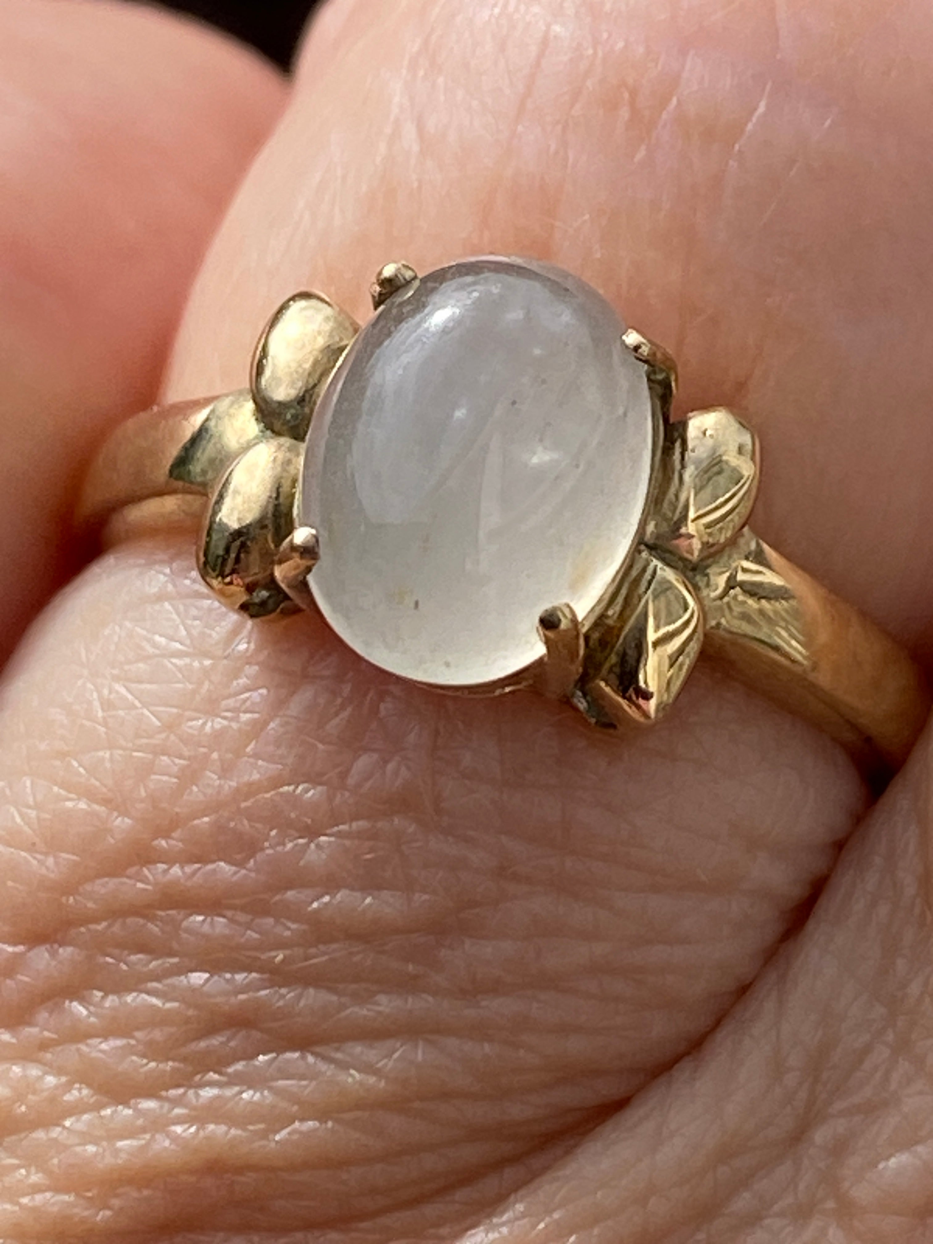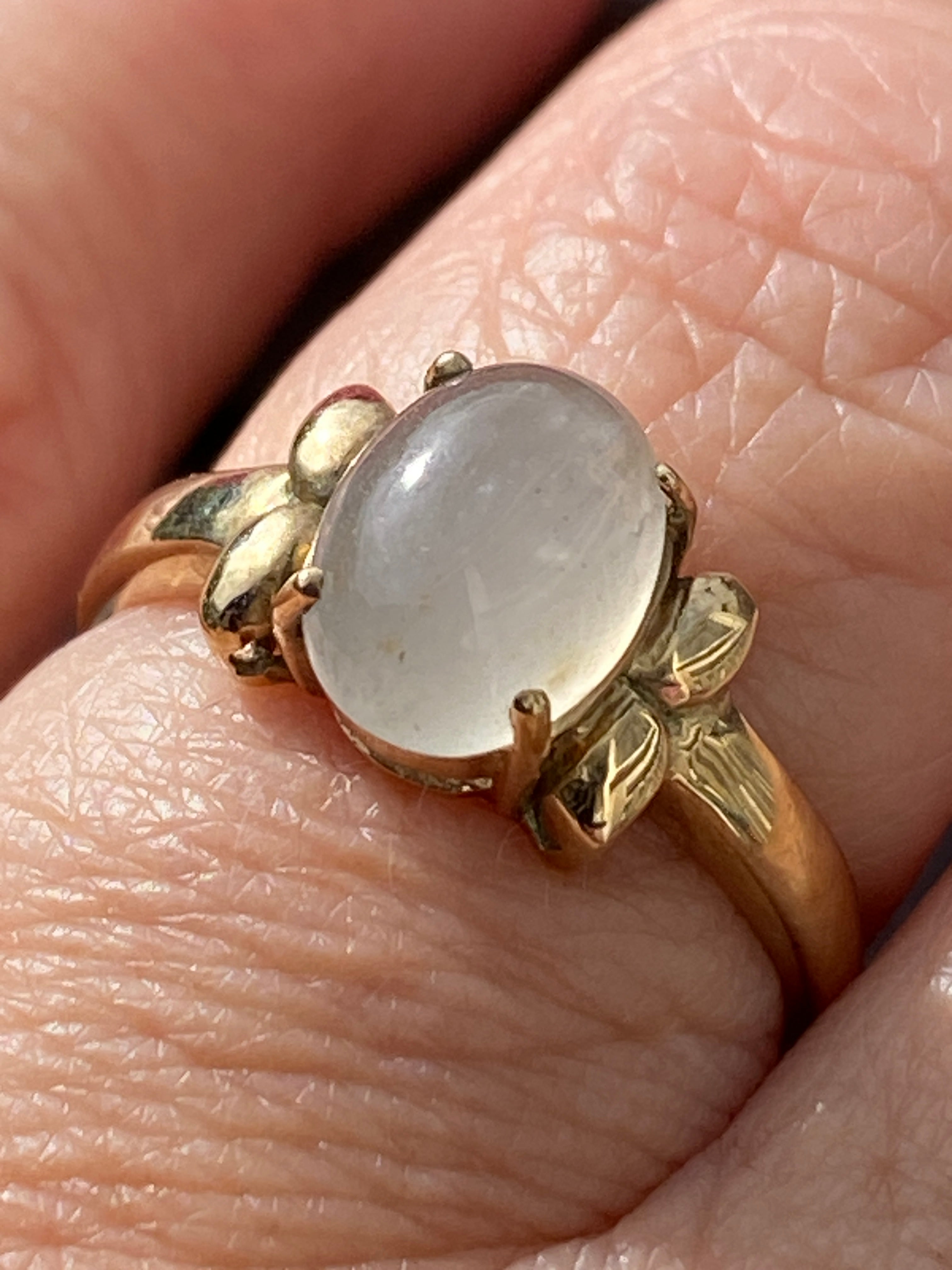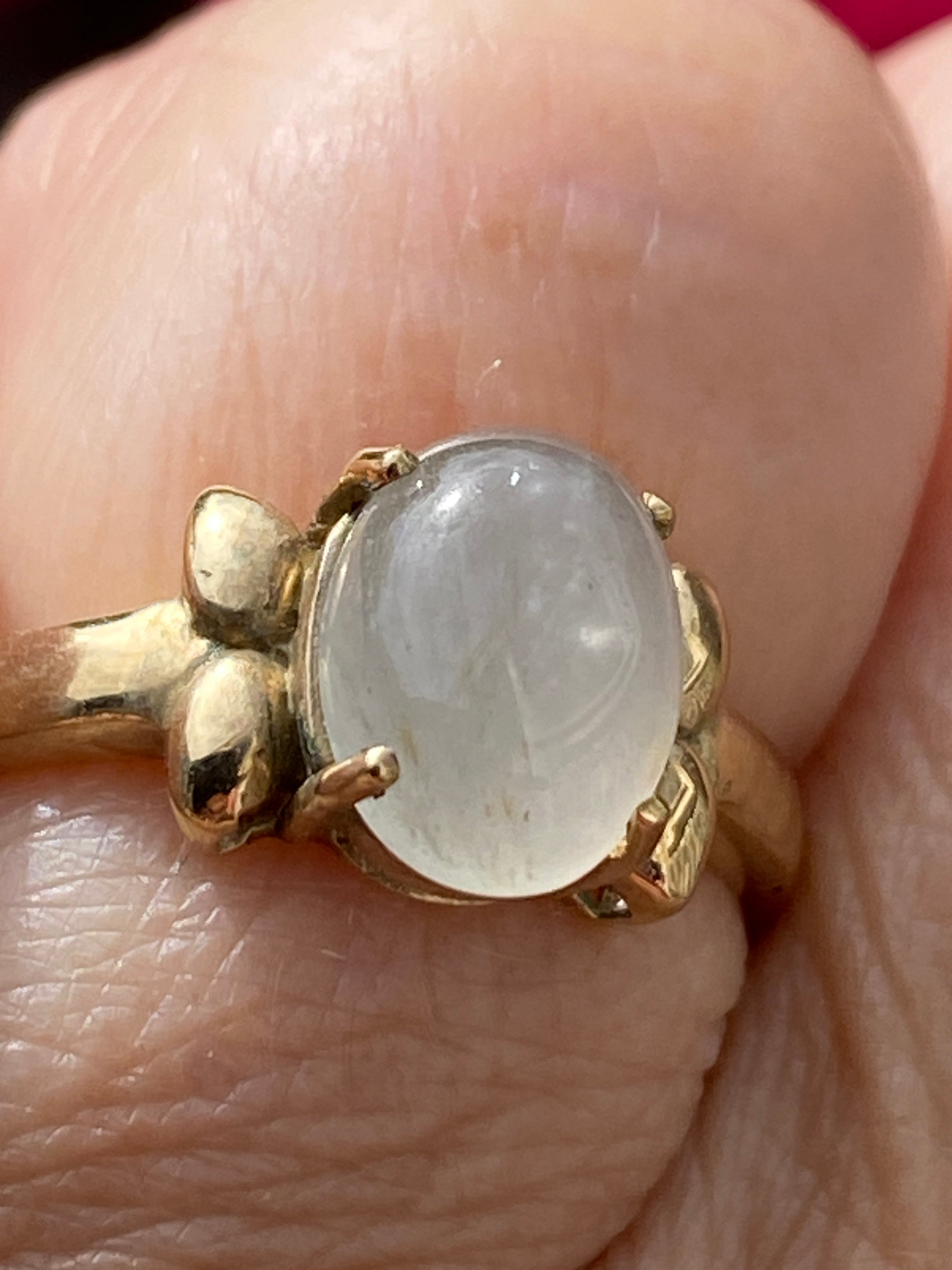 A well made 9ct yellow gold ring set with a cabochon cut polished Moonstone