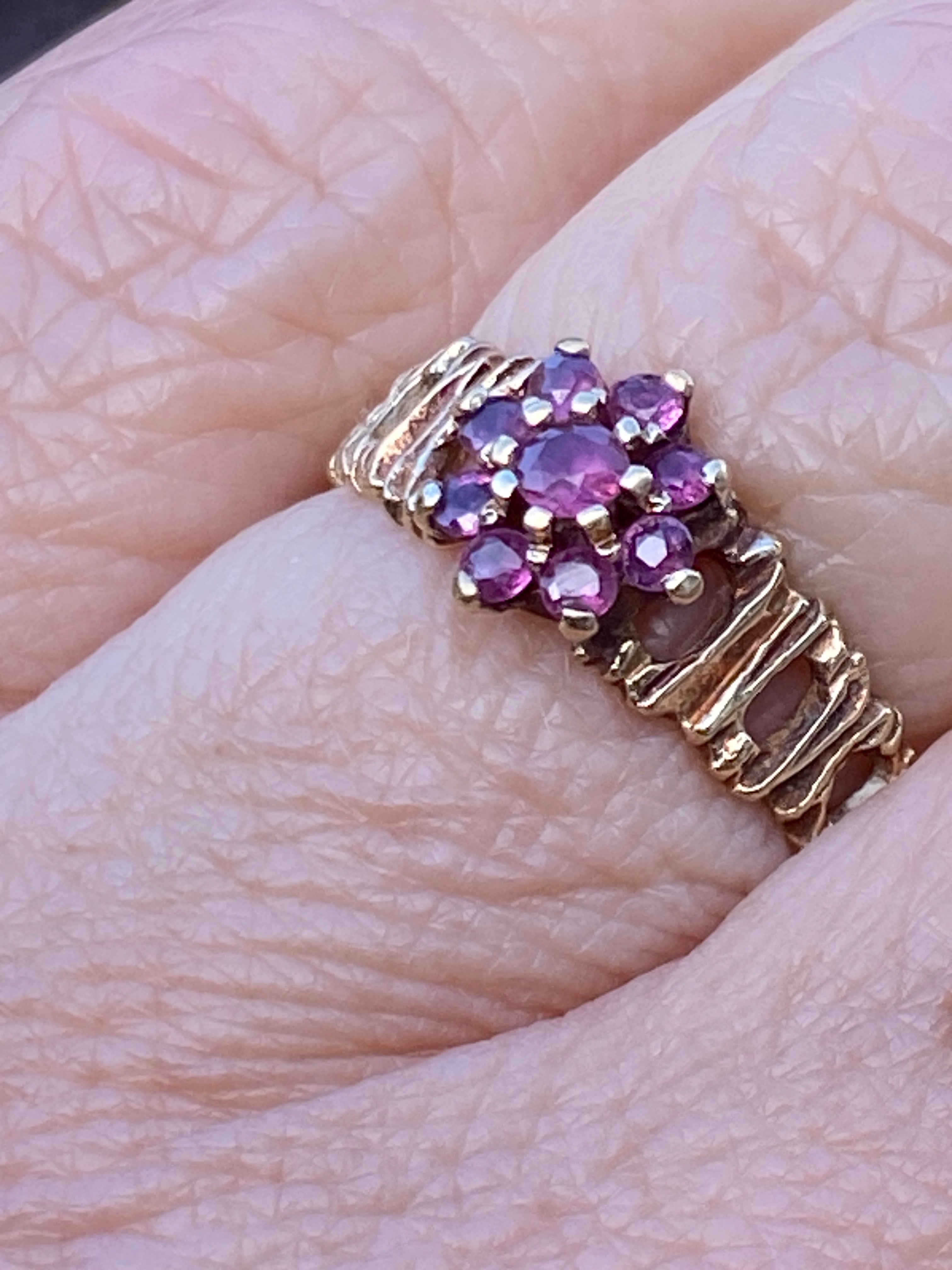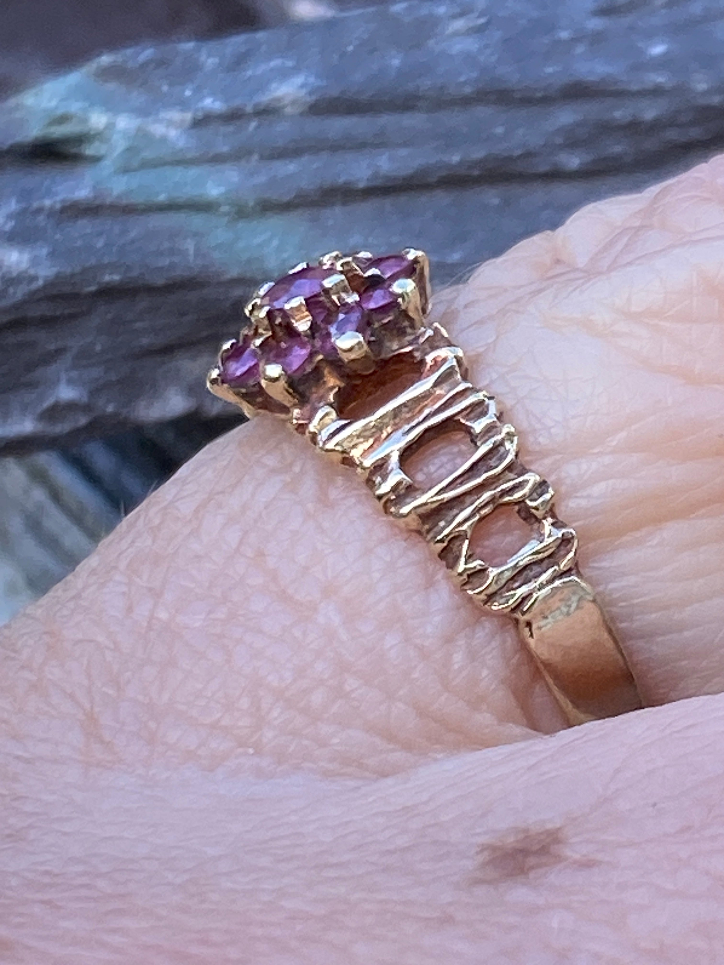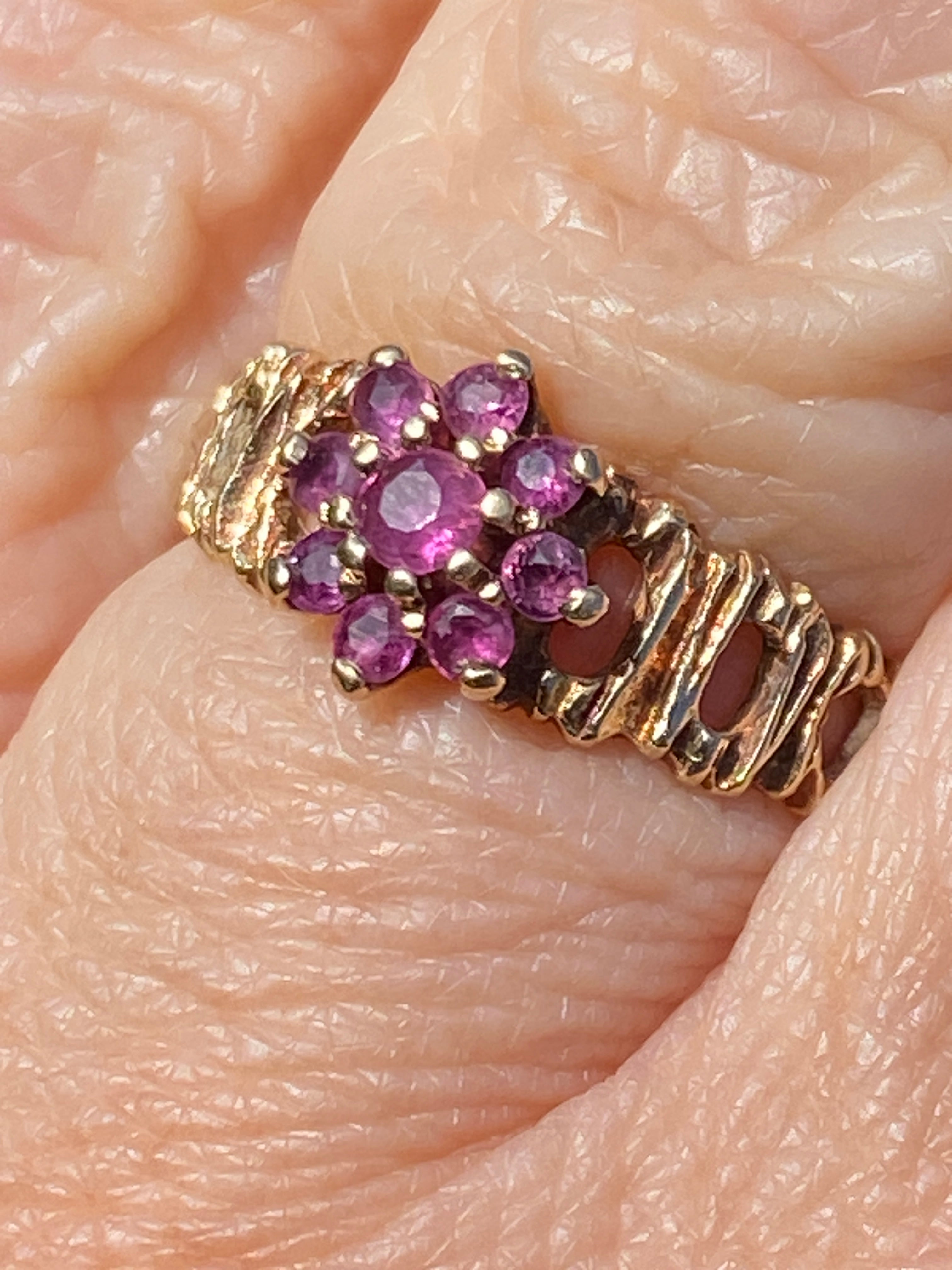 A pretty vintage 9ct gold ring set with a cluster of Rubies on a bark effect shank