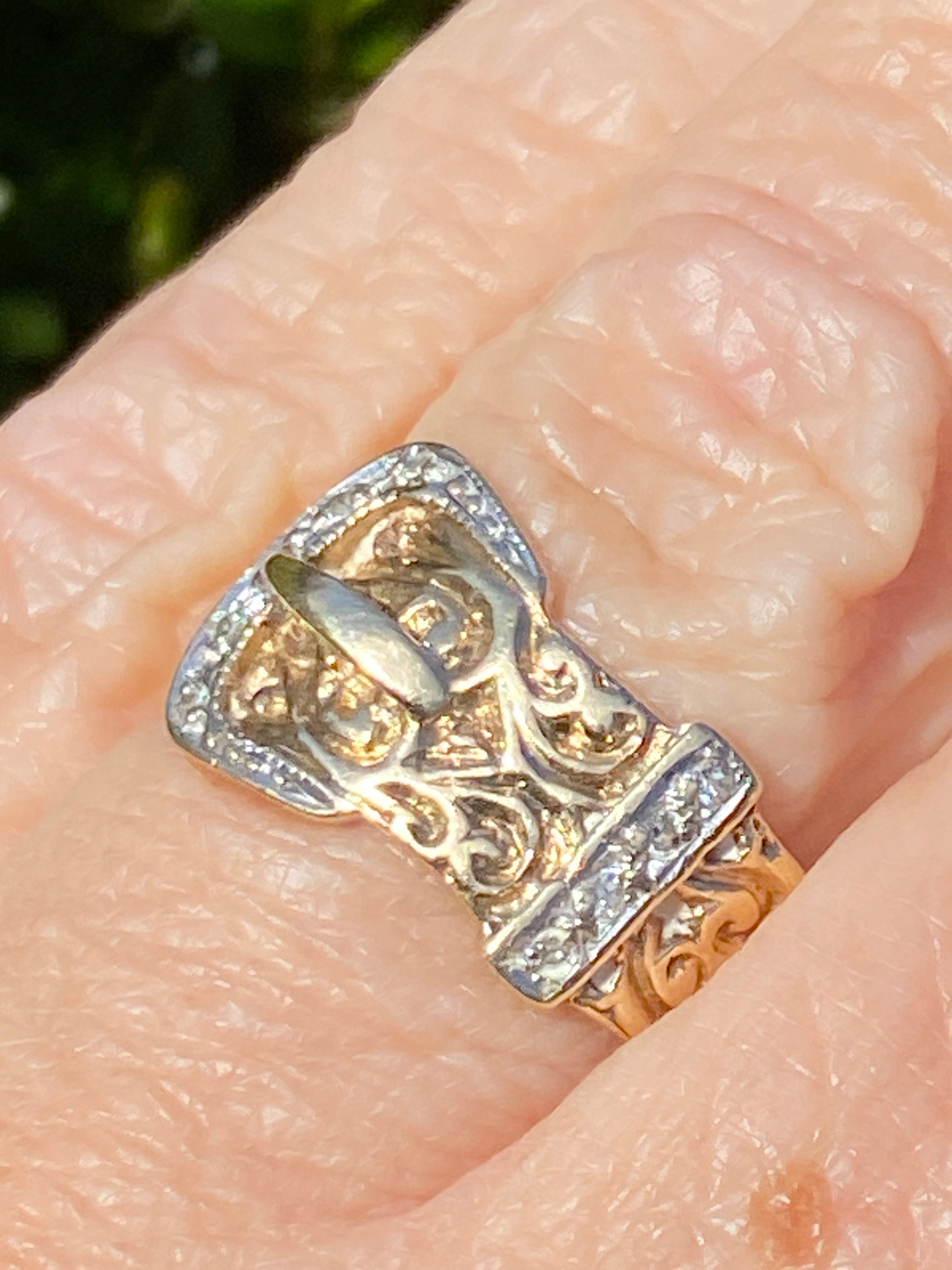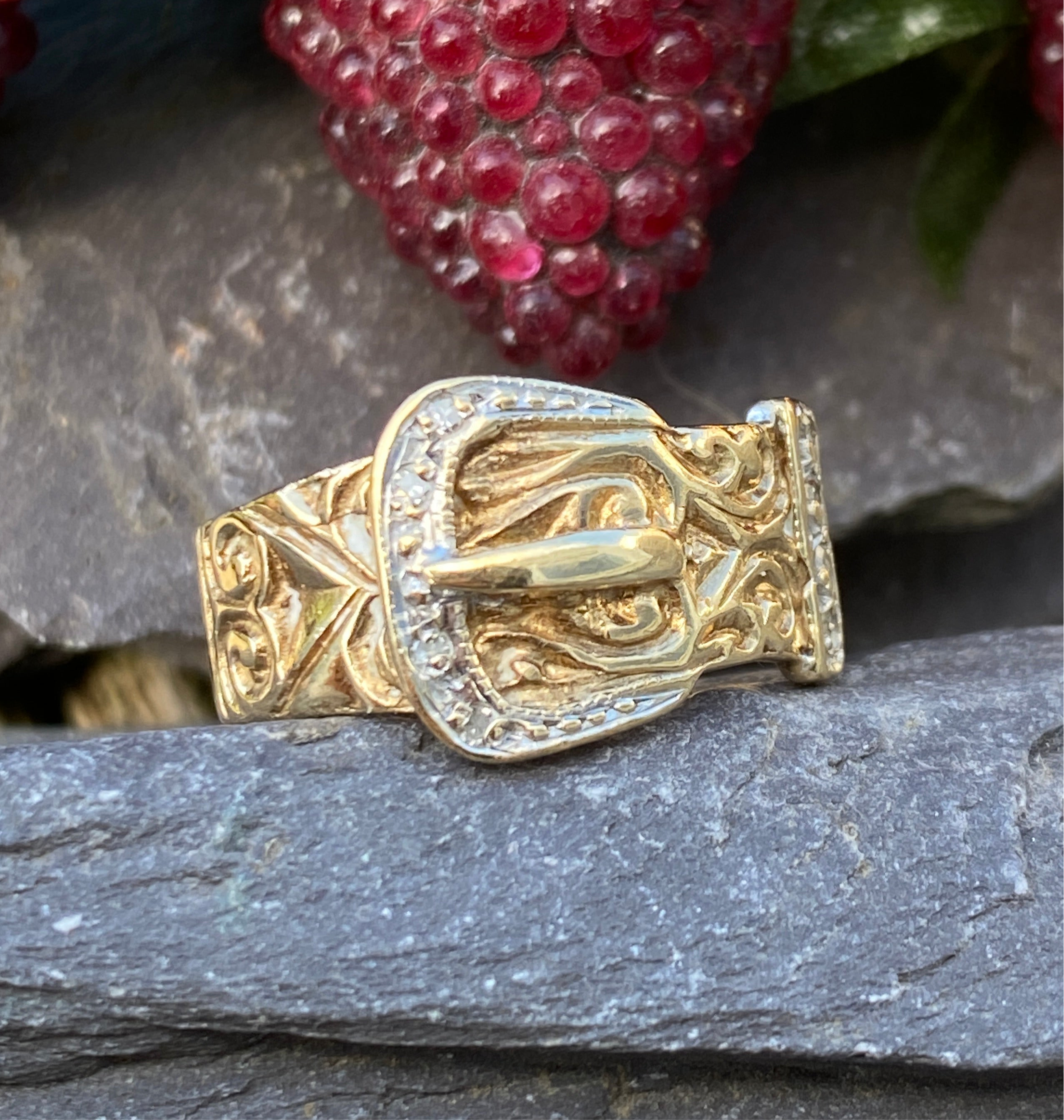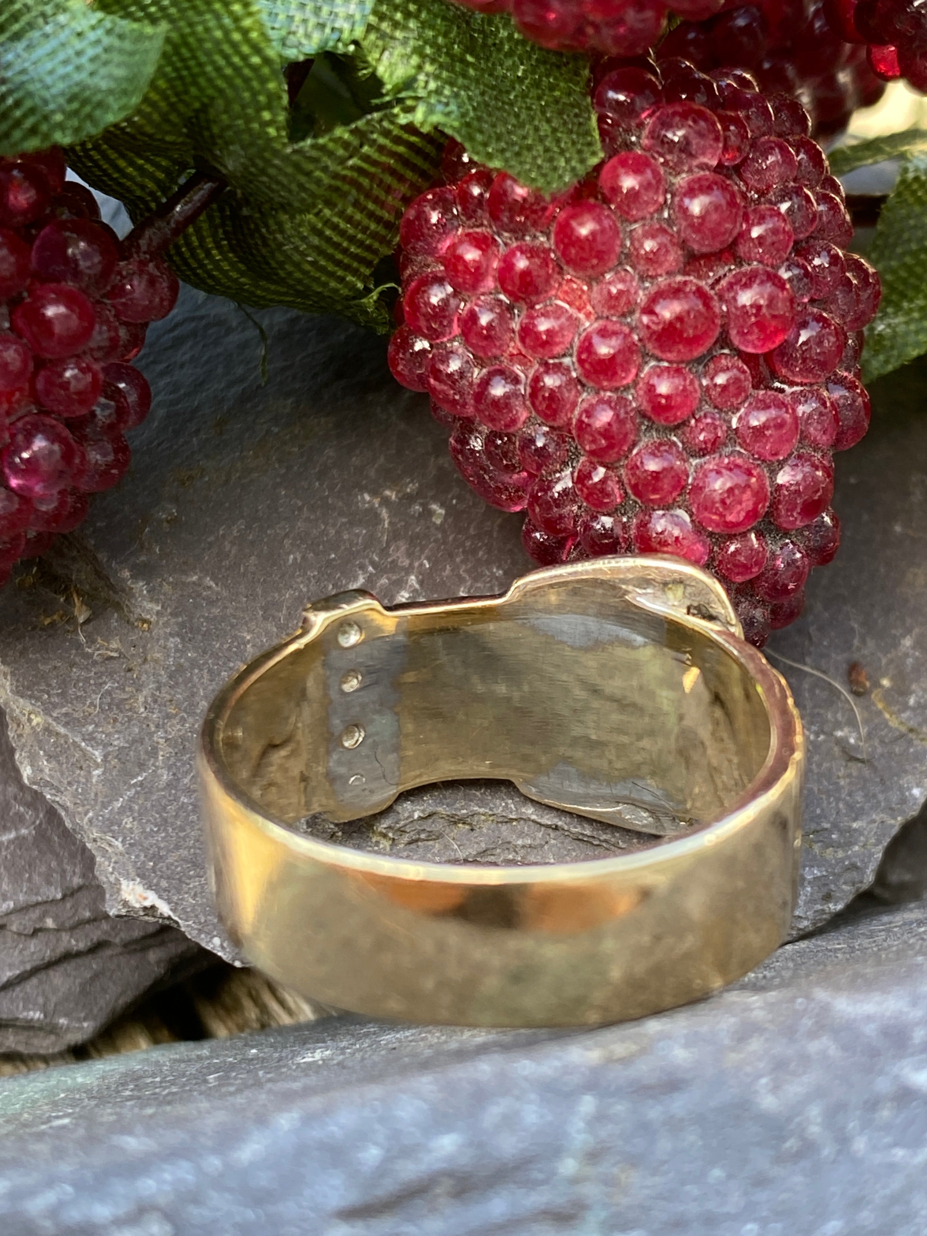 A very smart 9ct yellow gold buckle ring set with Diamonds in an embossed design