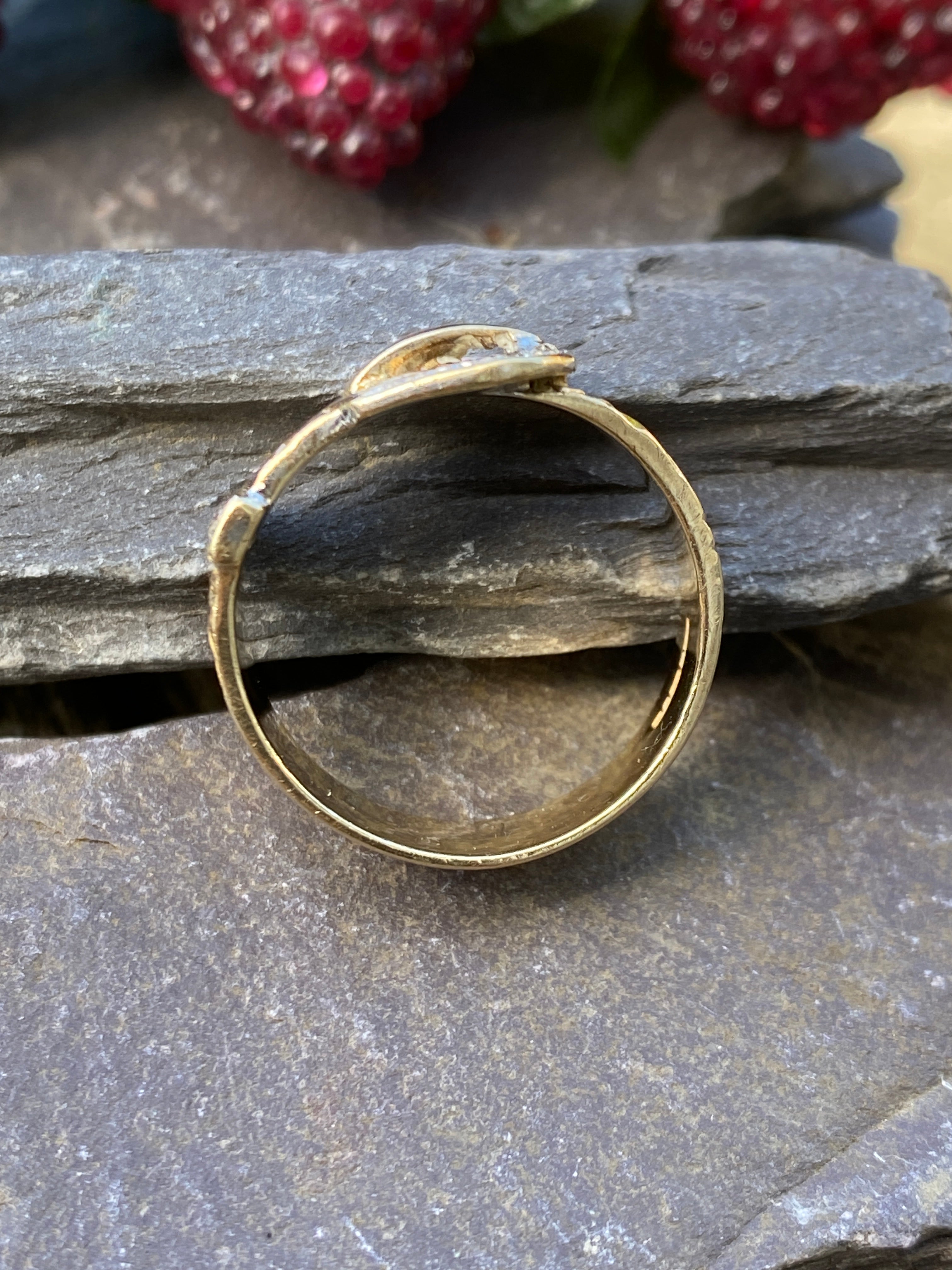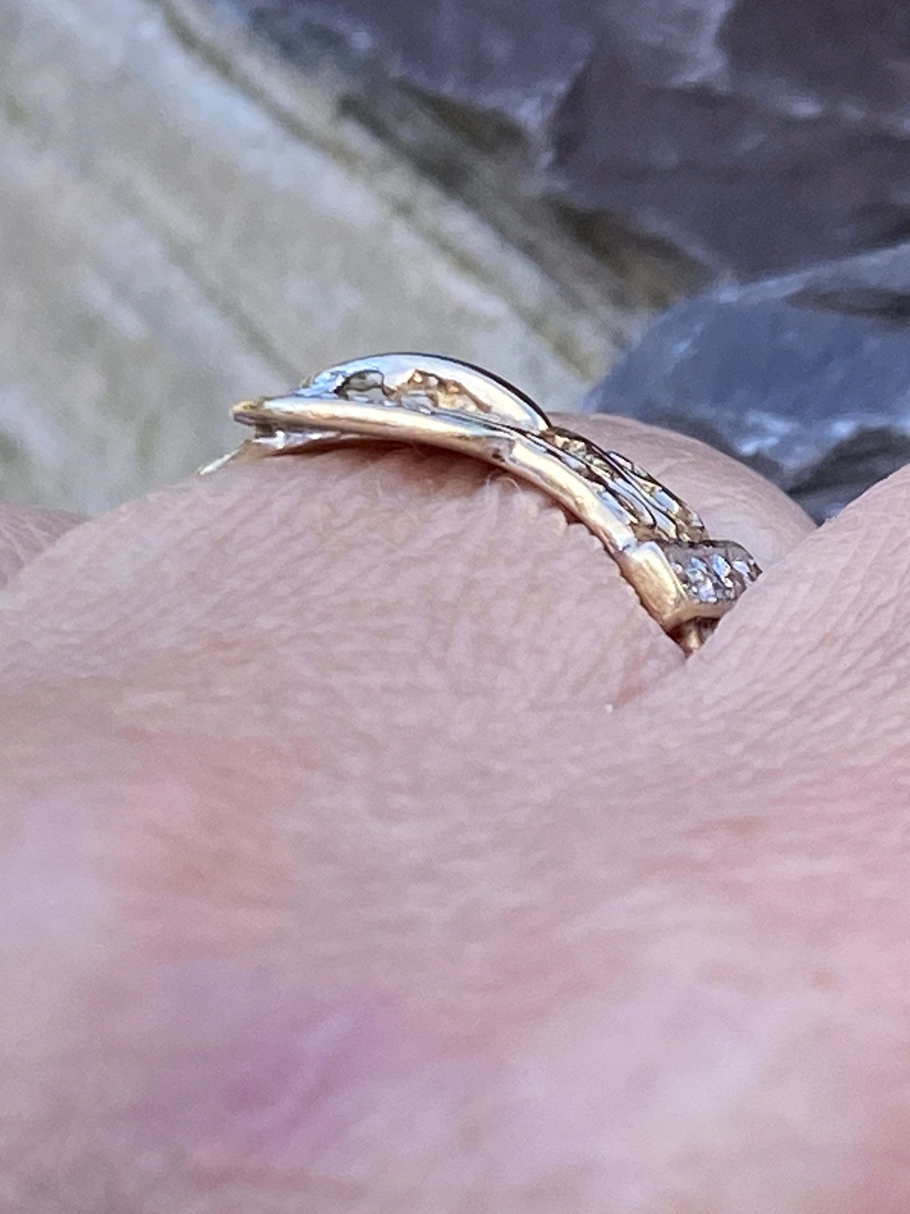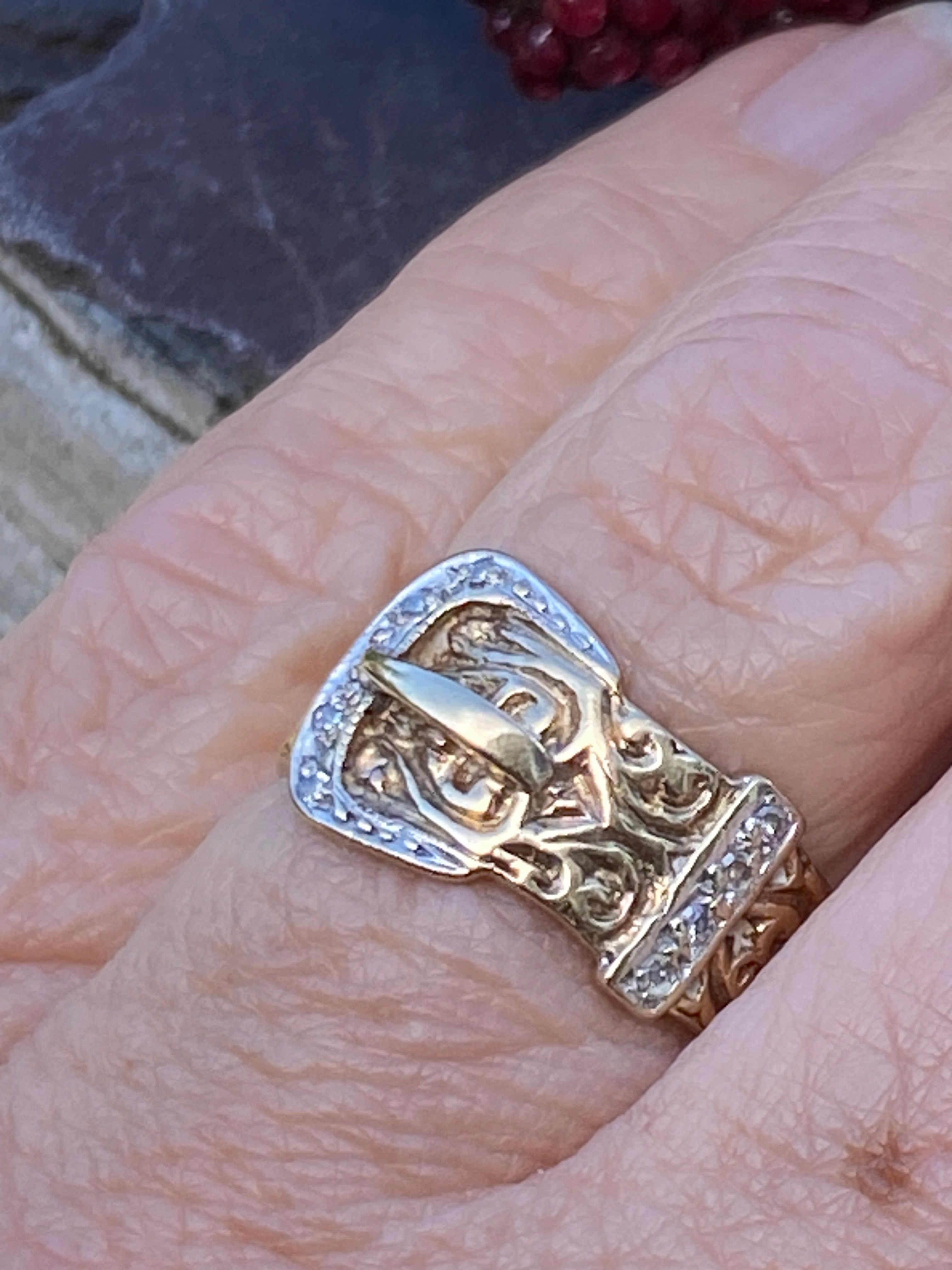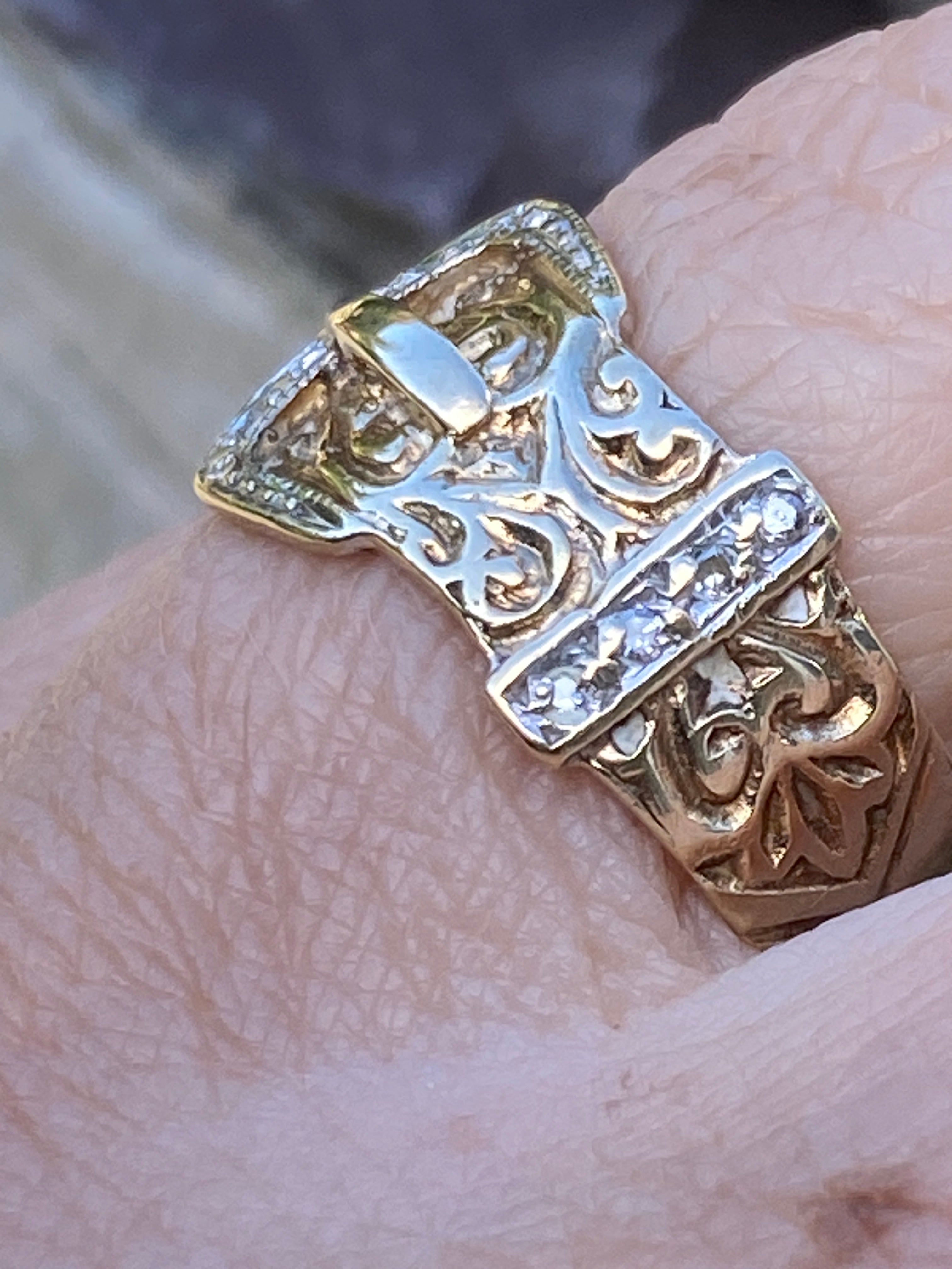 A very smart 9ct yellow gold buckle ring set with Diamonds in an embossed design