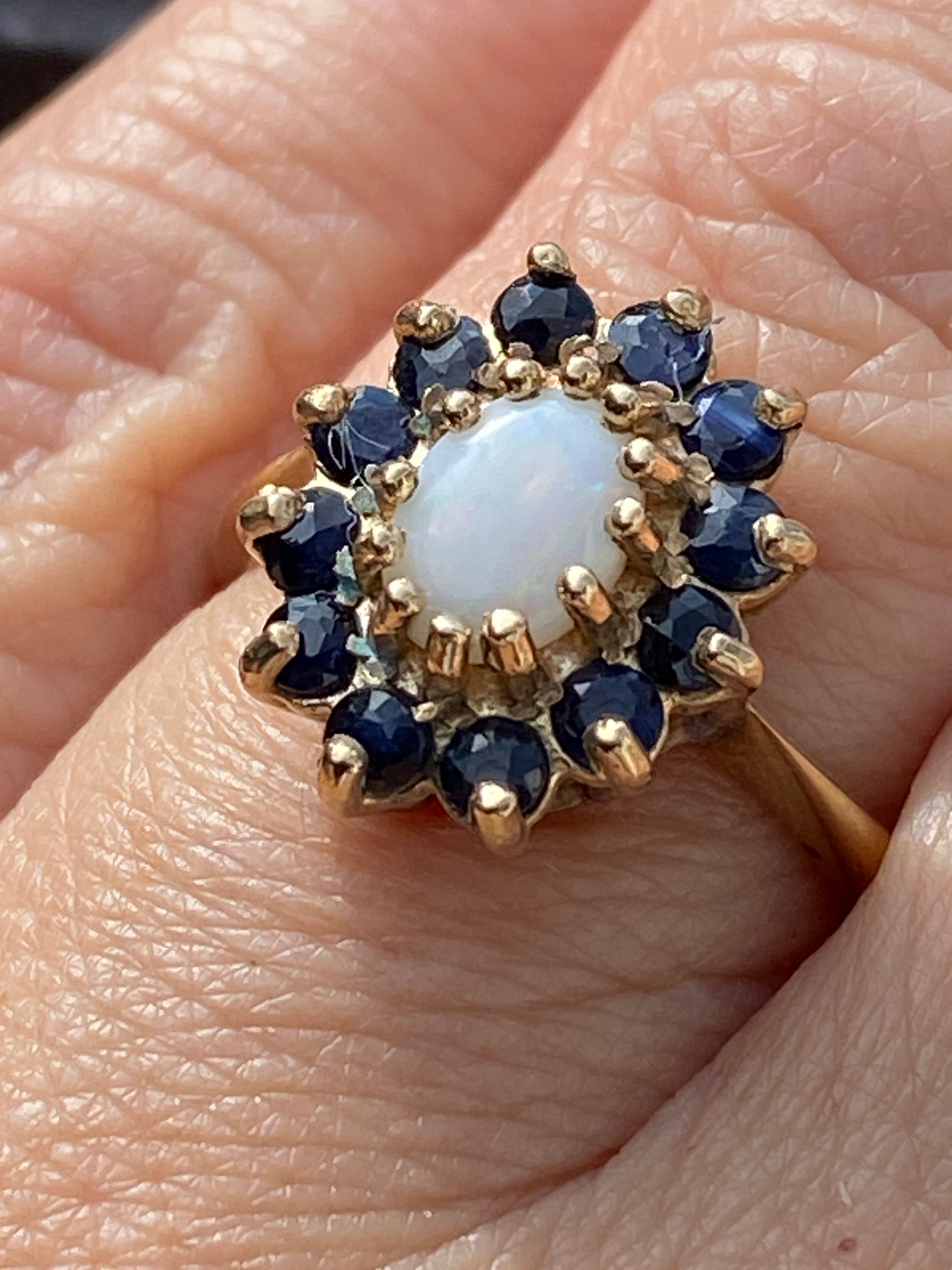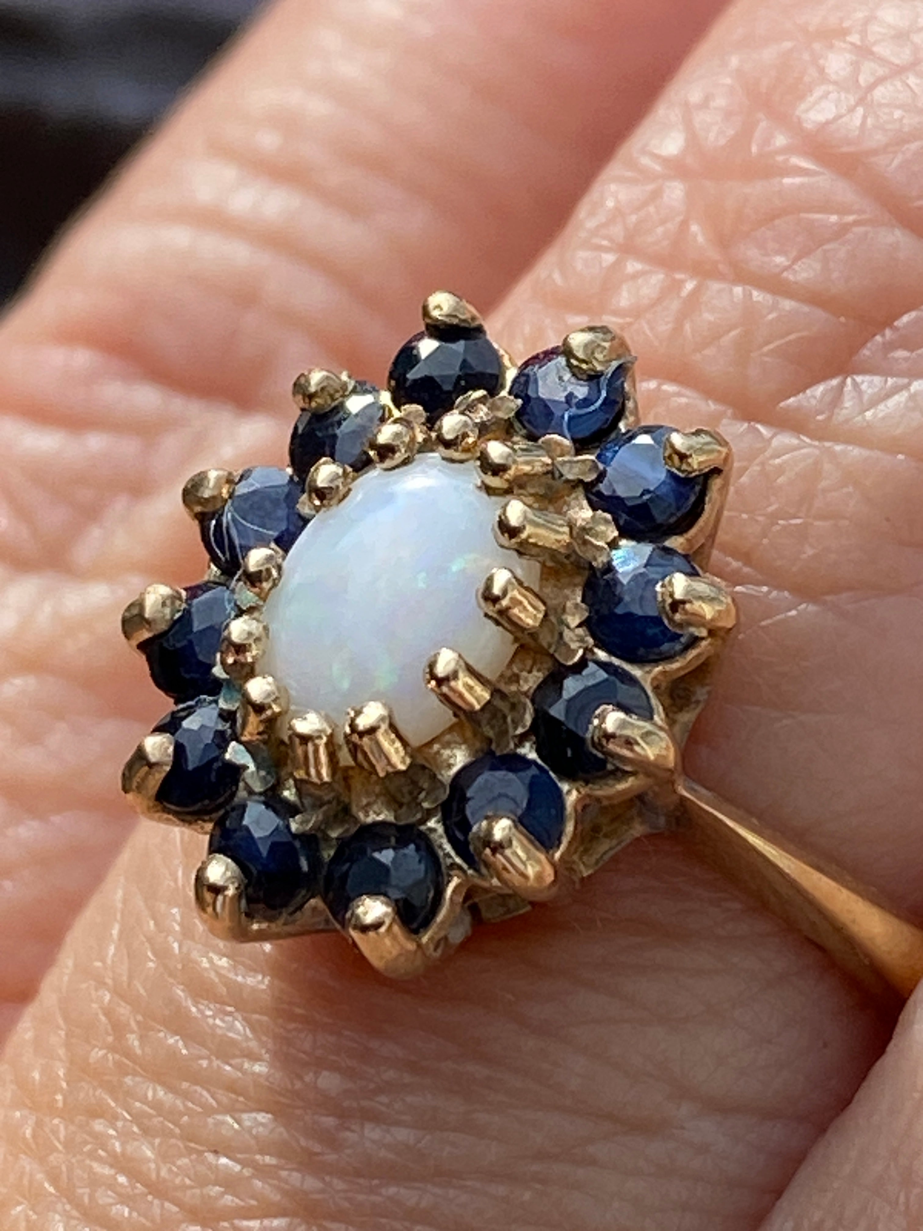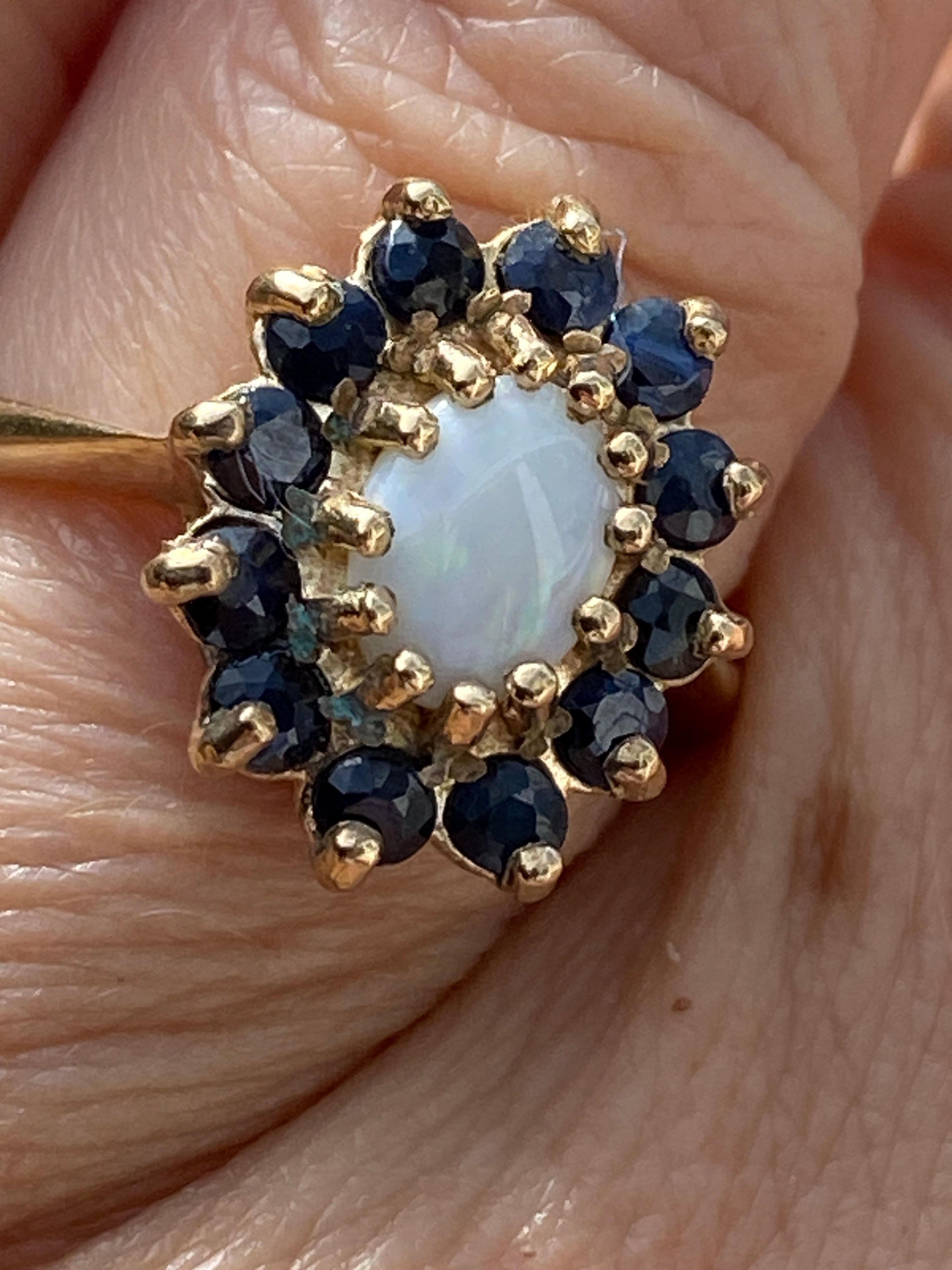 A very smart 9ct yellow gold cluster ring set with a natural Opal surrounded by Natural Deep blue Sapphires