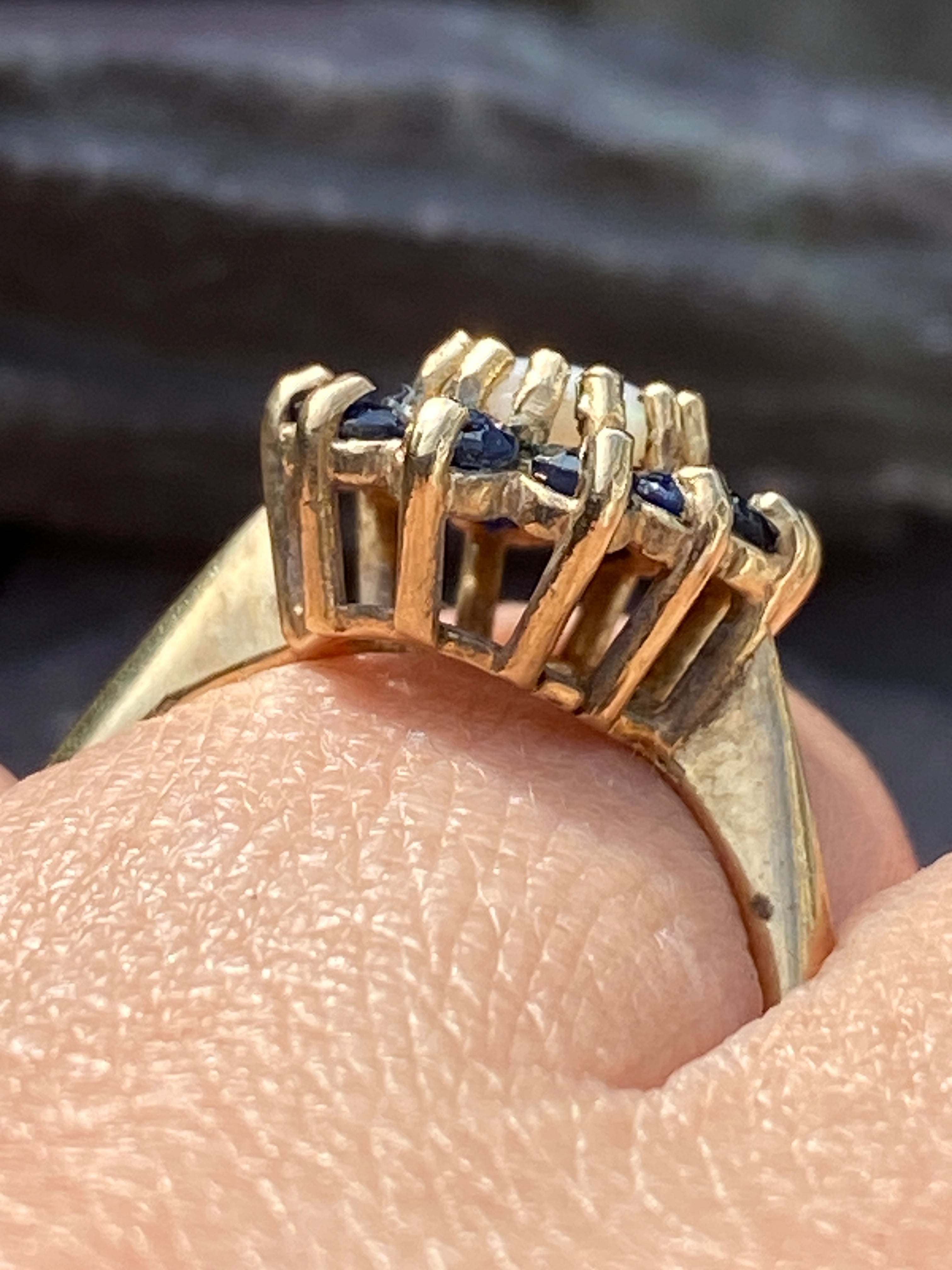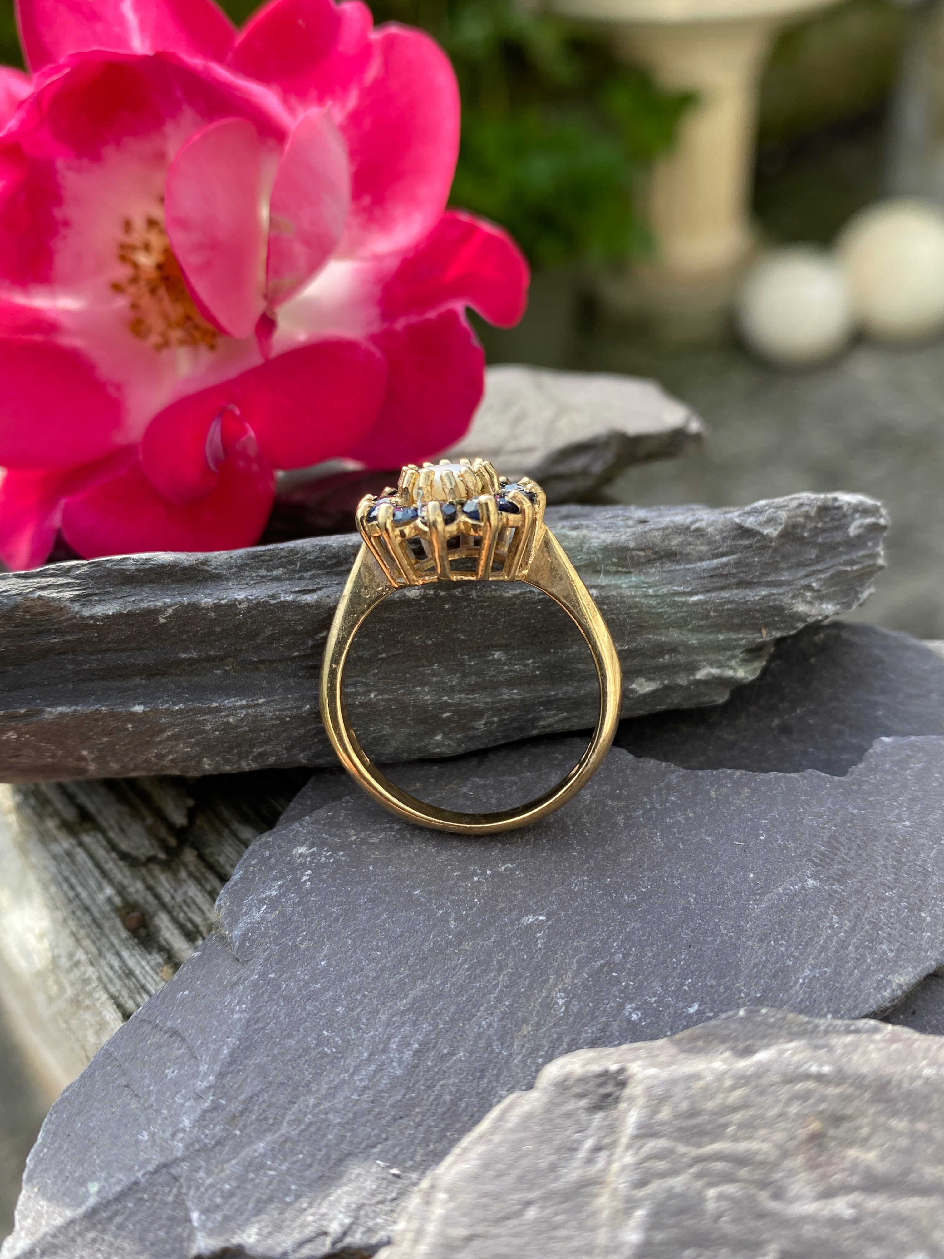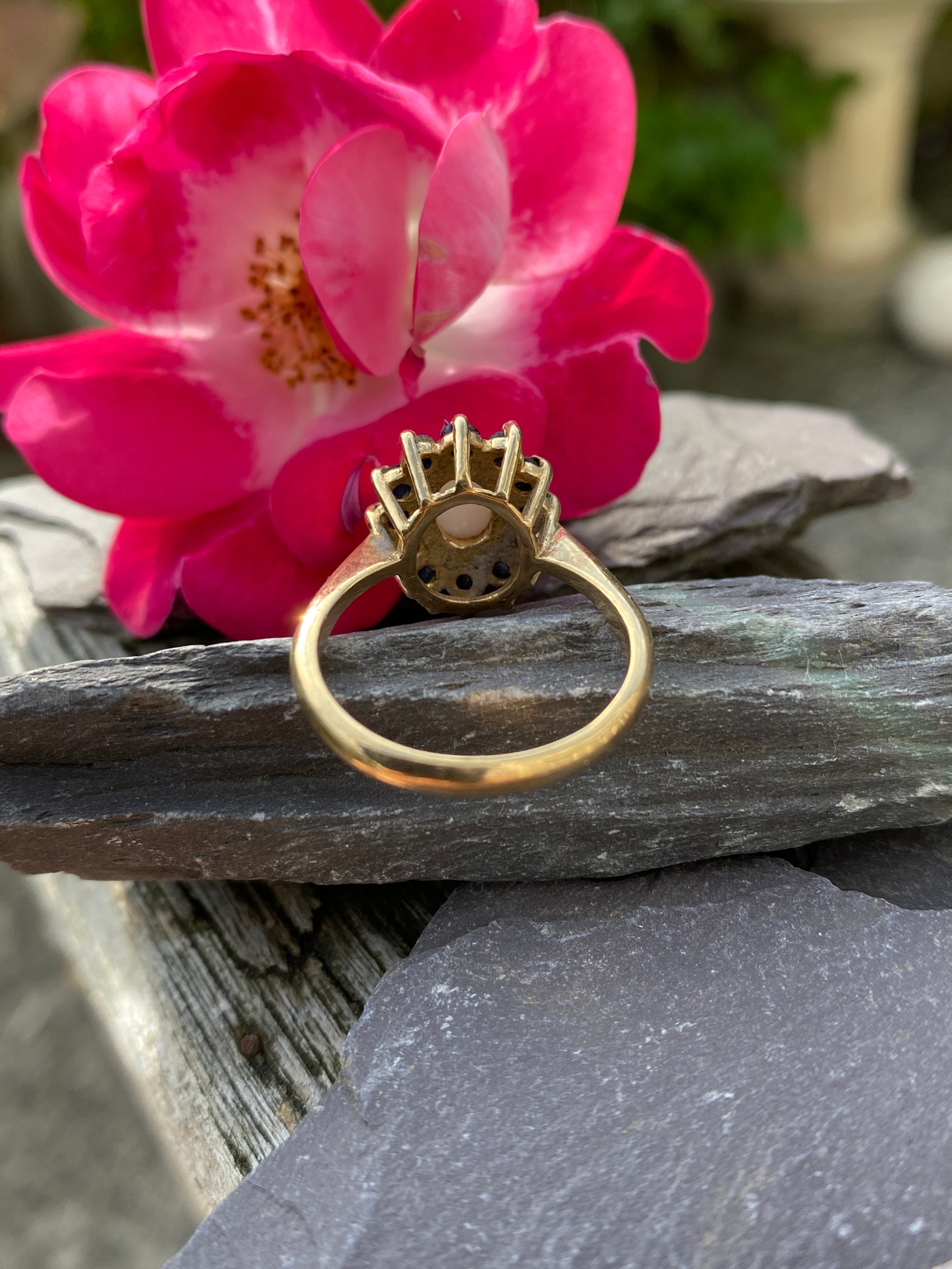 A very smart 9ct yellow gold cluster ring set with a natural Opal surrounded by Natural Deep blue Sapphires