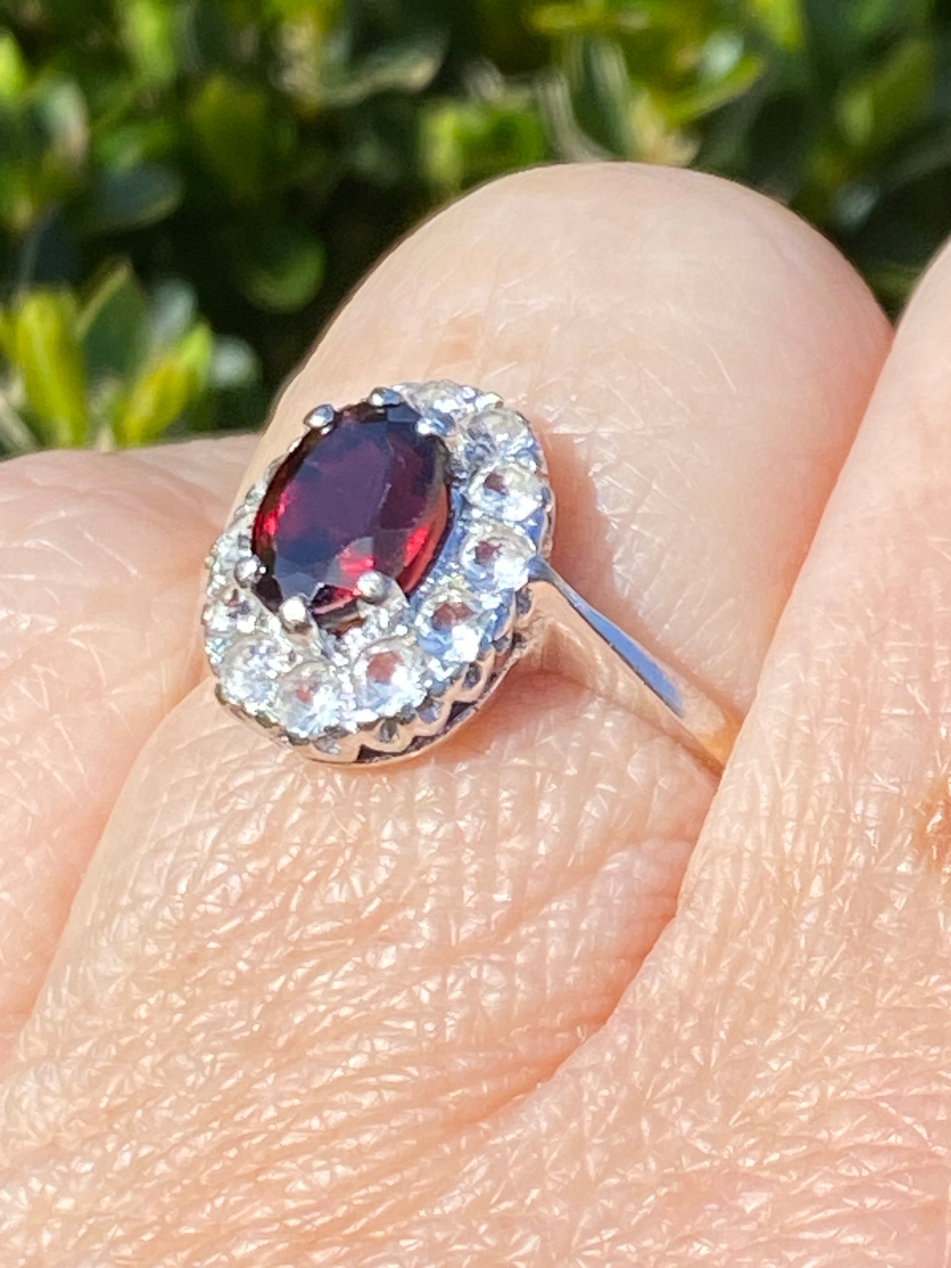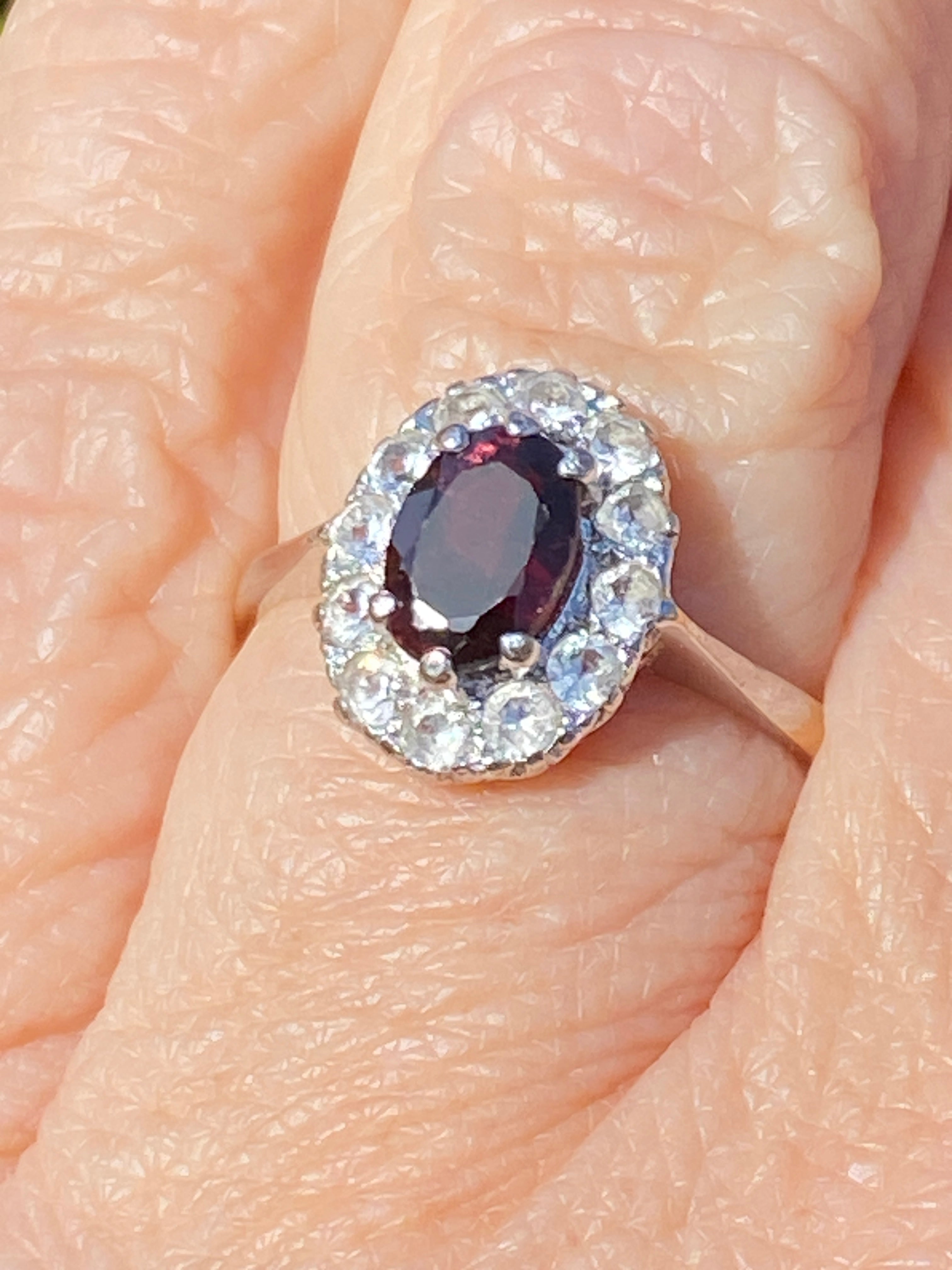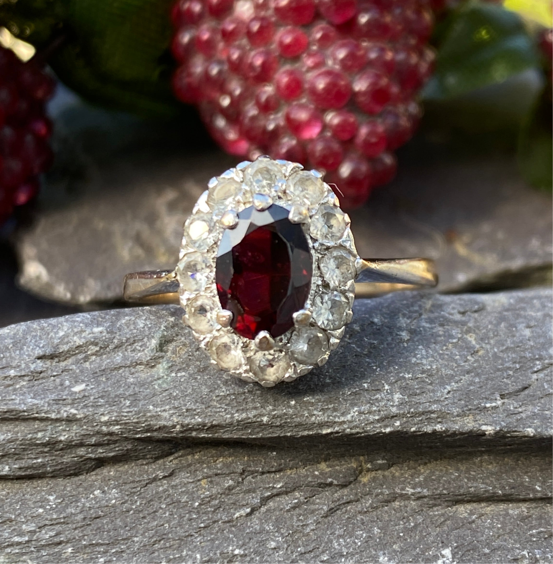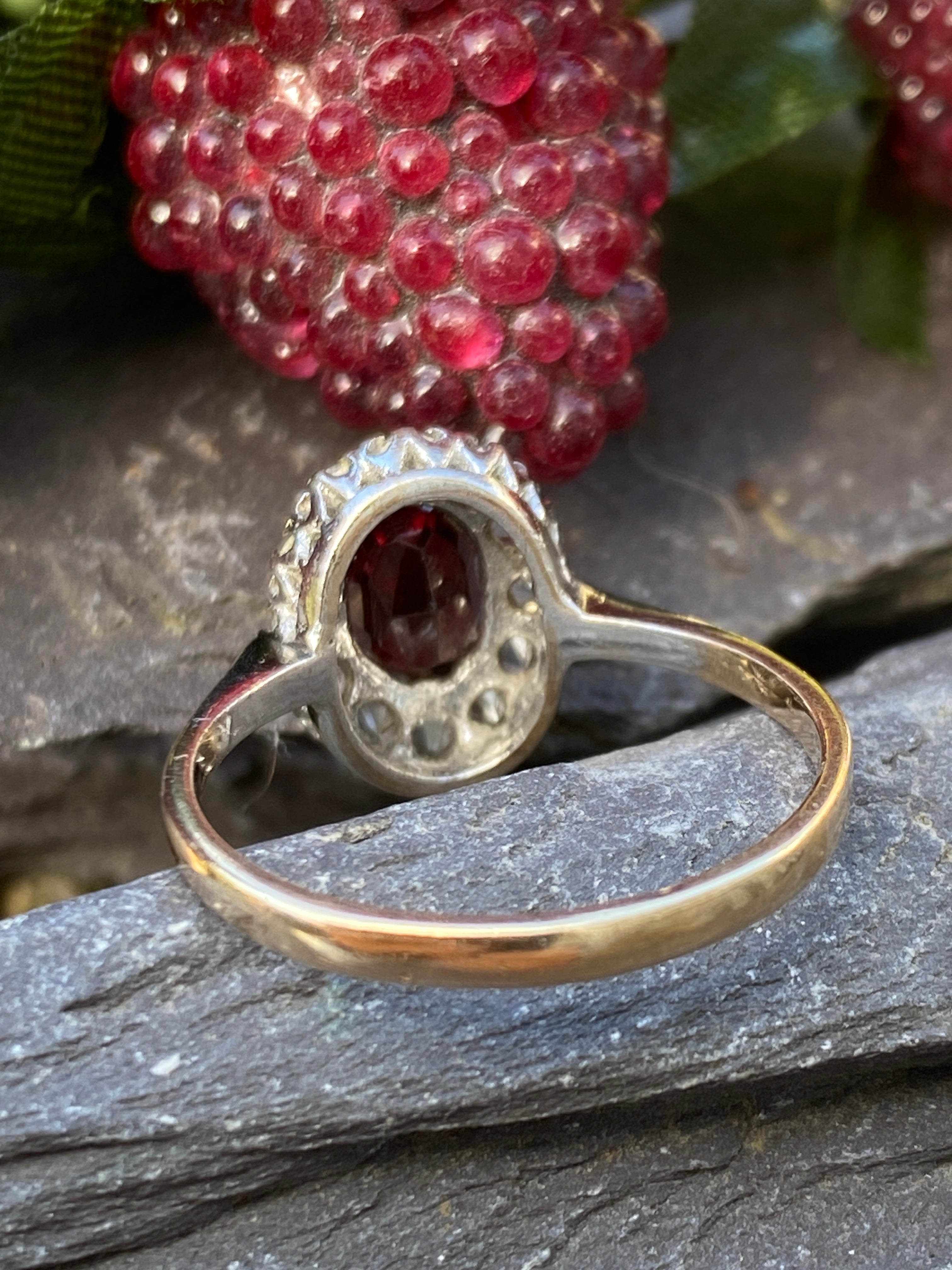 A juicy red garnet surrounded by 'white' spinel stones in a white gold setting with yellow gold shankAll in 9ct goldFull hallmarks for London 1975Finger size M or...