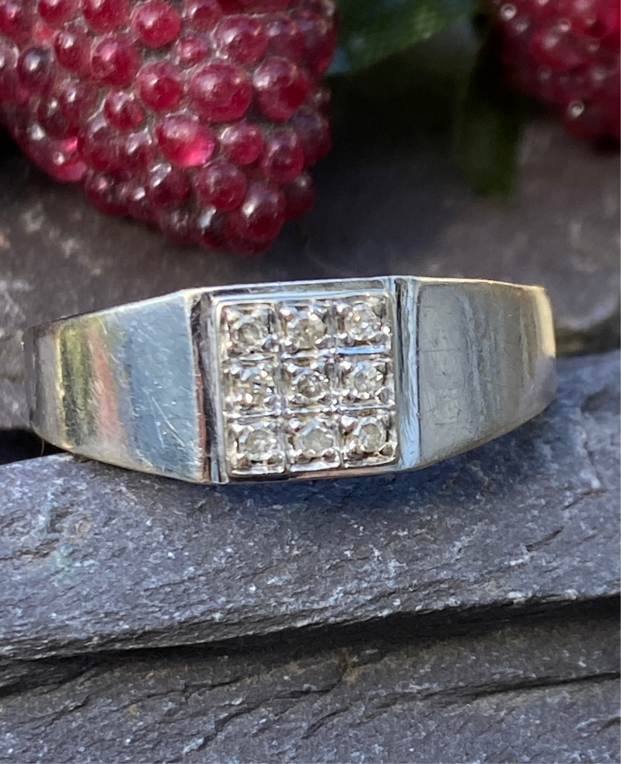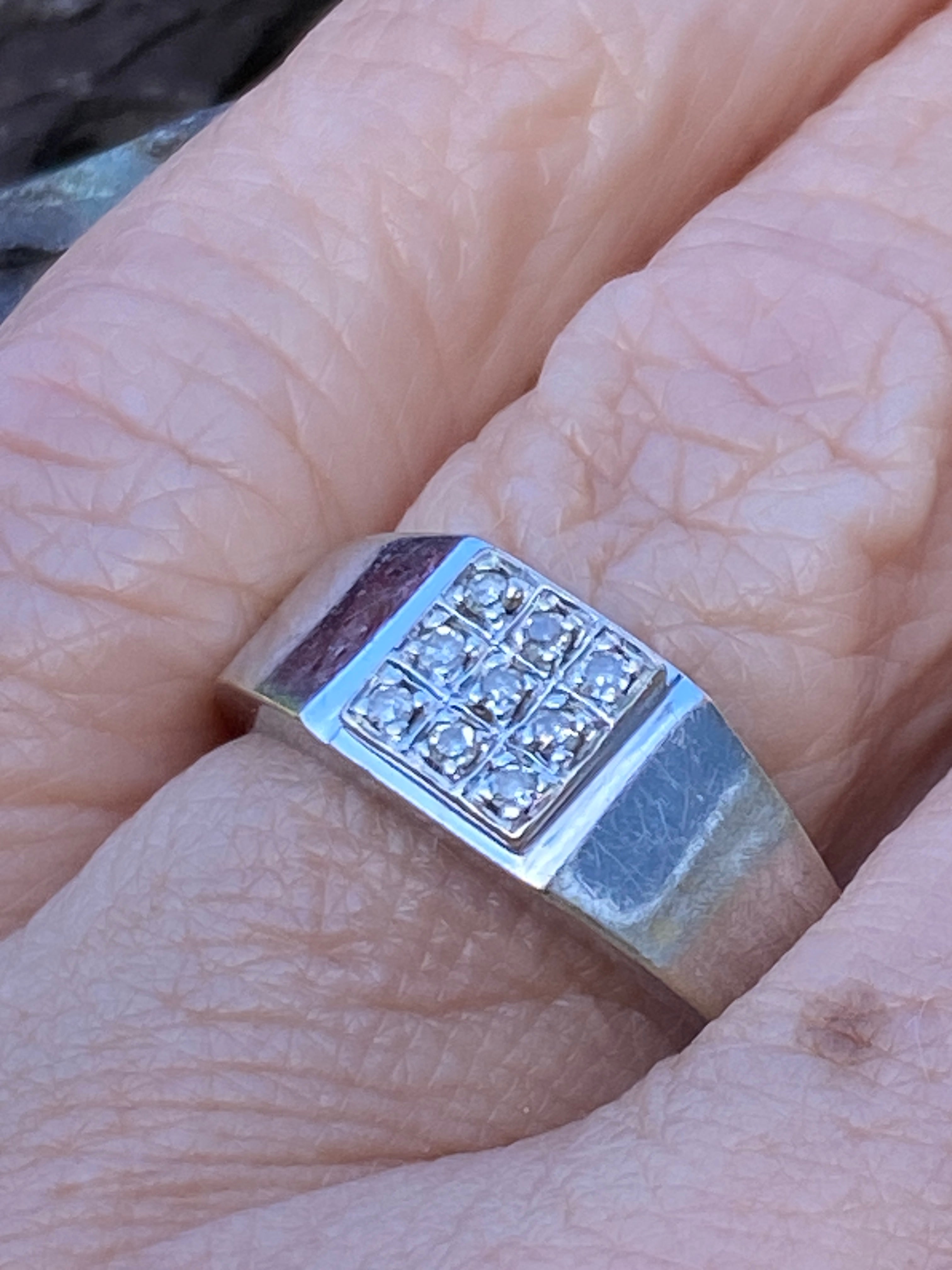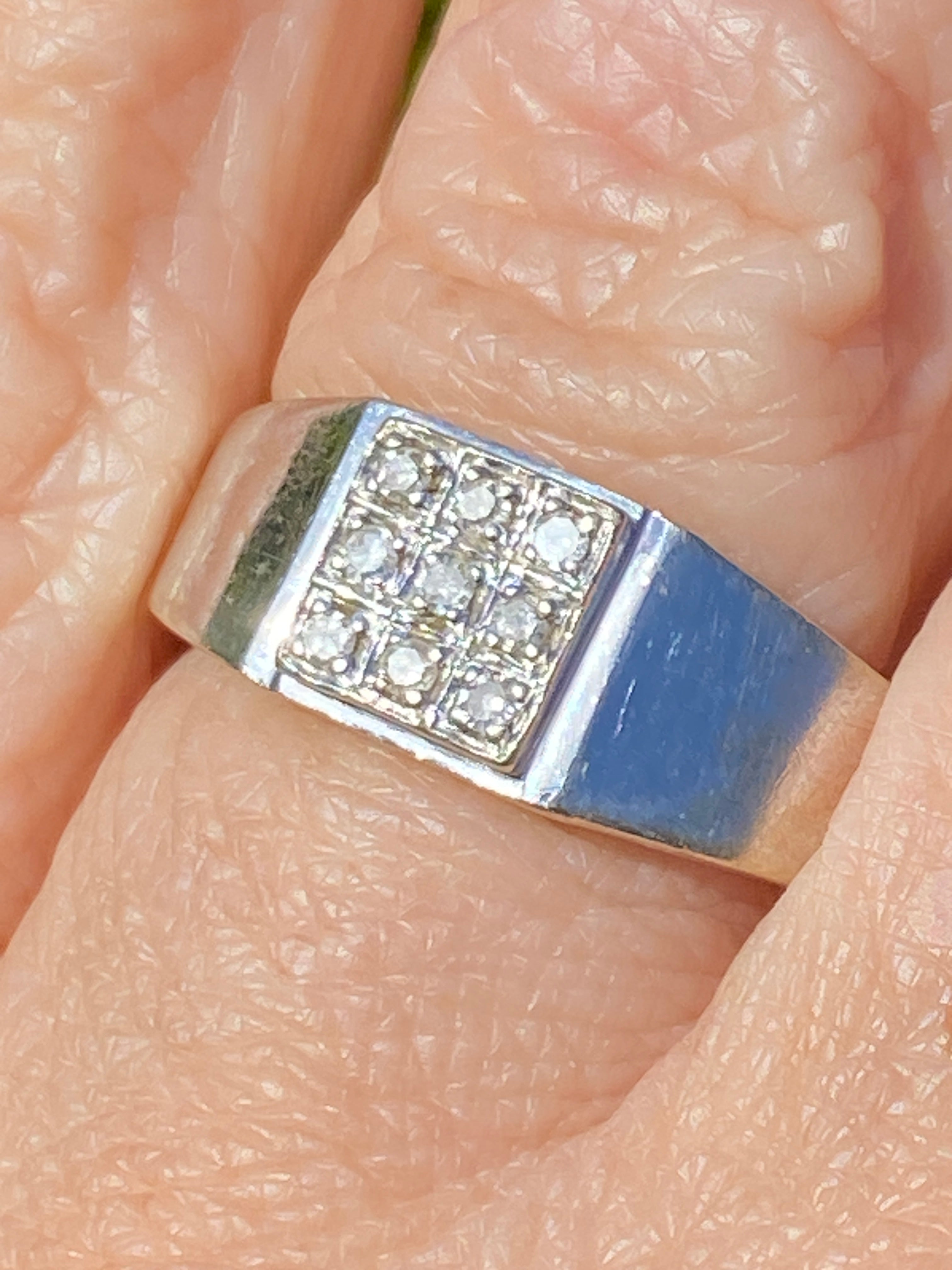 A smart 9ct white gold masc ring with a square set with 9 Diamonds