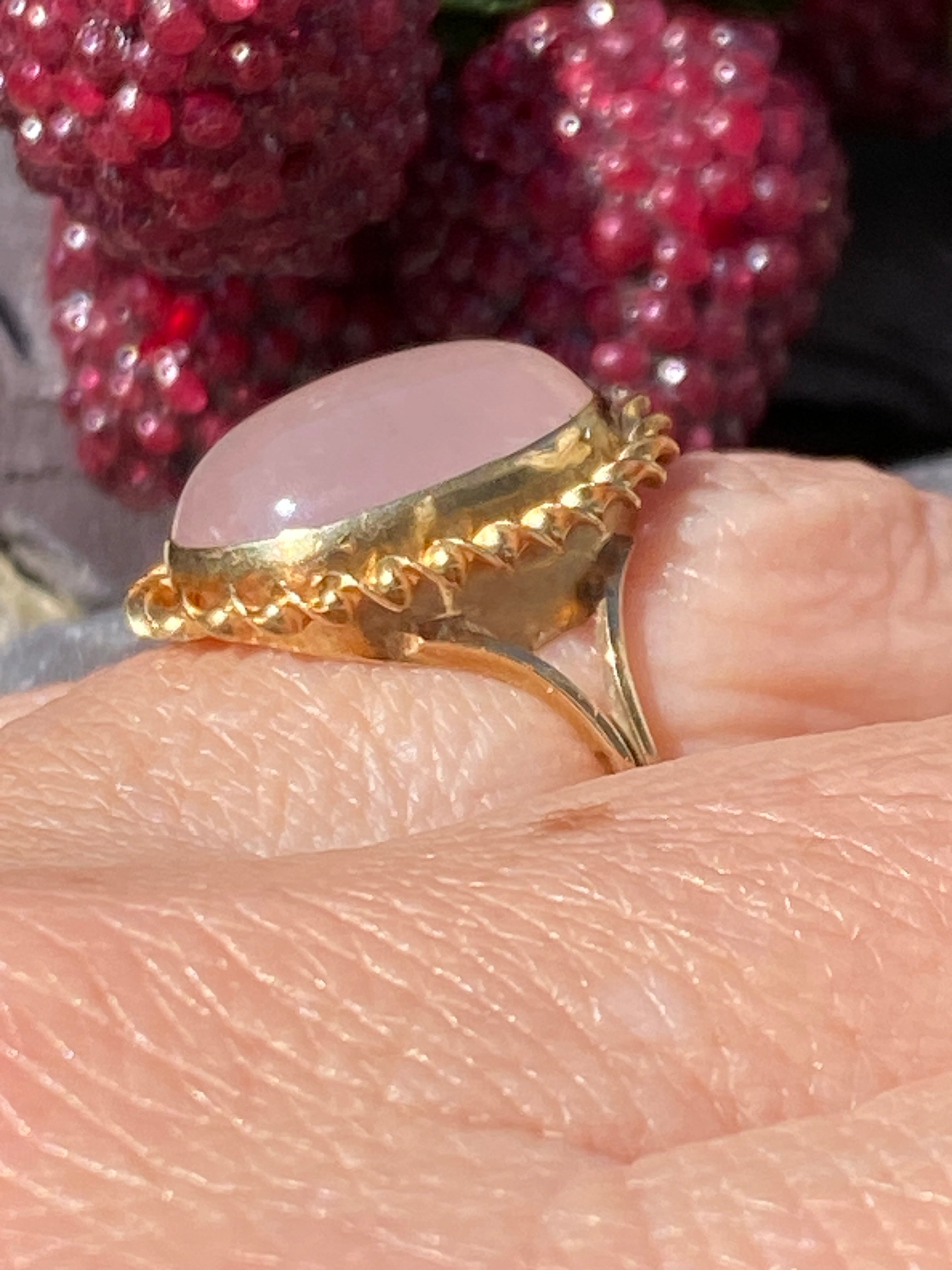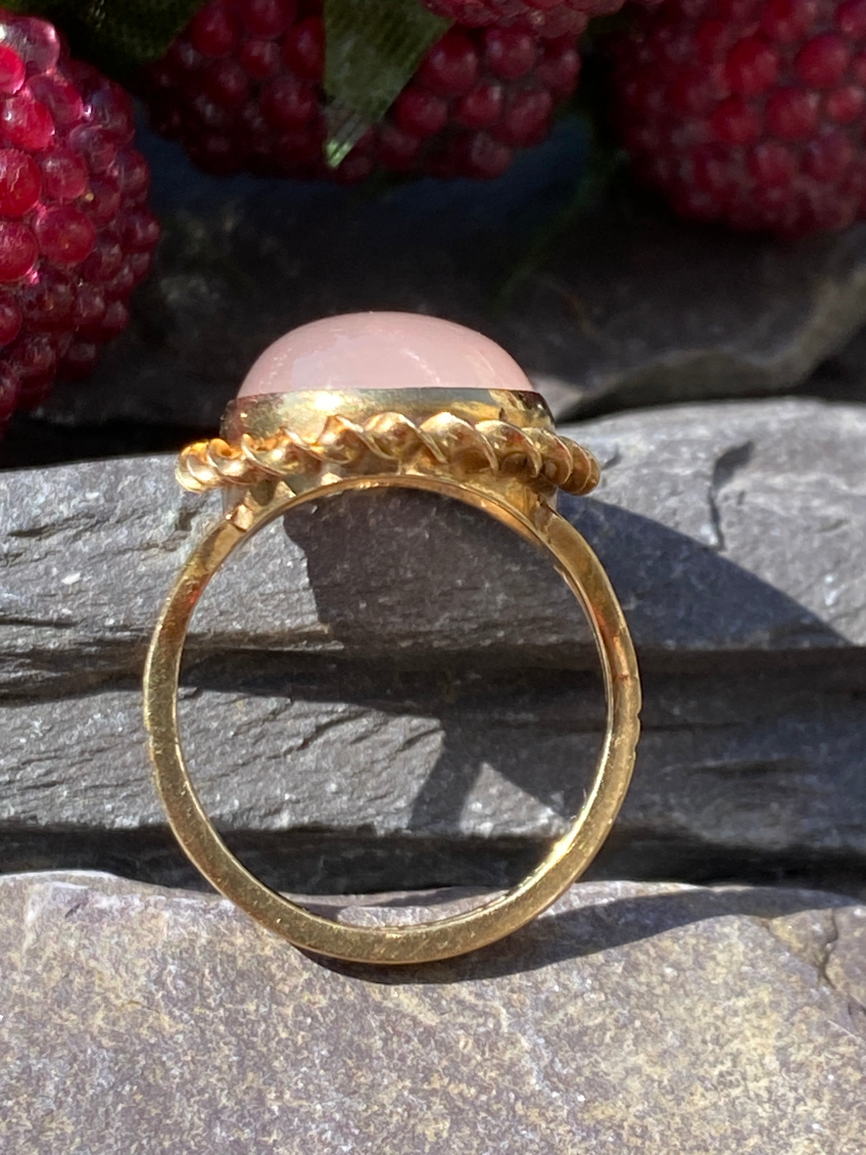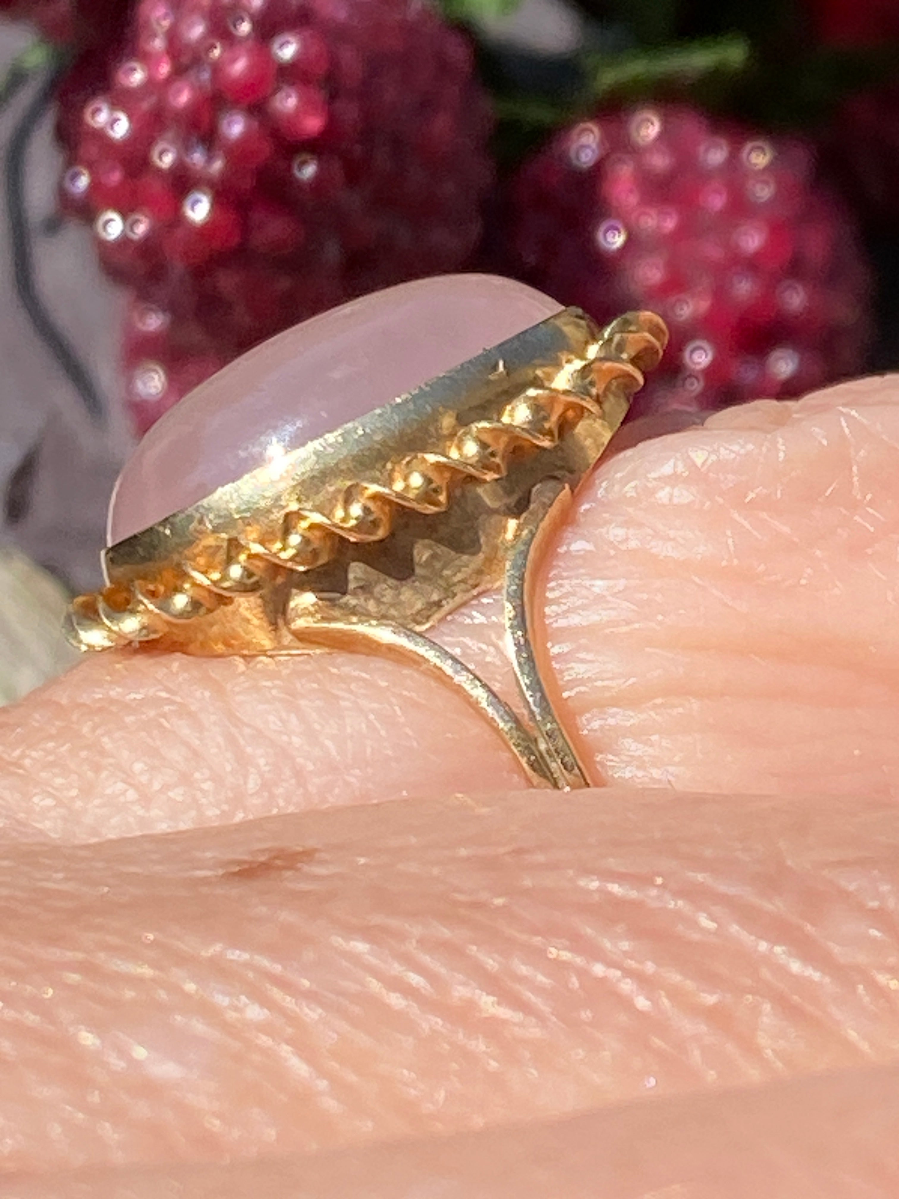 A stunning 9ct yellow gold ring set with a large natural Rose Quartz cabochon