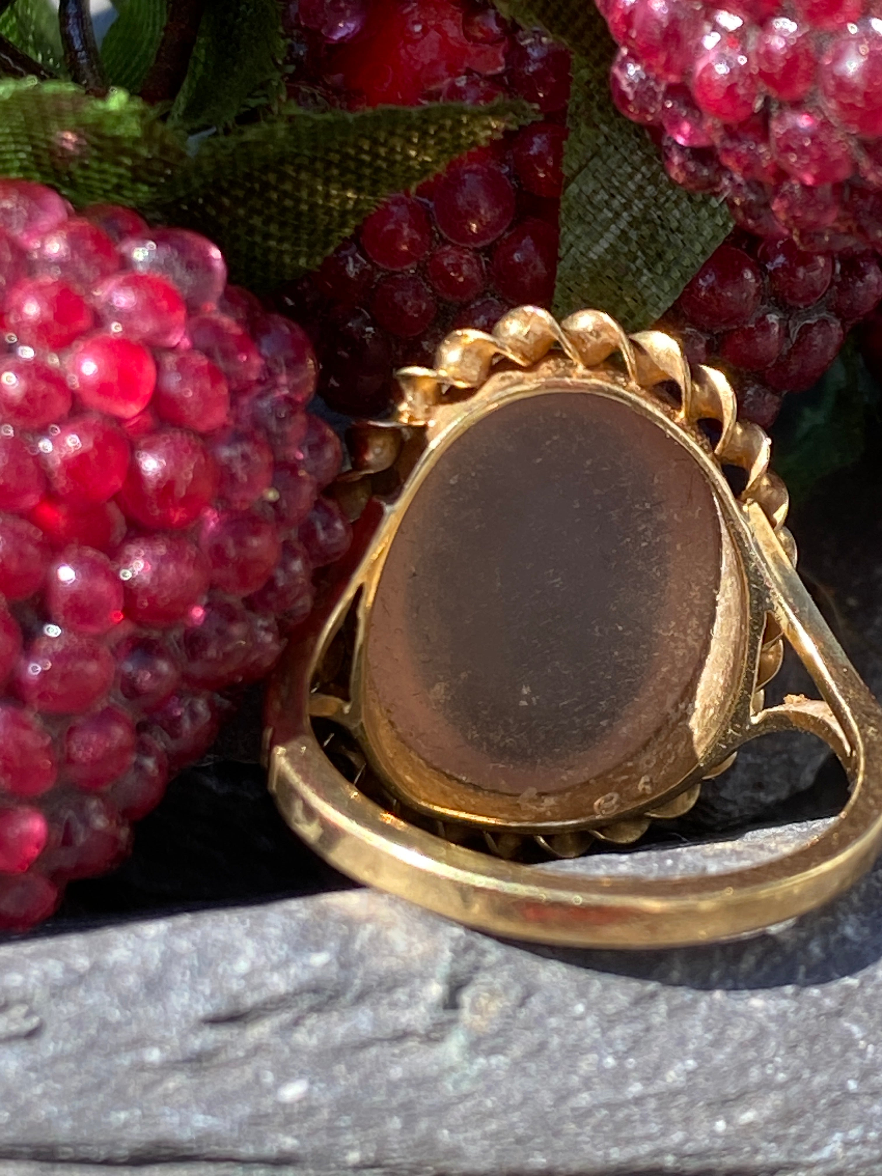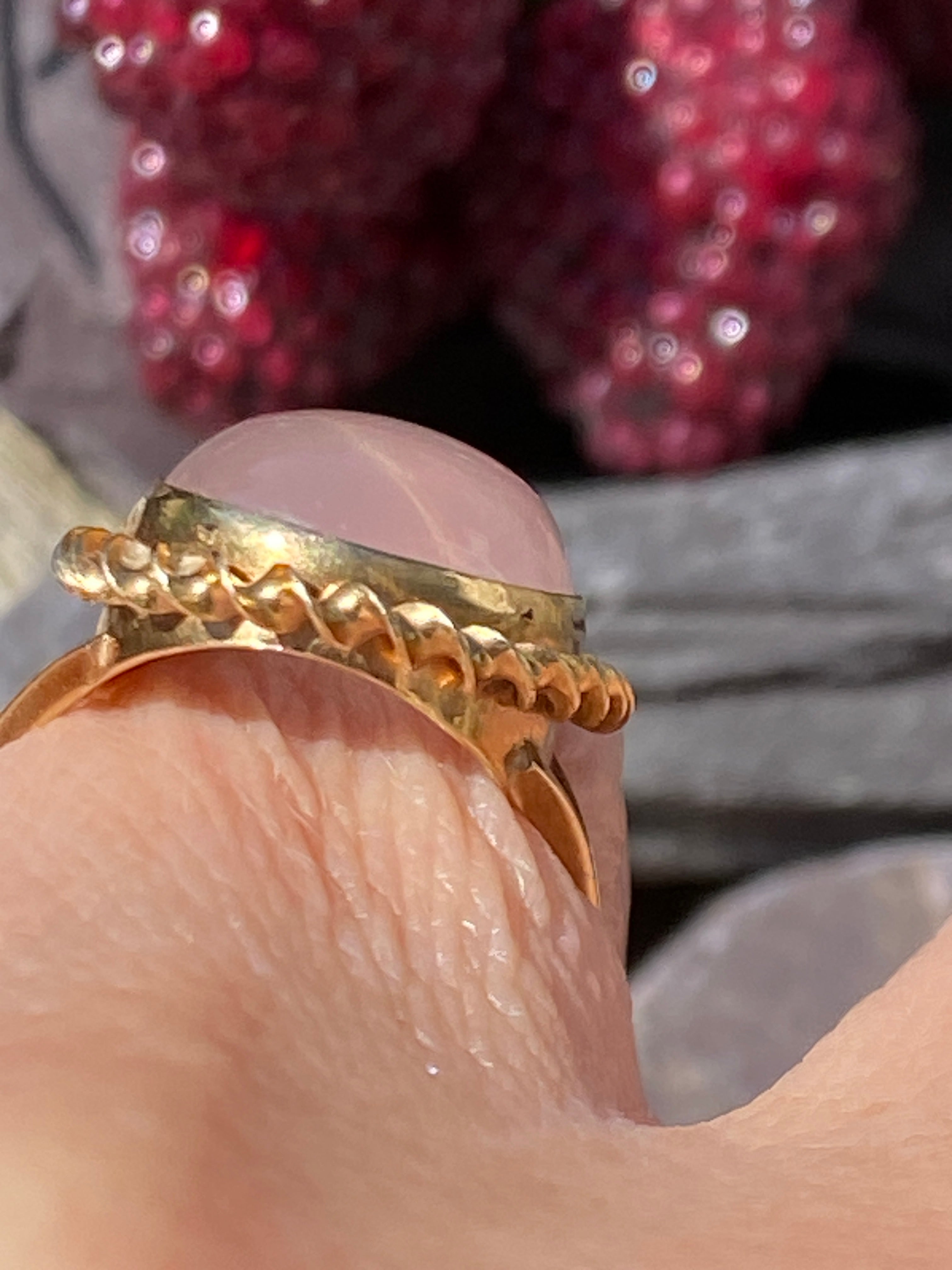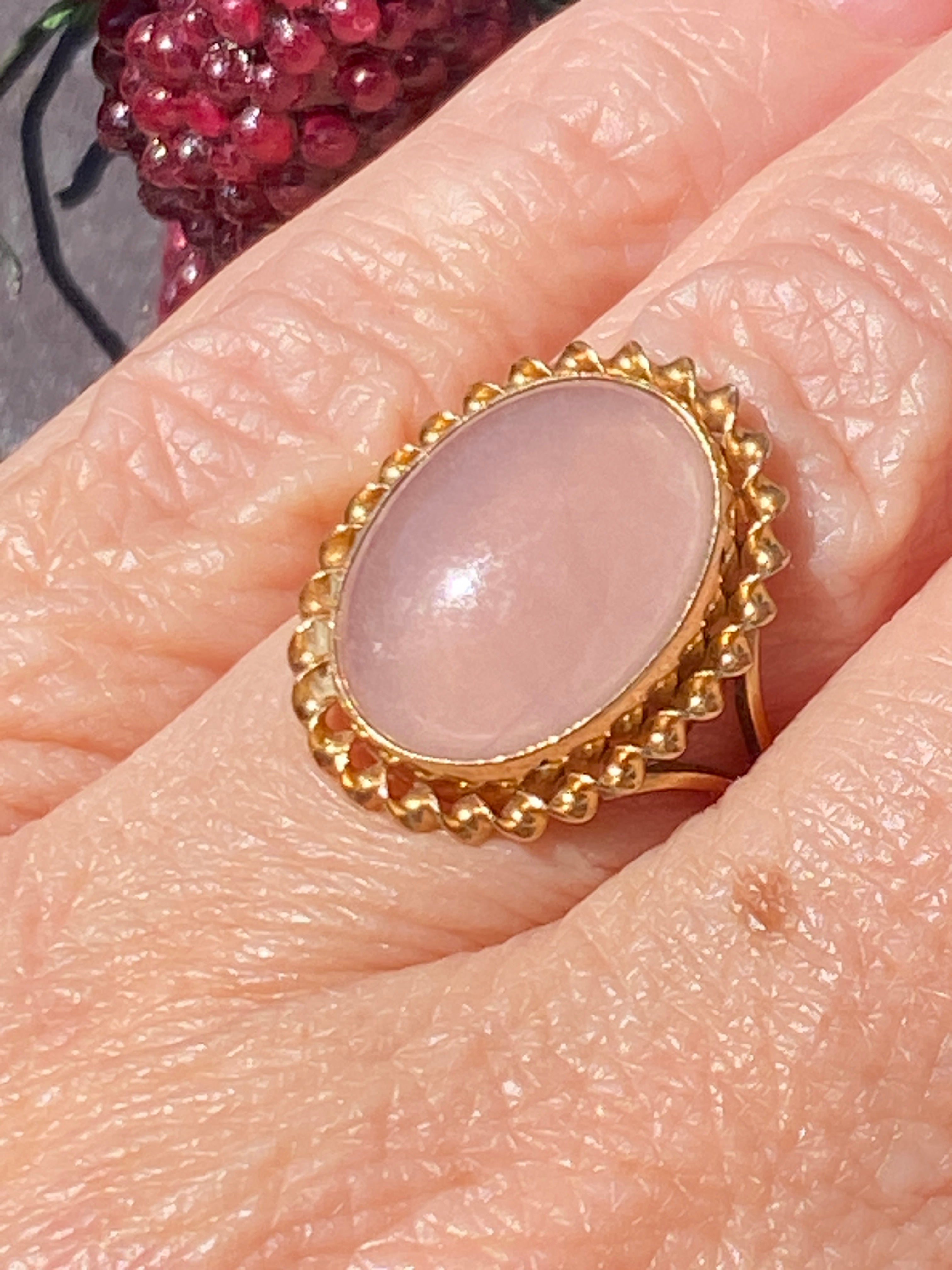 A stunning 9ct yellow gold ring set with a large natural Rose Quartz cabochon