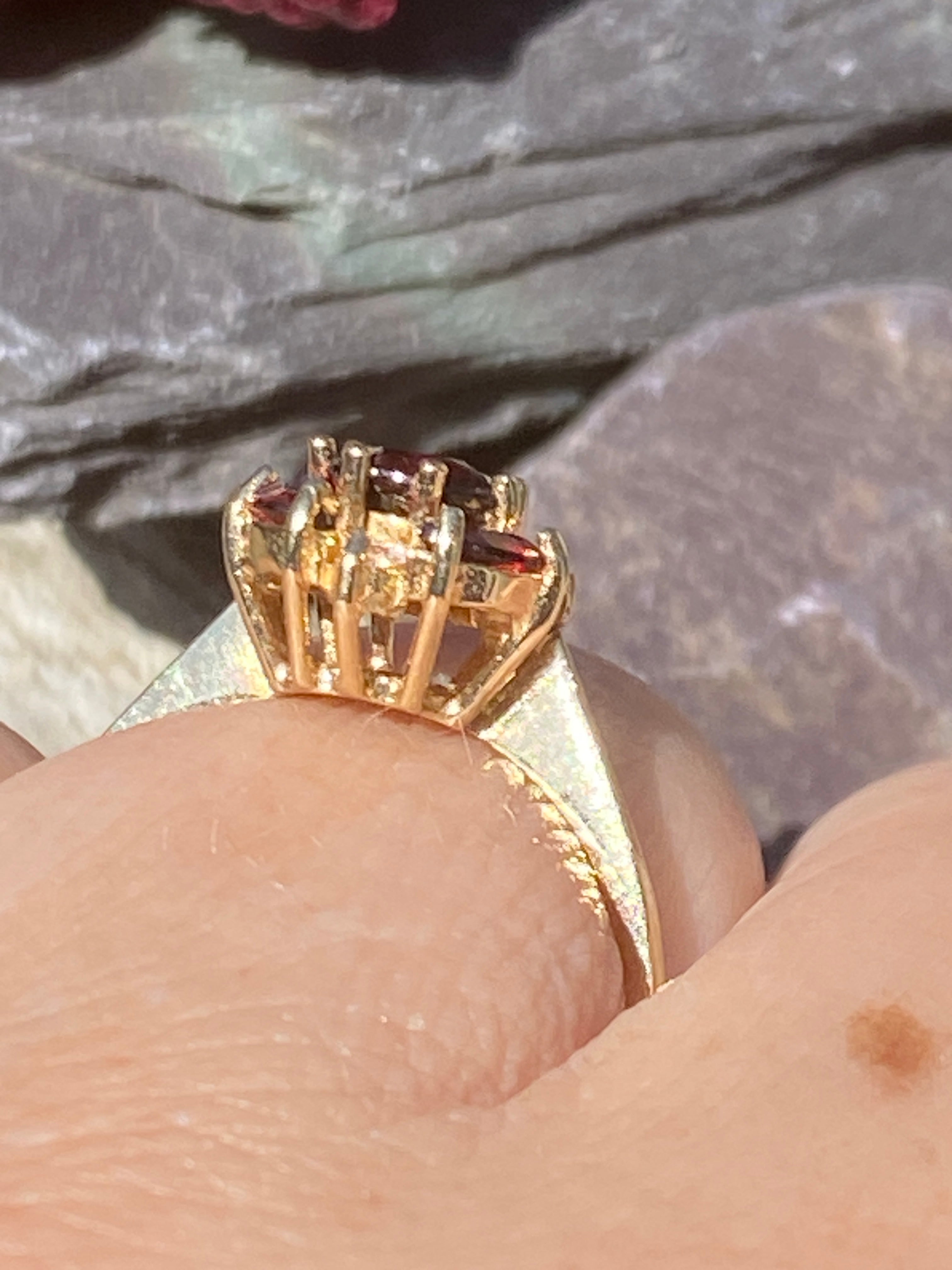 A pretty 9ct gold ring set with deep red garnets and Cubic Zirconia for added sparkleFull hallmarks for London 1998Finger size P or 7 3/4 USIn excellent conditionArrives...